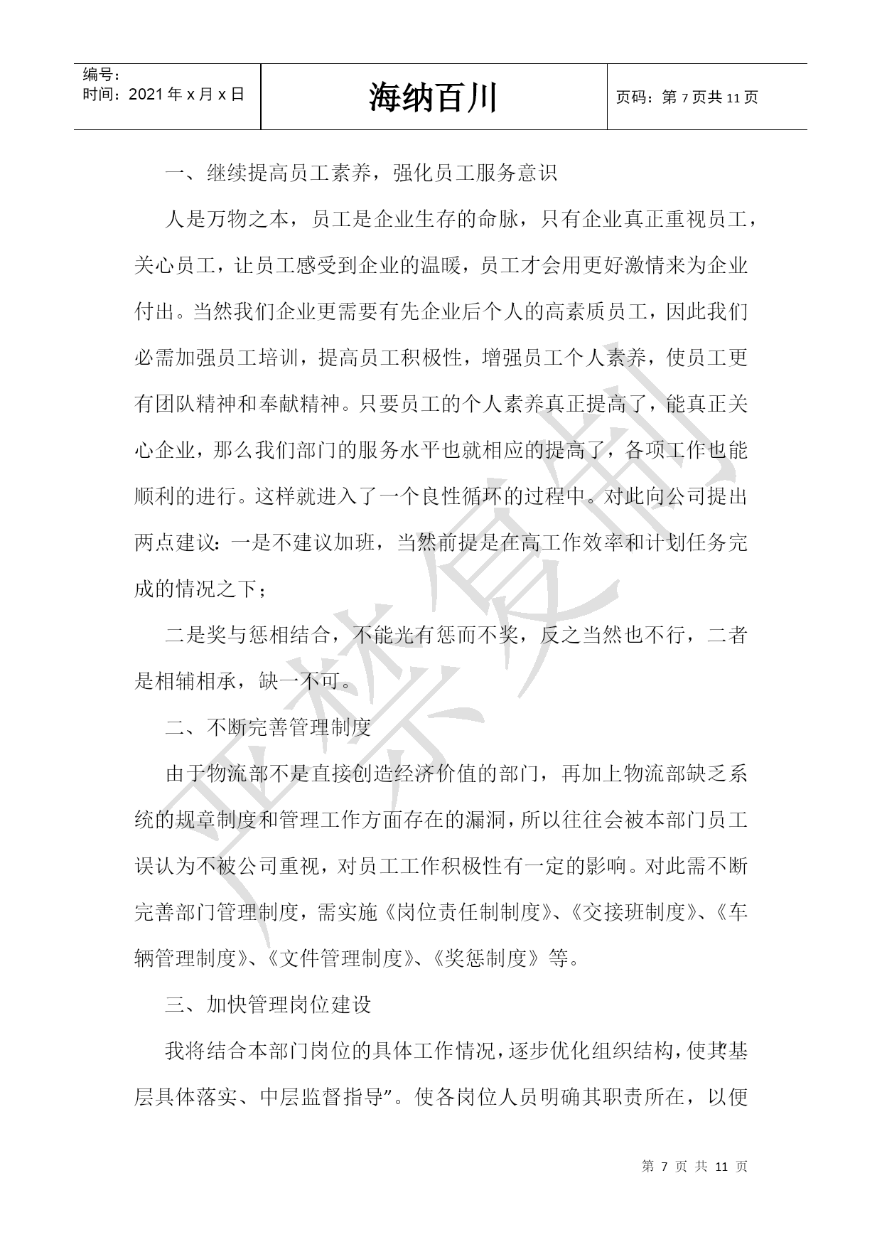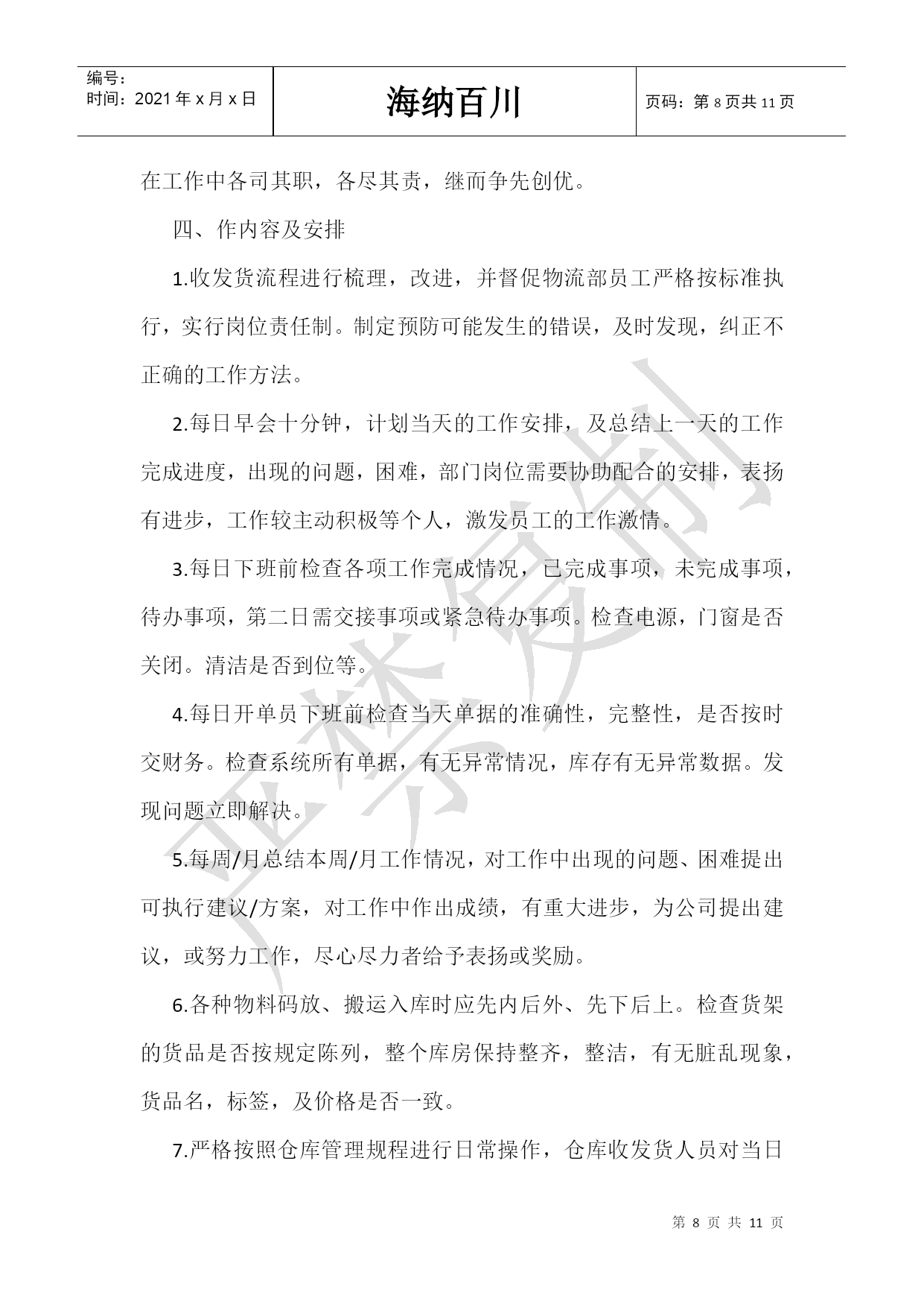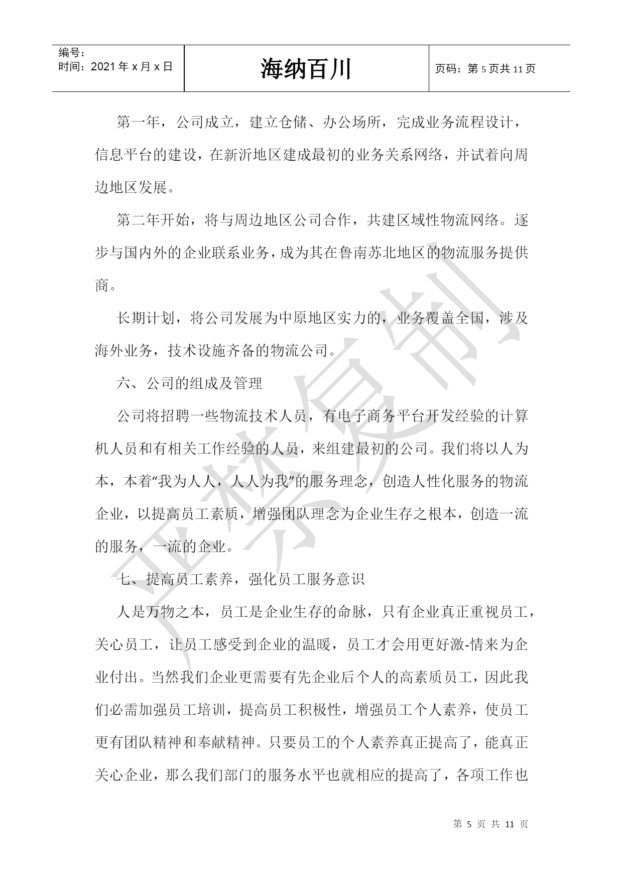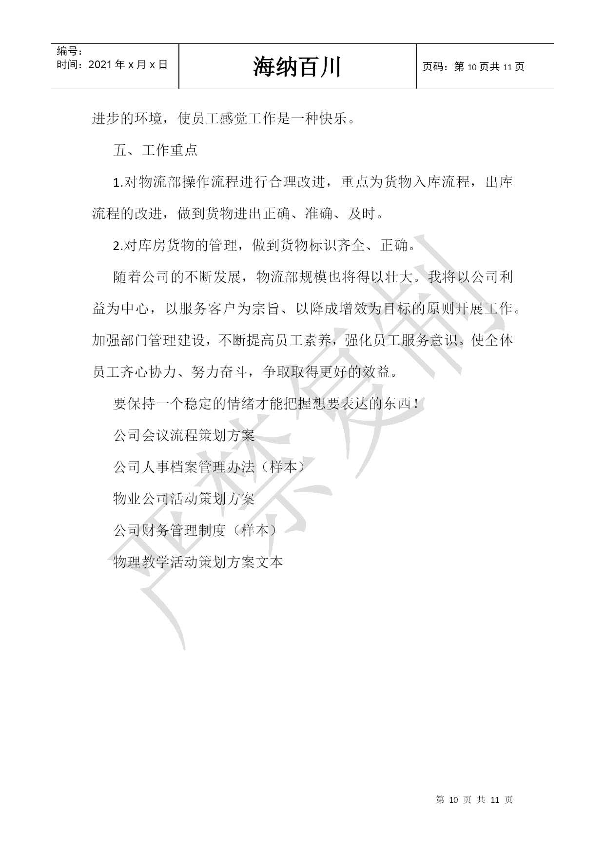 编号:时间:2021年x月x日海纳百川页码:第PAGE11页共NUMPAGES11页第PAGE\*MERGEFORMAT11页共NUMPAGES\*MERGEFORMAT11页物流管理公司策划方案样本物流管理公司策划方案样本做好管理水平提升、抓好人员素质提高,努力降低成本费用,提高效率效益,增强公司竞争实力。努力完成公司的工作任务,以下是豆花问答网为大家精心整理的物流管理公司策划方案样本,欢迎阅读。物流管理公司策划方案样本1一、确定仓库设施的参数仓库的设施,需根据所存储的产品类型来确定,一般有堆垛式设计,立体货架设计,或者堆垛式与立体式结合的设计类型。一般对于附加值较高、仓储要求较高的产品,应使用立体货架设计仓库。同时,还需确定仓储对象的包装参数、所需仓库设施参数,包括托盘参数、货架参数、叉车参数以及仓库面积等。二、仓库规划托盘为单面使用四向进又,托盘载重能力为500kg,托盘尺寸为1400mm×1100mm,托盘厚度为130mm。因货物高度达1.5m,高度较高,为保证堆码及存放安全,每托盘内的货物仅按一层码放,每层可码放6箱货物。三、货架参数货架采用横梁式货架。货架外围尺寸为长2900mm、宽1200mm、高3500mm;内围尺寸为:长2800mm、宽11O0mm、高3400mm。货格高度为1550+130=1680mm,货架分为上下两层,共两个货格;每货格码放两个托盘,具体尺寸为2800mm×1100mm.码放货物以后的实际高度为1680×2=3360mm,小于货架高度。货架采用横梁组合式。货架的整体形位尺寸完全按照自动立体仓库的要求设计,满足立体库设备长期自动运行的需求。每个货架每单位货格可以码放两个托盘,每托盘码放6箱货物,每货架分上下两层,即两个货格,则每货架可以码放货物24箱,共需2123/24=88.46=89个货架,分10排码放,5巷道,每排89/10=9个货架,因此一个货架区域总长度为9×2900(货架外围尺寸)=26100mm=26.1m。四、巷道设计仓库巷道宽度设计需要考虑托盘尺寸、货物单元尺寸、搬运车辆型号及其转弯半径的大小等参数。同时,也与货物堆存方式及车辆通行方式有关。根据货物的周转量大小,通道按单向和双向运行原则设计。若采用小型叉车搬运,一般单向设计为2.4~3.0m,双向5~6m。五、叉车参数普通叉车标准作业高度一般在3m,因此在设计货架高度的时候,要考虑叉车作业高度等主要技术参数。一般额定起升质量5000kg,最小转弯半径为3400mm,最小直角通道宽度为3000mm。六、库房整体布局依据库房总面积,一个货架区域面积为27m×26.1m。货架区域共设有5条巷道,货架分10排摆放,每排9列,每个货架分2层货格码放货物。每个货格中存放2个托盘,因此一个货架区域的货位(托盘存储数)为:10(排)×9(列)×2(层)×2(货位)=360个货位,且每个托盘可盛放6箱货物,则该区域存储能力应为360×6=2160箱货物。物流管理活动策划方案2一、公司概述1、公司名称:星空物流有限责任公司2、含义:我们物流有限责任公司是一家现代化综合服务型的专业第三方物流公司,公司是运输、仓储、货物配送与物流方案策划为一体的专业物流公司。二、业务规模、(一)业务规模服务直到永远,真诚贯穿始终,利益与之同行。作为第三方的物流发展平台,我们认识到了物流现在还是一个新兴行业,正在日趋发展,而我们公司也是一个刚刚成立的公司,在锁定目标客户的时候不应该是漫天撒网,而是选定几个对物流需求大的行业。而当今社会,基础上单一的运输模式已不再是物流社会的潮流,不再客户需要的物流服务,要想提高市场竞争力,扩大市场占有率,必须改变单一的发展模式,向先进的、全面的发展模式看齐,向运输、仓储、配送想结合的发展模式转变。科学技术以及管理上夜市同样的一个道理。(二)我们的服务服务形式:主要业务包含物流的基本业务即运输、仓储、包装及配送。服务优势:综合利用资源,减少资源浪费,取代“各自为战”的现有局面。三、公司选址我们将目标选定在一个有开发潜力市场——中原地区,选择一个有良好的基础设施的城市—新沂,依靠当地优惠的政策,一切从零开始,凭借我们的能力,依靠我们的技术去发展该地区的物流产业,进而联合国内市场,进军国际市场。四、人力资源管理公司成立之初采用树型结构与横向工作相结合,建立完善的部门,依靠项目经理与各个部门通力合作,完成我们的服务。各级管理人员形成一个团队,明确职责,各尽其能。建立有效的激励机制,为员工建立良好的工作环境。我们相信“我为人人”的服务理念,物流的服务从实质依然是为人服务。人不仅是公司以外的客户群,在公司内部我们人尽其才,才能确保物尽其用,本着