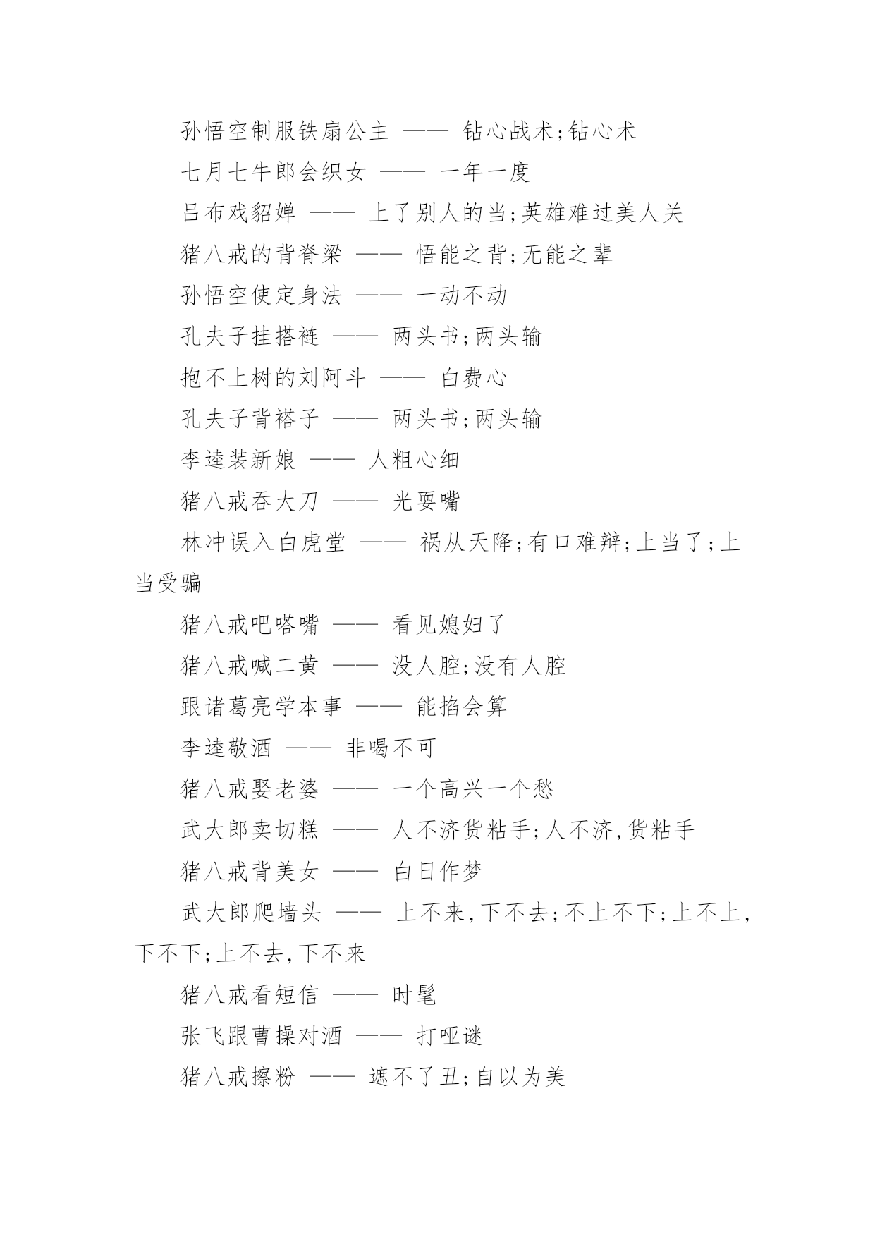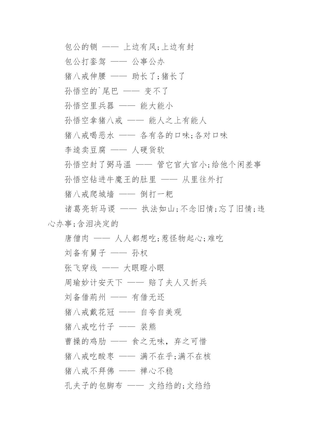 历史人物的歇后语历史人物的歇后语包公河的藕——无丝;无私猪八戒进盘丝洞——色迷心窍猪八戒爬墙头——倒打一耙李鬼见李逵——贼形毕露猪八戒掏耳朵——里面有货黑旋风李逵——有勇无谋猪八戒的钉耙——倒打一耙孙悟空进酸菜缸——齑猴儿了;急猴儿了孔夫子打哈欠——一口书生气;满口书生气;书生气;文气冲天刘备摔筷子——会遮掩武大郎卖蛇——什么人玩什么物李逵捉鱼——一条不得;一条得不到武大郎卖煎饼——人软货不硬;人怂货软包公铡侄子——不留情面;大义灭亲孔夫子背书箱——里面大有文章;尽是输;尽是书猪八戒摔倒在泔水桶里——又吃又喝包公铡包勉——大义灭亲;公事公办孙悟空蹲老君炉——受过锻炼关公保刘备——赤胆忠心诸葛亮掉井里——英雄无用武之地包公的铡——上边有风;上边有封包公打銮驾——公事公办猪八戒伸腰——助长了;猪长了孙悟空的`尾巴——变不了孙悟空里兵器——能大能小孙悟空拿猪八戒——能人之上有能人猪八戒喝恶水——各有各的口味;各对口味李逵卖豆腐——人硬货软孙悟空封了弼马温——管它官大官小;给他个闲差事孙悟空钻进牛魔王的肚里——从里往外打猪八戒爬城墙——倒打一耙诸葛亮斩马谡——执法如山;不念旧情;忘了旧情;违心办事;含泪决定的唐僧肉——人人都想吃;惹怪物起心;难吃刘备有舅子——孙权张飞穿线——大眼瞪小眼周瑜妙计安天下——赔了夫人又折兵刘备借荊州——有借无还猪八戒戴花冠——自夸自美观猪八戒吃竹子——装熊曹操的鸡肋——食之无味,弃之可惜猪八戒吃酸枣——满不在乎;满不在核猪八戒不拜佛——禅心不稳孔夫子的包脚布——文绉绉的;文绉绉孙悟空制服铁扇公主——钻心战术;钻心术七月七牛郎会织女——一年一度吕布戏貂婵——上了别人的当;英雄难过美人关猪八戒的背脊梁——悟能之背;无能之辈孙悟空使定身法——一动不动孔夫子挂搭裢——两头书;两头输抱不上树的刘阿斗——白费心孔夫子背褡子——两头书;两头输李逵装新娘——人粗心细猪八戒吞大刀——光耍嘴林冲误入白虎堂——祸从天降;有口难辩;上当了;上当受骗猪八戒吧嗒嘴——看见媳妇了猪八戒喊二黄——没人腔;没有人腔跟诸葛亮学本事——能掐会算李逵敬酒——非喝不可猪八戒娶老婆——一个高兴一个愁武大郎卖切糕——人不济货粘手;人不济,货粘手猪八戒背美女——白日作梦武大郎爬墙头——上不来,下不去;不上不下;上不上,下不下;上不去,下不来猪八戒看短信——时髦张飞跟曹操对酒——打哑谜猪八戒擦粉——遮不了丑;自以为美三请诸葛亮——诚心诚意猪八戒吃绣儿针——内绣;内秀