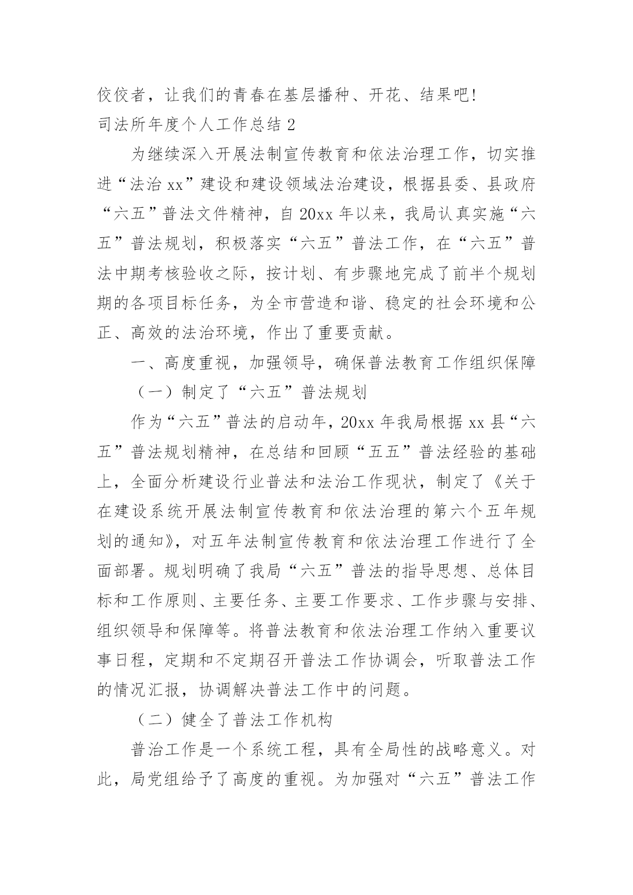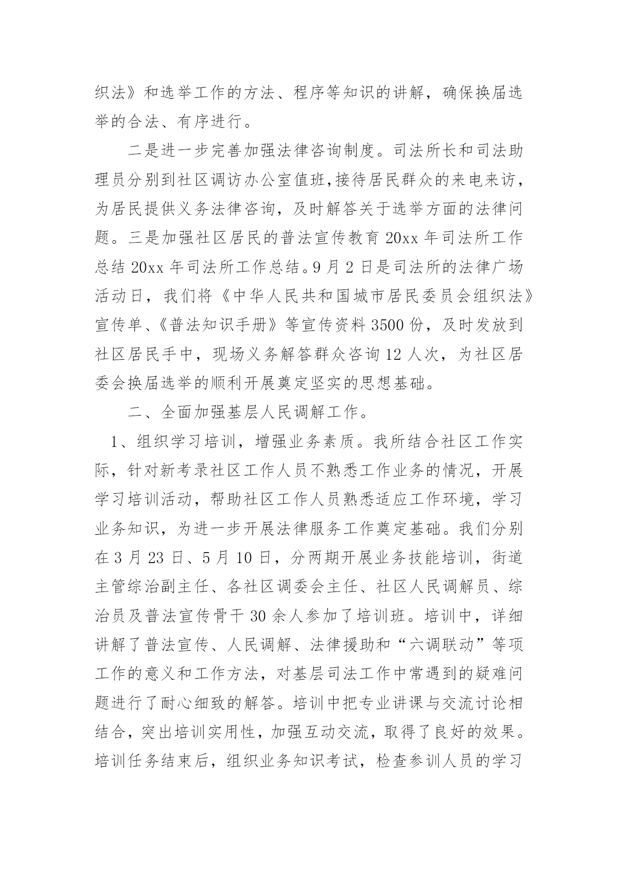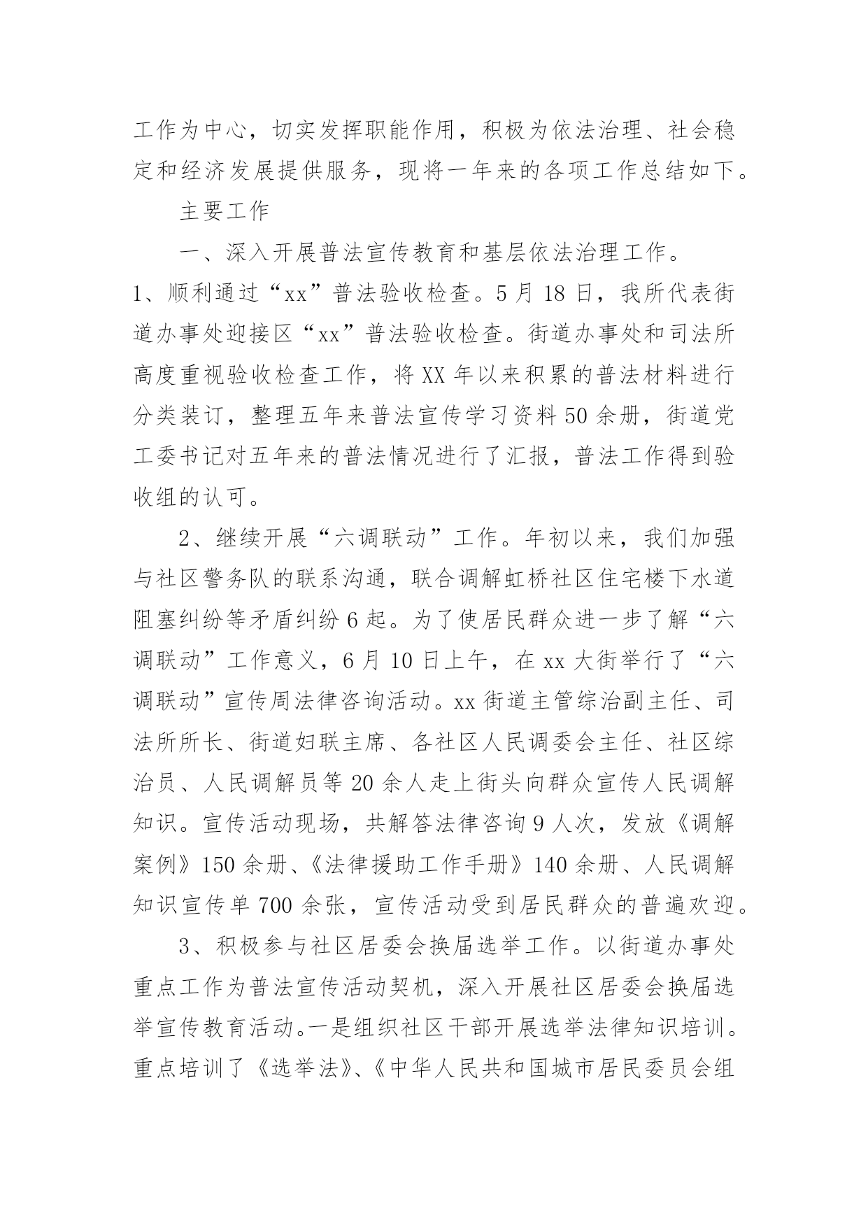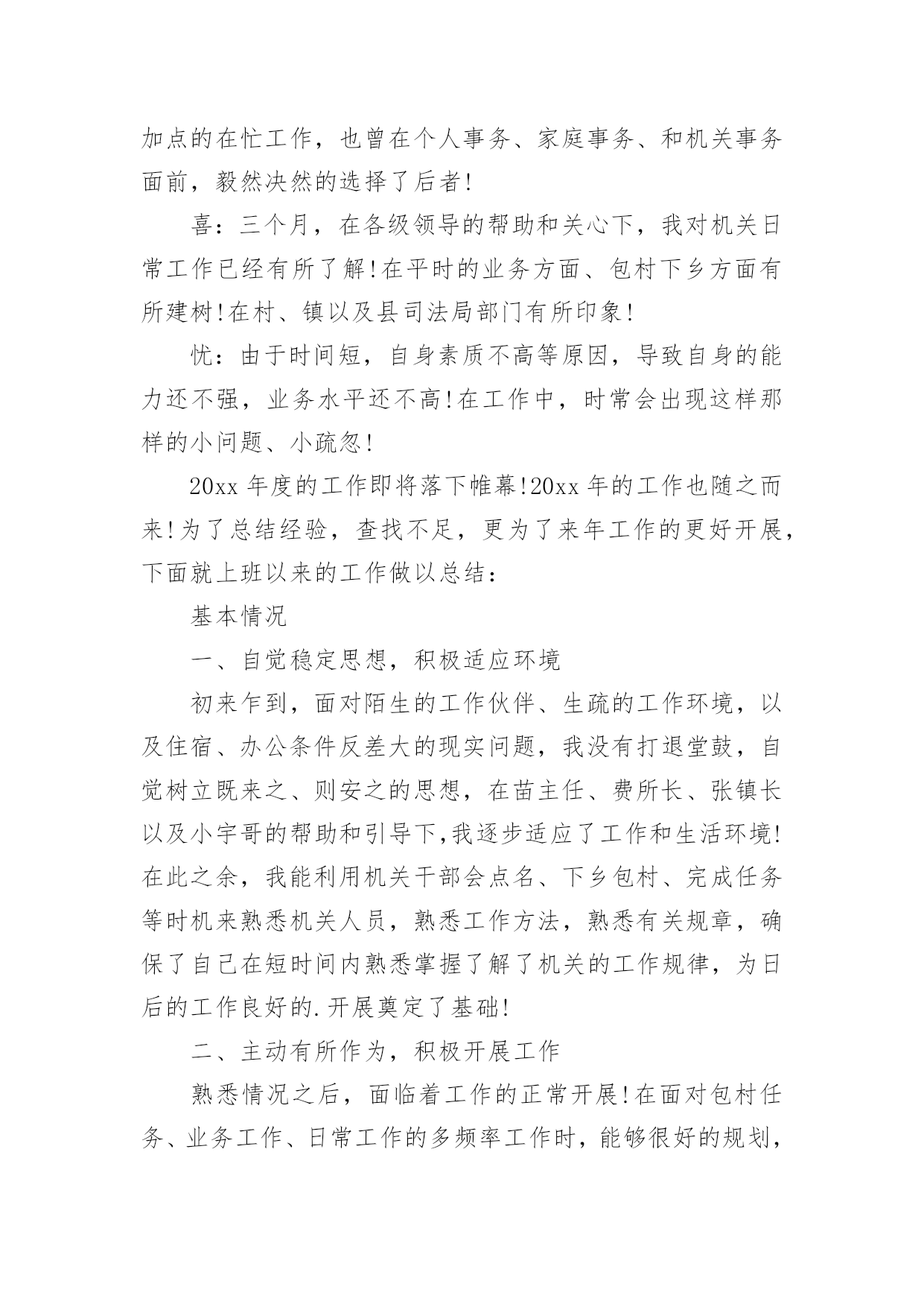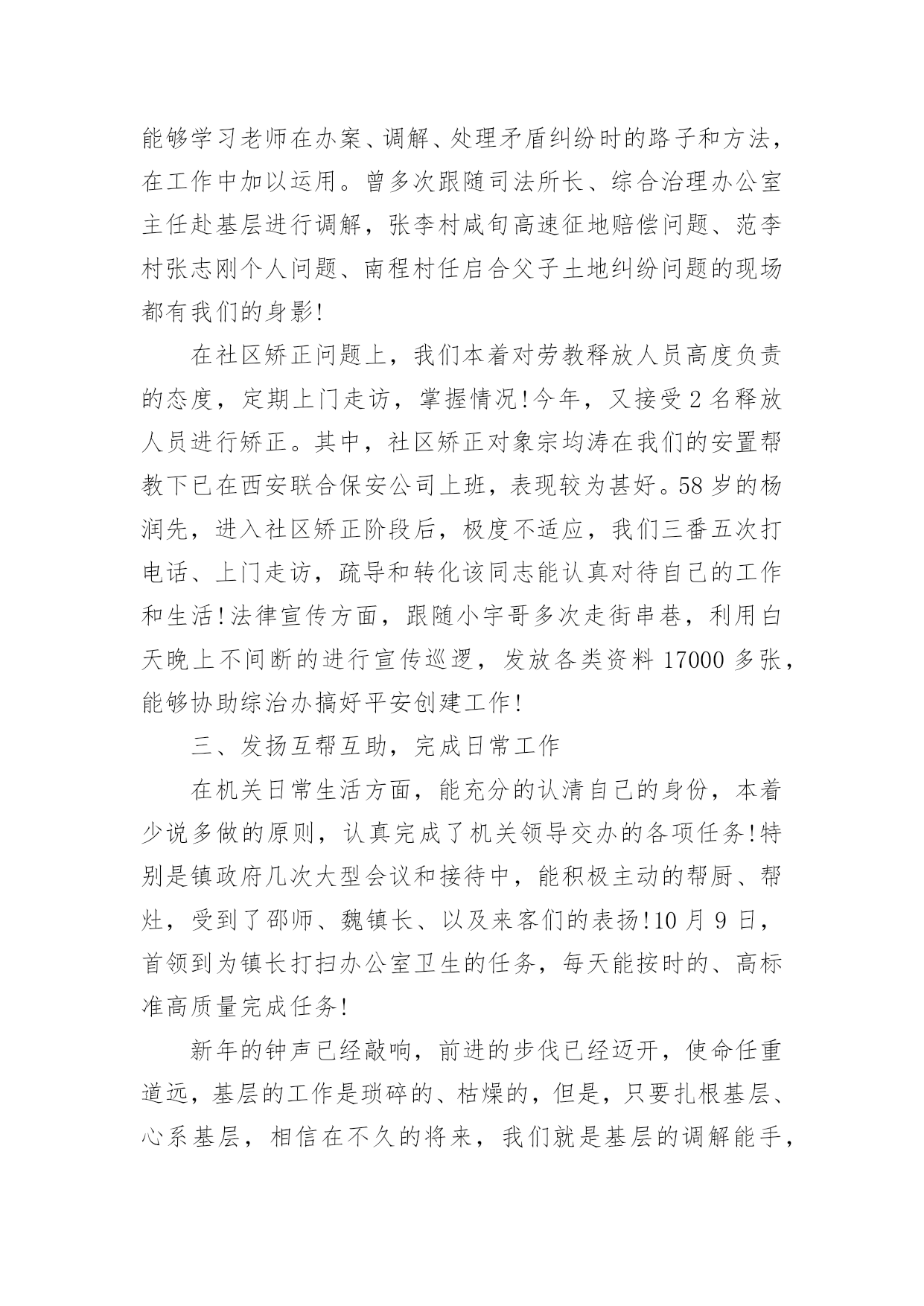 司法所年度个人工作总结司法所年度个人工作总结(热)总结是指社会团体、企业单位和个人在自身的某一时期、某一项目或某些工作告一段落或者全部完成后进行回顾检查、分析评价,从而肯定成绩,得到经验,找出差距,得出教训和一些规律性认识的一种书面材料,他能够提升我们的书面表达能力,不妨坐下来好好写写总结吧。那么你真的懂得怎么写总结吗?下面是小编收集整理的司法所年度个人工作总结,希望对大家有所帮助。司法所年度个人工作总结1光荏苒,岁月流逝,转眼间步入机关已整整三个月。三个月看似不长,但是确让我完成了许多个身份的转变,而就在这些不经意的身份转变中,我学会了适应、学会了投入、更学会了付出!这些转变让我更加珍惜这短暂而又悠长的上班生活!回顾上班以来的生活、工作、学习、业务等方面的开展情况,应该说:有得有失、喜忧参半!得:通过短短三个月的机关工作和生活,我得到了许多在书本、在校园里学不到的知识,让我将先前的理论和如今的实际结合的更加紧密!失:三个月里,也曾无数次牺牲自己的休息时间,加班加点的在忙工作,也曾在个人事务、家庭事务、和机关事务面前,毅然决然的选择了后者!喜:三个月,在各级领导的帮助和关心下,我对机关日常工作已经有所了解!在平时的业务方面、包村下乡方面有所建树!在村、镇以及县司法局部门有所印象!忧:由于时间短,自身素质不高等原因,导致自身的能力还不强,业务水平还不高!在工作中,时常会出现这样那样的小问题、小疏忽!20xx年度的工作即将落下帷幕!20xx年的工作也随之而来!为了总结经验,查找不足,更为了来年工作的更好开展,下面就上班以来的工作做以总结:基本情况一、自觉稳定思想,积极适应环境初来乍到,面对陌生的工作伙伴、生疏的工作环境,以及住宿、办公条件反差大的现实问题,我没有打退堂鼓,自觉树立既来之、则安之的思想,在苗主任、费所长、张镇长以及小宇哥的帮助和引导下,我逐步适应了工作和生活环境!在此之余,我能利用机关干部会点名、下乡包村、完成任务等时机来熟悉机关人员,熟悉工作方法,熟悉有关规章,确保了自己在短时间内熟悉掌握了解了机关的工作规律,为日后的工作良好的.开展奠定了基础!二、主动有所作为,积极开展工作熟悉情况之后,面临着工作的正常开展!在面对包村任务、业务工作、日常工作的多频率工作时,能够很好的规划,搞好工作统筹,确保了多项工作的顺利开展!包村之初,对村里情况一无所知!首先,能谦虚谨慎、虚心好学,遇到不懂不会的问题能够及时向师傅秦广面对面或者打电话请教!其次,从村干部开始建立良好的工作关系。从村干部到小组长、再到群众,逐步的认识人员,建立工作关系!最后,亲力亲为、主动作为,积极完成镇党委交与的任务!刚包寺底何村,为了工作不落在别人后面,我几乎每天下村一次,去跟文书熟悉村里情况!从人口、户口、产业、村情、民风等深入了解!镇政府安排的工作点面广、头绪多,我用笔记本做以记录,随身携带,逐一落实,确保工作万无一失!三个月,和师傅完成了寺底何村防讯工作、重建户审查、党支部换届选举、村委会换届选举、人大代表选举、村民小组长和村监督委员会选举、党报党刊征订、新合疗上缴、平安创建、扶贫路绿化!特别是新合疗的征收工作,面对13万的任务,能及时主动下到村里,给予督促,上门随访,确保了按时按点、保质保量的完成了任务!平安创建工作,经过平时的深入群众,年底县联合考核组在考核时,我村11户固定电话户对平安创建知识人人知晓!对创建平安陕西的目标户户满意!工作的成绩也受到了考核组的极大肯定!业务方面,能够摆正心态、从零学起!9月份,我们组织全镇人民调解员进行培训。自己在当好组织者的同时能兼顾好受训者,148法律服务所主任在授课时,能认真听讲、做好会议记录,同时能够学习老师在办案、调解、处理矛盾纠纷时的路子和方法,在工作中加以运用。曾多次跟随司法所长、综合治理办公室主任赴基层进行调解,张李村咸旬高速征地赔偿问题、范李村张志刚个人问题、南程村任启合父子土地纠纷问题的现场都有我们的身影!在社区矫正问题上,我们本着对劳教释放人员高度负责的态度,定期上门走访,掌握情况!今年,又接受2名释放人员进行矫正。其中,社区矫正对象宗均涛在我们的安置帮教下已在西安联合保安公司上班,表现较为甚好。58岁的杨润先,进入社区矫正阶段后,极度不适应,我们三番五次打电话、上门走访,疏导和转化该同志能认真对待自己的工作和生活!法律宣传方面,跟随小宇哥多次走街串巷,利用白天晚上不间断的进行宣传巡逻,发放各类资料17000多张,能够协助综治办搞好平安创建工作!三、发扬互帮互助,完成日常工作在机关日常生活方面,能充分的认清自己的身份,本着少说多做的原则,认真完成了机关领导交办的各项任务!特别是镇政府几次大型会议和接待中,能积极主动的帮厨、帮灶,受到了邵师、魏镇长、以及来客们的表扬!10月9日,首领到为镇长