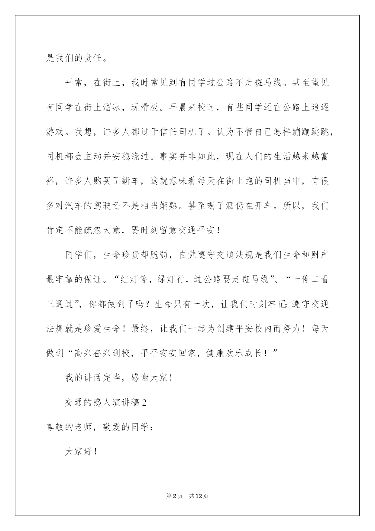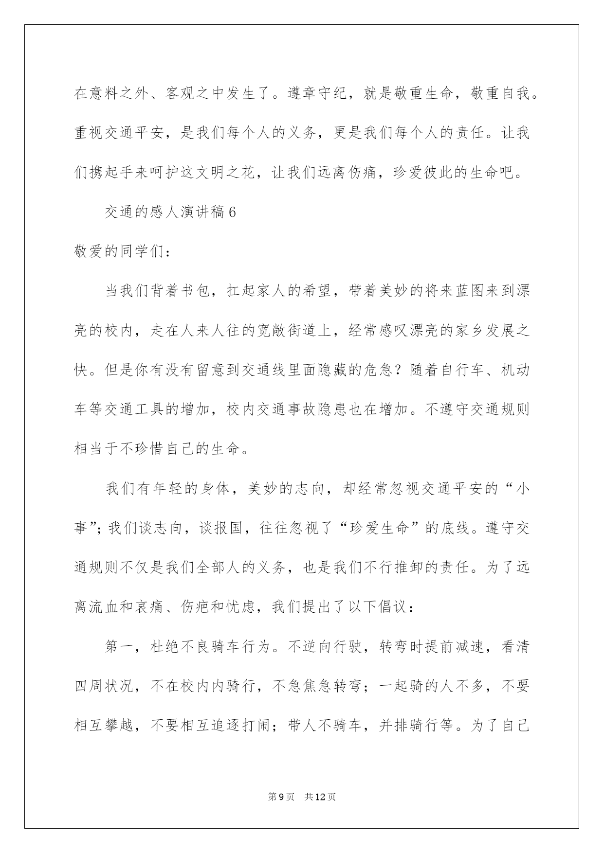 第PAGE\*Arabic\*MERGEFORMAT12页共NUMPAGES\*Arabic\*MERGEFORMAT12页第PAGE\*MERGEFORMAT12页共NUMPAGES\*MERGEFORMAT12页第PAGE\*MERGEFORMAT12页共NUMPAGES\*MERGEFORMAT12页第PAGE\*MERGEFORMAT12页共NUMPAGES\*MERGEFORMAT12页第PAGE\*MERGEFORMAT12页共NUMPAGES\*MERGEFORMAT12页第PAGE\*MERGEFORMAT12页共NUMPAGES\*MERGEFORMAT12页第PAGE\*MERGEFORMAT12页共NUMPAGES\*MERGEFORMAT12页第PAGE\*MERGEFORMAT12页共NUMPAGES\*MERGEFORMAT12页第PAGE\*MERGEFORMAT12页共NUMPAGES\*MERGEFORMAT12页第PAGE\*MERGEFORMAT12页共NUMPAGES\*MERGEFORMAT12页第PAGE\*MERGEFORMAT12页共NUMPAGES\*MERGEFORMAT12页2022交通的感人演讲稿2022关于交通的感人演讲稿(精选7篇)演讲稿特殊注意结构清晰,层次简明。在社会一步步向前发展的今日,我们都可能会用到演讲稿,在写之前,可以先参考范文,以下是我细心整理的2022关于交通的感人演讲稿(精选7篇),供大家参考借鉴,希望可以帮助到有须要的挚友。交通的感人演讲稿1老师们、同学们:大家早上好!今日我讲话的题目是《遵守交通规则》。依据国家交通部门统计,每年全国共发生十万多起,死亡数万人,受伤人数高达三十万之多。其中造成死亡人数最多的就是。这一组组惊人的数据,意味着在我们国家,平均每天有两百多个鲜活的生命因而消逝,这同时也意味着每一天都有亲人的哭泣和呼喊……这就提示着我们每一个人:必需时时刻刻留意交通平安!俗话说得好:“没有规则不成方圆”。因此,我们走在公路上都不能为所欲为,必需交通法规。遵守交通法规是我们每个人的义务,更是我们的责任。平常,在街上,我时常见到有同学过公路不走斑马线。甚至望见有同学在街上溜冰,玩滑板。早晨来校时,有些同学还在公路上追逐游戏。我想,许多人都过于信任司机了。认为不管自己怎样蹦蹦跳跳,司机都会主动并安稳绕过。事实并非如此,现在人们的生活越来越富裕,许多人购买了新车,这就意味着每天在街上跑的司机当中,有很多对汽车的驾驶还不是相当娴熟。甚至喝了酒仍在开车。所以,我们肯定不能疏忽大意,要时刻留意交通平安!同学们,生命珍贵却脆弱,自觉遵守交通法规是我们生命和财产最牢靠的保证。“红灯停,绿灯行,过公路要走斑马线”、“一停二看三通过”,你都做到了吗?生命只有一次,让我们时刻牢记:遵守交通法规就是珍爱生命!最终,让我们一起为创建平安校内而努力!每天做到“高兴奋兴到校,平平安安回家,健康欢乐成长!”我的讲话完毕,感谢大家!交通的感人演讲稿2尊敬的老师,敬爱的同学:大家好!生命平安如同泰山,我们必需要珍爱生命,远离危急。每年的交通事故不断发生,所以有很多人在交通事故上丢了自我的生命,这是让人多么痛哀的事情。当然,人们最不愿看到的是自我的亲人因为不留意,在那一瞬间闭上了双眼,从今离开人世!那么,今日让我来讲一讲如何珍爱生命吧!同学们,请你们想一想,当你在公路上游戏玩耍、追捉打闹时,你有没有想到过他的后果是什么?我们作为小学生,必需要学习交通规则,遵守交通规则。过公路上必需要看交通指示灯。红灯停,绿灯行,黄灯亮了等一等必需要熟记心头,照做执行。上学和下学之间是最重要的,不要在路上拥挤,这样最简单发生交通事故。不仅仅我们小学生要遵守交通规则,接送我们大人也要遵守。那一件件骇人听闻的交通事故使多少人丧生?使多少人受伤?又给多少人带来苦痛?有的失去了敬爱的父母,有的失去了挚爱的儿女,有的失去了朝夕相处的亲人……这血的教训莫非不值得深思、警觉吗?前些日子,在我们村里,一位三岁半的小女孩横穿公路,被三轮车给撞了,父母明白后,连忙送往医院,不幸的是这个小女孩已经奄奄一息了,那幼小的生命之火也瞬间熄灭了。父母心如刀割,哭得死去活来,但一切都无法挽回了,留给人们的仅有无尽的苦痛与愧恨。还有一件事,一位三四十岁的叔叔醉酒开车,与另一辆大车相撞,不幸死亡,车也撞坏了,真可谓是车毁人亡。这样的`事情真是太多了,但仍有不少人我行我素,无视交通规则。每个人的生命都是父母赐予的,人的生命仅有一次,人死不能复生。我们的生命不仅仅是自我的,它还属于