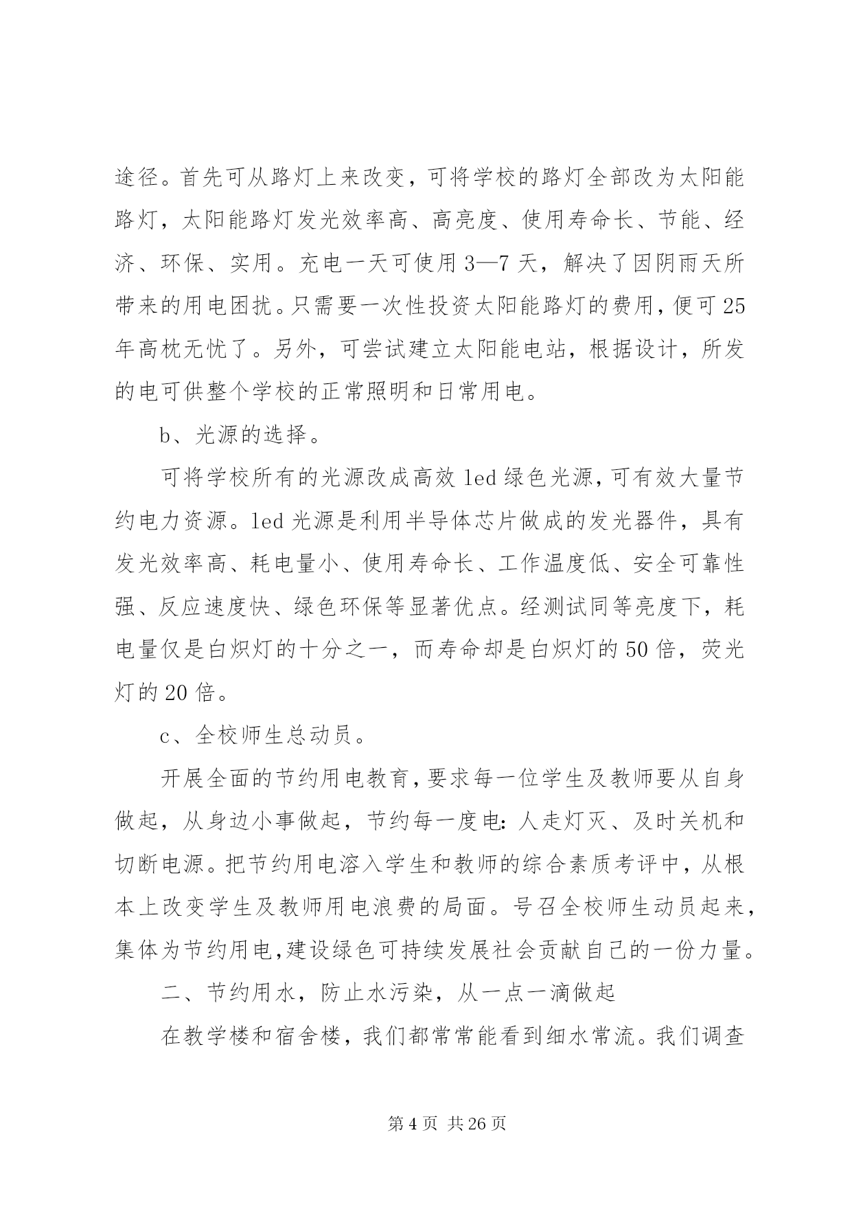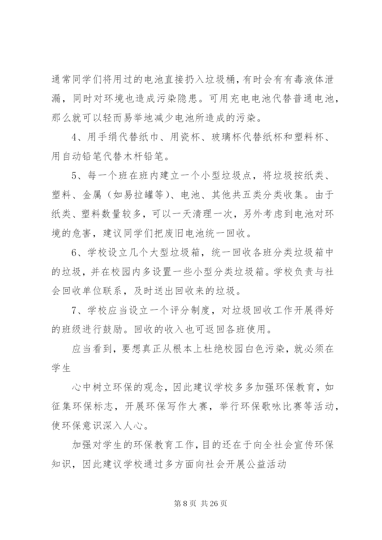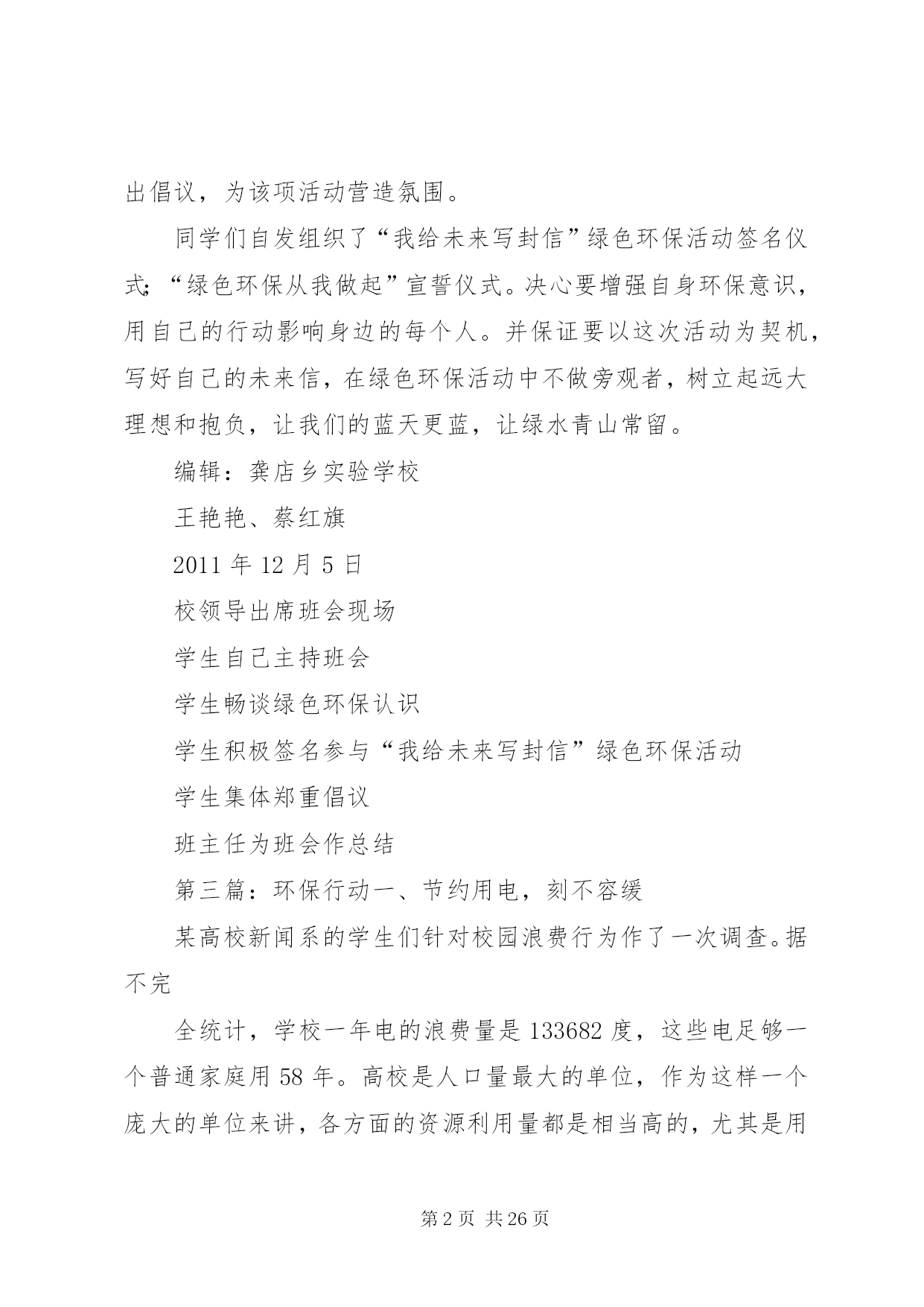 第PAGE\*Arabic\*MERGEFORMAT26页共NUMPAGES\*MERGEFORMAT26页校园环保行动安排为了让校园更加整洁,今天下午第二节课开始校园环保行动。各教室、各办公室以及校园各区域都要进行清扫或清洗,希望各老师积极行动起来。各年级除了负责自己教室卫生、周围包干区,还要负责校园公共区域的卫生,具体分配如下,请各年级组长协商好各班情况。一年级:旧教学楼前面广场、体育器材室门前草坪二年级:停车场、进校门左侧空地及草坪、旧教学楼教室后面走廊三年级:新教学楼架空层、旧水泥篮球场及附近草坪四年级:运动场及周围草坪、室外乒乓球区域五年级:塑胶篮球场及附近草坪、生物园六年级:风雨操场室内及周围草坪第二篇:绿色环保行动进校园龚店乡实验学校积极开展“绿色环保行动进校园”活动为唤起全体学生对环保重要性的认识,增强环境保护意识,自觉爱护环境、保护环境,切实从身边的小事做起,12月5日下午,龚店乡实验学校全体师生积极响XX县区教体局、邮政局发起的“我给未来写封信”绿色环保活动的号召,通过召开动员会、主题班会、发倡议书、办板报、发短消息等形式向校内外发出倡议,为该项活动营造氛围。同学们自发组织了“我给未来写封信”绿色环保活动签名仪式;“绿色环保从我做起”宣誓仪式。决心要增强自身环保意识,用自己的行动影响身边的每个人。并保证要以这次活动为契机,写好自己的未来信,在绿色环保活动中不做旁观者,树立起远大理想和抱负,让我们的蓝天更蓝,让绿水青山常留。编辑:龚店乡实验学校王艳艳、蔡红旗2011年12月5日校领导出席班会现场学生自己主持班会学生畅谈绿色环保认识学生积极签名参与“我给未来写封信”绿色环保活动学生集体郑重倡议班主任为班会作总结第三篇:环保行动一、节约用电,刻不容缓某高校新闻系的学生们针对校园浪费行为作了一次调查。据不完全统计,学校一年电的浪费量是133682度,这些电足够一个普通家庭用58年。高校是人口量最大的单位,作为这样一个庞大的单位来讲,各方面的资源利用量都是相当高的,尤其是用电量,数目是相当惊人的。为此,高校更应该把节约用电列入学校长期发展规划中。学校的领导组织及有关部门,应首先加强自身的节约用电的思想意识,多方位了解节约用电的多种方法途径,努力为了学校的长期发展作出正确的选择。节约能源不是一朝一夕的事情,要从长期发展来看待学校的节约用电的问题。高校作为一种培育高等人才的教育基地,更应该全方位培养学生的素质,节能降耗就是一个实实在在的教育实例。a、电力的选择。就目前来讲,虽然市电已不再像以前那么昂贵,但对于用电大户来讲,依然是不堪重负。对比各种用电途径,太阳能发电系统在诸如高校工厂这类用电量庞大的系统中,具有相当的优势。拿太阳能灯具来讲。首先,太阳能灯具是利用太阳光电转换提供电能,取之不尽、用之不竭。其次,太阳能是绿色能源,环保无污染,符合我国现阶段提倡绿色环保的发展主题。第三,太阳能发出的电是低压直流电,因此绝对不会发生触电、火灾等安全事故。第四,太阳能安装方便简单,不需要另架电线,可就地自发自用,避免了因施工带来的不安全和不方便的因素。第五,一次投资与交流电长期投资等价,一次投资,长期受用。一般来讲,太阳能发电可质保25年,与交流电相比,减少了人工费、维修费及昂贵的电费。鉴于高校的长期发展性,太阳能进入高校是最佳的节约用电途径。首先可从路灯上来改变,可将学校的路灯全部改为太阳能路灯,太阳能路灯发光效率高、高亮度、使用寿命长、节能、经济、环保、实用。充电一天可使用3—7天,解决了因阴雨天所带来的用电困扰。只需要一次性投资太阳能路灯的费用,便可25年高枕无忧了。另外,可尝试建立太阳能电站,根据设计,所发的电可供整个学校的正常照明和日常用电。b、光源的选择。可将学校所有的光源改成高效led绿色光源,可有效大量节约电力资源。led光源是利用半导体芯片做成的发光器件,具有发光效率高、耗电量小、使用寿命长、工作温度低、安全可靠性强、反应速度快、绿色环保等显著优点。经测试同等亮度下,耗电量仅是白炽灯的十分之一,而寿命却是白炽灯的50倍,荧光灯的20倍。c、全校师生总动员。开展全面的节约用电教育,要求每一位学生及教师要从自身做起,从身边小事做起,节约每一度电:人走灯灭、及时关机和切断电源。把节约用电溶入学生和教师的综合素质考评中,从根本上改变学生及教师用电浪费的局面。号召全校师生动员起来,集体为节约用电,建设绿色可持续发展社会贡献自己的一份力量。二、节约用水,防止水污染,从一点一滴做起在教学楼和宿舍楼,我们都常常能看到细水常流。我们调查得出,假如一座教学楼用水的浪费量平均是2945.2吨,依此推算,主校区若有13座教学楼,就有38287.5吨水被浪费掉;宿舍楼平均用水浪费量是571.7吨,主校区如果有29