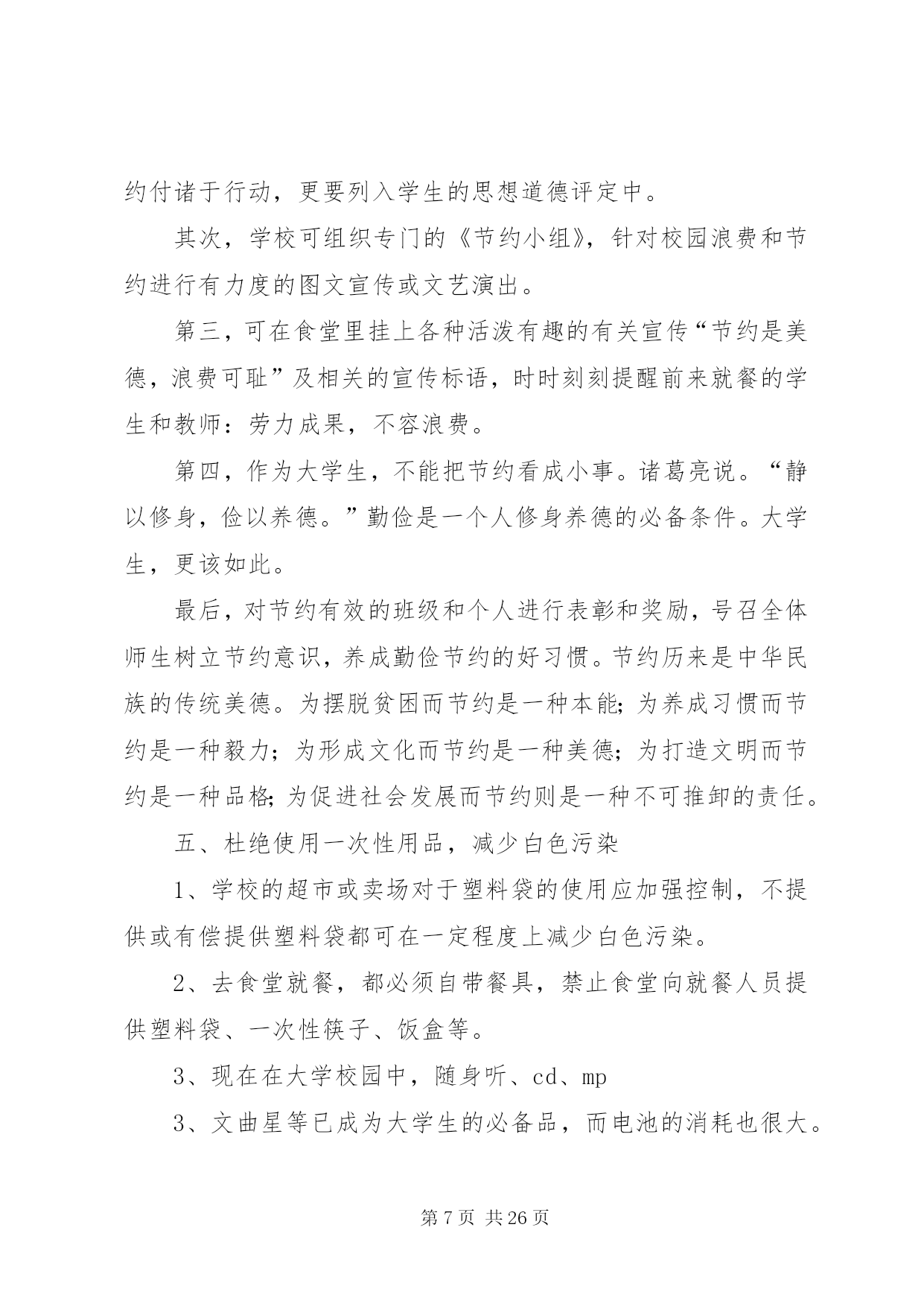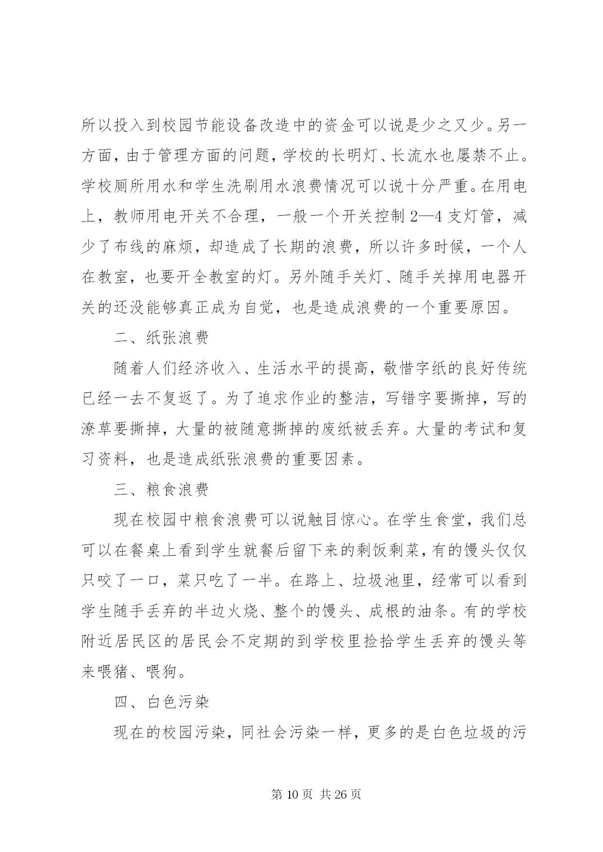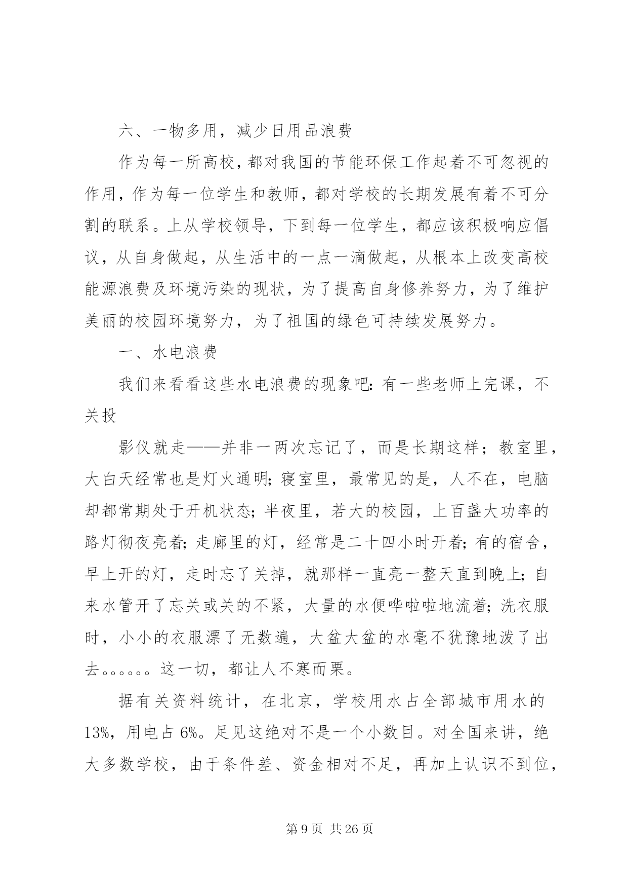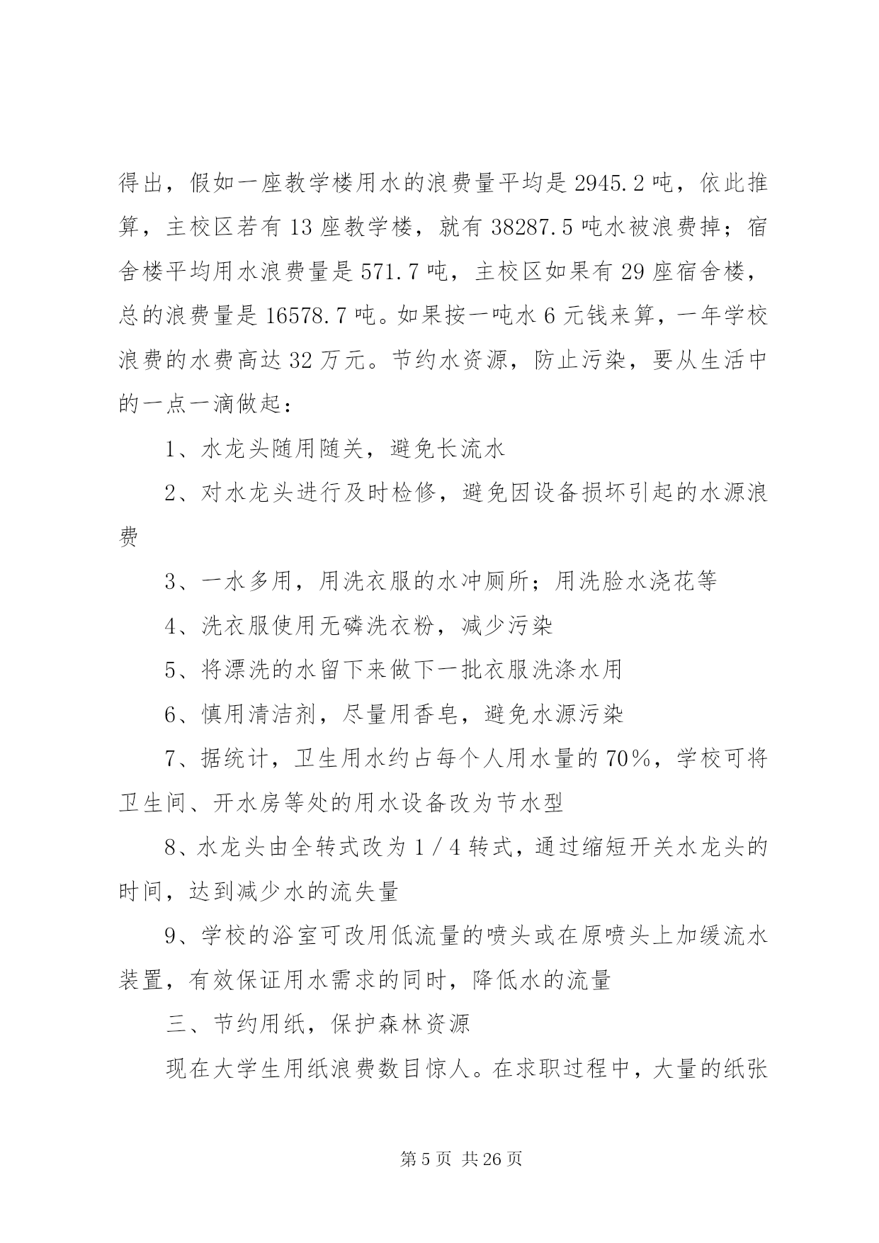 第PAGE\*Arabic\*MERGEFORMAT26页共NUMPAGES\*MERGEFORMAT26页校园环保行动安排为了让校园更加整洁,今天下午第二节课开始校园环保行动。各教室、各办公室以及校园各区域都要进行清扫或清洗,希望各老师积极行动起来。各年级除了负责自己教室卫生、周围包干区,还要负责校园公共区域的卫生,具体分配如下,请各年级组长协商好各班情况。一年级:旧教学楼前面广场、体育器材室门前草坪二年级:停车场、进校门左侧空地及草坪、旧教学楼教室后面走廊三年级:新教学楼架空层、旧水泥篮球场及附近草坪四年级:运动场及周围草坪、室外乒乓球区域五年级:塑胶篮球场及附近草坪、生物园六年级:风雨操场室内及周围草坪第二篇:绿色环保行动进校园龚店乡实验学校积极开展“绿色环保行动进校园”活动为唤起全体学生对环保重要性的认识,增强环境保护意识,自觉爱护环境、保护环境,切实从身边的小事做起,12月5日下午,龚店乡实验学校全体师生积极响XX县区教体局、邮政局发起的“我给未来写封信”绿色环保活动的号召,通过召开动员会、主题班会、发倡议书、办板报、发短消息等形式向校内外发出倡议,为该项活动营造氛围。同学们自发组织了“我给未来写封信”绿色环保活动签名仪式;“绿色环保从我做起”宣誓仪式。决心要增强自身环保意识,用自己的行动影响身边的每个人。并保证要以这次活动为契机,写好自己的未来信,在绿色环保活动中不做旁观者,树立起远大理想和抱负,让我们的蓝天更蓝,让绿水青山常留。编辑:龚店乡实验学校王艳艳、蔡红旗2011年12月5日校领导出席班会现场学生自己主持班会学生畅谈绿色环保认识学生积极签名参与“我给未来写封信”绿色环保活动学生集体郑重倡议班主任为班会作总结第三篇:环保行动一、节约用电,刻不容缓某高校新闻系的学生们针对校园浪费行为作了一次调查。据不完全统计,学校一年电的浪费量是133682度,这些电足够一个普通家庭用58年。高校是人口量最大的单位,作为这样一个庞大的单位来讲,各方面的资源利用量都是相当高的,尤其是用电量,数目是相当惊人的。为此,高校更应该把节约用电列入学校长期发展规划中。学校的领导组织及有关部门,应首先加强自身的节约用电的思想意识,多方位了解节约用电的多种方法途径,努力为了学校的长期发展作出正确的选择。节约能源不是一朝一夕的事情,要从长期发展来看待学校的节约用电的问题。高校作为一种培育高等人才的教育基地,更应该全方位培养学生的素质,节能降耗就是一个实实在在的教育实例。a、电力的选择。就目前来讲,虽然市电已不再像以前那么昂贵,但对于用电大户来讲,依然是不堪重负。对比各种用电途径,太阳能发电系统在诸如高校工厂这类用电量庞大的系统中,具有相当的优势。拿太阳能灯具来讲。首先,太阳能灯具是利用太阳光电转换提供电能,取之不尽、用之不竭。其次,太阳能是绿色能源,环保无污染,符合我国现阶段提倡绿色环保的发展主题。第三,太阳能发出的电是低压直流电,因此绝对不会发生触电、火灾等安全事故。第四,太阳能安装方便简单,不需要另架电线,可就地自发自用,避免了因施工带来的不安全和不方便的因素。第五,一次投资与交流电长期投资等价,一次投资,长期受用。一般来讲,太阳能发电可质保25年,与交流电相比,减少了人工费、维修费及昂贵的电费。鉴于高校的长期发展性,太阳能进入高校是最佳的节约用电途径。首先可从路灯上来改变,可将学校的路灯全部改为太阳能路灯,太阳能路灯发光效率高、高亮度、使用寿命长、节能、经济、环保、实用。充电一天可使用3—7天,解决了因阴雨天所带来的用电困扰。只需要一次性投资太阳能路灯的费用,便可25年高枕无忧了。另外,可尝试建立太阳能电站,根据设计,所发的电可供整个学校的正常照明和日常用电。b、光源的选择。可将学校所有的光源改成高效led绿色光源,可有效大量节约电力资源。led光源是利用半导体芯片做成的发光器件,具有发光效率高、耗电量小、使用寿命长、工作温度低、安全可靠性强、反应速度快、绿色环保等显著优点。经测试同等亮度下,耗电量仅是白炽灯的十分之一,而寿命却是白炽灯的50倍,荧光灯的20倍。c、全校师生总动员。开展全面的节约用电教育,要求每一位学生及教师要从自身做起,从身边小事做起,节约每一度电:人走灯灭、及时关机和切断电源。把节约用电溶入学生和教师的综合素质考评中,从根本上改变学生及教师用电浪费的局面。号召全校师生动员起来,集体为节约用电,建设绿色可持续发展社会贡献自己的一份力量。二、节约用水,防止水污染,从一点一滴做起在教学楼和宿舍楼,我们都常常能看到细水常流。我们调查得出,假如一座教学楼用水的浪费量平均是2945.2吨,依此推算,主校区若有13座教学楼,就有38287.5吨水被浪费掉;宿舍楼平均用水浪费量是571.7吨,主校区如果有29