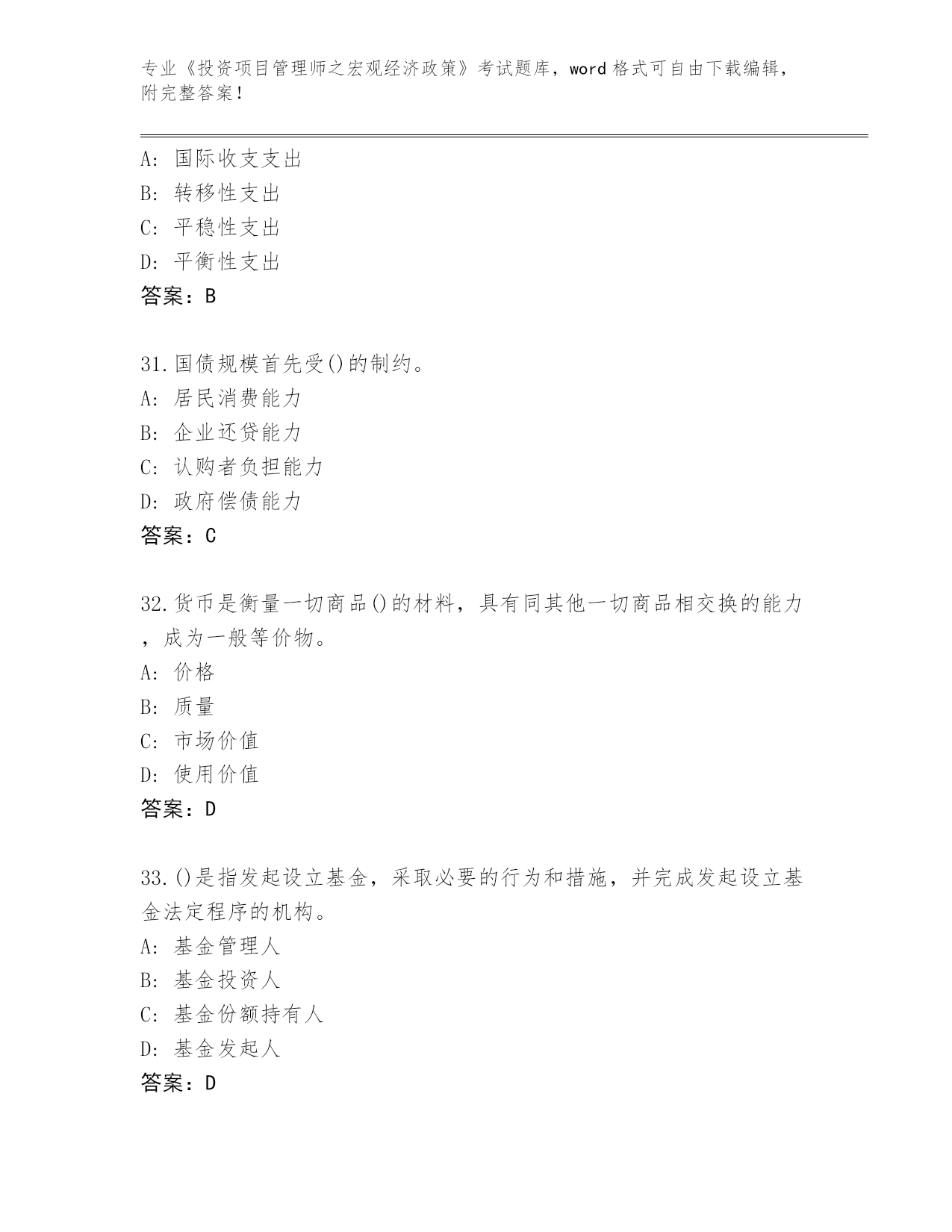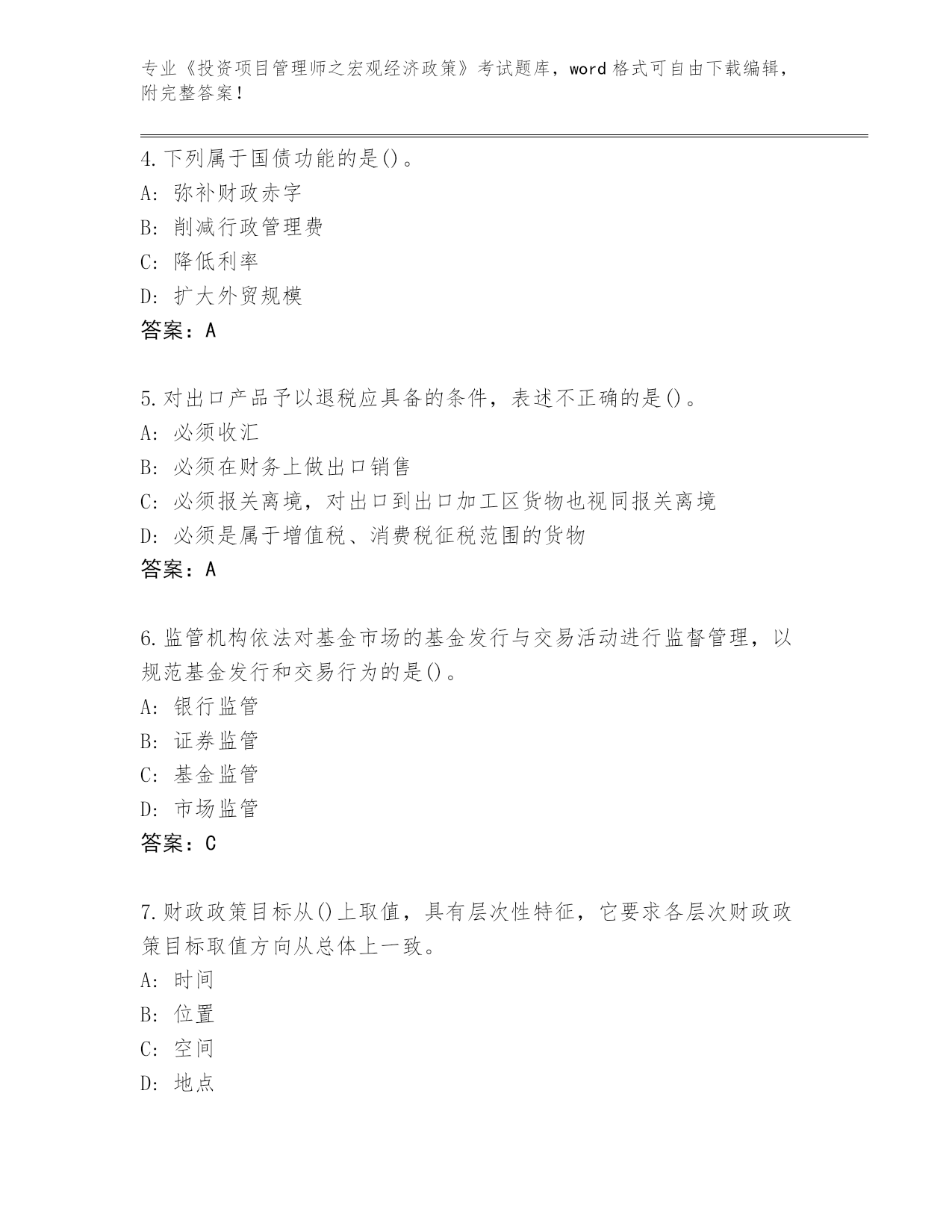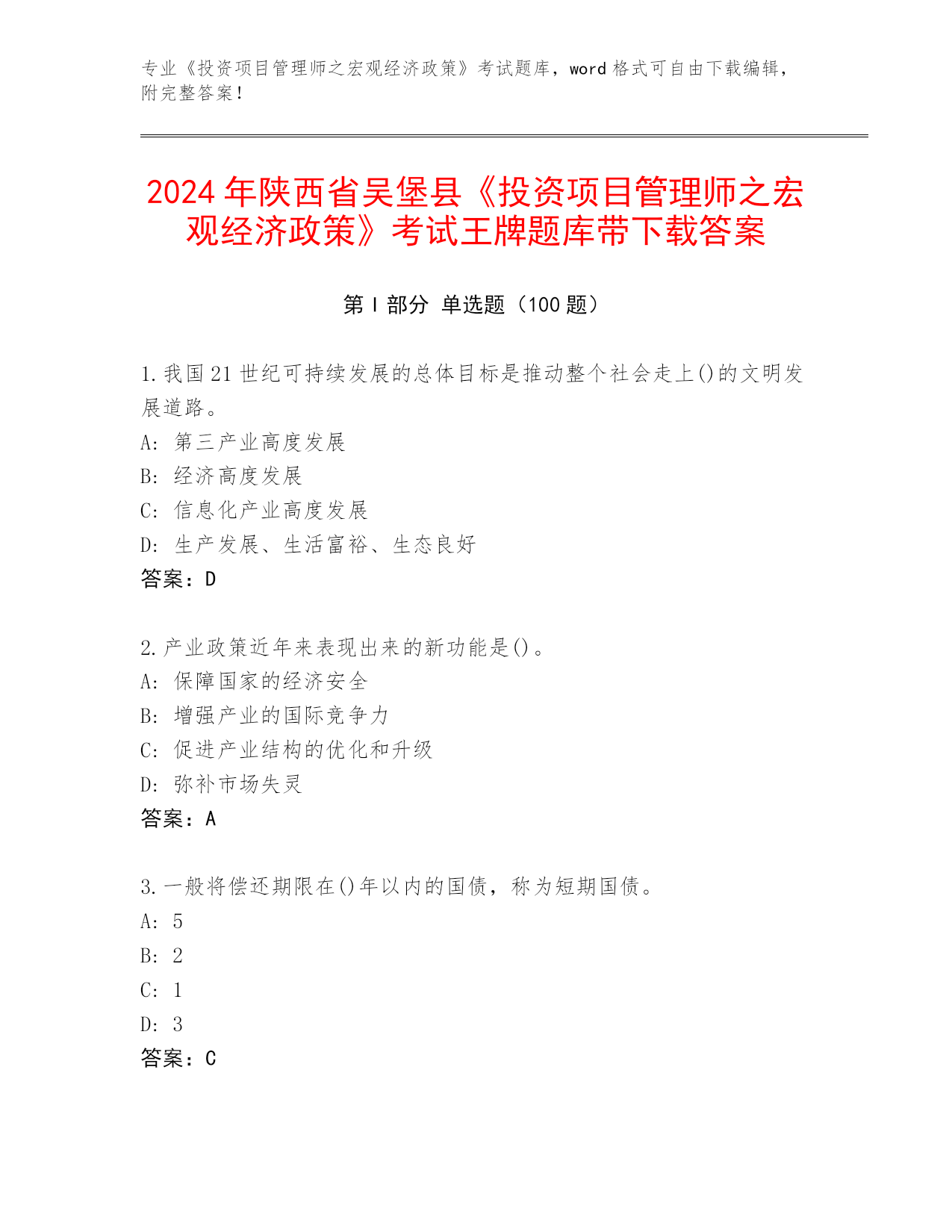2024年陕西省吴堡县《投资项目管理师之宏观经济政策》考试王牌题库带下载答案