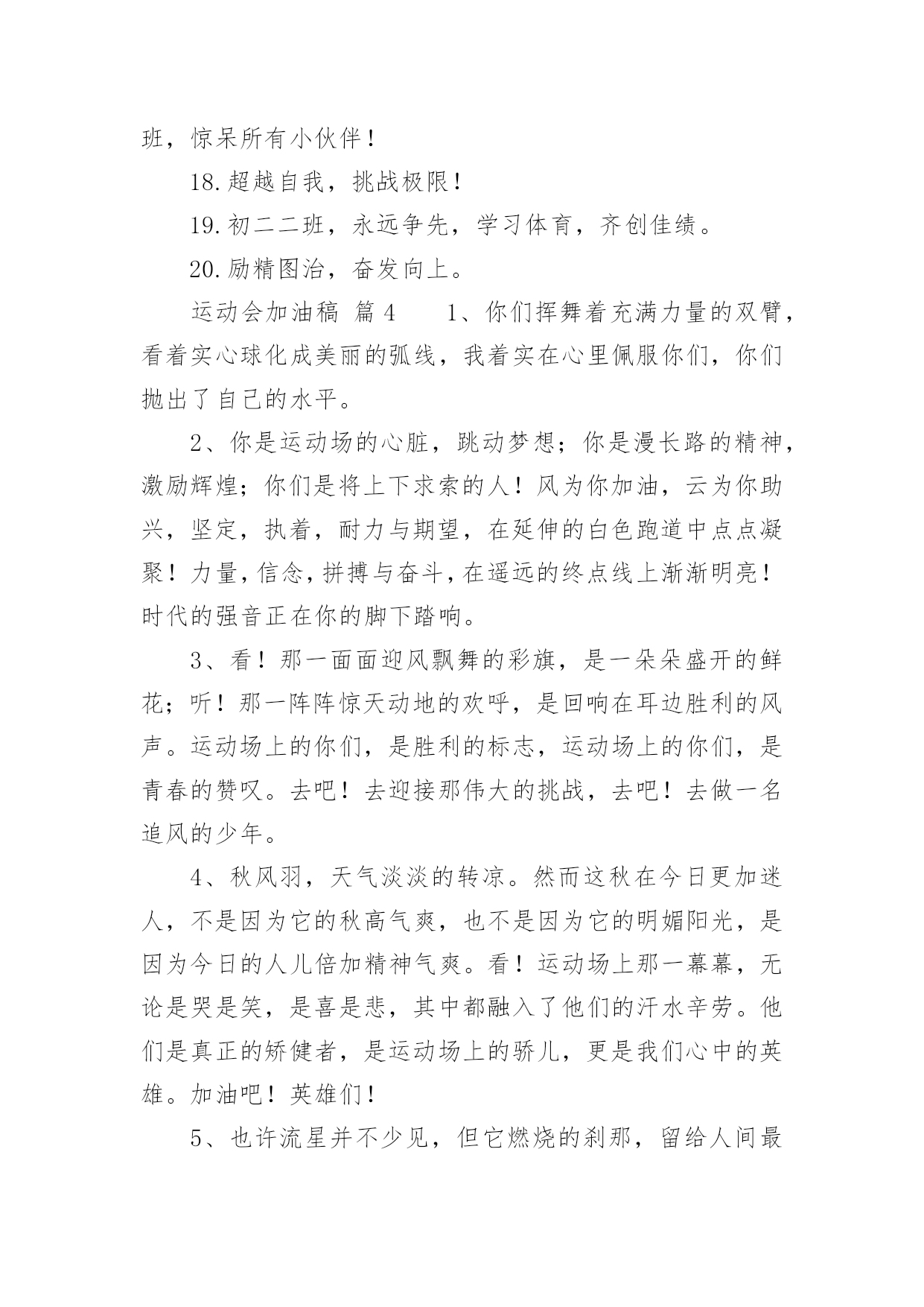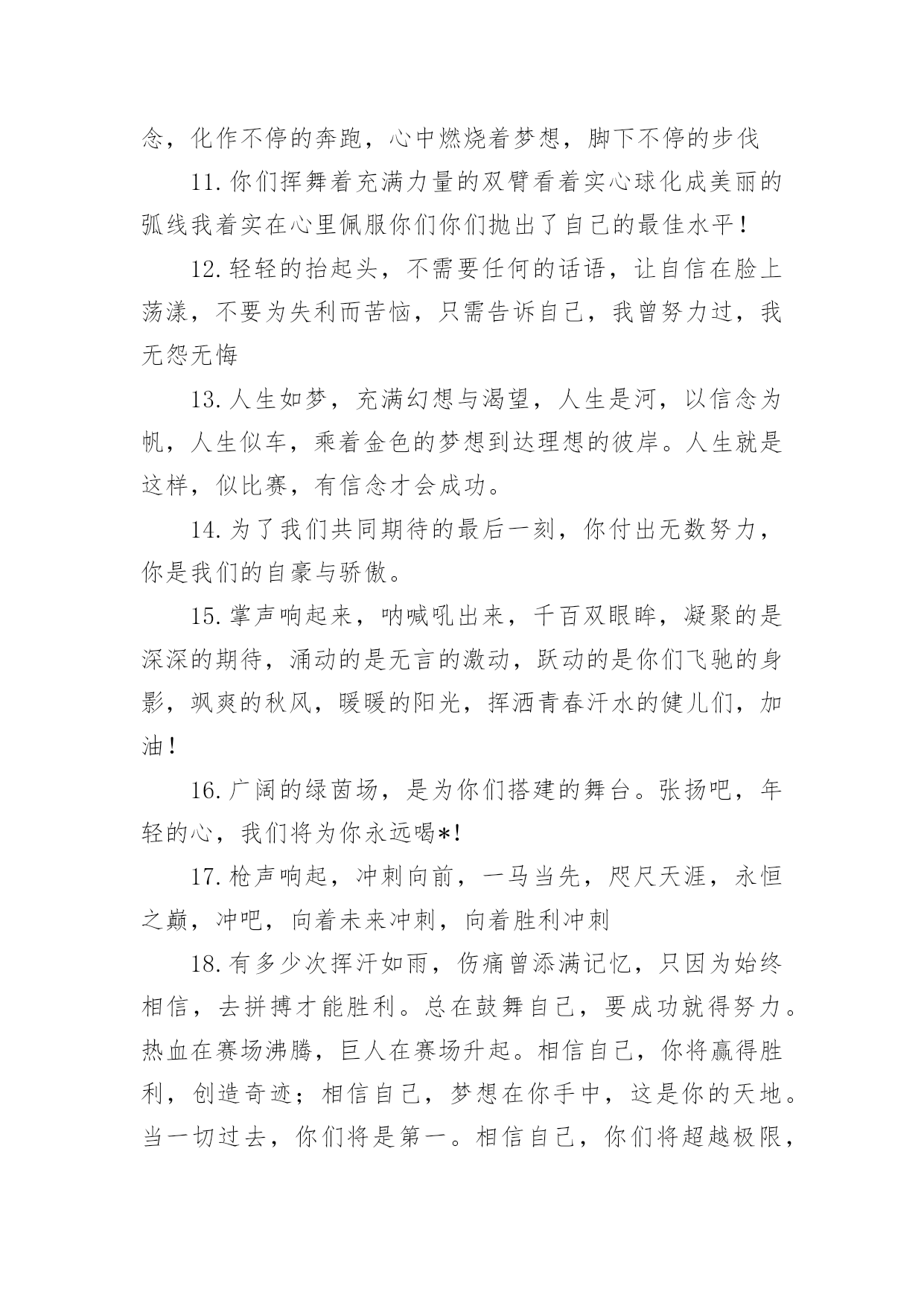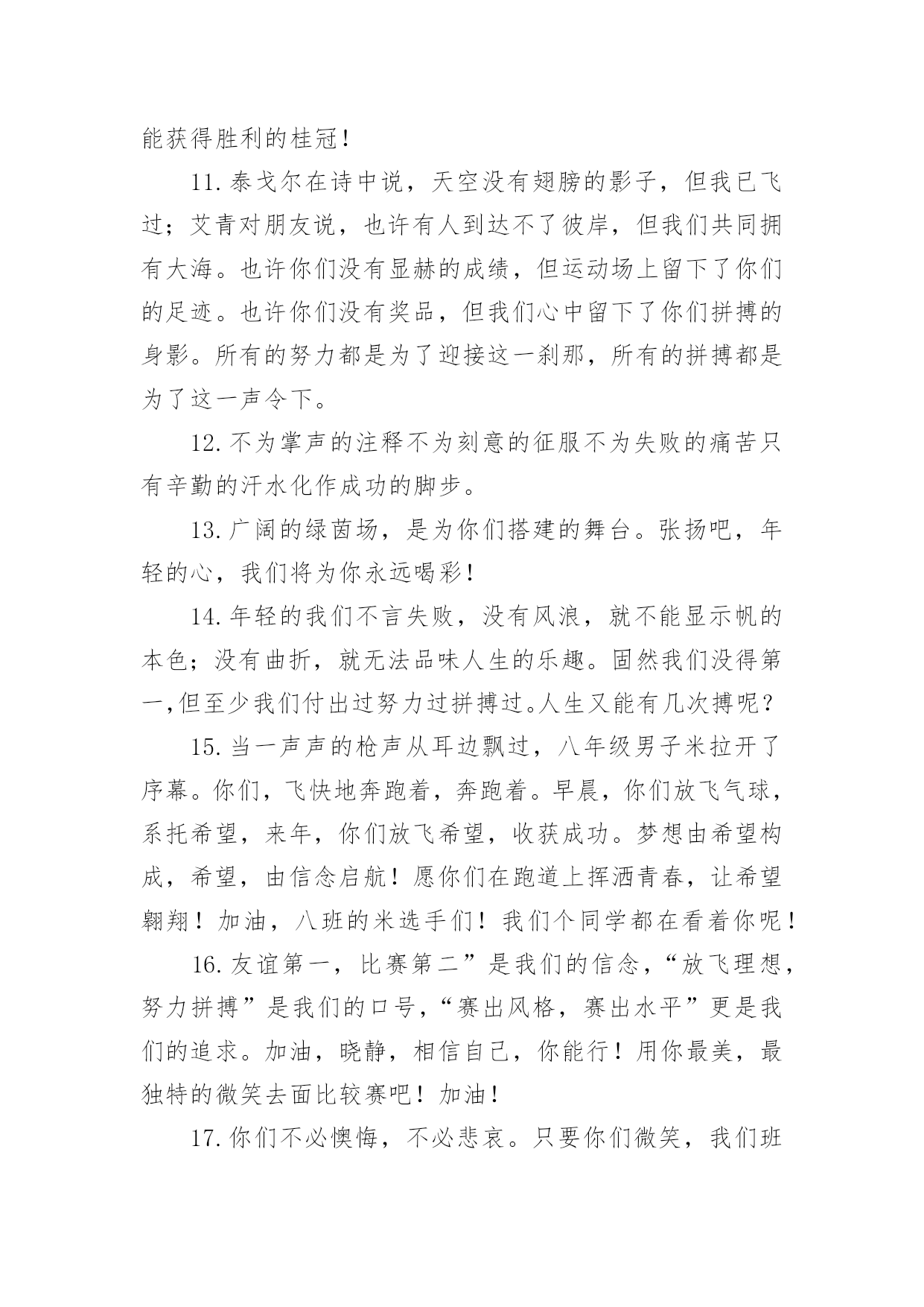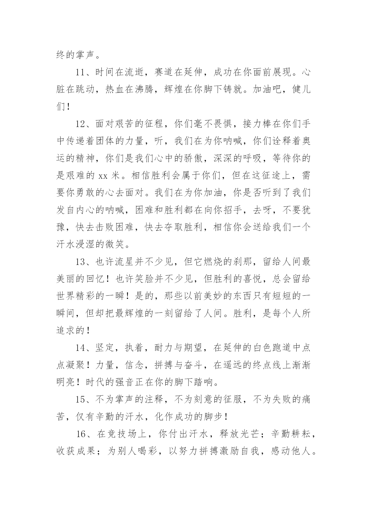 运动会加油稿运动会加油稿(精华12篇)在日新月异的现代社会中,我们都跟加油稿有着直接或间接的联系,加油稿是鼓励激励对方的文稿。写起加油稿来就毫无头绪?下面是小编精心整理的运动会加油稿,仅供参考,希望能够帮助到大家。运动会加油稿篇11.看完了九年级女子米比赛,她们苍白的面孔,发干的嘴唇,让人看了不免有些心痛。琼瑶曾生婷婷你们飒爽的英姿在跑道上展现,全班同学都会为你们加油的。为你们骄傲。2.我们班可爱的“梁老大”“吴宝鸡”,我们会在身后默默支持你的!会永远记住你们标志性的动作的,无二,那将会是运动场上的亮点!3.九年三班XX同学,成绩优越的你是我们班的骄傲,我相信,站在跑道的你必须能创造奇迹,有希望,有梦想,就会有自己的成功,胜不骄,败不馁,我相信你必须会有所收获的。4.不为鲜花的围绕,不为刹那的荣耀,只有执着的信念,化作不停的奔跑,心中燃烧着梦想,脚下不停的步伐。5.你们挥舞着充满力量的.双臂看着实心球化成美丽的弧线我着实在心里佩服你们你们抛出了自己的水平。6.也许流星并不少见,但它燃烧的刹那,留给人间最美丽的回忆!也许笑脸并不少见,但胜利的喜悦,总会留给世界精彩的一瞬!是的,那些以前美妙的东西只有短短的一瞬间,但那却把最辉煌的一刻留给了人间。胜利,是每个人所追求的,胜利的喜悦,是胜利与重新开始的转折,胜利是新的开始!7.有多少次挥汗如雨,伤痛曾添满记忆,只因为始终相信,去拼搏才能胜利。总在鼓舞自己,要成功就得努力。热血在赛场沸腾,巨人在赛场升起。相信自己,你将赢得胜利,创造奇迹;相信自己,梦想在你手中,这是你的天地。当一切过去,你们将是第一。相信自己,你们将超越极限,超越自己!相信自己,加油吧,健儿们,相信你自己。8.踏上跑道,是一种选择。离开起点,是一种勇气。驰骋赛场,是一种胜利。9.就像花儿准备了春秋冬,就是为了红透整个盛夏。就像雪花经历了春夏秋就是为了洁白整个严冬。蹲下,昂首,出发……轻轻的一抬脚,便牵动了全场的目光潇洒的迫挥挥手。便满足了那一份无言的等待。迎着朝阳,你们踏歌而去,背着希望,我们等待你们的归来。10.温暖的阳光洒在赛场上,男子乙组标枪的比赛即将开始。赛场上,一道道优美的弧线将轻盈地划过天空。健儿们用手中的标枪向距离的权限发起一轮又一轮的挑战。标枪在空中轻盈的姿态,是健儿们强健的力量和熟练的技巧的结合。谁能在这场激烈的竞争中获胜?让我们拭目以待,让我们为他们呐喊助威吧!只有将力量与技巧合二为一的人,才能获得胜利的桂冠!11.泰戈尔在诗中说,天空没有翅膀的影子,但我已飞过;艾青对朋友说,也许有人到达不了彼岸,但我们共同拥有大海。也许你们没有显赫的成绩,但运动场上留下了你们的足迹。也许你们没有奖品,但我们心中留下了你们拼搏的身影。所有的努力都是为了迎接这一刹那,所有的拼搏都是为了这一声令下。12.不为掌声的注释不为刻意的征服不为失败的痛苦只有辛勤的汗水化作成功的脚步。13.广阔的绿茵场,是为你们搭建的舞台。张扬吧,年轻的心,我们将为你永远喝彩!14.年轻的我们不言失败,没有风浪,就不能显示帆的本色;没有曲折,就无法品味人生的乐趣。固然我们没得第一,但至少我们付出过努力过拼搏过。人生又能有几次搏呢?15.当一声声的枪声从耳边飘过,八年级男子米拉开了序幕。你们,飞快地奔跑着,奔跑着。早晨,你们放飞气球,系托希望,来年,你们放飞希望,收获成功。梦想由希望构成,希望,由信念启航!愿你们在跑道上挥洒青春,让希望翱翔!加油,八班的米选手们!我们个同学都在看着你呢!16.友谊第一,比赛第二”是我们的信念,“放飞理想,努力拼搏”是我们的口号,“赛出风格,赛出水平”更是我们的追求。加油,晓静,相信自己,你能行!用你最美,最独特的微笑去面比较赛吧!加油!17.你们不必懊悔,不必悲哀。只要你们微笑,我们班将一向以你们为豪。真得很报歉,不能和你们一起承受。你们好好休息吧,期待你们再一次的微笑。18.我们盼望已久的运动会最后到来了,今日就是你们一展身手的好时候。将你们蓄日已久的爆发力拼射出来吧!班上的同学都在为你们加油,为你们鼓劲。相信自己,胜利在向你们招手,在向你们呼喊!加油吧!运动员们,跑出你们的成绩!19.灰暗的天空下有你们的身影,那矫健的身姿在长空下奔驰,向着目标前进。那值得你们洒下汗水的地方,就在你们眼前闪耀,坚持住,你们是最棒的。加油,二班的运动员们!20.周宾你在红色的跑道上撒下了努力的汗水,献进了你的风采,固然你没有获得第一,但是有那默默的奉献就已经足够了,希望在下一个比赛能取得好成绩。我们会为你加油的。运动会加油稿篇21.何谓光辉?在生命最无奈时,迸发出最强大的力量。何谓光辉?在身体承受重大力量下,仍然向前。何谓光辉?用上自己全部力量,创出一个新的纪录。何谓光辉?拼搏就是光辉,努力就是光辉。何谓光辉?运动员们就是光
