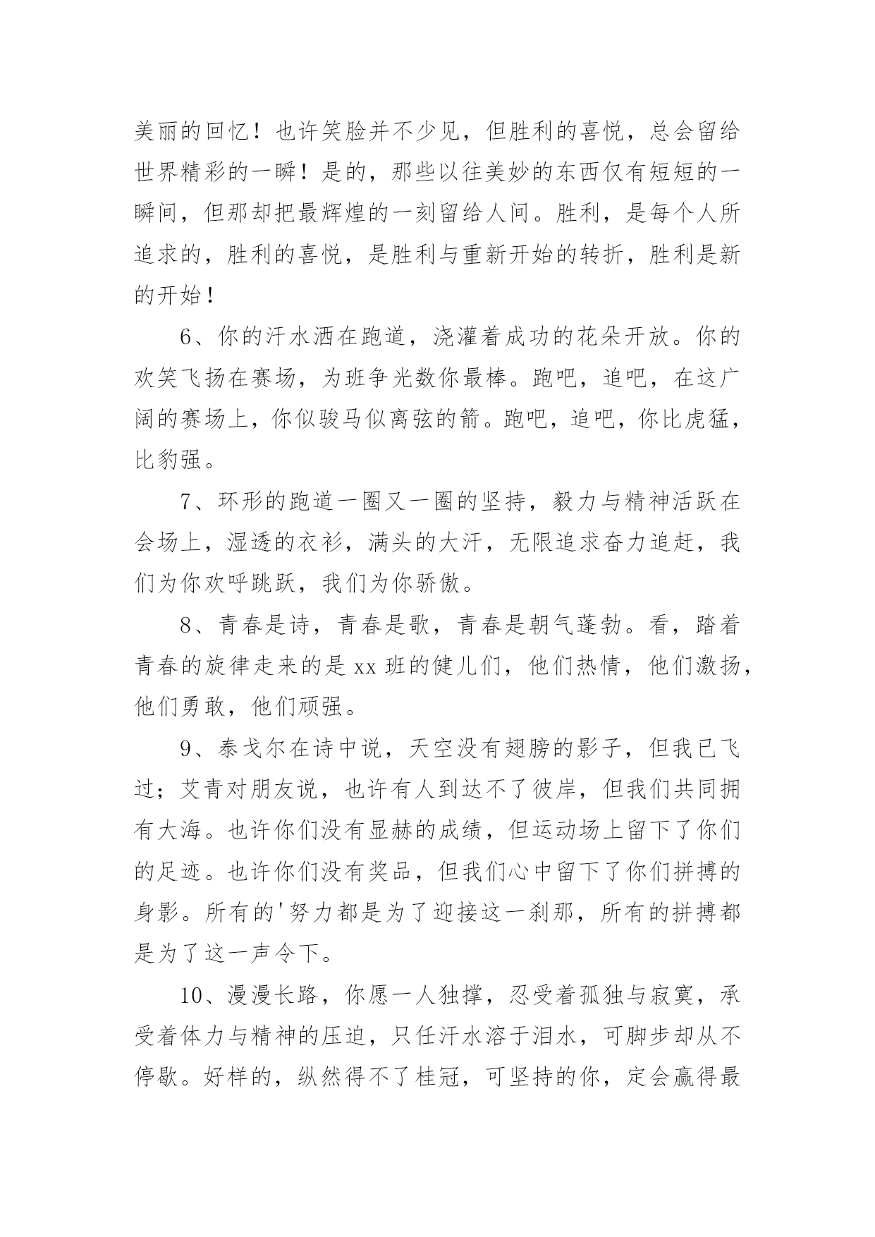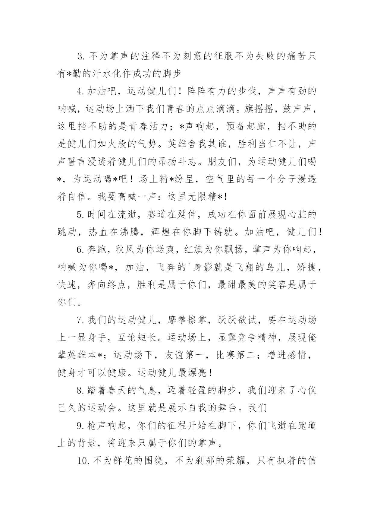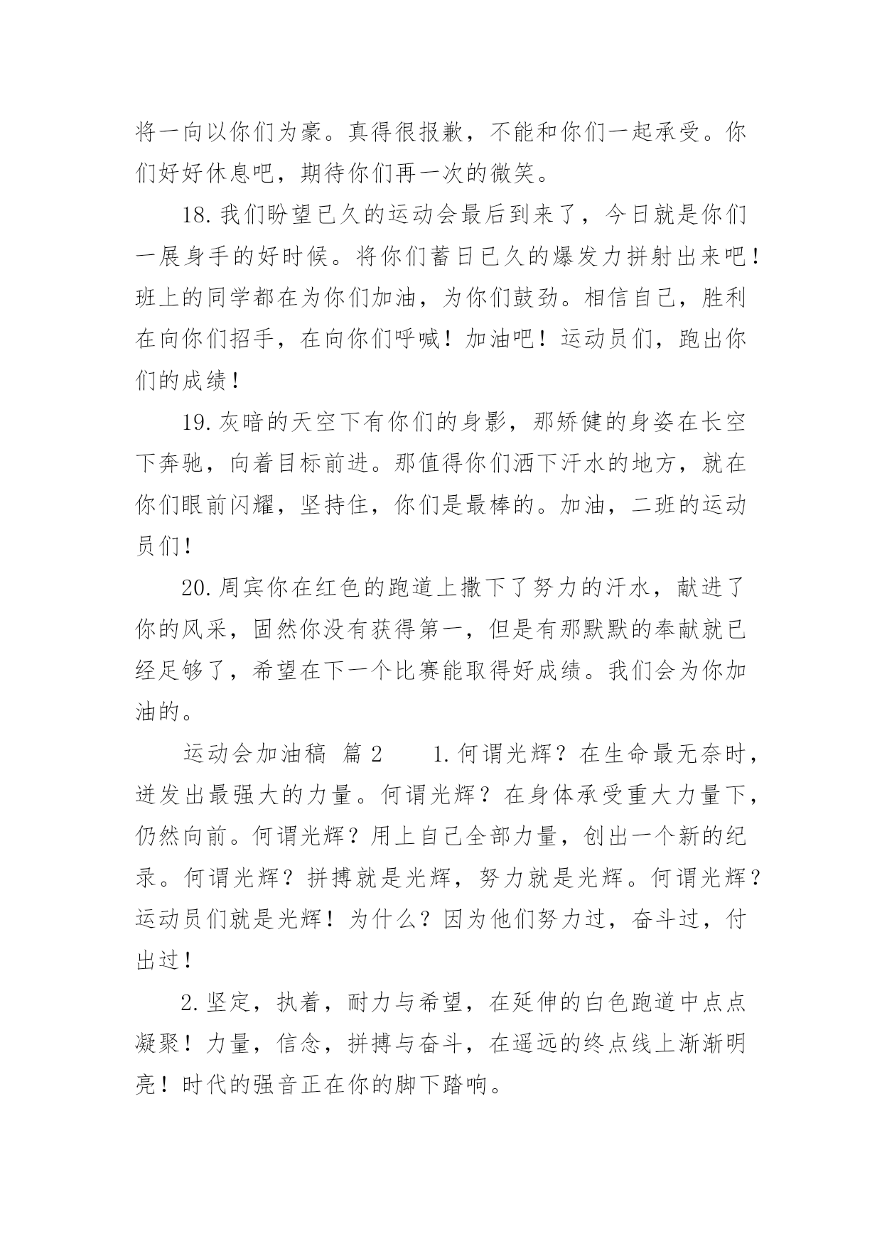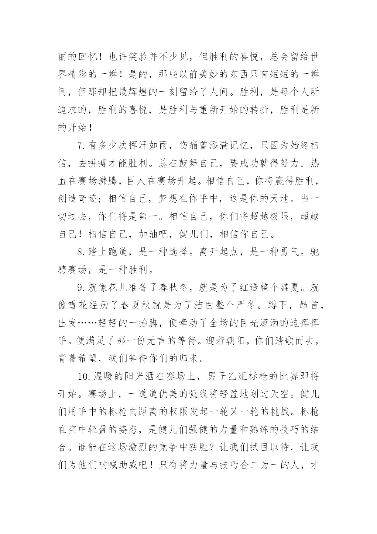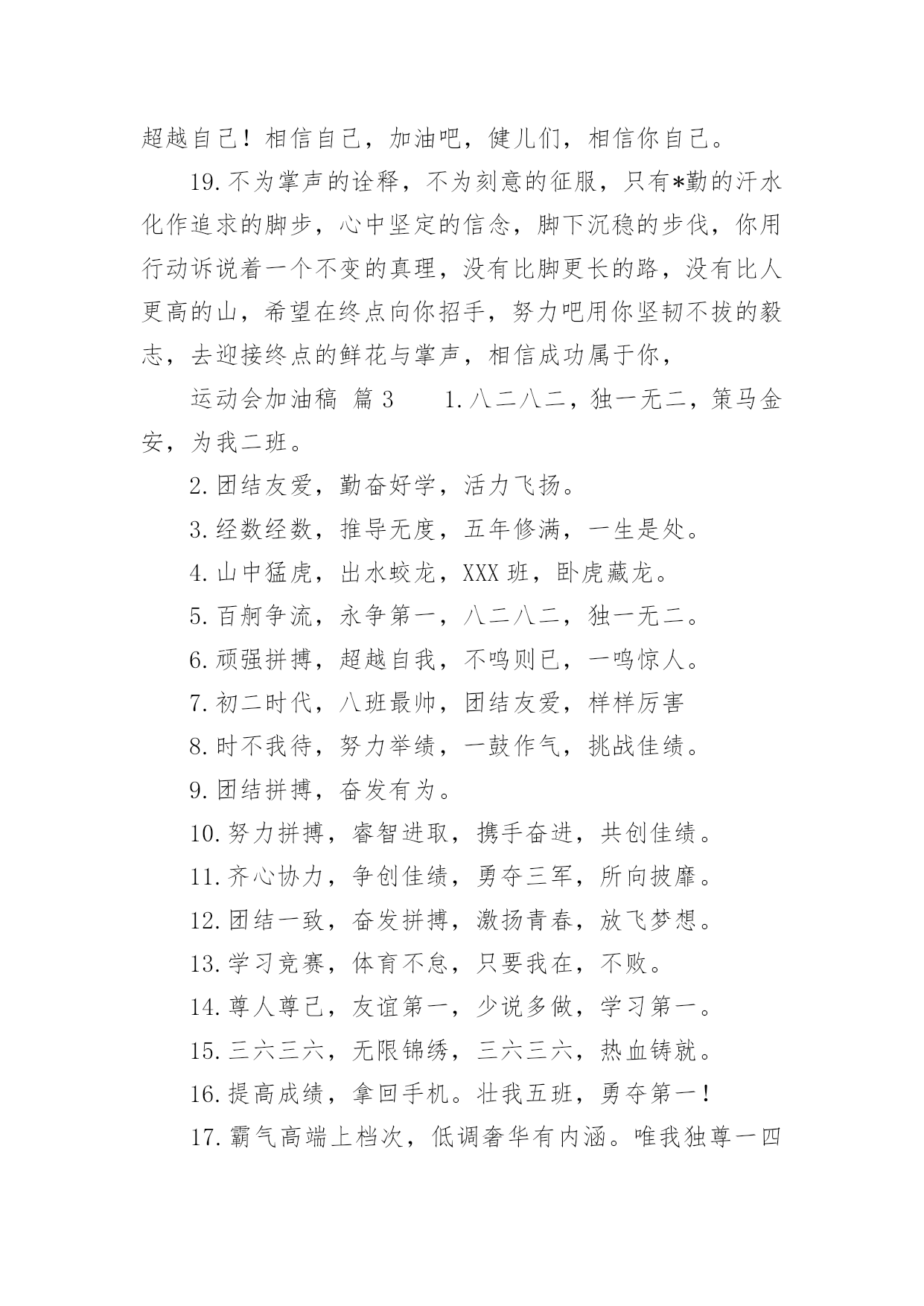 运动会加油稿运动会加油稿(精华12篇)在日新月异的现代社会中,我们都跟加油稿有着直接或间接的联系,加油稿是鼓励激励对方的文稿。写起加油稿来就毫无头绪?下面是小编精心整理的运动会加油稿,仅供参考,希望能够帮助到大家。运动会加油稿篇11.看完了九年级女子米比赛,她们苍白的面孔,发干的嘴唇,让人看了不免有些心痛。琼瑶曾生婷婷你们飒爽的英姿在跑道上展现,全班同学都会为你们加油的。为你们骄傲。2.我们班可爱的“梁老大”“吴宝鸡”,我们会在身后默默支持你的!会永远记住你们标志性的动作的,无二,那将会是运动场上的亮点!3.九年三班XX同学,成绩优越的你是我们班的骄傲,我相信,站在跑道的你必须能创造奇迹,有希望,有梦想,就会有自己的成功,胜不骄,败不馁,我相信你必须会有所收获的。4.不为鲜花的围绕,不为刹那的荣耀,只有执着的信念,化作不停的奔跑,心中燃烧着梦想,脚下不停的步伐。5.你们挥舞着充满力量的.双臂看着实心球化成美丽的弧线我着实在心里佩服你们你们抛出了自己的水平。6.也许流星并不少见,但它燃烧的刹那,留给人间最美丽的回忆!也许笑脸并不少见,但胜利的喜悦,总会留给世界精彩的一瞬!是的,那些以前美妙的东西只有短短的一瞬间,但那却把最辉煌的一刻留给了人间。胜利,是每个人所追求的,胜利的喜悦,是胜利与重新开始的转折,胜利是新的开始!7.有多少次挥汗如雨,伤痛曾添满记忆,只因为始终相信,去拼搏才能胜利。总在鼓舞自己,要成功就得努力。热血在赛场沸腾,巨人在赛场升起。相信自己,你将赢得胜利,创造奇迹;相信自己,梦想在你手中,这是你的天地。当一切过去,你们将是第一。相信自己,你们将超越极限,超越自己!相信自己,加油吧,健儿们,相信你自己。8.踏上跑道,是一种选择。离开起点,是一种勇气。驰骋赛场,是一种胜利。9.就像花儿准备了春秋冬,就是为了红透整个盛夏。就像雪花经历了春夏秋就是为了洁白整个严冬。蹲下,昂首,出发……轻轻的一抬脚,便牵动了全场的目光潇洒的迫挥挥手。便满足了那一份无言的等待。迎着朝阳,你们踏歌而去,背着希望,我们等待你们的归来。10.温暖的阳光洒在赛场上,男子乙组标枪的比赛即将开始。赛场上,一道道优美的弧线将轻盈地划过天空。健儿们用手中的标枪向距离的权限发起一轮又一轮的挑战。标枪在空中轻盈的姿态,是健儿们强健的力量和熟练的技巧的结合。谁能在这场激烈的竞争中获胜?让我们拭目以待,让我们为他们呐喊助威吧!只有将力量与技巧合二为一的人,才能获得胜利的桂冠!11.泰戈尔在诗中说,天空没有翅膀的影子,但我已飞过;艾青对朋友说,也许有人到达不了彼岸,但我们共同拥有大海。也许你们没有显赫的成绩,但运动场上留下了你们的足迹。也许你们没有奖品,但我们心中留下了你们拼搏的身影。所有的努力都是为了迎接这一刹那,所有的拼搏都是为了这一声令下。12.不为掌声的注释不为刻意的征服不为失败的痛苦只有辛勤的汗水化作成功的脚步。13.广阔的绿茵场,是为你们搭建的舞台。张扬吧,年轻的心,我们将为你永远喝彩!14.年轻的我们不言失败,没有风浪,就不能显示帆的本色;没有曲折,就无法品味人生的乐趣。固然我们没得第一,但至少我们付出过努力过拼搏过。人生又能有几次搏呢?15.当一声声的枪声从耳边飘过,八年级男子米拉开了序幕。你们,飞快地奔跑着,奔跑着。早晨,你们放飞气球,系托希望,来年,你们放飞希望,收获成功。梦想由希望构成,希望,由信念启航!愿你们在跑道上挥洒青春,让希望翱翔!加油,八班的米选手们!我们个同学都在看着你呢!16.友谊第一,比赛第二”是我们的信念,“放飞理想,努力拼搏”是我们的口号,“赛出风格,赛出水平”更是我们的追求。加油,晓静,相信自己,你能行!用你最美,最独特的微笑去面比较赛吧!加油!17.你们不必懊悔,不必悲哀。只要你们微笑,我们班将一向以你们为豪。真得很报歉,不能和你们一起承受。你们好好休息吧,期待你们再一次的微笑。18.我们盼望已久的运动会最后到来了,今日就是你们一展身手的好时候。将你们蓄日已久的爆发力拼射出来吧!班上的同学都在为你们加油,为你们鼓劲。相信自己,胜利在向你们招手,在向你们呼喊!加油吧!运动员们,跑出你们的成绩!19.灰暗的天空下有你们的身影,那矫健的身姿在长空下奔驰,向着目标前进。那值得你们洒下汗水的地方,就在你们眼前闪耀,坚持住,你们是最棒的。加油,二班的运动员们!20.周宾你在红色的跑道上撒下了努力的汗水,献进了你的风采,固然你没有获得第一,但是有那默默的奉献就已经足够了,希望在下一个比赛能取得好成绩。我们会为你加油的。运动会加油稿篇21.何谓光辉?在生命最无奈时,迸发出最强大的力量。何谓光辉?在身体承受重大力量下,仍然向前。何谓光辉?用上自己全部力量,创出一个新的纪录。何谓光辉?拼搏就是光辉,努力就是光辉。何谓光辉?运动员们就是光