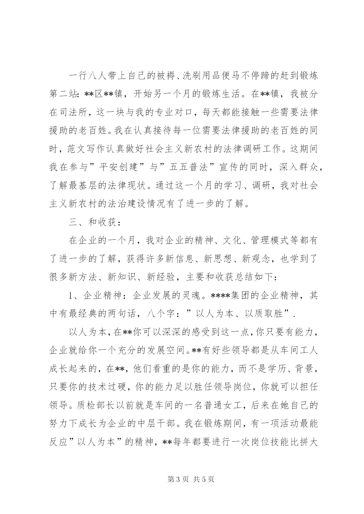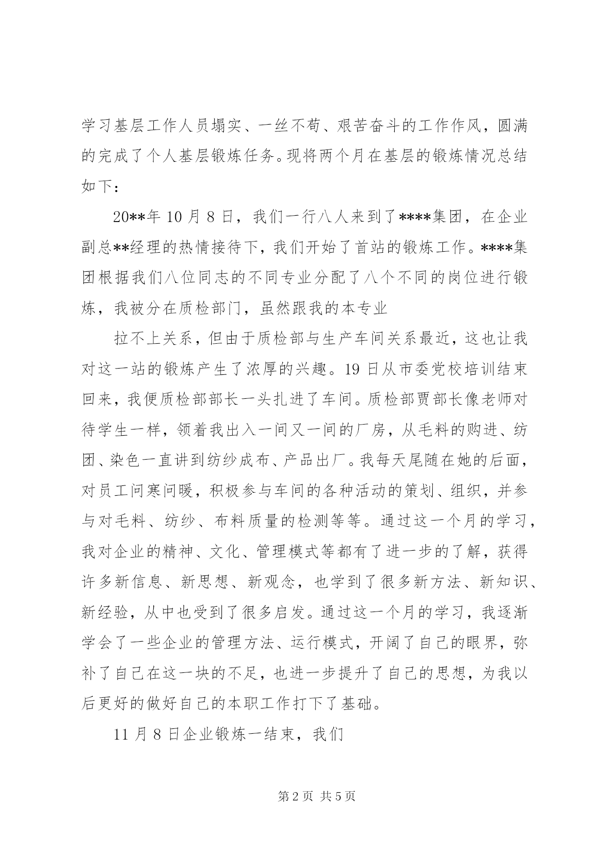 第PAGE\*Arabic\*MERGEFORMAT5页共NUMPAGES\*MERGEFORMAT5页公务员个人基层锻炼工作总结《公务员个人基层锻炼工作总结》是一篇好的范文,觉得有用就收藏了,看完如果觉得有帮助请记得收藏。公务员个人基层锻炼个人基层锻炼一、个人信息:**,男,19**年6月29日出生,籍贯:**,政治面貌:团员,第一学历:本科,专业:法学专业,20**年6月毕业于**警官学院。1、学习简历:20**年9月至20**年6月**警官学院法学专业2、工作简历20**年8月至今**市**区人民检察院二、基层锻炼情况:根据组织部、人事局的安排,20**年10月8日到12月8日,我分别在****集团和**区**镇进行为期两个月的基层锻炼。两个月来,自己自觉服从安排,在正确处理好本职工作与基层锻炼矛盾关系的同时,积极深入企业一线和乡镇村庄,主动的向企业员工以及乡镇基层工作人员学习,不断总结经验,认真学习企业精神、文化、管理模式,学习基层工作程序以及相关要求,学习基层工作人员塌实、一丝不苟、艰苦奋斗的工作作风,圆满的完成了个人基层锻炼任务。现将两个月在基层的锻炼情况总结如下:20**年10月8日,我们一行八人来到了****集团,在企业副总**经理的热情接待下,我们开始了首站的锻炼工作。****集团根据我们八位同志的不同专业分配了八个不同的岗位进行锻炼,我被分在质检部门,虽然跟我的本专业拉不上关系,但由于质检部与生产车间关系最近,这也让我对这一站的锻炼产生了浓厚的兴趣。19日从市委党校培训结束回来,我便质检部部长一头扎进了车间。质检部贾部长像老师对待学生一样,领着我出入一间又一间的厂房,从毛料的购进、纺团、染色一直讲到纺纱成布、产品出厂。我每天尾随在她的后面,对员工问寒问暖,积极参与车间的各种活动的策划、组织,并参与对毛料、纺纱、布料质量的检测等等。通过这一个月的学习,我对企业的精神、文化、管理模式等都有了进一步的了解,获得许多新信息、新思想、新观念,也学到了很多新方法、新知识、新经验,从中也受到了很多启发。通过这一个月的学习,我逐渐学会了一些企业的管理方法、运行模式,开阔了自己的眼界,弥补了自己在这一块的不足,也进一步提升了自己的思想,为我以后更好的做好自己的本职工作打下了基础。11月8日企业锻炼一结束,我们一行八人带上自己的被褥、洗刷用品便马不停蹄的赶到锻炼第二站:**区**镇,开始另一个月的锻炼生活。在**镇,我被分在司法所,这一块与我的专业对口,每天都能接触一些需要法律援助的老百姓。我在认真接待每一位需要法律援助的老百姓的同时,范文写作认真做好社会主义新农村的法律调研工作。这期间我在参与”平安创建”与”五五普法”宣传的同时,深入群众,了解最基层的法律现状。通过这一个月的学习、调研,我对社会主义新农村的法治建设情况有了进一步的了解。三、和收获:在企业的一个月,我对企业的精神、文化、管理模式等都有了进一步的了解,获得许多新信息、新思想、新观念,也学到了很多新方法、新知识、新经验,主要和收获总结如下:1、企业精神:企业发展的灵魂。****集团的企业精神,其中有最经典的两句话,八个字:”以人为本、以质取胜”.以人为本,在**你可以深深的感受到这一点,你只要有能力,企业就给你一个充分的发展空间。**有好些领导都是从车间工人成长起来的,在**,他们看重的是你的能力,而不是学历、背景,只要你的技术过硬,你的能力足以胜任领导岗位,你就可以担任领导。质检部长以前就是车间的一名普通女工,后来在她自己的努力下成长为企业的中层干部。我在锻炼期间,有一项活动最能反应”以人为本”的精神,**每年都要进行一次岗位技能比拼大赛,我锻炼期间正好赶上今年的这次活动,范文top100活动程度启动后,无论是车间一线工人还是企业中上层领导都可以参加,并且一视同仁,只要你的技术足够的好,在比赛中拿到前多少名,你就有机会参加”港、澳、台”旅游。这样的比赛是没有领导和员工之分的。这样的旅游机会,企业领导没有以权之便去以公谋私,而是与企业车间一线员工平等竞争,这样就从侧面告诉了我们一个精神:”以人为本”.在这样一种精神支持下,企业员工在机器轰鸣,甚至气温八九十度的环境里仍然能够一丝不苟、努力的工作。从这里我终于明白,十几年前那个面临倒闭的毛纺厂是如何一步一步成长为今天拥有固定资产三个亿的知名集团的,他们在困难面前,不是怨天尤人,畏缩不前,而是在以人为本的激励下,充分发挥主观能动性,始终谋发展、求发展、争发展的激情和热情。他们在成绩面前不自满,在困难面前不退缩,所取得的成绩不是空谈出来的,也不是口号喊出来的,而是干出来的和拼出来的。在企业里这种以人为本的精神,使每位工作人员,上至领导,下至车间一线工人,对企业都有一种家的感觉,对企业都有一种主人