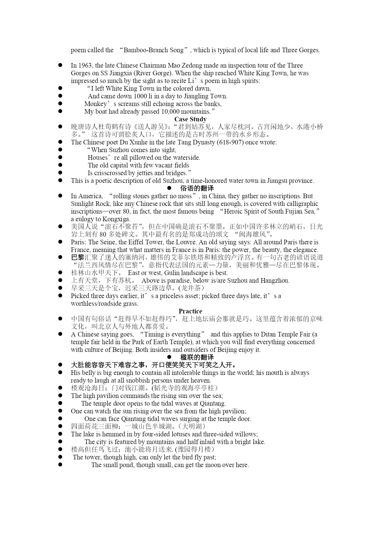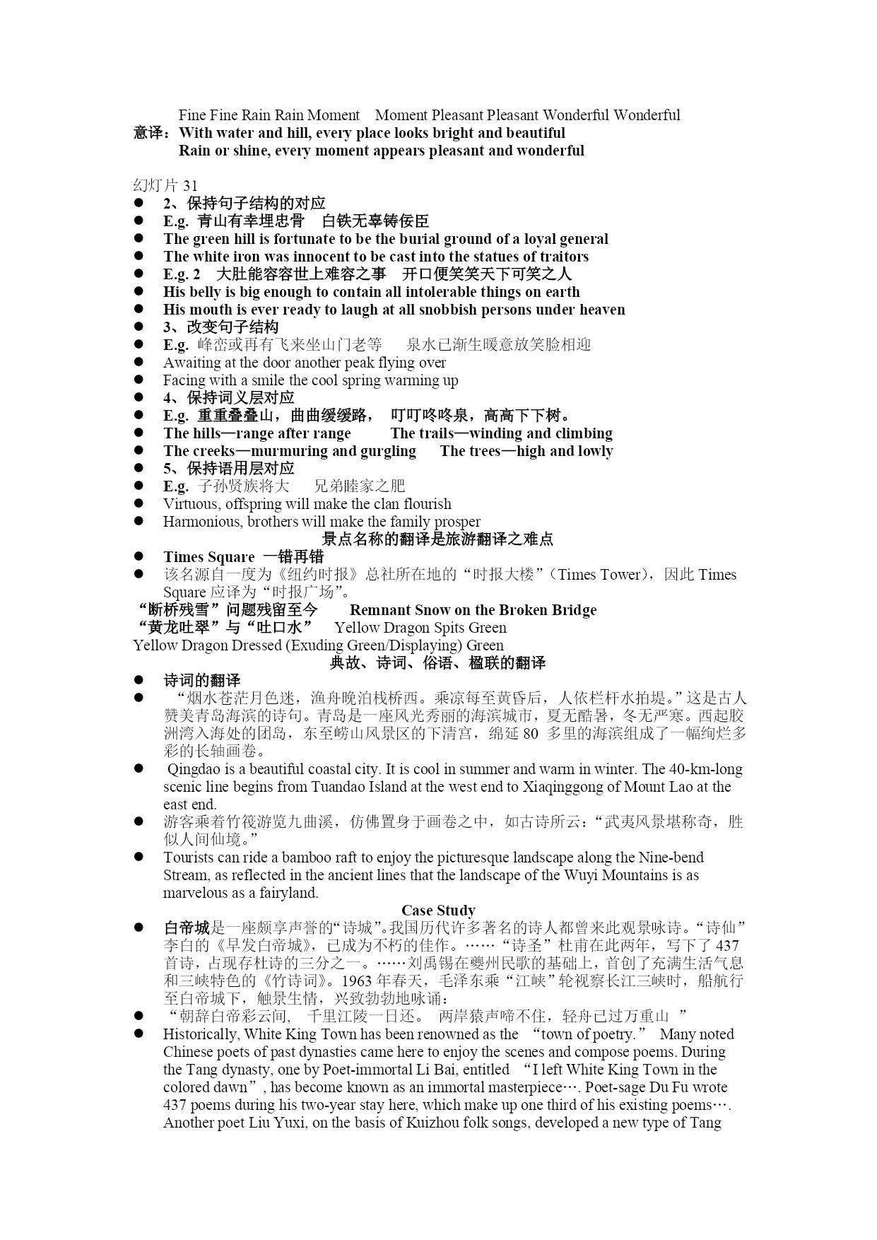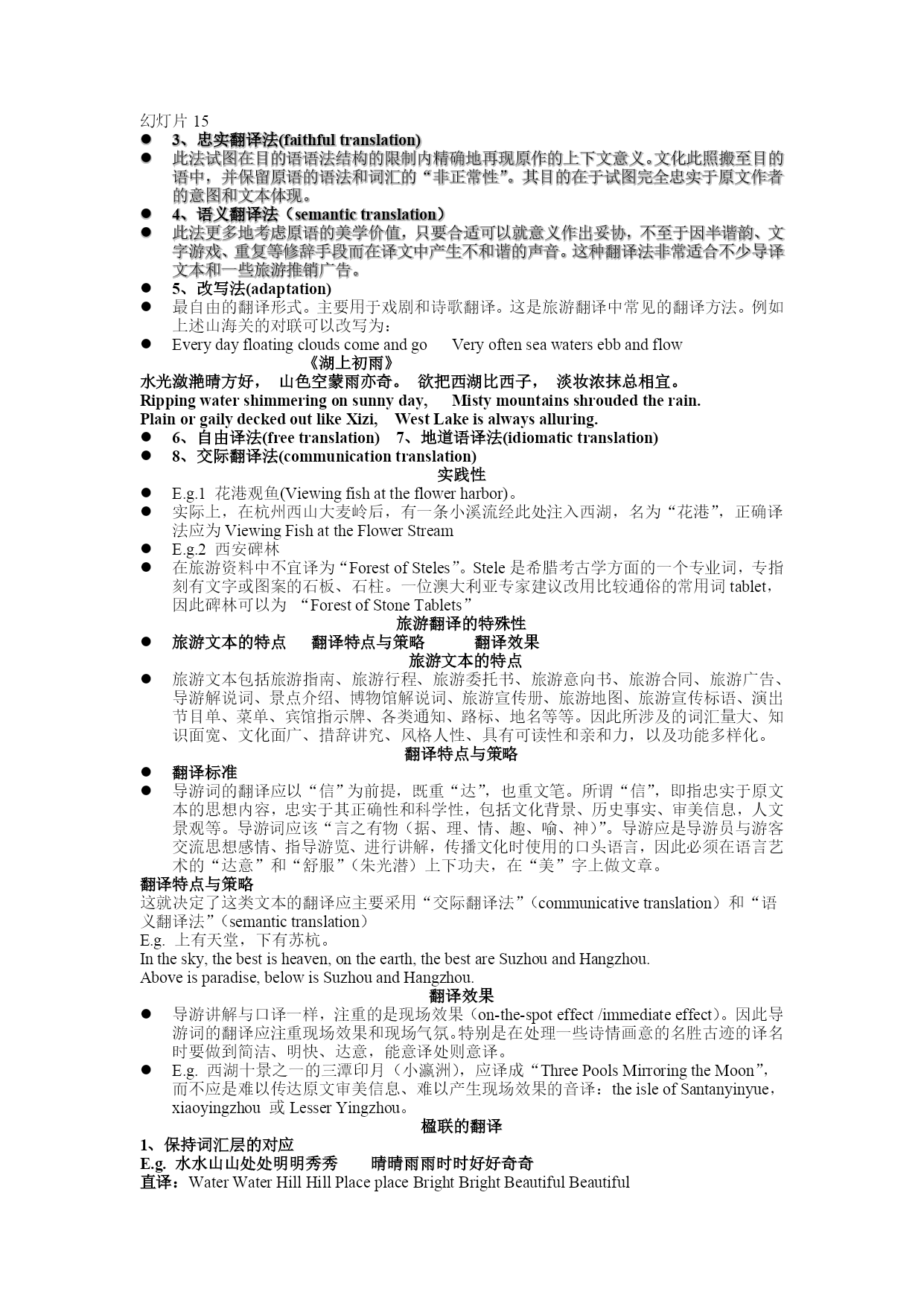 PoemsandCouplets趣味性“江山如此多娇,引无数英雄竞折腰”。中国的山水文化丰富,历史文化厚重,风土人情多姿多彩,真可谓“风景这边独好!”旅游景点有很多喜闻乐见的诗词、楹联,而遗憾的是,太多的趣味—山水之趣、人文之趣、乡音之趣—丢失在翻译之中(lostintranslation)Thepleasureoftakingpains—RobertFrost如何将岳飞的《满江红》译得朗朗上口,又保持气势?如何让欧美游客更多欣赏到西湖天下景的“水水山山处处明明秀秀,晴晴雨雨时时好好奇奇”?如何翻译小吃“西施舌”中的西施?如何译出佛教中雅俗共赏的对子“大肚能容容世上之难事,开口便笑笑天下可笑之人”?旅游对翻译的“辐射”翻译永远是跨文化的,永远是讲求效果的。旅游翻译不仅要讲究文字本身漂亮,如果同时注重营销组合(marketmix—product,price,place,promotion),则更容易达到预期的效果。七彩云南——ColorfulYunnan/7-ColoredYunnan/Multi-coloredYunnan诗画江南,山水浙江——PoeticJiangnan,PicturesqueZhejiang福天福地福建游——AHappyTourtoaHappyCity旅游翻译的原则以译出语或译出语文化为取向(sourcelanguageorientation/sourcelanguagecultureorientation)这种标准在旅游翻译中很常见,目的是尽可能保留原有的“原汁原味”和鲜明特色。如:NiagaraFalls,YellowStonePark,MerlionPark;GreatBarrierReef,MinzuHotel,LingyinTemple;JiuzhaigouValley。以译入语或译入语文化为取向(targetlanguageorientation/targetlanguagecultureorientation)目的是让旅游者一看就懂,产生原文本身所具有的吸引力。如:望湖饭店(lakeviewhotel),颐和园(SummerPalace)以作者为取向(authororientation)主要用于翻译名人名家的诗歌、楹联、散文、游记等,目的是“保存原作的风姿”和作者的“权威性”。E.g.青山有幸埋忠骨白铁无辜铸佞臣ThegreenhillisfortunatetobetheburialgroundofaloyalgeneralThewhiteironwasinnocenttobecastintothestatuesoftraitors以旅游者为取向(touristorientation)这种标准在旅游翻译诸标准中应成为首选或主要标准,即既可以“归化”,也可“异化”。E.g.这种冬青树,你们称为“圣诞树”,我们俗称“鸟不宿”。Thishollyiswhatyoucalla“Christmastree”,anditiswhatlocallyknownas“unperchable”.以美学为取向(estheticorientation)这种标准主要是在观光、访问、考察时或在宣传、推广中国的山水文化时用来翻译诗词、楹联、碑文、名胜古迹、风味小吃等,使用一切翻译策略,目的是尽可能实现原文的美学价值。E.g.仿膳—ImperialFood杭州煨鸡--Beggar’sChicken狗不理--DogsDon’tLeave西施舌—TheBeauty’sTongue纽马克的翻译理论1、逐字翻译法(wordforwordtranslation)原文语序不变,原文的词逐个翻译,选择最常用的词意,不必考虑上下文。文化词也照直译。就旅游翻译而言,这种译法适用面不广,但可灵活应用于翻译专有名词。如拙政园(HumbleAdministrator’sGarden)的小飞虹桥,可译为:SmallFlyingRainbow2、直译法(Literaltranslation)将原语语法结构转换为目的与中与之最接近的结构,原语中的词仍然注意译成目的语。此法可用于某些景点楹联的翻译。例如:海水朝朝朝朝朝朝朝落浮云长长长长长长长消Seawatertide,daytodaytide,everydaytideandeverydayebbFloatingcloudsappear,oftenappear,oftenappearandoftengo(金隄、奈达)幻灯片153、忠实翻译法(faithfultranslation)此法试图在目的语语法结构的限制内精确地再现原作的上下文意义。文化此照搬至目的语中,并保留原语的语法和词汇的“非正常性”。其目的在于试图完全忠实于原文