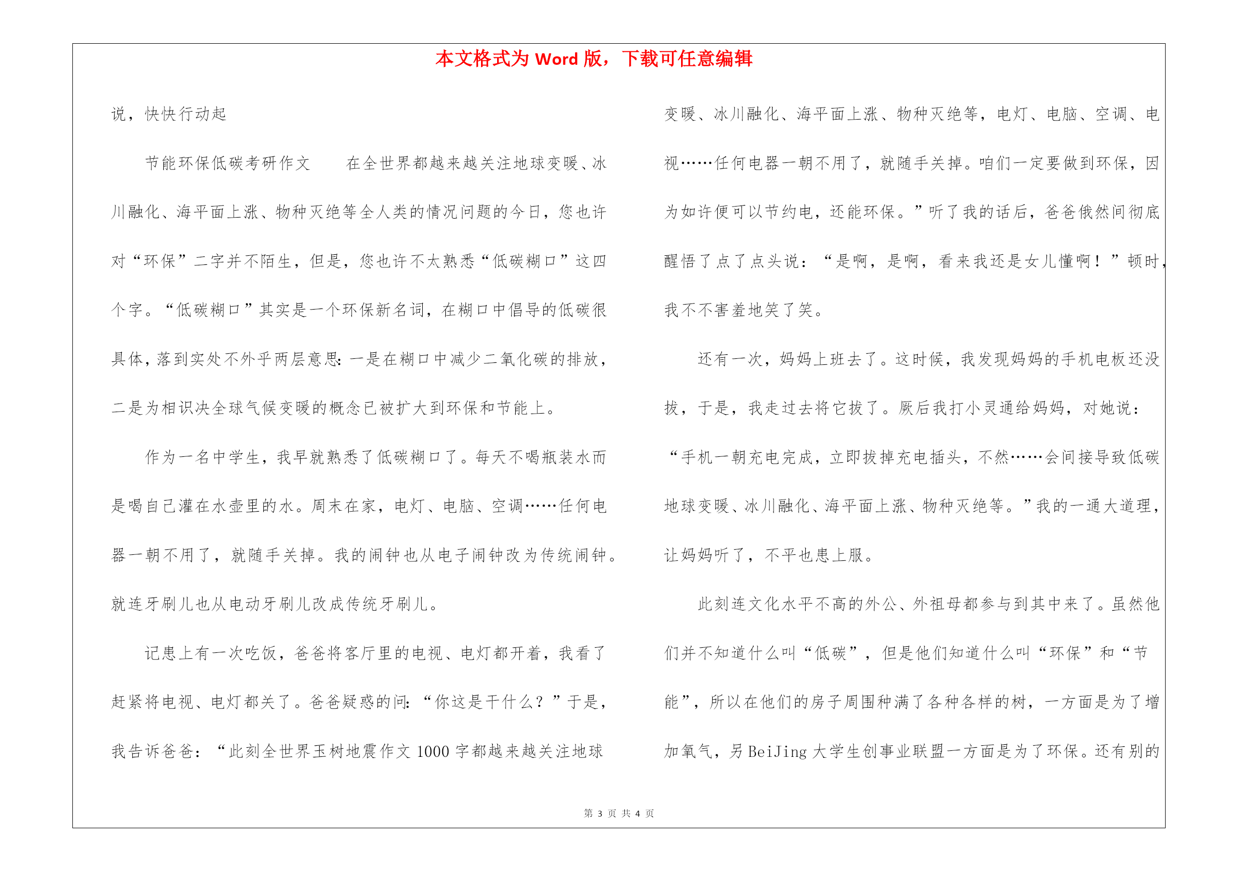本文格式为Word版,下载可任意编辑第PAGE\*MERGEFORMAT4页共NUMPAGES\*MERGEFORMAT4页节能环保低碳考研作文节能环保低碳考研作文节能环保低碳考研作文低碳——这两个字在人们生活中是不可缺少的。低碳生活也是我们大家都需要做到的。当然,低碳也可以体现在我们身边的小事中:例如:多用一次环保袋,少用一次性塑料袋,减少污染。向这样的小事,生活中还有许许多多,只要我们善于观察生活,就可以发现他们。当然,光嘴上说是不行的,我们还得用自己的行动表现出来。所以在这我想给大家提一些低碳环保的小建议,让大伙更好地做一个低碳小达人:一.吃饭时,少用一次性筷子、勺子和泡沫打包盒,多用多次性用品,减少白色污染,让地球多一份天然。二.用纸写字时,纸可以两面写,这样,就可以减少一半树木的砍伐,多一点清新的空气,少一点二氧化碳。三.出行时,尽量选择公共汽车或自行车,尽量少开私家车,减少尾气的排量,减少对臭氧层的污染。四.洗手时,尽量做到一水多用,洗完手的水还可以冲马桶、洗菜等事情,这样就可以减少水的用量等。除了这些建议,我们身边还有一些低碳故事呢,现在我就来和大家分享一下吧。记得2022年的时候,浙江少儿电视台到我们学校搞活动,但那是我们不知道他们来干什么,也不知道怎样环保——有时一张纸,只是有一点皱了,就当废纸扔了,从来都不知道环保,就连“低碳”这个词都没有听说过。但是,等到活动开始时,我们知道了怎样环保,怎样低碳。原来,他们是过来宣传环保的,还特意给我们带来了一块块小手帕,上面有着其他小朋友画的环保创意画,让我们多用手帕,少用纸巾,到现在,我擦手都还在用着那块小手帕呢!低碳——这个词已经是老百姓们常说的一个词了,因为,现在的地球环境已经遭到了严重的破坏,许多动物也频临绝种,臭氧层也受到了严重的破坏。所以,我们只有现在开始改变自己的习惯,做到不浪费,并且召集更多的人加入到环保事业中,做一个当之无愧的“低碳小达人”!节能环保低碳考研作文低碳生活代表着更健康、更自然、更安全的生活,同时也是一种低成本、低代价的生活方式。低碳是一项符合时代潮流的生活方式。所以,我的低碳我做主。从1978年中国改革开放以来,人们的生活越过越好。无论是餐桌上还是衣服上,都发生了翻天覆地的变化。但是,如今我们的生活有了巨大的改善,而随之而来的却是环境遭受污染。如今出行不再是骑自行车,而是乘公交车或开私家车。大街上不再是人流如潮,而是车流滚滚。随着拥有私家车的人逐渐增多,气也逐渐受到污染,汽车排放的尾气使空气中的二氧化碳逐渐增多,污染了环境。我向爸爸妈妈谈了我的低碳生活想法,他们都十分的支持。不久我全家人都参与到低碳生活中。妈妈洗衣时先将清水滴几滴洗涤剂然后将衣服浸泡一会再洗,肥皂或洗衣粉用量小,漂洗用水少,衣服洗的还干净;我还帮妈妈编写各种大口的戴盖的玻璃瓶子,将五谷杂粮装入瓶中,粮食不但不生虫子,还废物利用。我还做我们家低碳生活的监督者,我爸爸非常怕热,天一热就打开空调,我就提醒他说:;爸爸,我们住在山里,打开窗户,既进来自然风,又能呼吸到天然氧气;话没说完,爸爸早已将空调关闭;我爸爸出行自驾车习惯了,出去买菜也爱开车,我便和他约法三章,;每天要多走路少开(乘)车,买菜更不能开车。;爸爸笑着对我说;;对!低碳生活应该从小做起,从每一个人做起。低碳生活只是一种态度,而不是能力,只要我们重视它,每一个人都能做到。从小做起,从我做起,从现在做起。节约一滴水、一度电、少开一天车、少用一个塑料袋,为我们的家园天更蓝、水更清、山更绿、空气更清新做贡献。勿以善小而不为,勿以恶小而为之。我想对地球母亲的'儿女们说,快快行动起节能环保低碳考研作文在全世界都越来越关注地球变暖、冰川融化、海平面上涨、物种灭绝等全人类的情况问题的今日,您也许对“环保”二字并不陌生,但是,您也许不太熟悉“低碳糊口”这四个字。“低碳糊口”其实是一个环保新名词,在糊口中倡导的低碳很具体,落到实处不外乎两层意思:一是在糊口中减少二氧化碳的排放,二是为相识决全球气候变暖的概念已被扩大到环保和节能上。作为一名中学生,我早就熟悉了低碳糊口了。每天不喝瓶装水而是喝自己灌在水壶里的水。周末在家,电灯、电脑、空调……任何电器一朝不用了,就随手关掉。我的闹钟也从电子闹钟改为传统闹钟。就连牙刷儿也从电动牙刷儿改成传统牙刷儿。记患上有一次吃饭,爸爸将客厅里的电视、电灯都开着,我看了赶紧将电视、电灯都关了。爸爸疑惑的问:“你这是干什么?”于是,我告诉爸爸:“此刻全世界玉树地震作文1000字都越来越关注地球变暖、冰川融化、海平面上涨、物种灭绝等,电灯、电脑、空调、电视……任何电器一朝不用了,就随手关掉。咱们一定要做到环保,因为如许便可以节约电,还能环保。”听了我的话后,爸爸俄然间彻底醒悟了点了点头说: