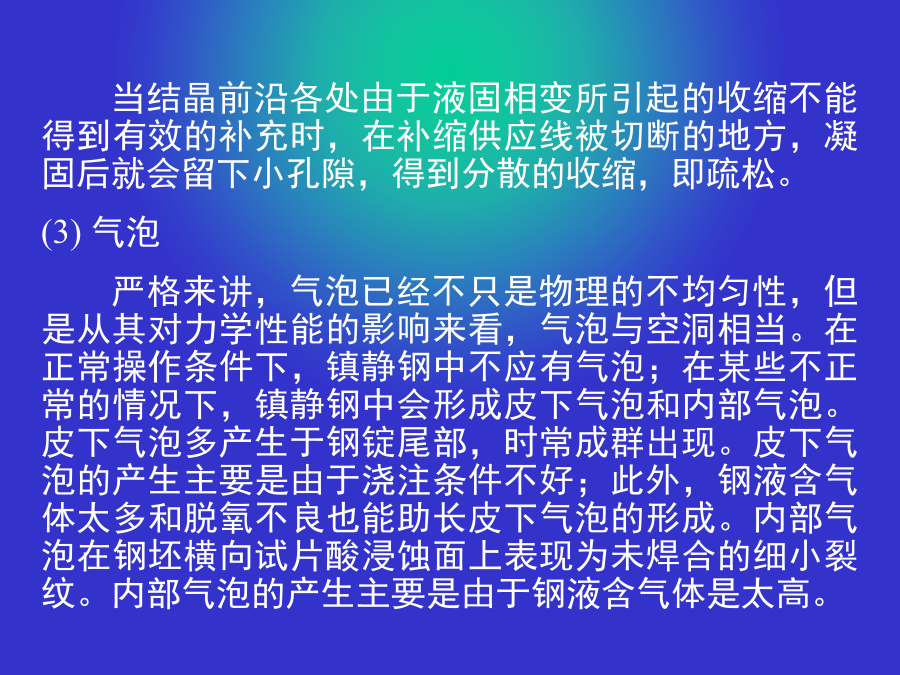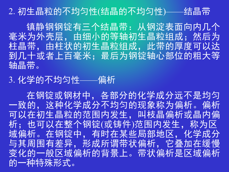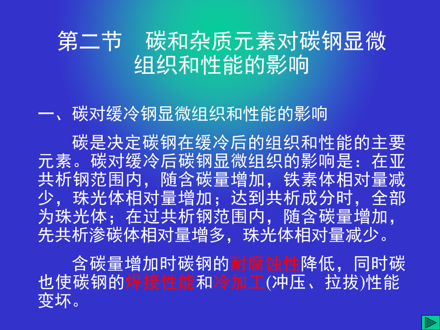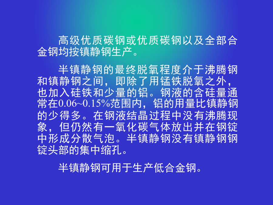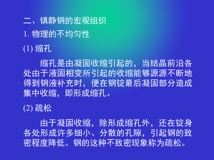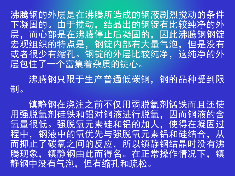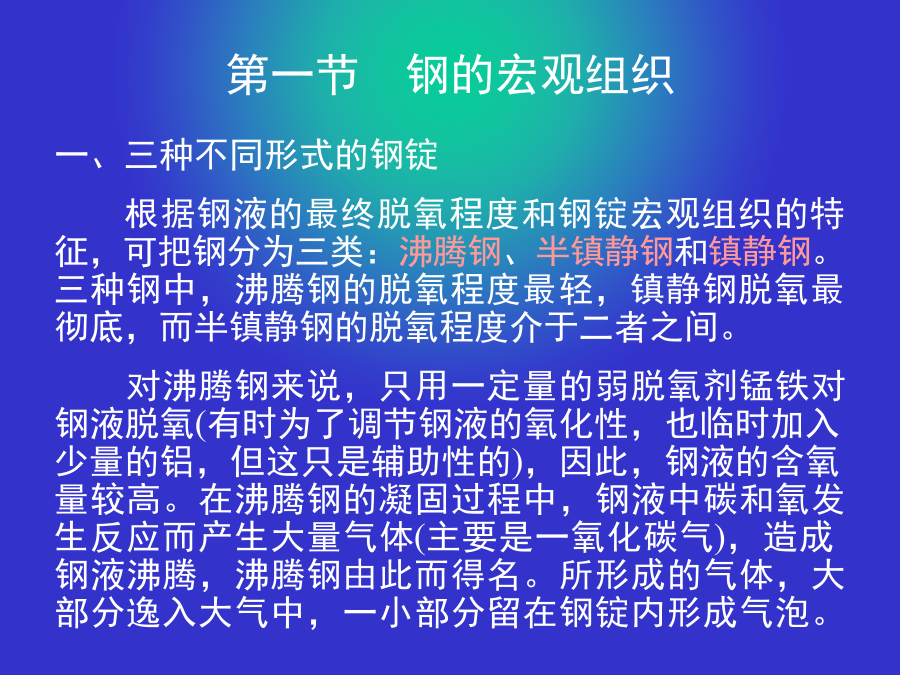 第八章碳钢第一节钢的宏观组织沸腾钢的外层是在沸腾所造成的钢液剧烈搅动的条件下凝固的。由于搅动,结晶出的钢锭有比较纯净的外层,而心部是在沸腾停止后凝固的,因此沸腾钢钢锭宏观组织的特点是,钢锭内部有大量气泡,但是没有或者很少有缩孔。钢锭的外层比较纯净,这纯净的外层包住了一个富集着杂质的锭心。沸腾钢只限于生产普通低碳钢,钢的品种受到限制。镇静钢在浇注之前不仅用弱脱氧剂锰铁而且还使用强脱氧剂硅铁和铝对钢液进行脱氧,因而钢液的含氧量很低。强脱氧元素硅和铝的加人,使得在凝固过程中,钢液中的氧优先与强脱氧元素铝和硅结合,从而抑止了碳氧之间的反应,所以镇静钢结晶时没有沸腾现象,镇静钢由此而得名。在正常操作情况下,镇静钢中没有气泡,但有缩孔和疏松。高级优质碳钢或优质碳钢以及全部合金钢均按镇静钢生产。半镇静钢的最终脱氧程度介于沸腾钢和镇静钢之间,即除了用锰铁脱氧之外,也加入硅铁和少量的铝。钢液的含硅量通常在0.06~0.15%范围内,铝的用量比镇静钢的少得多。在钢液结晶过程中没有沸腾现象,但仍然有一氧化碳气体放出并在钢锭中形成分散气泡。半镇静钢没有镇静钢钢锭头部的集中缩孔。半镇静钢可用于生产低合金钢。二、镇静钢的宏观组织1.物理的不均匀性(1)缩孔缩孔是由凝固收缩引起的,当结晶前沿各处由于液固相变所引起的收缩能够源源不断地得到钢液补充时,便在钢锭最后凝固部分造成集中收缩,即形成缩孔。(2)疏松由于凝固收缩,除形成缩孔外,还在锭身各处形成许多细小、分散的孔隙,引起钢的致密程度降低。钢的这种不致密现象称为疏松。当结晶前沿各处由于液固相变所引起的收缩不能得到有效的补充时,在补缩供应线被切断的地方,凝固后就会留下小孔隙,得到分散的收缩,即疏松。(3)气泡严格来讲,气泡已经不只是物理的不均匀性,但是从其对力学性能的影响来看,气泡与空洞相当。在正常操作条件下,镇静钢中不应有气泡;在某些不正常的情况下,镇静钢中会形成皮下气泡和内部气泡。皮下气泡多产生于钢锭尾部,时常成群出现。皮下气泡的产生主要是由于浇注条件不好;此外,钢液含气体太多和脱氧不良也能助长皮下气泡的形成。内部气泡在钢坯横向试片酸浸蚀面上表现为未焊合的细小裂纹。内部气泡的产生主要是由于钢液含气体是太高。(4)裂纹钢在铸造凝固后降温时将发生固态收缩。在某种外部条件下,当固态收缩受阻时,或者由于凝固层厚度不均匀或凝固层各部分收缩量不一致时,或者当凝固壳层受到内部钢液的静压力作用时,凡此种种使固态钢中产生内应力,当此内应力超过钢本身强度时,就发生破裂,导致产生裂纹。裂纹可以在钢锭凝固期间或者在凝固之后出现。2.初生晶粒的不均匀性(结晶的不均匀性)——结晶带镇静钢钢锭有三个结晶带:从钢淀表面向内几个毫米为外壳层,由细小的等轴初生晶粒组成;然后为柱晶带,由柱状的初生晶粒组成,此带的厚度可以达到几十或者上百毫米;最后为钢锭轴心部位的粗大等轴晶带。3.化学的不均匀性——偏析在钢锭或钢材中,各部分的化学成分远不是均匀一致的,这种化学成分不均匀的现象称为偏析。偏析可以在初生晶粒的范围内发生,叫枝晶偏析或晶内偏析;也可以在整个钢锭(或铸件)范围内发生,称为区域偏析。在钢锭中,有时在某些局部地区,化学成分与其周围有差异,形成所谓带状偏析,它叠加在缓慢变化的一般区域偏析的背景上。带状偏析是区域偏析的一种特殊形式。宏观组织分析(即低倍检验)包括的内容:低倍酸浸试验、断口分析和各种无损探伤(磁力探伤、超声波探伤、X线探伤及其它)。第二节碳和杂质元素对碳钢显微组织和性能的影响图8-1含碳量对碳钢热轧后力学性能的影响二、常存元素和其它元素对碳钢显微组织和性能的影响1.锰的影响锰在碳钢中的含量一般为0.25~0.80%,在具有较高含锰量的碳钢中,锰含量可以达到1.2%。在碳钢中,锰属于有益元素。锰是作为脱氧除硫的元素而加人钢中的。对于镇静钢来说,锰可以提高硅和铝的脱氧效果,也可以同硫结合形成硫化锰,从而在相当大程度上消除硫在钢中的有害影响。钢中的锰,除一部分形成夹杂物(硫化锰以及锰的氧化物)外,其余部分溶于铁素体和渗碳体中。锰对碳钢的力学性能有良好影响。它能提高钢经热轧后的硬度和强度。在锰含量不高时(<0.80%),锰可以稍微提高或者不降低碳钢的面缩率和冲击韧性。在碳钢的锰含量范围内,每增加0.1%Mn,大约使热轧钢的抗拉强度增加7.8~12.7MN/m2,屈服点提高约7.8~9.8MN/m2,而伸长率约减小0.4%。由于锰的有益作用,因此,在冶炼时应把含锰量控制在钢号成分规格的上限。2.硅的影响硅在碳钢中的含量≤0.50%。在沸腾钢中,含硅量很低(<0.05%),硅是作为脱氧元素加入镇静钢中。在镇静钢中硅的含量一般为0.12~0.37%。硅也是钢中有益元素。硅增大钢液的流动性。除形成非金属
