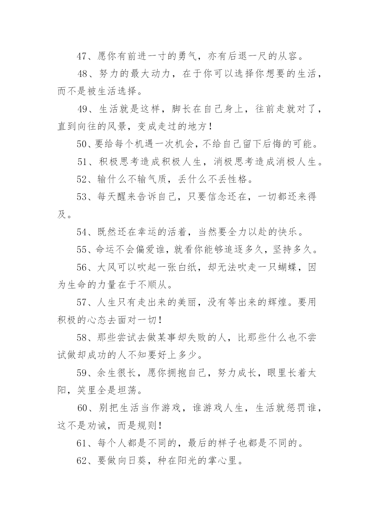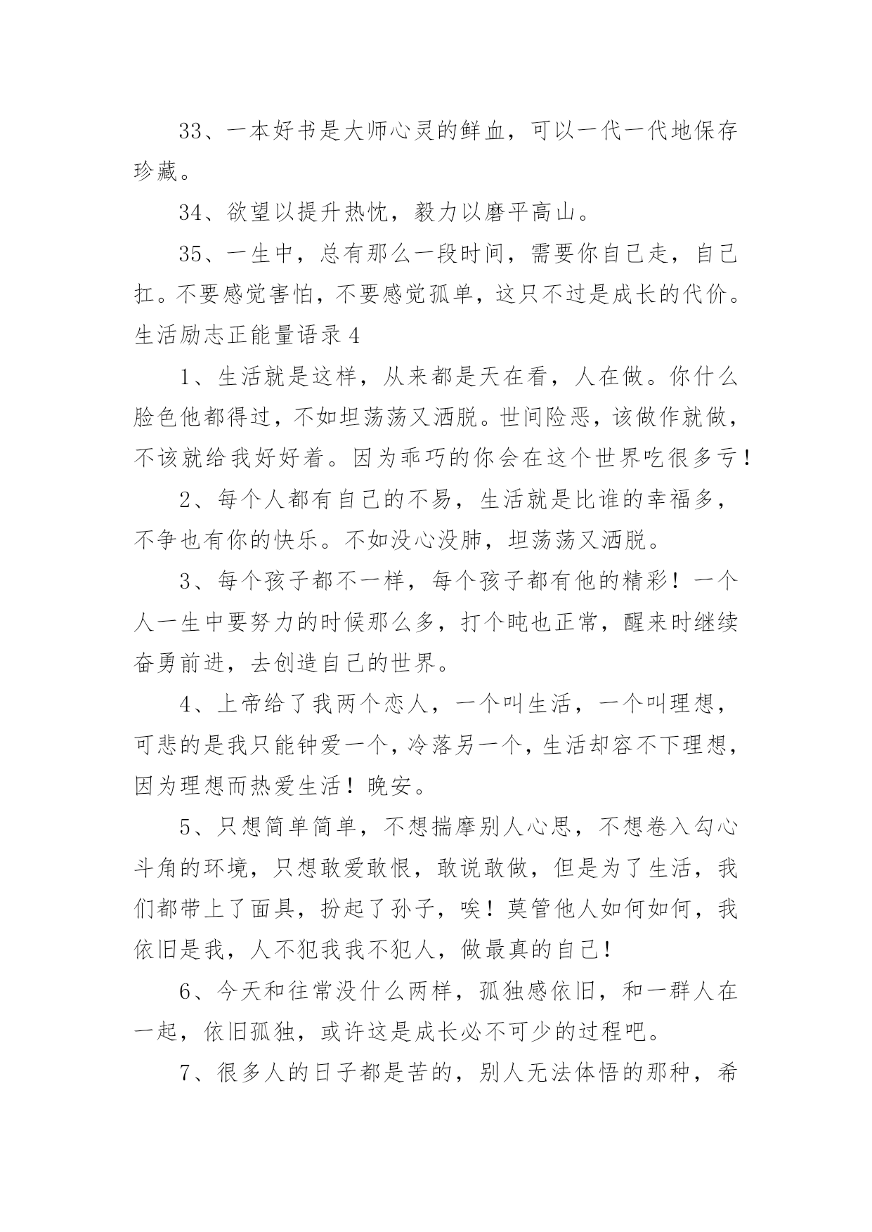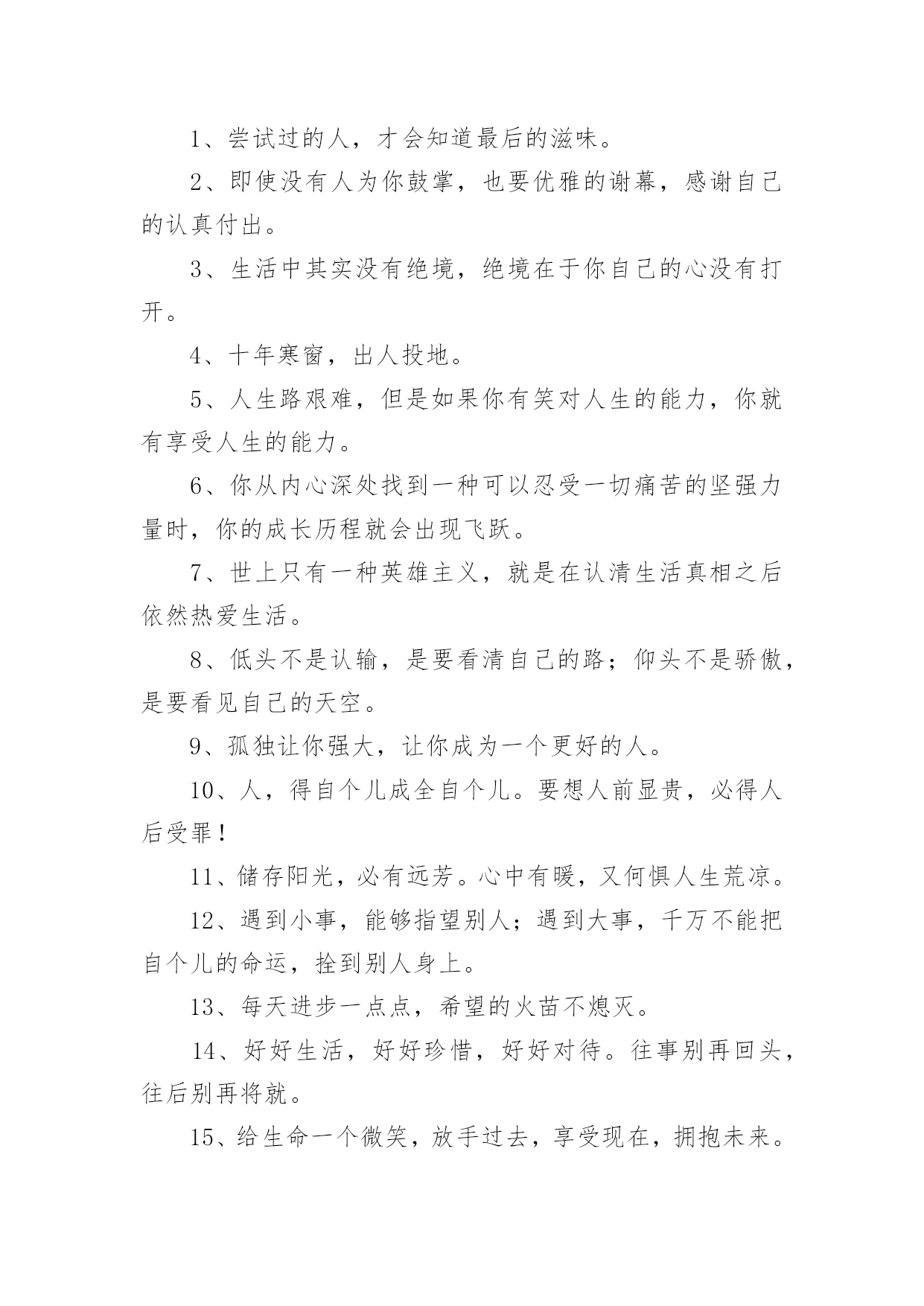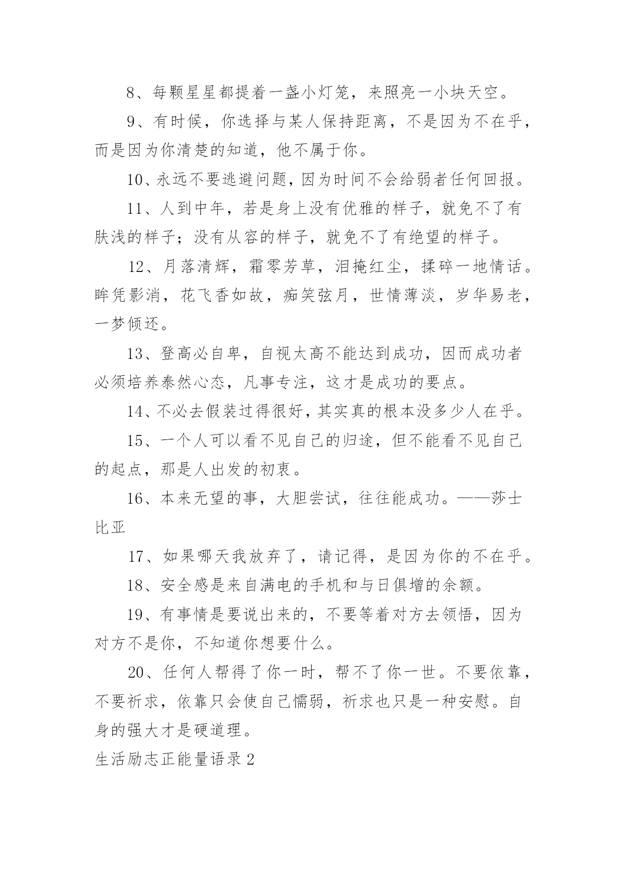 生活励志正能量语录生活励志正能量语录10篇在学习、工作乃至生活中,大家或多或少都接触过一些有名的语录吧,语录一般用于正式文体,是指一个人的说话记录。还在苦苦寻找优秀经典的语录吗?下面是小编为大家收集的生活励志正能量语录,仅供参考,欢迎大家阅读。生活励志正能量语录11、要生活得漂亮,需要付出极大忍耐,一不抱怨,二不解释。2、在浩瀚的宇宙里,每天都只是一瞬,活在今天,忘掉昨天。3、永远也不要高估你在别人心中的地位,其实你什么都不是,多你一个也不多,少你一个也不少。4、人世间99%的故事都是悲剧结局,大团圆只是1%。5、总有一段路,需要一个人走,那就一个人,勇敢的走完。一个软弱的人不可能找到坚强的理由,只能找到软弱的理由;而一个坚强的人不需要坚强的理由。6、你知道吗,我恨你,因为你偷我的心、抢我的爱、骗我的情,并将霸占我的后半生,最恨你的是,又浪费我一毛钱手机费!你就是我最困难时的那位永远支持我的人!7、真正的可悲,不是你已不爱她,而是你不爱她却还骗着爱她;8、每颗星星都提着一盏小灯笼,来照亮一小块天空。9、有时候,你选择与某人保持距离,不是因为不在乎,而是因为你清楚的知道,他不属于你。10、永远不要逃避问题,因为时间不会给弱者任何回报。11、人到中年,若是身上没有优雅的样子,就免不了有肤浅的样子;没有从容的样子,就免不了有绝望的样子。12、月落清辉,霜零芳草,泪掩红尘,揉碎一地情话。眸凭影消,花飞香如故,痴笑弦月,世情薄淡,岁华易老,一梦倾还。13、登高必自卑,自视太高不能达到成功,因而成功者必须培养泰然心态,凡事专注,这才是成功的要点。14、不必去假装过得很好,其实真的根本没多少人在乎。15、一个人可以看不见自己的归途,但不能看不见自己的起点,那是人出发的初衷。16、本来无望的事,大胆尝试,往往能成功。——莎士比亚17、如果哪天我放弃了,请记得,是因为你的不在乎。18、安全感是来自满电的手机和与日俱增的余额。19、有事情是要说出来的,不要等着对方去领悟,因为对方不是你,不知道你想要什么。20、任何人帮得了你一时,帮不了你一世。不要依靠,不要祈求,依靠只会使自己懦弱,祈求也只是一种安慰。自身的强大才是硬道理。生活励志正能量语录21、尝试过的人,才会知道最后的滋味。2、即使没有人为你鼓掌,也要优雅的谢幕,感谢自己的认真付出。3、生活中其实没有绝境,绝境在于你自己的心没有打开。4、十年寒窗,出人投地。5、人生路艰难,但是如果你有笑对人生的能力,你就有享受人生的能力。6、你从内心深处找到一种可以忍受一切痛苦的坚强力量时,你的成长历程就会出现飞跃。7、世上只有一种英雄主义,就是在认清生活真相之后依然热爱生活。8、低头不是认输,是要看清自己的路;仰头不是骄傲,是要看见自己的天空。9、孤独让你强大,让你成为一个更好的人。10、人,得自个儿成全自个儿。要想人前显贵,必得人后受罪!11、储存阳光,必有远芳。心中有暖,又何惧人生荒凉。12、遇到小事,能够指望别人;遇到大事,千万不能把自个儿的命运,拴到别人身上。13、每天进步一点点,希望的火苗不熄灭。14、好好生活,好好珍惜,好好对待。往事别再回头,往后别再将就。15、给生命一个微笑,放手过去,享受现在,拥抱未来。16、用勇敢面对坚强,用微笑迎接明天的朝阳。你会发现,每一处都是阳光明媚。17、世上无难事,只要肯登攀。18、生活就是生下来,活下去。19、孤独是上帝在提醒你,该充实自己了。20、认识一个人靠缘分,了解一个人靠耐心,战胜一个人靠智慧,征服一个人靠包容。21、人生没有白走的路,每走一步都算数。走好当下的每一步。22、心已经老到了一定的程度。23、艰苦是面临,挫折是经验,努力是桥梁,成功是彼岸。24、主角配角都能演,台上台下都自在——面对人生,练就能屈能伸的个性。25、昼与夜是黑白世界,哭与笑是苦乐人生。生活简单就迷人,人心简单就幸福。26、我相信,那一切都是种子。只有经过埋葬,才有生机。27、还有很多地方没去过,怎么可以倒在这里。28、感谢赐我逆境的众生。29、做事可以兼职,做人只能专职。30、人生没有什么事放不下去,痛了自然就会放下。31、当你决定了从此要做一个快乐的人,你也知道了自己首先要做的是一个坚强的人。32、这是个第一人称的世界,现在开始由我来论证这一切。33、有缘千里来相会,无缘千里走单骑。34、在泥泞的路上,保持一颗玩泥巴的心。35、如烟往事俱遗忘,心底无私天地宽。36、用你的笑容去改变这个世界,别让这个世界改变了你的笑容。37、人生太苦,多加点糖。38、当人生遇到挫折时,只有坚持,才能使我们走向成功。39、创业最大的突破和挑战在于用人,而用人最大的突破在于信任人。40、梦想不抛弃苦心追求的人,只要不停止追求,你们会沐浴在梦想的光辉之中。41、你要做多大的事情,就该承受多大