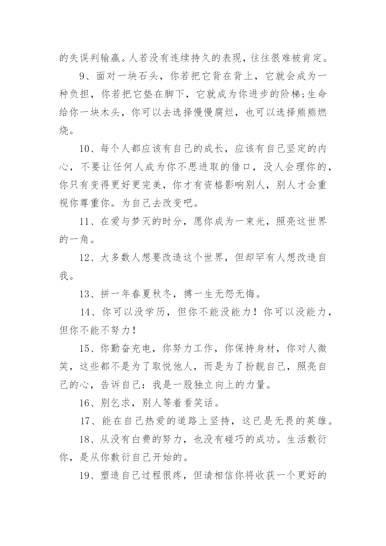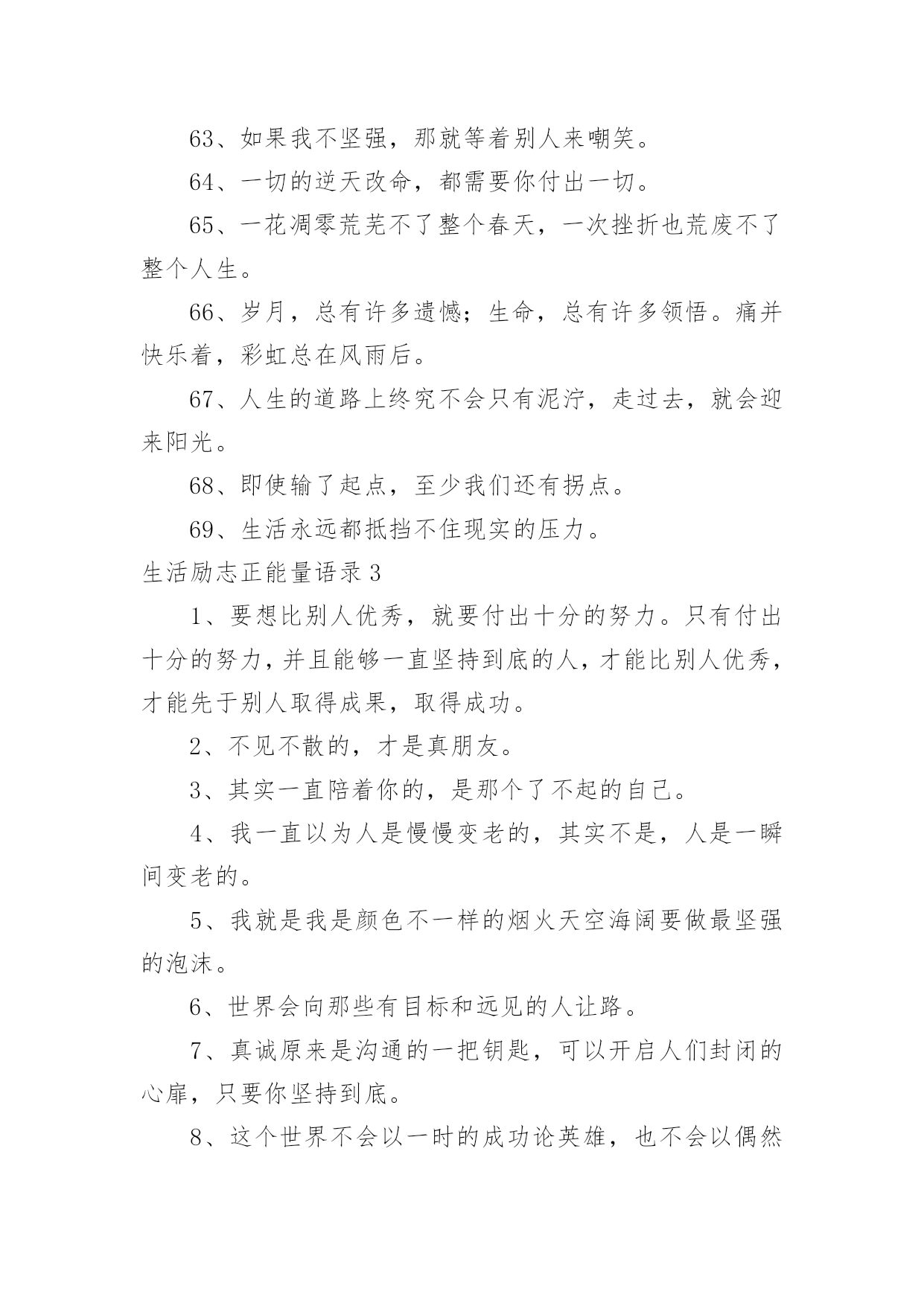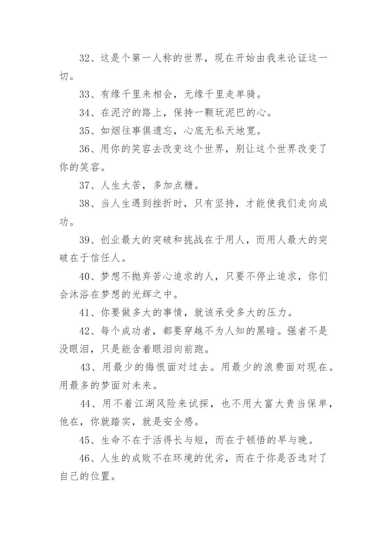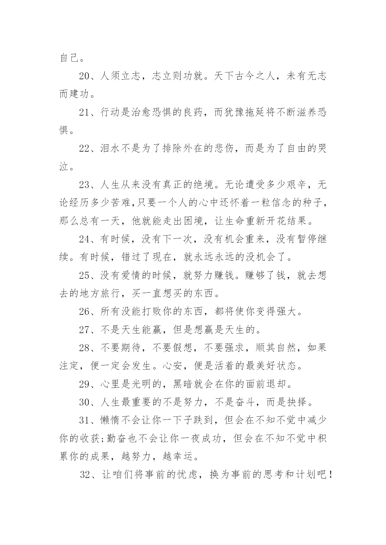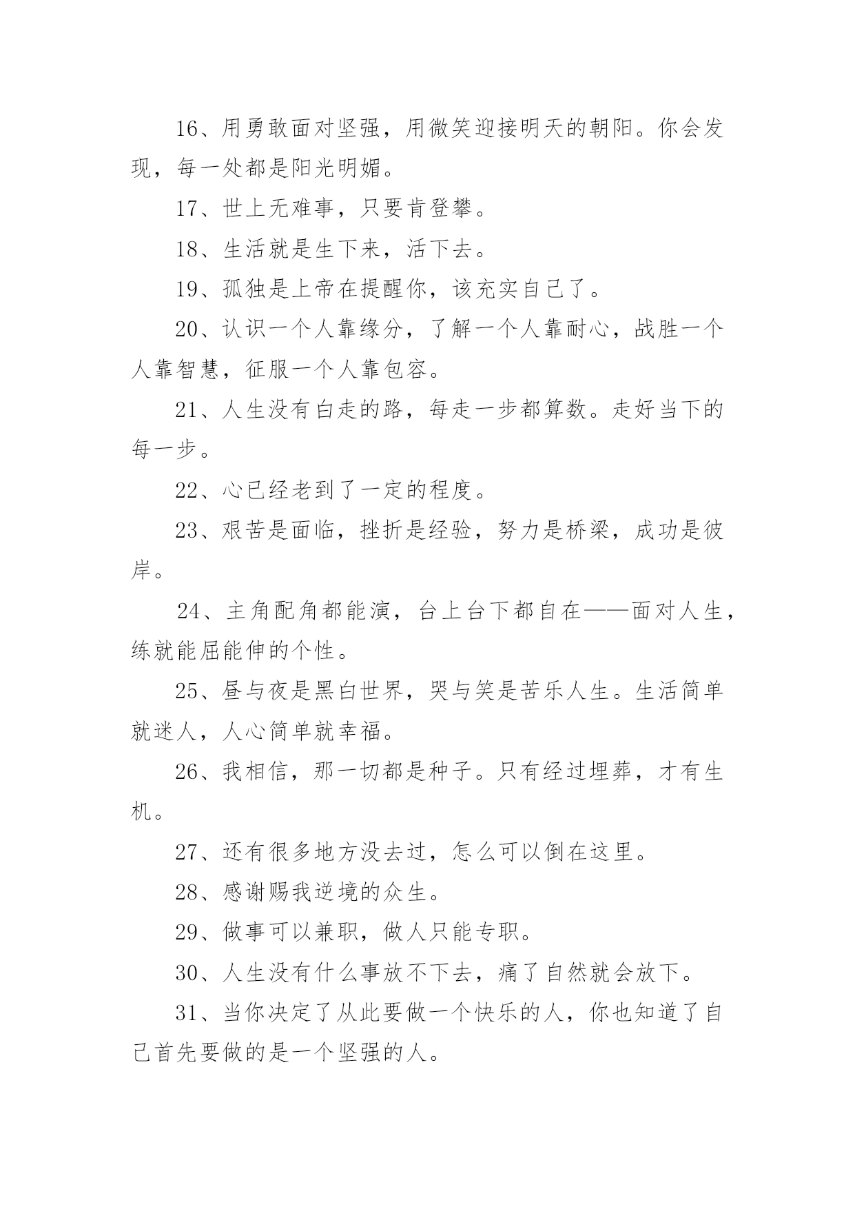 生活励志正能量语录生活励志正能量语录10篇在学习、工作乃至生活中,大家或多或少都接触过一些有名的语录吧,语录一般用于正式文体,是指一个人的说话记录。还在苦苦寻找优秀经典的语录吗?下面是小编为大家收集的生活励志正能量语录,仅供参考,欢迎大家阅读。生活励志正能量语录11、要生活得漂亮,需要付出极大忍耐,一不抱怨,二不解释。2、在浩瀚的宇宙里,每天都只是一瞬,活在今天,忘掉昨天。3、永远也不要高估你在别人心中的地位,其实你什么都不是,多你一个也不多,少你一个也不少。4、人世间99%的故事都是悲剧结局,大团圆只是1%。5、总有一段路,需要一个人走,那就一个人,勇敢的走完。一个软弱的人不可能找到坚强的理由,只能找到软弱的理由;而一个坚强的人不需要坚强的理由。6、你知道吗,我恨你,因为你偷我的心、抢我的爱、骗我的情,并将霸占我的后半生,最恨你的是,又浪费我一毛钱手机费!你就是我最困难时的那位永远支持我的人!7、真正的可悲,不是你已不爱她,而是你不爱她却还骗着爱她;8、每颗星星都提着一盏小灯笼,来照亮一小块天空。9、有时候,你选择与某人保持距离,不是因为不在乎,而是因为你清楚的知道,他不属于你。10、永远不要逃避问题,因为时间不会给弱者任何回报。11、人到中年,若是身上没有优雅的样子,就免不了有肤浅的样子;没有从容的样子,就免不了有绝望的样子。12、月落清辉,霜零芳草,泪掩红尘,揉碎一地情话。眸凭影消,花飞香如故,痴笑弦月,世情薄淡,岁华易老,一梦倾还。13、登高必自卑,自视太高不能达到成功,因而成功者必须培养泰然心态,凡事专注,这才是成功的要点。14、不必去假装过得很好,其实真的根本没多少人在乎。15、一个人可以看不见自己的归途,但不能看不见自己的起点,那是人出发的初衷。16、本来无望的事,大胆尝试,往往能成功。——莎士比亚17、如果哪天我放弃了,请记得,是因为你的不在乎。18、安全感是来自满电的手机和与日俱增的余额。19、有事情是要说出来的,不要等着对方去领悟,因为对方不是你,不知道你想要什么。20、任何人帮得了你一时,帮不了你一世。不要依靠,不要祈求,依靠只会使自己懦弱,祈求也只是一种安慰。自身的强大才是硬道理。生活励志正能量语录21、尝试过的人,才会知道最后的滋味。2、即使没有人为你鼓掌,也要优雅的谢幕,感谢自己的认真付出。3、生活中其实没有绝境,绝境在于你自己的心没有打开。4、十年寒窗,出人投地。5、人生路艰难,但是如果你有笑对人生的能力,你就有享受人生的能力。6、你从内心深处找到一种可以忍受一切痛苦的坚强力量时,你的成长历程就会出现飞跃。7、世上只有一种英雄主义,就是在认清生活真相之后依然热爱生活。8、低头不是认输,是要看清自己的路;仰头不是骄傲,是要看见自己的天空。9、孤独让你强大,让你成为一个更好的人。10、人,得自个儿成全自个儿。要想人前显贵,必得人后受罪!11、储存阳光,必有远芳。心中有暖,又何惧人生荒凉。12、遇到小事,能够指望别人;遇到大事,千万不能把自个儿的命运,拴到别人身上。13、每天进步一点点,希望的火苗不熄灭。14、好好生活,好好珍惜,好好对待。往事别再回头,往后别再将就。15、给生命一个微笑,放手过去,享受现在,拥抱未来。16、用勇敢面对坚强,用微笑迎接明天的朝阳。你会发现,每一处都是阳光明媚。17、世上无难事,只要肯登攀。18、生活就是生下来,活下去。19、孤独是上帝在提醒你,该充实自己了。20、认识一个人靠缘分,了解一个人靠耐心,战胜一个人靠智慧,征服一个人靠包容。21、人生没有白走的路,每走一步都算数。走好当下的每一步。22、心已经老到了一定的程度。23、艰苦是面临,挫折是经验,努力是桥梁,成功是彼岸。24、主角配角都能演,台上台下都自在——面对人生,练就能屈能伸的个性。25、昼与夜是黑白世界,哭与笑是苦乐人生。生活简单就迷人,人心简单就幸福。26、我相信,那一切都是种子。只有经过埋葬,才有生机。27、还有很多地方没去过,怎么可以倒在这里。28、感谢赐我逆境的众生。29、做事可以兼职,做人只能专职。30、人生没有什么事放不下去,痛了自然就会放下。31、当你决定了从此要做一个快乐的人,你也知道了自己首先要做的是一个坚强的人。32、这是个第一人称的世界,现在开始由我来论证这一切。33、有缘千里来相会,无缘千里走单骑。34、在泥泞的路上,保持一颗玩泥巴的心。35、如烟往事俱遗忘,心底无私天地宽。36、用你的笑容去改变这个世界,别让这个世界改变了你的笑容。37、人生太苦,多加点糖。38、当人生遇到挫折时,只有坚持,才能使我们走向成功。39、创业最大的突破和挑战在于用人,而用人最大的突破在于信任人。40、梦想不抛弃苦心追求的人,只要不停止追求,你们会沐浴在梦想的光辉之中。41、你要做多大的事情,就该承受多大