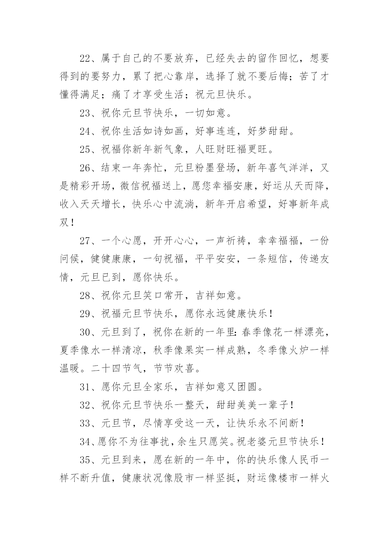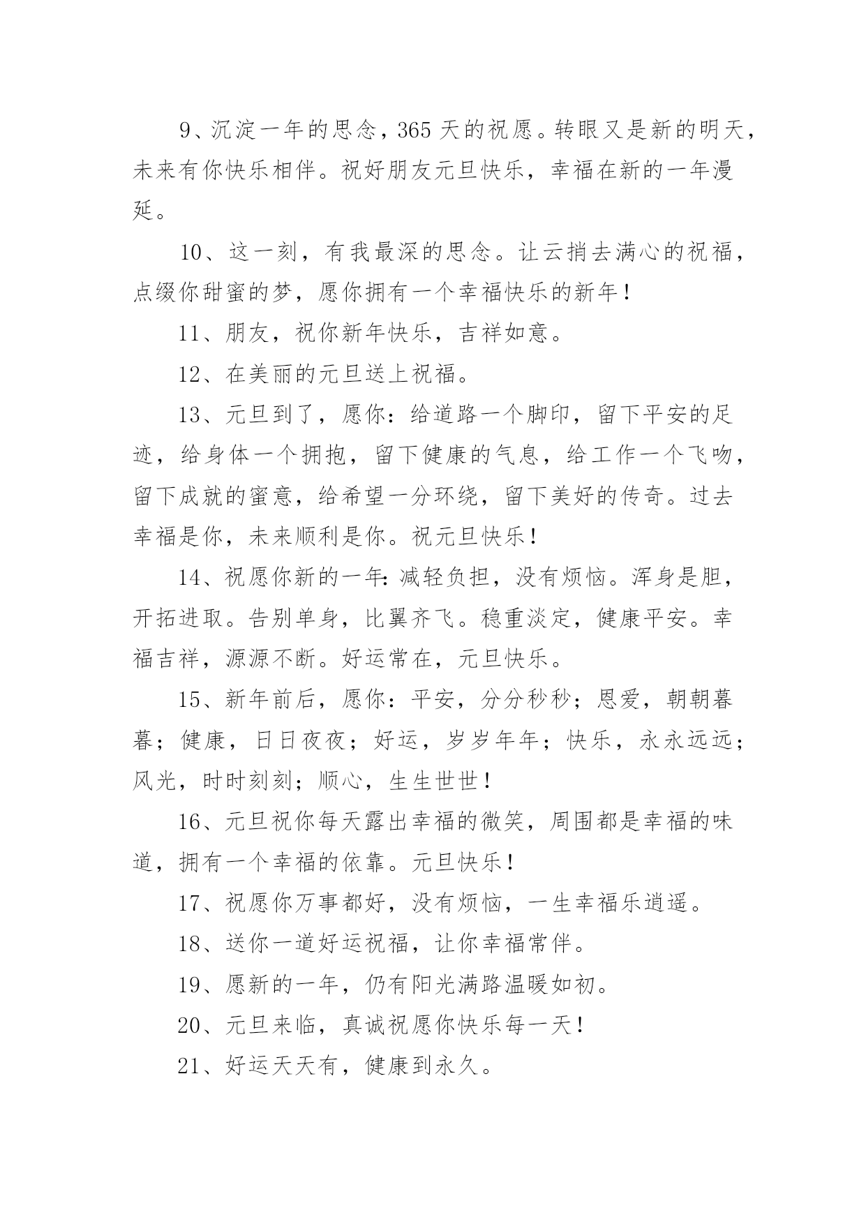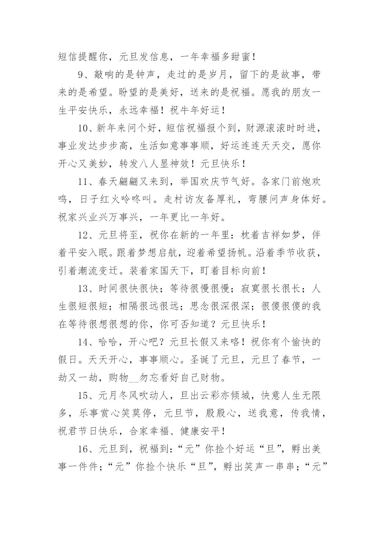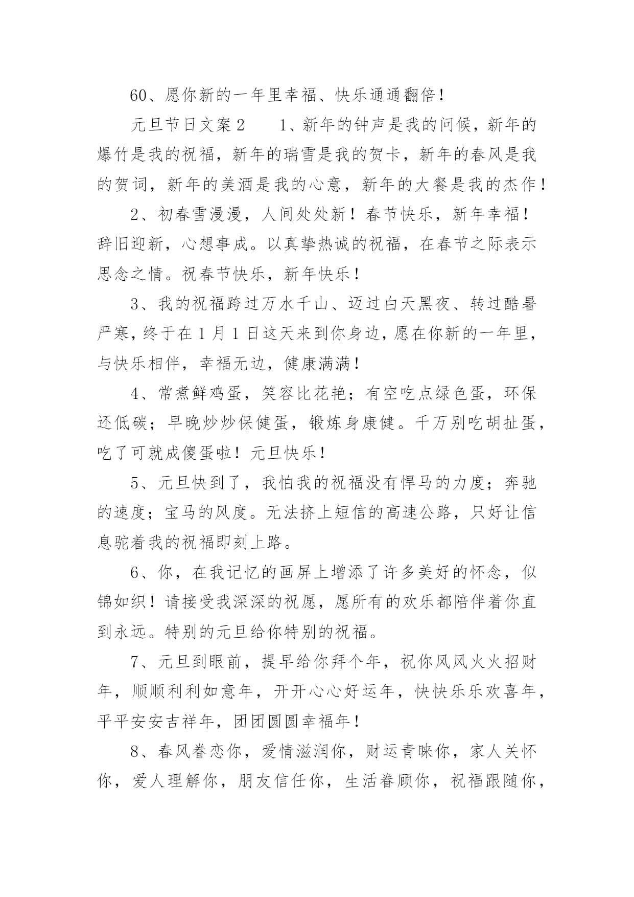 元旦节日文案元旦节日文案元旦节日文案(精选235句)在学习、工作或生活中,越来越多人喜欢发表文案,文案用于分享自己的奇闻趣事和生活日常。那么都有哪些类型的文案呢?以下是小编为大家整理的元旦节日文案(精选235句),欢迎大家分享。元旦节日文案11、我最亲爱的朋友:在新年来临之际祝愿上帝保佑您!观音菩萨护住您!财神抱住您!爱神射住您!食神吻住您!2、我祝你永远健康快乐,平安幸福!元旦节快乐!3、衷心祝福来年快乐、幸运!4、祝福送到,好运朝朝相伴!5、元旦佳节不送礼,发条短信祝福您,健康快乐唱伴你,好运和你不分离,还有让我告诉你,财神已经跟随你。祝元旦快乐!6、元旦来临心情好,风景入目挑一挑,帘卷西风你莫听,夜凉如水你莫察,没事信息翻一翻,祝你好运连成串,喜上眉梢又一年。7、元旦来了,祝福到了,朋友醒了,记忆活了,过往美了,未来炫了,心儿轻了,笑声脆了,思念醉了。8、我要衷心对您说一声:谢谢您,老师,元旦快乐!9、沉淀一年的思念,365天的祝愿。转眼又是新的明天,未来有你快乐相伴。祝好朋友元旦快乐,幸福在新的一年漫延。10、这一刻,有我最深的思念。让云捎去满心的祝福,点缀你甜蜜的梦,愿你拥有一个幸福快乐的新年!11、朋友,祝你新年快乐,吉祥如意。12、在美丽的元旦送上祝福。13、元旦到了,愿你:给道路一个脚印,留下平安的足迹,给身体一个拥抱,留下健康的气息,给工作一个飞吻,留下成就的蜜意,给希望一分环绕,留下美好的传奇。过去幸福是你,未来顺利是你。祝元旦快乐!14、祝愿你新的一年:减轻负担,没有烦恼。浑身是胆,开拓进取。告别单身,比翼齐飞。稳重淡定,健康平安。幸福吉祥,源源不断。好运常在,元旦快乐。15、新年前后,愿你:平安,分分秒秒;恩爱,朝朝暮暮;健康,日日夜夜;好运,岁岁年年;快乐,永永远远;风光,时时刻刻;顺心,生生世世!16、元旦祝你每天露出幸福的微笑,周围都是幸福的味道,拥有一个幸福的依靠。元旦快乐!17、祝愿你万事都好,没有烦恼,一生幸福乐逍遥。18、送你一道好运祝福,让你幸福常伴。19、愿新的一年,仍有阳光满路温暖如初。20、元旦来临,真诚祝愿你快乐每一天!21、好运天天有,健康到永久。22、属于自己的不要放弃,已经失去的留作回忆,想要得到的要努力,累了把心靠岸,选择了就不要后悔;苦了才懂得满足;痛了才享受生活;祝元旦快乐。23、祝你元旦节快乐,一切如意。24、祝你生活如诗如画,好事连连,好梦甜甜。25、祝福你新年新气象,人旺财旺福更旺。26、结束一年奔忙,元旦粉墨登场,新年喜气洋洋,又是精彩开场,微信祝福送上,愿您幸福安康,好运从天而降,收入天天增长,快乐心中流淌,新年开启希望,好事新年成双!27、一个心愿,开开心心,一声祈祷,幸幸福福,一份问候,健健康康,一句祝福,平平安安,一条短信,传递友情,元旦已到,愿你快乐。28、祝你元旦笑口常开,吉祥如意。29、祝福元旦节快乐,愿你永远健康快乐!30、元旦到了,祝你在新的一年里:春季像花一样漂亮,夏季像水一样清凉,秋季像果实一样成熟,冬季像火炉一样温暖。二十四节气,节节欢喜。31、愿你元旦全家乐,吉祥如意又团圆。32、祝你元旦节快乐一整天,甜甜美美一辈子!33、元旦节,尽情享受这一天,让快乐永不间断!34、愿你不为往事扰,余生只愿笑。祝老婆元旦节快乐!35、元旦到来,愿在新的一年中,你的快乐像人民币一样不断升值,健康状况像股市一样坚挺,财运像楼市一样火爆,幸福指数像油价一样层层攀高!36、元旦又来到,祝福忙送到,烦恼已逃跑,好运来报道,快乐围你绕,霉运找不到。新的一年,愿你生活处处好,事业步步高!37、愿友乐开心,事事都顺心。元旦快乐!38、轻轻推开冬季的窗,静看雪花飘起,给你捎个讯息,你还好吗?真是惦记,祝你新年快乐甜蜜!39、开心在打鼓,快乐在冒泡。元旦快乐!40、愿去年所有的遗憾是今年惊喜的铺垫。元旦快乐!41、相识系于缘,相知系于诚,一个真正的朋友不论身在何处,总时时付出关和爱,愿好友平安、幸福。元旦快乐!42、新年来临送温暖,我把祝福连一连,愿你好运连连财气多,福气连连幸运多,喜气连连顺心多,快乐连连欢乐多,祝福连连友谊多,新年快乐!43、世上没有迈不过去的槛,世上没有闯不过去的弯。转眼元旦到了,让所有的`痛苦伤悲留在,让快乐幸福之光照耀在你的脸庞。愿你元旦快乐,生活圆满!44、每逢佳节倍思亲,花好月圆寄亲情;祝亲盼友万事兴,共享天天好心情。45、不知道顽皮的鸟儿,今天是否会向你鸣叫?不知道天上的神仙,今天是否会向你祝福?不知道在你的心里,是否感觉到今天的不同?我只有一个心愿要向你表达:祝你元旦快快乐乐。46、祝你元旦快乐,幸福来到!47、花儿为你开,心儿为你摘,所有幸福为你来。元旦快乐!48、诚祝你节日快乐,拥抱梦想!49、愿你新年新气象,好运又好年。50