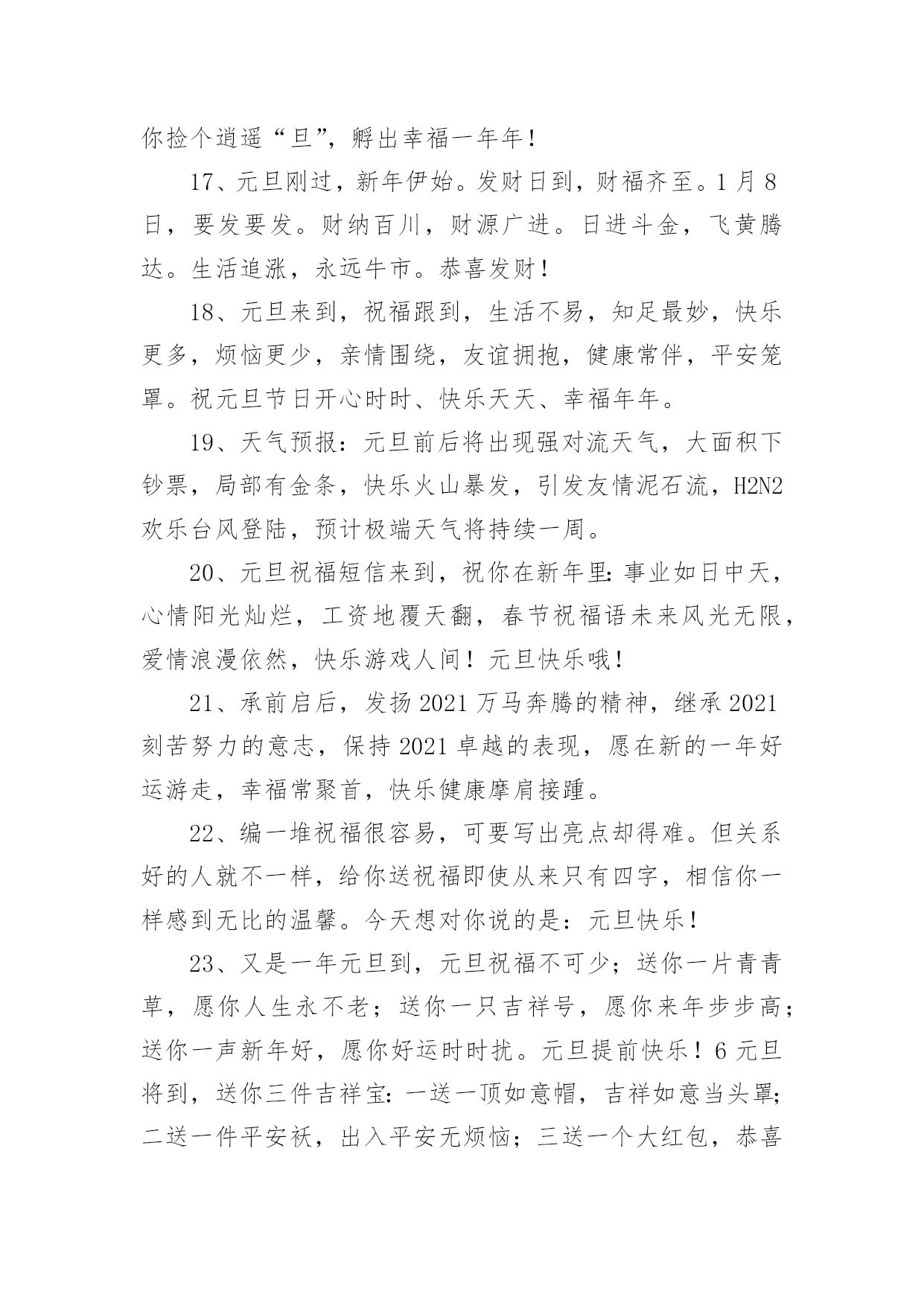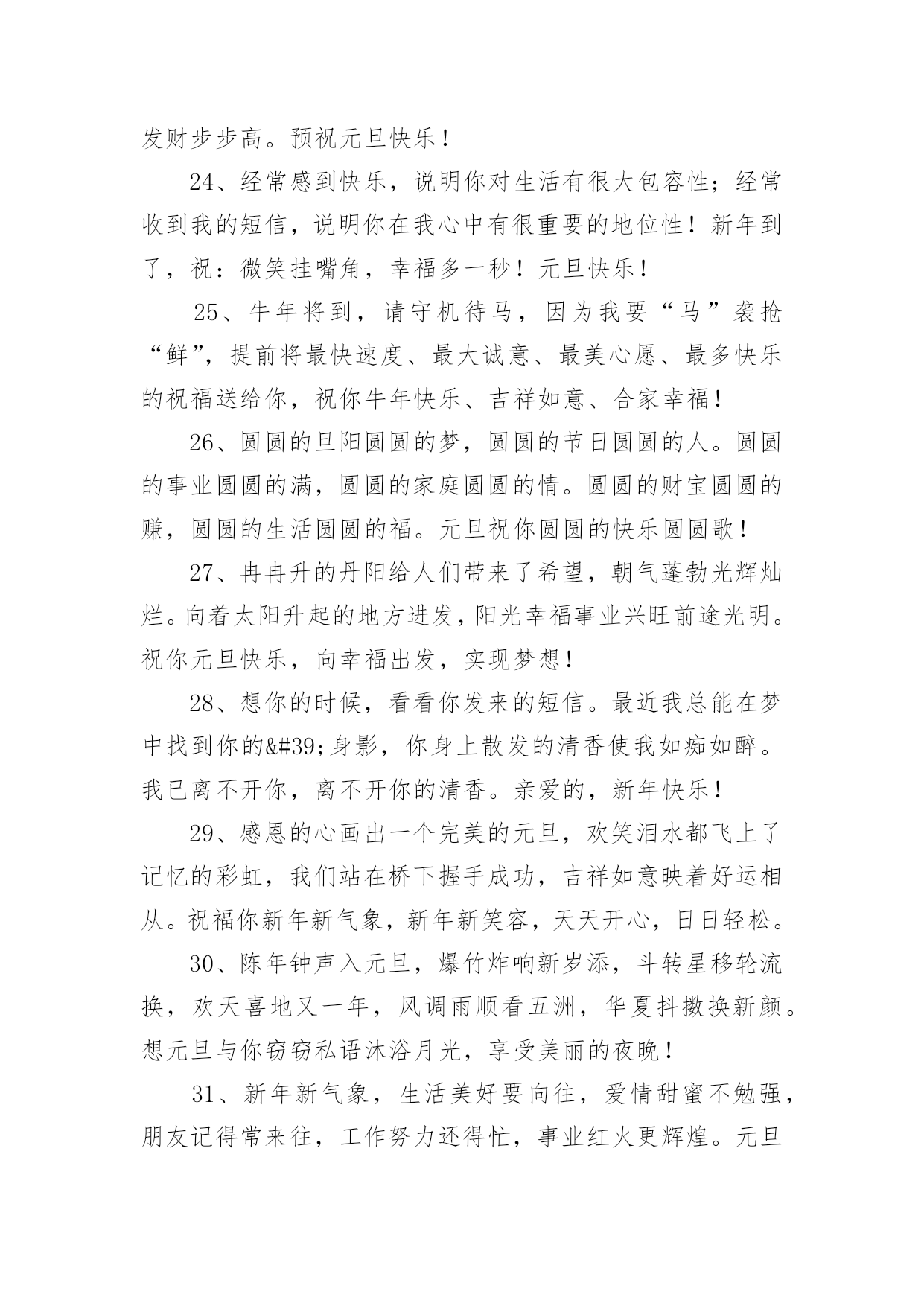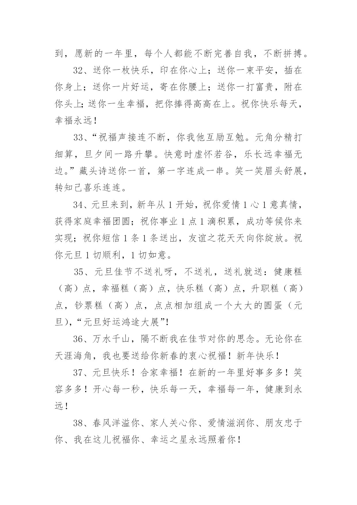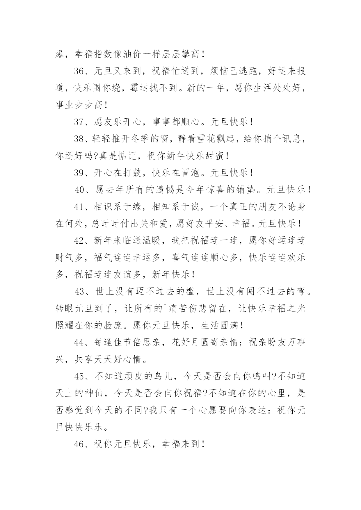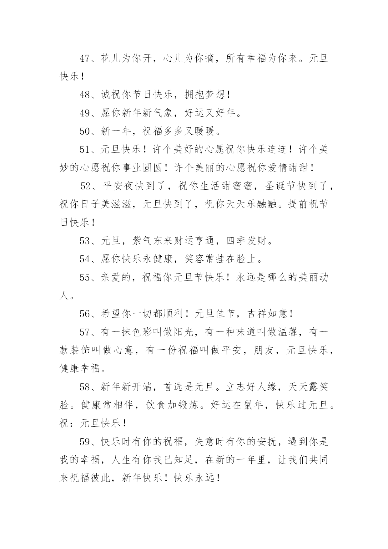 元旦节日文案元旦节日文案元旦节日文案(精选235句)在学习、工作或生活中,越来越多人喜欢发表文案,文案用于分享自己的奇闻趣事和生活日常。那么都有哪些类型的文案呢?以下是小编为大家整理的元旦节日文案(精选235句),欢迎大家分享。元旦节日文案11、我最亲爱的朋友:在新年来临之际祝愿上帝保佑您!观音菩萨护住您!财神抱住您!爱神射住您!食神吻住您!2、我祝你永远健康快乐,平安幸福!元旦节快乐!3、衷心祝福来年快乐、幸运!4、祝福送到,好运朝朝相伴!5、元旦佳节不送礼,发条短信祝福您,健康快乐唱伴你,好运和你不分离,还有让我告诉你,财神已经跟随你。祝元旦快乐!6、元旦来临心情好,风景入目挑一挑,帘卷西风你莫听,夜凉如水你莫察,没事信息翻一翻,祝你好运连成串,喜上眉梢又一年。7、元旦来了,祝福到了,朋友醒了,记忆活了,过往美了,未来炫了,心儿轻了,笑声脆了,思念醉了。8、我要衷心对您说一声:谢谢您,老师,元旦快乐!9、沉淀一年的思念,365天的祝愿。转眼又是新的明天,未来有你快乐相伴。祝好朋友元旦快乐,幸福在新的一年漫延。10、这一刻,有我最深的思念。让云捎去满心的祝福,点缀你甜蜜的梦,愿你拥有一个幸福快乐的新年!11、朋友,祝你新年快乐,吉祥如意。12、在美丽的元旦送上祝福。13、元旦到了,愿你:给道路一个脚印,留下平安的足迹,给身体一个拥抱,留下健康的气息,给工作一个飞吻,留下成就的蜜意,给希望一分环绕,留下美好的传奇。过去幸福是你,未来顺利是你。祝元旦快乐!14、祝愿你新的一年:减轻负担,没有烦恼。浑身是胆,开拓进取。告别单身,比翼齐飞。稳重淡定,健康平安。幸福吉祥,源源不断。好运常在,元旦快乐。15、新年前后,愿你:平安,分分秒秒;恩爱,朝朝暮暮;健康,日日夜夜;好运,岁岁年年;快乐,永永远远;风光,时时刻刻;顺心,生生世世!16、元旦祝你每天露出幸福的微笑,周围都是幸福的味道,拥有一个幸福的依靠。元旦快乐!17、祝愿你万事都好,没有烦恼,一生幸福乐逍遥。18、送你一道好运祝福,让你幸福常伴。19、愿新的一年,仍有阳光满路温暖如初。20、元旦来临,真诚祝愿你快乐每一天!21、好运天天有,健康到永久。22、属于自己的不要放弃,已经失去的留作回忆,想要得到的要努力,累了把心靠岸,选择了就不要后悔;苦了才懂得满足;痛了才享受生活;祝元旦快乐。23、祝你元旦节快乐,一切如意。24、祝你生活如诗如画,好事连连,好梦甜甜。25、祝福你新年新气象,人旺财旺福更旺。26、结束一年奔忙,元旦粉墨登场,新年喜气洋洋,又是精彩开场,微信祝福送上,愿您幸福安康,好运从天而降,收入天天增长,快乐心中流淌,新年开启希望,好事新年成双!27、一个心愿,开开心心,一声祈祷,幸幸福福,一份问候,健健康康,一句祝福,平平安安,一条短信,传递友情,元旦已到,愿你快乐。28、祝你元旦笑口常开,吉祥如意。29、祝福元旦节快乐,愿你永远健康快乐!30、元旦到了,祝你在新的一年里:春季像花一样漂亮,夏季像水一样清凉,秋季像果实一样成熟,冬季像火炉一样温暖。二十四节气,节节欢喜。31、愿你元旦全家乐,吉祥如意又团圆。32、祝你元旦节快乐一整天,甜甜美美一辈子!33、元旦节,尽情享受这一天,让快乐永不间断!34、愿你不为往事扰,余生只愿笑。祝老婆元旦节快乐!35、元旦到来,愿在新的一年中,你的快乐像人民币一样不断升值,健康状况像股市一样坚挺,财运像楼市一样火爆,幸福指数像油价一样层层攀高!36、元旦又来到,祝福忙送到,烦恼已逃跑,好运来报道,快乐围你绕,霉运找不到。新的一年,愿你生活处处好,事业步步高!37、愿友乐开心,事事都顺心。元旦快乐!38、轻轻推开冬季的窗,静看雪花飘起,给你捎个讯息,你还好吗?真是惦记,祝你新年快乐甜蜜!39、开心在打鼓,快乐在冒泡。元旦快乐!40、愿去年所有的遗憾是今年惊喜的铺垫。元旦快乐!41、相识系于缘,相知系于诚,一个真正的朋友不论身在何处,总时时付出关和爱,愿好友平安、幸福。元旦快乐!42、新年来临送温暖,我把祝福连一连,愿你好运连连财气多,福气连连幸运多,喜气连连顺心多,快乐连连欢乐多,祝福连连友谊多,新年快乐!43、世上没有迈不过去的槛,世上没有闯不过去的弯。转眼元旦到了,让所有的`痛苦伤悲留在,让快乐幸福之光照耀在你的脸庞。愿你元旦快乐,生活圆满!44、每逢佳节倍思亲,花好月圆寄亲情;祝亲盼友万事兴,共享天天好心情。45、不知道顽皮的鸟儿,今天是否会向你鸣叫?不知道天上的神仙,今天是否会向你祝福?不知道在你的心里,是否感觉到今天的不同?我只有一个心愿要向你表达:祝你元旦快快乐乐。46、祝你元旦快乐,幸福来到!47、花儿为你开,心儿为你摘,所有幸福为你来。元旦快乐!48、诚祝你节日快乐,拥抱梦想!49、愿你新年新气象,好运又好年。50