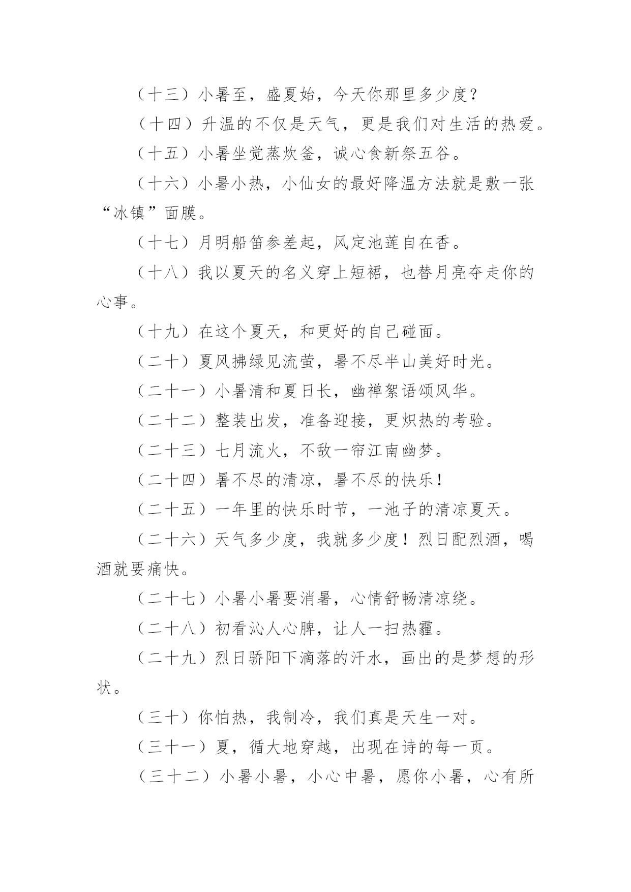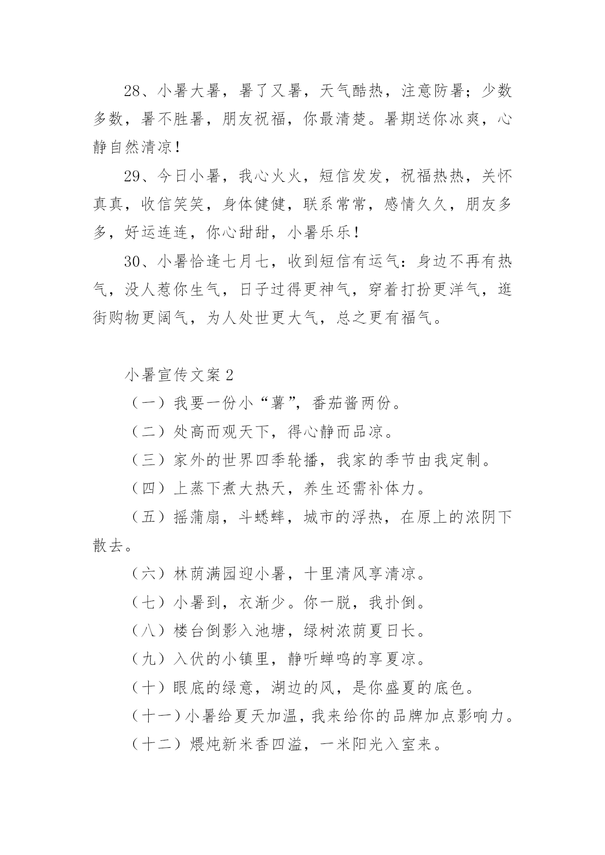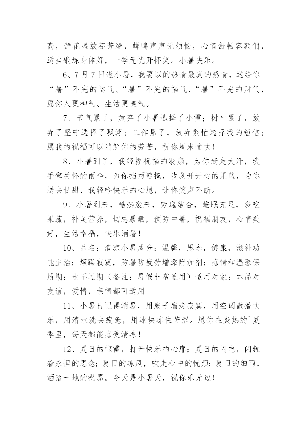 小暑宣传文案小暑宣传文案(精选110句)无论是身处学校还是步入社会,越来越多人钟情于在网上发布文案,文案用以宣泄自己的小情绪,分享自己的心情。那么都有哪些类型的文案呢?以下是小编为大家收集的小暑宣传文案(精选110句),仅供参考,欢迎大家阅读。小暑宣传文案11、你是不是像我在小暑天里奔走,也顶着压力默默辛苦的工作,你是不是像我就算是炎热难耐,也在坚持自己追求的梦想,希望这条短信都给你鼓励,让我们互相祝福,勇敢的往前走!2、小暑来了正三伏,此时瓜果已成熟,苦瓜茄子多进补,经常翻洗晒衣物,多吃蔬菜多运动,睡眠一定要充足,心情愉快你做主!小暑快乐!3、小暑时节阳气旺,养生之道要注意。多喝稀粥排毒素,补虚止汗有炒豆皮。南瓜绿豆汤可生津,多食叶菜和瓜类。西瓜好吃不可过,增加肠胃负担易腹泻。愿你小暑体康泰,快快乐乐每一天!4、小暑小暑,眨眼来到;蝉儿蝉儿,整天鸣叫;清风清风,吹跑烦恼;夏雨夏雨,冲掉忧伤;短信短信,祝愿恰好,开心一笑。祝小暑幸福绵长,如意凉爽。5、小暑驾到艳阳照,你的祝福我送到,清风吹来好运高,鲜花盛放芬芳绕,蝉鸣声声无烦恼,心情舒畅容颜俏,适当锻炼身体好,一季无忧开怀笑。小暑快乐。6、7月7日逢小暑,我要以的热情最真的感情,送给你“暑”不完的运气、“暑”不完的福气、“暑”不完的财气,愿你人更神气、生活更美气。7、节气累了,放弃了小暑选择了小雪;树叶累了,放弃了坚守选择了飘浮;工作累了,放弃繁忙选择我的短信;愿我的祝福可以消解你的劳苦,祝你周末愉快!8、小暑到了,我轻摇祝福的羽扇,为你赶走大汗,我手擎关怀的雨伞,为你挡雨遮掩,我剥开开心的果篮,为你送去甘甜,我轻吟快乐的心愿,让你笑声不断。9、小暑到来,酷热袭来,劳逸结合,睡眠充足,多吃果蔬,补足营养,切忌暴晒,预防中暑,祝福朋友,心情美好,生活幸福,快乐消暑!10、品名:清凉小暑成分:温馨,思念,健康,滋补功能主治:烦躁寂寞,防暑防疲劳增添附加剂:感情和温馨保质期:永不过期(备注:暑假非常适用)适用对象:本品对友谊,爱情,亲情都可适用11、小暑日记得消暑,用扇子扇走寂寞,用空调散播快乐,用清水洗去疲惫,用冰块冻住苦涩。愿你在炎热的`夏季里,每天都能感受清凉!12、夏日的惊雷,打开快乐的心扉;夏日的闪电,闪耀着永恒的思念;夏日的凉风,吹走心中的忧烦;夏日的细雨,洒落一地的祝愿。今天是小暑天,祝你乐无边!13、小暑花开多娇艳,我的祝福润心田。愿你的快乐如青山般绵延,你的幸福如细雨般翩翩,你的好运如娇艳般灿烂,你的惬意如清风般连连。亲爱的朋友,记得小暑快乐。14、又到小暑,愿你“曙”光沐浴,业绩数一“数”二,家有摇钱“树”,吃营养丰富的菜“蔬”,住舒适的别“墅”,思想越来越成“熟”,幸福非你莫“属”。15、我向春借了一缕微风,跟秋借了几片绿叶,跟冬借了一堆雪花,采集了一碗夏雨,用满心的关怀和祝福,制成一个凉爽的冰棍,送给你,祝你小暑快乐!16、小暑到了,送给亲爱的朋友:一缕清凉的爱意,一份温馨的祝福,一种幸福的喜悦,一份无限的美好。祝开心快乐。17、小暑到,烈日照,温度直线在攀高;度盛夏,别焦躁,我来为您支几招;心情好,烦恼抛,清凉自然心中绕;补充水,睡眠好,适度休息很重要;健康伴,体质妙,小暑愿您哈哈笑!18、小暑来临喜滋滋,艳阳高照暖丝丝,事业高升笑嘻嘻,家庭美满笑眯眯,爱情甜蜜娇滴滴,短信祝福美滋滋。嘿嘿,开心?那就一起来笑嘻嘻!19、小暑节气到,送你一把荷叶伞,为你遮挡烈日高照;送你一碗绿豆汤,为你疏解心中烦恼;送你一把芭蕉扇,为你扇来吉祥好运兆;送你一条短信,为你带来幸福和欢笑。小暑快乐!20、荷香满塘芬芳你的心田,清风凉爽轻拂你的烦扰,红花绿树灿烂你的视线,瓜果满目滋润你的容颜,愿你小暑时节容颜俏,心欢笑,无烦恼,乐淘淘。21、小暑一到,气温增高,防暑降温,自有妙招,绿豆熬汤,清热解毒,新鲜瓜果,解暑最妙,保持心静,清凉自在,常常冲澡,清爽无限,保持卫生,健康度夏,祝福送你,愿你小暑快乐相伴。22、小暑炎热,注意保健:绿豆粥,雪梨茶,清热解乏,品雪梨,吃西瓜,消渴解暑,多通风,多散步,流通舒畅,糖盐水,蔬菜汁,汗后营养,愿小暑快乐。23、寓言故事:犯了天条的小白龙只能在六月六这天探母,见母心切的它孝心满载,昼夜兼程,不辞劳苦!寓意:好孩子要学习小白龙,小暑记得常回家看看!24、小暑到来,气温狂升,不浮不躁,保持心静,蔬菜水果,不能少吃,喝水午觉,去疲去乏,防暑避暑,注重健康,祝福朋友,小暑快乐,身体健康,冰凉一夏,快乐永远!25、小暑来临炎炎至,短信到来祝福至,愿你开怀快乐至,工作顺利高升至,无忧无愁笑容至,财源滚滚吉祥至,家庭美满幸福至,万事如意在夏至。26、一丝祝福,化作清风,驱走炎热,一句问候,化作温暖,驱走烦躁,一条短信,带着情谊,带来关怀,一声铃声,带
