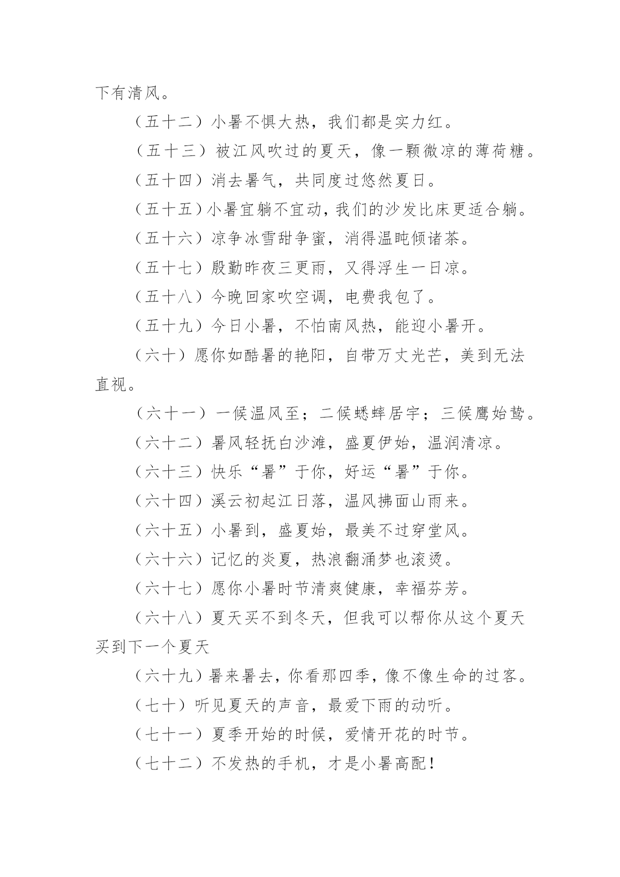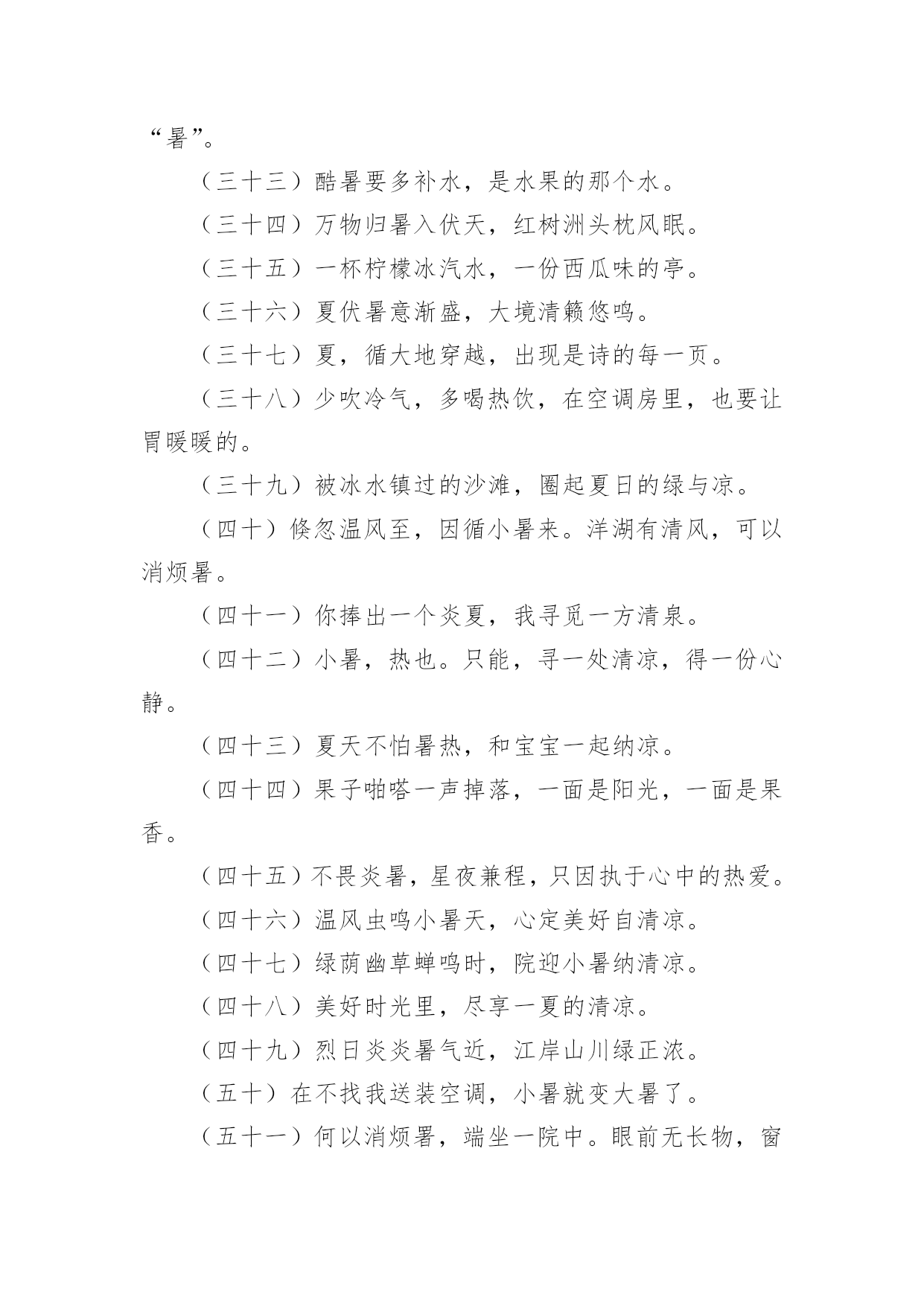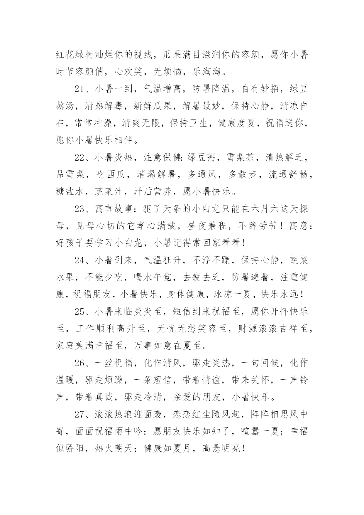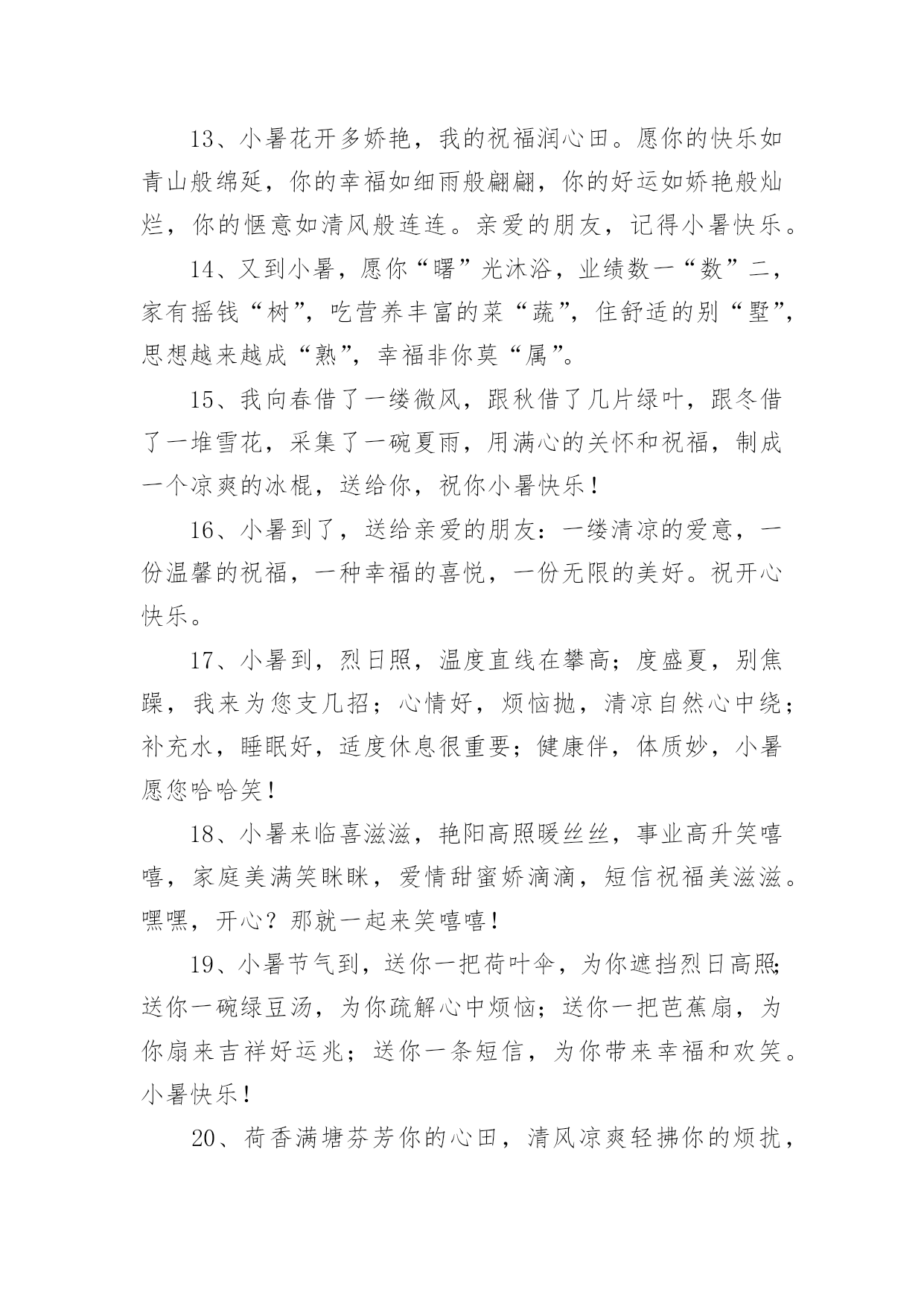 小暑宣传文案小暑宣传文案(精选110句)无论是身处学校还是步入社会,越来越多人钟情于在网上发布文案,文案用以宣泄自己的小情绪,分享自己的心情。那么都有哪些类型的文案呢?以下是小编为大家收集的小暑宣传文案(精选110句),仅供参考,欢迎大家阅读。小暑宣传文案11、你是不是像我在小暑天里奔走,也顶着压力默默辛苦的工作,你是不是像我就算是炎热难耐,也在坚持自己追求的梦想,希望这条短信都给你鼓励,让我们互相祝福,勇敢的往前走!2、小暑来了正三伏,此时瓜果已成熟,苦瓜茄子多进补,经常翻洗晒衣物,多吃蔬菜多运动,睡眠一定要充足,心情愉快你做主!小暑快乐!3、小暑时节阳气旺,养生之道要注意。多喝稀粥排毒素,补虚止汗有炒豆皮。南瓜绿豆汤可生津,多食叶菜和瓜类。西瓜好吃不可过,增加肠胃负担易腹泻。愿你小暑体康泰,快快乐乐每一天!4、小暑小暑,眨眼来到;蝉儿蝉儿,整天鸣叫;清风清风,吹跑烦恼;夏雨夏雨,冲掉忧伤;短信短信,祝愿恰好,开心一笑。祝小暑幸福绵长,如意凉爽。5、小暑驾到艳阳照,你的祝福我送到,清风吹来好运高,鲜花盛放芬芳绕,蝉鸣声声无烦恼,心情舒畅容颜俏,适当锻炼身体好,一季无忧开怀笑。小暑快乐。6、7月7日逢小暑,我要以的热情最真的感情,送给你“暑”不完的运气、“暑”不完的福气、“暑”不完的财气,愿你人更神气、生活更美气。7、节气累了,放弃了小暑选择了小雪;树叶累了,放弃了坚守选择了飘浮;工作累了,放弃繁忙选择我的短信;愿我的祝福可以消解你的劳苦,祝你周末愉快!8、小暑到了,我轻摇祝福的羽扇,为你赶走大汗,我手擎关怀的雨伞,为你挡雨遮掩,我剥开开心的果篮,为你送去甘甜,我轻吟快乐的心愿,让你笑声不断。9、小暑到来,酷热袭来,劳逸结合,睡眠充足,多吃果蔬,补足营养,切忌暴晒,预防中暑,祝福朋友,心情美好,生活幸福,快乐消暑!10、品名:清凉小暑成分:温馨,思念,健康,滋补功能主治:烦躁寂寞,防暑防疲劳增添附加剂:感情和温馨保质期:永不过期(备注:暑假非常适用)适用对象:本品对友谊,爱情,亲情都可适用11、小暑日记得消暑,用扇子扇走寂寞,用空调散播快乐,用清水洗去疲惫,用冰块冻住苦涩。愿你在炎热的`夏季里,每天都能感受清凉!12、夏日的惊雷,打开快乐的心扉;夏日的闪电,闪耀着永恒的思念;夏日的凉风,吹走心中的忧烦;夏日的细雨,洒落一地的祝愿。今天是小暑天,祝你乐无边!13、小暑花开多娇艳,我的祝福润心田。愿你的快乐如青山般绵延,你的幸福如细雨般翩翩,你的好运如娇艳般灿烂,你的惬意如清风般连连。亲爱的朋友,记得小暑快乐。14、又到小暑,愿你“曙”光沐浴,业绩数一“数”二,家有摇钱“树”,吃营养丰富的菜“蔬”,住舒适的别“墅”,思想越来越成“熟”,幸福非你莫“属”。15、我向春借了一缕微风,跟秋借了几片绿叶,跟冬借了一堆雪花,采集了一碗夏雨,用满心的关怀和祝福,制成一个凉爽的冰棍,送给你,祝你小暑快乐!16、小暑到了,送给亲爱的朋友:一缕清凉的爱意,一份温馨的祝福,一种幸福的喜悦,一份无限的美好。祝开心快乐。17、小暑到,烈日照,温度直线在攀高;度盛夏,别焦躁,我来为您支几招;心情好,烦恼抛,清凉自然心中绕;补充水,睡眠好,适度休息很重要;健康伴,体质妙,小暑愿您哈哈笑!18、小暑来临喜滋滋,艳阳高照暖丝丝,事业高升笑嘻嘻,家庭美满笑眯眯,爱情甜蜜娇滴滴,短信祝福美滋滋。嘿嘿,开心?那就一起来笑嘻嘻!19、小暑节气到,送你一把荷叶伞,为你遮挡烈日高照;送你一碗绿豆汤,为你疏解心中烦恼;送你一把芭蕉扇,为你扇来吉祥好运兆;送你一条短信,为你带来幸福和欢笑。小暑快乐!20、荷香满塘芬芳你的心田,清风凉爽轻拂你的烦扰,红花绿树灿烂你的视线,瓜果满目滋润你的容颜,愿你小暑时节容颜俏,心欢笑,无烦恼,乐淘淘。21、小暑一到,气温增高,防暑降温,自有妙招,绿豆熬汤,清热解毒,新鲜瓜果,解暑最妙,保持心静,清凉自在,常常冲澡,清爽无限,保持卫生,健康度夏,祝福送你,愿你小暑快乐相伴。22、小暑炎热,注意保健:绿豆粥,雪梨茶,清热解乏,品雪梨,吃西瓜,消渴解暑,多通风,多散步,流通舒畅,糖盐水,蔬菜汁,汗后营养,愿小暑快乐。23、寓言故事:犯了天条的小白龙只能在六月六这天探母,见母心切的它孝心满载,昼夜兼程,不辞劳苦!寓意:好孩子要学习小白龙,小暑记得常回家看看!24、小暑到来,气温狂升,不浮不躁,保持心静,蔬菜水果,不能少吃,喝水午觉,去疲去乏,防暑避暑,注重健康,祝福朋友,小暑快乐,身体健康,冰凉一夏,快乐永远!25、小暑来临炎炎至,短信到来祝福至,愿你开怀快乐至,工作顺利高升至,无忧无愁笑容至,财源滚滚吉祥至,家庭美满幸福至,万事如意在夏至。26、一丝祝福,化作清风,驱走炎热,一句问候,化作温暖,驱走烦躁,一条短信,带着情谊,带来关怀,一声铃声,带
