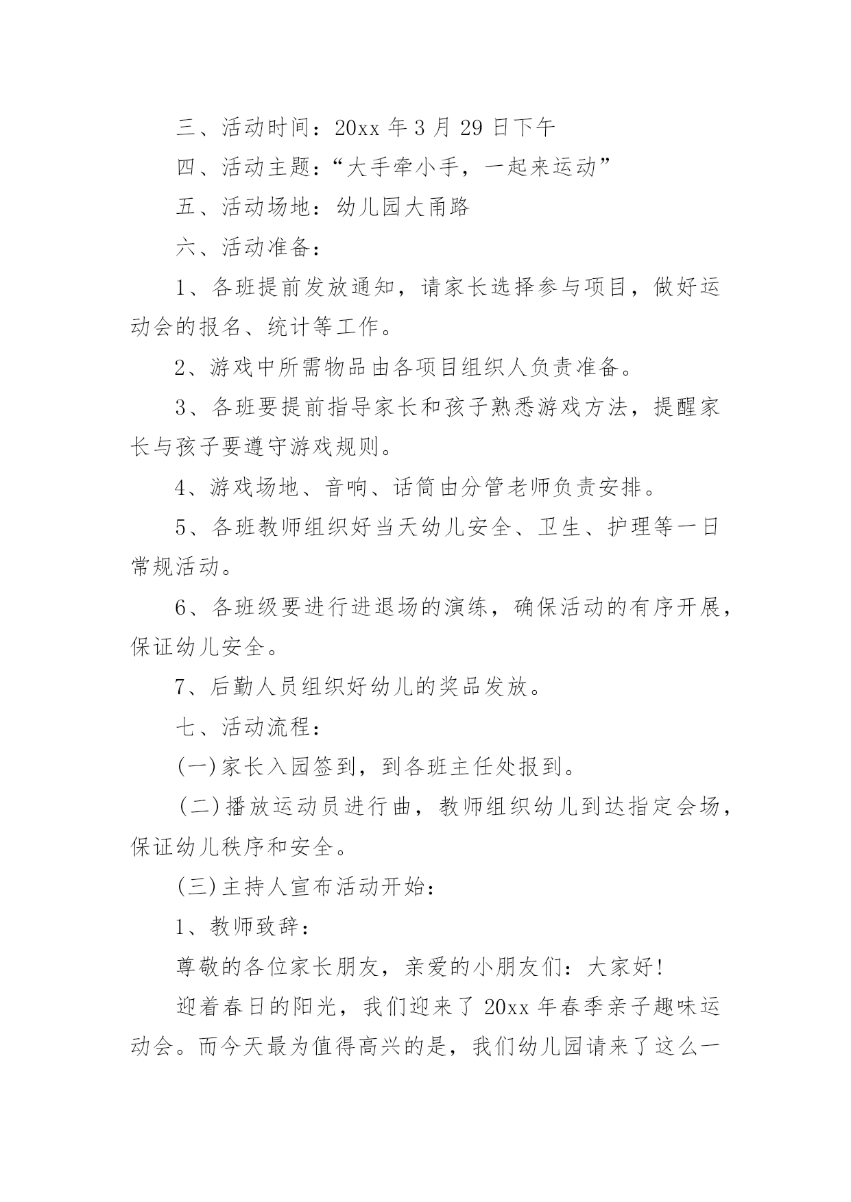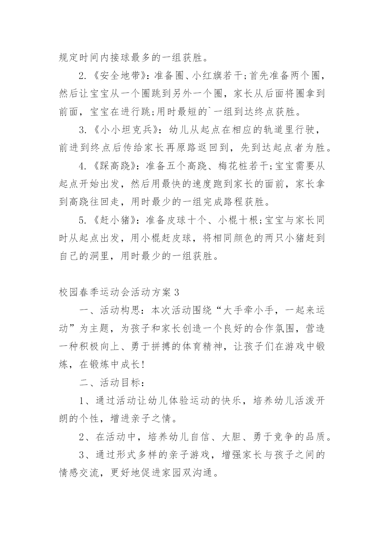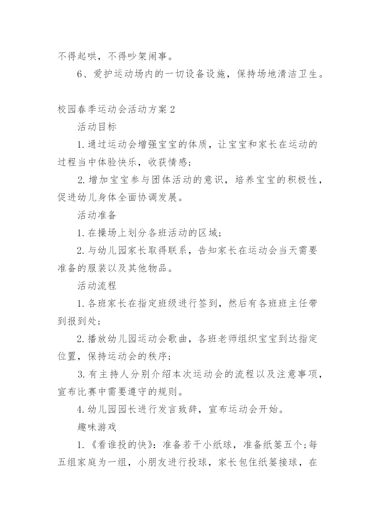 校园春季运动会活动方案为了确保工作或事情能高效地开展,时常需要预先制定方案,方案可以对一个行动明确一个大概的方向。那么问题来了,方案应该怎么写?以下是小编为大家收集的校园春季运动会活动方案,仅供参考,希望能够帮助到大家。校园春季运动会活动方案1一、指导思想:为贯彻中央七号文件,响应学生开展阳光体育活动,弘扬全民亚运的精神。进一步贯彻《学校体育工作条例》,“保证学生每天有一小时体育活动的时间”的`思想;本着“弘扬奥运精神,面向全体学生,发展体育运动,增强身体素质”的宗旨,开展丰富多彩的体育活动,活跃校园文体生活,促进学生全面发展。经学校研究决定,特举行xx小学xxx年春季田径运动会。二、时间及地点:时间:xxx年5月12日——5月13日(暂定)地点:xx小学操场三、竞赛项目:(一)比赛组别按年级进行分组,共分为六个组。(二)比赛项目1、一、二年级:50米、100米、200米、立定跳远、沙包、50米×4接力2、三——六年级:100米、200米、400米、800米、1000米、跳远、实心球、100米×4接力(三)竞赛办法:1、各比赛项目按成绩排列名次;2、每班限报运动员:4男4女,每人可报两个项目(接力除外)。(四)录取名次及记分办法:1、各项目取前六名,按7、5、4、3、2、1计分数;2、团体取年级总分第一名,同分则取得单项第一名多的班级列前,依次类推。(五)报名办法:由学校统一发放报名表,4月30日前交体育组。四、运动会开幕式(一)时间:5月12日上午(暂定)(二)入场顺序:1、国旗队(2男2女)2、校旗队(2男2女)3、年级主题方阵(三)年级主题方阵要求:1、方阵要求:每年级25人,五路纵队,每队五人(5×5方阵),方阵前安排一名引导员;2、穿戴整齐、步伐一致、精神饱满。在通过主席台时,进行一分钟左右的表演,并呼口号。3、由年级组长负责本年级方阵。(四)开幕式流程:1、宣布运动会开幕;2、方阵进场;3、升国旗、唱国歌;4、领导致开幕词;5、运动员宣誓;6、裁判员宣誓;7、开幕式结束,比赛开始。五、运动会闭幕式1、全体师生集合2、颁奖仪式3、学校领导致闭幕词4、退场六、大会纪律1、参加运动会的全体人员必须听从大会安排,服从大会指挥,不得擅自行动。2、全校师生要严格遵守大会纪律,大会期间,要准时到会,不得无故缺席和早退。3、比赛中必须尊重裁判,服从判决。发扬拼搏精神,赛出风格,赛出水平。4、裁判员要准时到达比赛场地,做好准备工作。裁决做到公平、公正、公开。5、比赛期间,各代表队的啦啦队要用文明方式加油,不得起哄,不得吵架闹事。6、爱护运动场内的一切设备设施,保持场地清洁卫生。校园春季运动会活动方案2活动目标1.通过运动会增强宝宝的体质,让宝宝和家长在运动的过程当中体验快乐,收获情感;2.增加宝宝参与团体活动的意识,培养宝宝的积极性,促进幼儿身体全面协调发展。活动准备1.在操场上划分各班活动的区域;2.与幼儿园家长取得联系,告知家长在运动会当天需要准备的服装以及其他物品。活动流程1.各班家长在指定班级进行签到,然后有各班班主任带到报到处;2.播放幼儿园运动会歌曲,各班老师组织宝宝到达指定位置,保持运动会的秩序;3.有主持人分别介绍本次运动会的流程以及注意事项,宣布比赛中需要遵守的规则。4.幼儿园园长进行发言致辞,宣布运动会开始。趣味游戏1.《看谁投的快》:准备若干小纸球,准备纸篓五个;每五组家庭为一组,小朋友进行投球,家长包住纸篓接球,在规定时间内接球最多的一组获胜。2.《安全地带》:准备圈、小红旗若干;首先准备两个圈,然后让宝宝从一个圈跳到另外一个圈,家长从后面将圈拿到前面,宝宝在进行跳;用时最短的`一组到达终点获胜。3.《小小坦克兵》:幼儿从起点在相应的轨道里行驶,前进到终点后传给家长再原路返回到,先到达起点者为胜。4.《踩高跷》:准备五个高跷、梅花桩若干;宝宝需要从起点开始出发,然后用最快的速度跑到家长的面前,家长拿到高跷往回走,用时最少的一组完成路程获胜。5.《赶小猪》:准备皮球十个、小棍十根;宝宝与家长同时从起点出发,用小棍赶皮球,将相同颜色的两只小猪赶到自己的洞里,用时最少的一组获胜。校园春季运动会活动方案3一、活动构思:本次活动围绕“大手牵小手,一起来运动”为主题,为孩子和家长创造一个良好的合作氛围,营造一种积极向上、勇于拼搏的体育精神,让孩子们在游戏中锻炼,在锻炼中成长!二、活动目标:1、通过活动让幼儿体验运动的快乐,培养幼儿活泼开朗的个性,增进亲子之情。2、在活动中,培养幼儿自信、大胆、勇于竞争的品质。3、通过形式多样的亲子游戏,增强家长与孩子之间的情感交流,更好地促进家园双沟通。三、活动时间:20xx年3月29日下午四、活动主题:“大手牵小手,一起来运动”五、活动场地:幼儿园大甬路六、活动准备:1、各班提前发