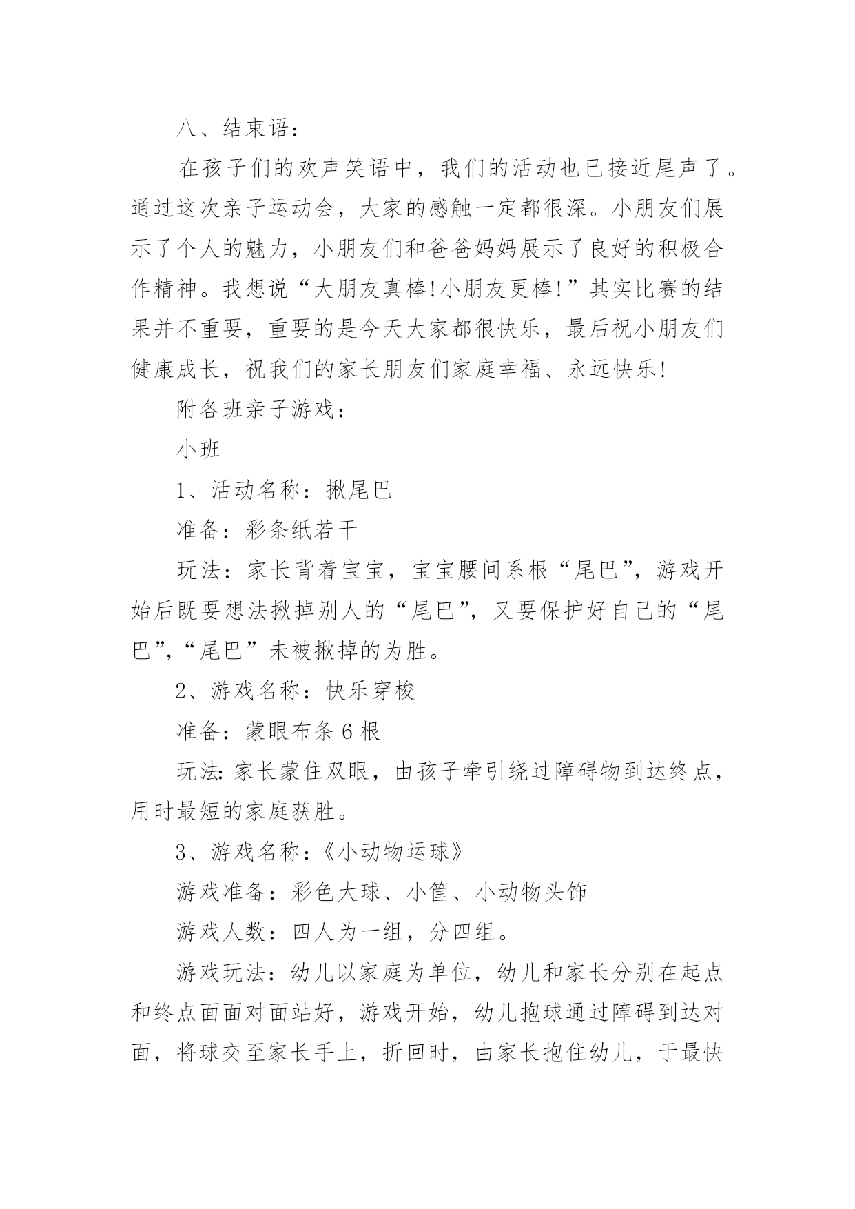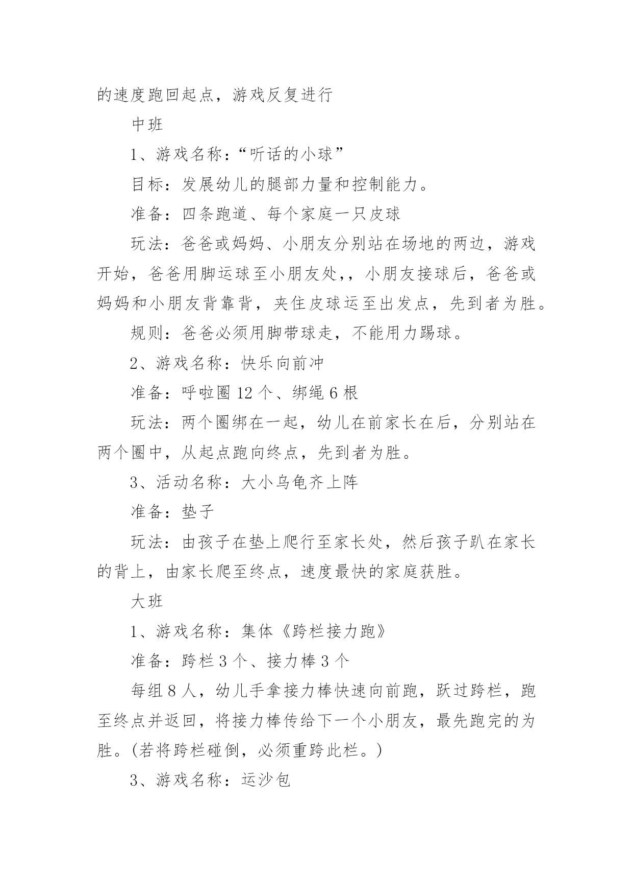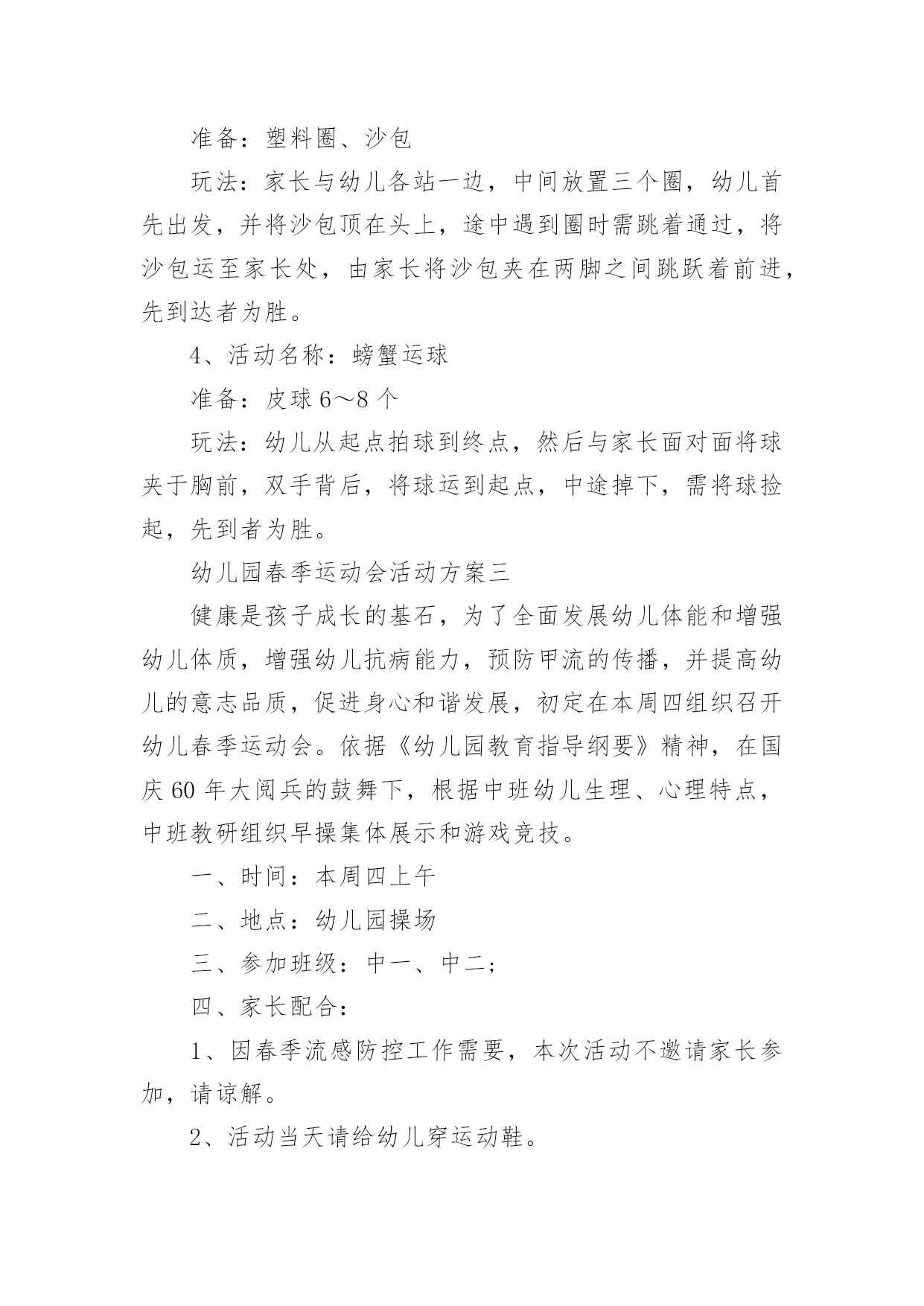校园春季运动会活动方案为了确保工作或事情能高效地开展,时常需要预先制定方案,方案可以对一个行动明确一个大概的方向。那么问题来了,方案应该怎么写?以下是小编为大家收集的校园春季运动会活动方案,仅供参考,希望能够帮助到大家。校园春季运动会活动方案1一、指导思想:为贯彻中央七号文件,响应学生开展阳光体育活动,弘扬全民亚运的精神。进一步贯彻《学校体育工作条例》,“保证学生每天有一小时体育活动的时间”的`思想;本着“弘扬奥运精神,面向全体学生,发展体育运动,增强身体素质”的宗旨,开展丰富多彩的体育活动,活跃校园文体生活,促进学生全面发展。经学校研究决定,特举行xx小学xxx年春季田径运动会。二、时间及地点:时间:xxx年5月12日——5月13日(暂定)地点:xx小学操场三、竞赛项目:(一)比赛组别按年级进行分组,共分为六个组。(二)比赛项目1、一、二年级:50米、100米、200米、立定跳远、沙包、50米×4接力2、三——六年级:100米、200米、400米、800米、1000米、跳远、实心球、100米×4接力(三)竞赛办法:1、各比赛项目按成绩排列名次;2、每班限报运动员:4男4女,每人可报两个项目(接力除外)。(四)录取名次及记分办法:1、各项目取前六名,按7、5、4、3、2、1计分数;2、团体取年级总分第一名,同分则取得单项第一名多的班级列前,依次类推。(五)报名办法:由学校统一发放报名表,4月30日前交体育组。四、运动会开幕式(一)时间:5月12日上午(暂定)(二)入场顺序:1、国旗队(2男2女)2、校旗队(2男2女)3、年级主题方阵(三)年级主题方阵要求:1、方阵要求:每年级25人,五路纵队,每队五人(5×5方阵),方阵前安排一名引导员;2、穿戴整齐、步伐一致、精神饱满。在通过主席台时,进行一分钟左右的表演,并呼口号。3、由年级组长负责本年级方阵。(四)开幕式流程:1、宣布运动会开幕;2、方阵进场;3、升国旗、唱国歌;4、领导致开幕词;5、运动员宣誓;6、裁判员宣誓;7、开幕式结束,比赛开始。五、运动会闭幕式1、全体师生集合2、颁奖仪式3、学校领导致闭幕词4、退场六、大会纪律1、参加运动会的全体人员必须听从大会安排,服从大会指挥,不得擅自行动。2、全校师生要严格遵守大会纪律,大会期间,要准时到会,不得无故缺席和早退。3、比赛中必须尊重裁判,服从判决。发扬拼搏精神,赛出风格,赛出水平。4、裁判员要准时到达比赛场地,做好准备工作。裁决做到公平、公正、公开。5、比赛期间,各代表队的啦啦队要用文明方式加油,不得起哄,不得吵架闹事。6、爱护运动场内的一切设备设施,保持场地清洁卫生。校园春季运动会活动方案2活动目标1.通过运动会增强宝宝的体质,让宝宝和家长在运动的过程当中体验快乐,收获情感;2.增加宝宝参与团体活动的意识,培养宝宝的积极性,促进幼儿身体全面协调发展。活动准备1.在操场上划分各班活动的区域;2.与幼儿园家长取得联系,告知家长在运动会当天需要准备的服装以及其他物品。活动流程1.各班家长在指定班级进行签到,然后有各班班主任带到报到处;2.播放幼儿园运动会歌曲,各班老师组织宝宝到达指定位置,保持运动会的秩序;3.有主持人分别介绍本次运动会的流程以及注意事项,宣布比赛中需要遵守的规则。4.幼儿园园长进行发言致辞,宣布运动会开始。趣味游戏1.《看谁投的快》:准备若干小纸球,准备纸篓五个;每五组家庭为一组,小朋友进行投球,家长包住纸篓接球,在规定时间内接球最多的一组获胜。2.《安全地带》:准备圈、小红旗若干;首先准备两个圈,然后让宝宝从一个圈跳到另外一个圈,家长从后面将圈拿到前面,宝宝在进行跳;用时最短的`一组到达终点获胜。3.《小小坦克兵》:幼儿从起点在相应的轨道里行驶,前进到终点后传给家长再原路返回到,先到达起点者为胜。4.《踩高跷》:准备五个高跷、梅花桩若干;宝宝需要从起点开始出发,然后用最快的速度跑到家长的面前,家长拿到高跷往回走,用时最少的一组完成路程获胜。5.《赶小猪》:准备皮球十个、小棍十根;宝宝与家长同时从起点出发,用小棍赶皮球,将相同颜色的两只小猪赶到自己的洞里,用时最少的一组获胜。校园春季运动会活动方案3一、活动构思:本次活动围绕“大手牵小手,一起来运动”为主题,为孩子和家长创造一个良好的合作氛围,营造一种积极向上、勇于拼搏的体育精神,让孩子们在游戏中锻炼,在锻炼中成长!二、活动目标:1、通过活动让幼儿体验运动的快乐,培养幼儿活泼开朗的个性,增进亲子之情。2、在活动中,培养幼儿自信、大胆、勇于竞争的品质。3、通过形式多样的亲子游戏,增强家长与孩子之间的情感交流,更好地促进家园双沟通。三、活动时间:20xx年3月29日下午四、活动主题:“大手牵小手,一起来运动”五、活动场地:幼儿园大甬路六、活动准备:1、各班提前发