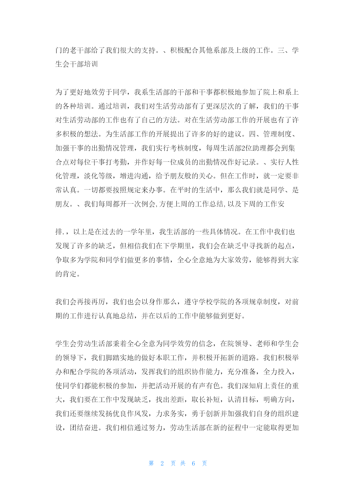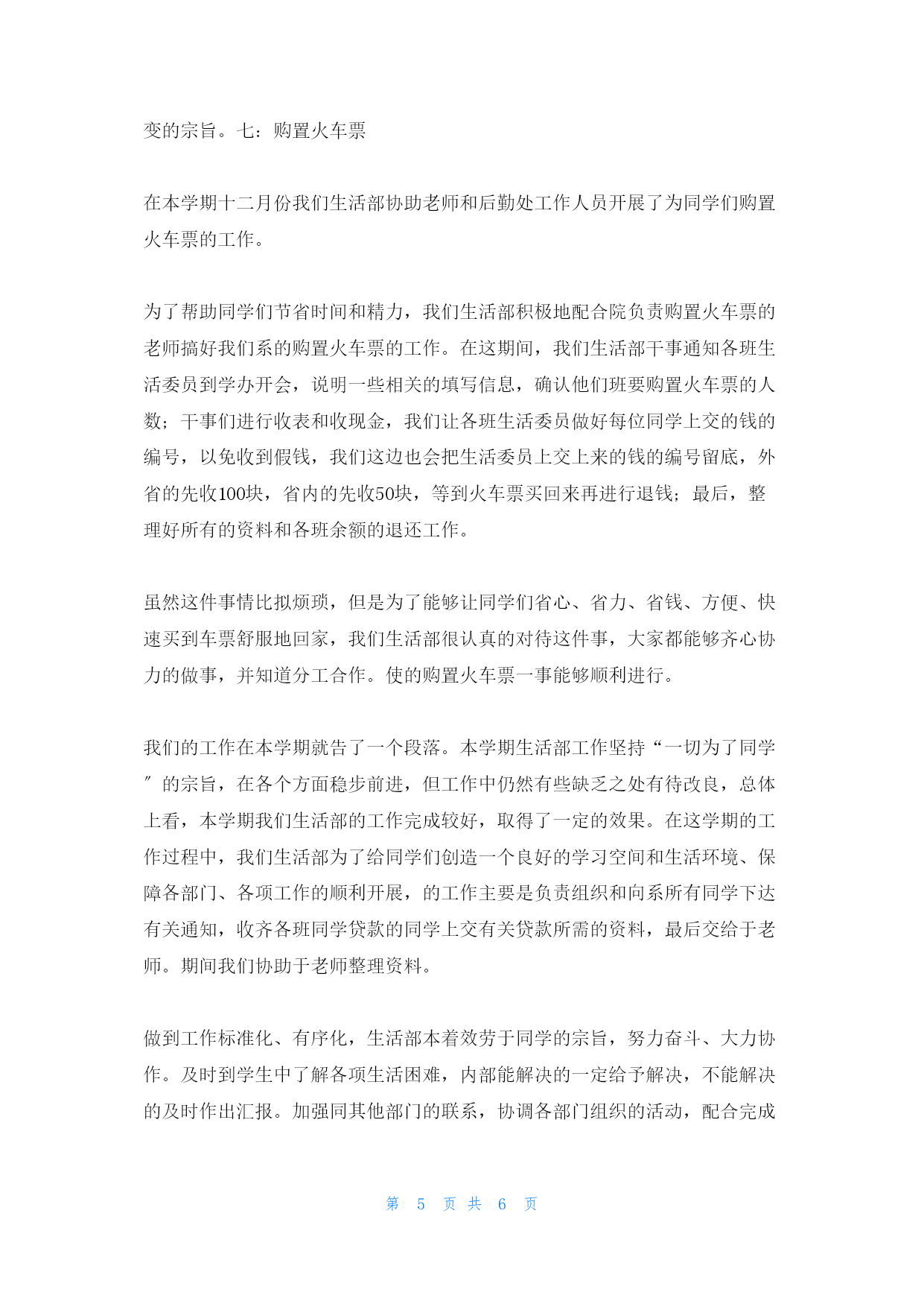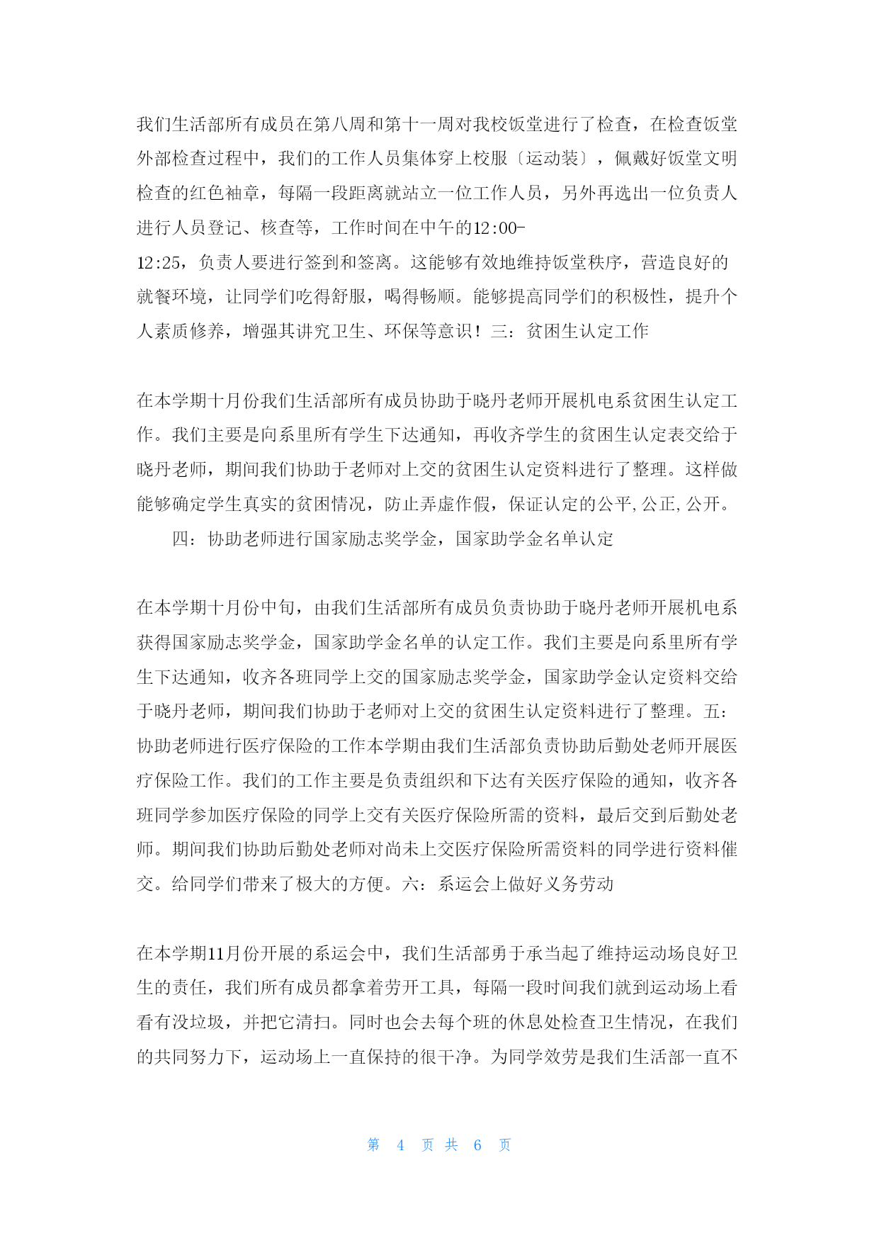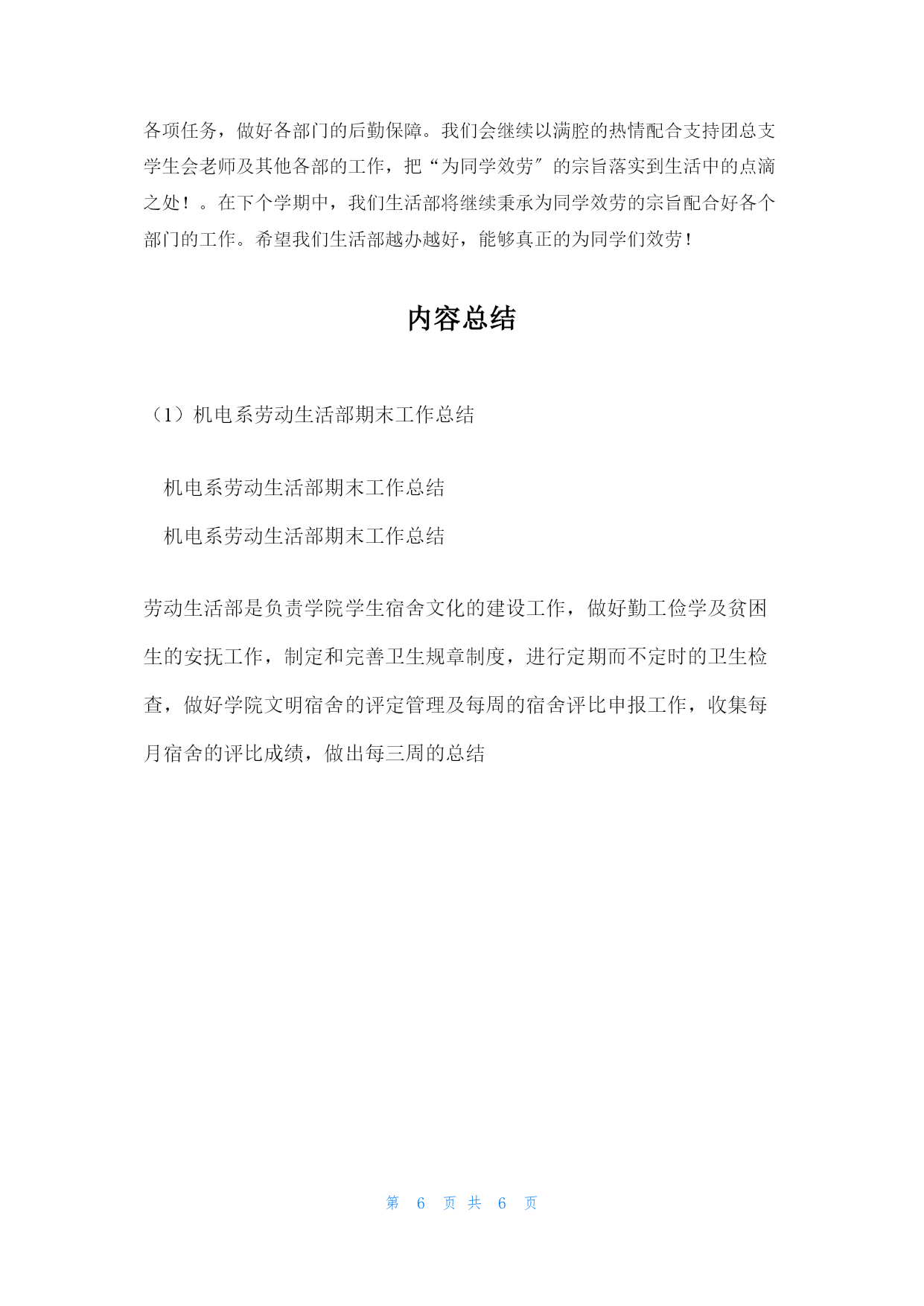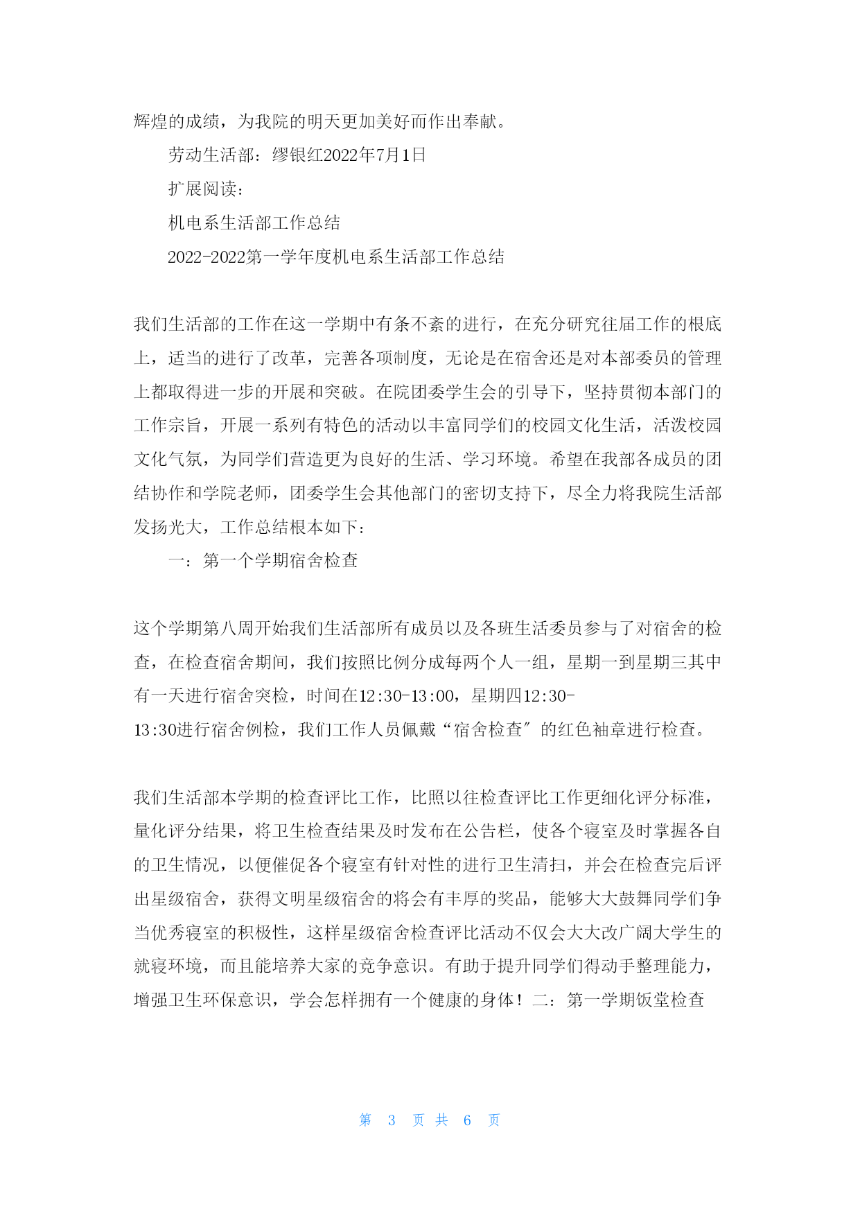 第PAGE6页共NUMPAGES6页机电系劳动生活部期末(qīmò)工作总结机电系劳动(láodòng)生活部期末工作总结机电(jīdiàn)系劳动生活部期末工作总结劳动生活部是负责学院学生宿舍文化的建设工作,做好勤工俭学及贫困生的安抚工作,制定和完善卫生规章制度,进行定期而不定时的卫生检查,做好学院文明宿舍的评定管理及每周的宿舍评比申报工作,收集每月宿舍的评比成绩,做出每三周的总结。组织实施(shíshī)校系安排的各项劳动任务,针对我院的管辖范围做好卫生负责区的分配检查落实工作。同时协助其他各部门举办活动,为学院的各项重大活动作好后勤效劳(xiàoláo)工作一、卫生检查每周有一次定期不定时的卫生检查。我们完善了学生宿舍卫生检查参考评分标准和宿舍卫生评分评比规定,在一定程度上极大地调动了我们大学生讲究卫生,争做文明大学生的积极性。在宿舍卫生检查的过程中,我们礼貌待人,将他们的缺乏提出并要求其完善。同时,向他们耐心介绍了我们部的职能,真诚地欢送他们提出珍贵意见和建议。最后,我们都及时地把学生宿舍检查结果及存在的问题向学院公布。每周定期的宿舍卫生检查,不仅加强了宿舍卫生管理力度,更好的催促了同学整理好自己的内务,使他们养成良好的生活习惯,为学习提供了良好的环境。同时保证了寝室同学和学生会之间的交流,及时发现问题并解决.这样的信息交流与工作流程确保了同学们生活环境的平安、舒适,也很好的完成了生活部应尽的使命。二、工作交流、为了加强各系部的工作交流,我们主动与院其他系学生会劳动生活部联系,交流各自的工作经验,我们相互帮助,相互学习,使两系生活部能够更好的开展工作。、主动与学生会的其它部门进行沟通,听取其他部门的方案,向他们介绍我们的工作,增强彼此之间的了解。、我部在刚开始展开工作时,由于我们中大多是大一的新生,对很多的情况都不了解。而在此时,各部门的老干部给了我们很大的支持。、积极配合其他系部及上级的工作。三、学生会干部培训为了更好地效劳于同学,我系生活部的干部和干事都积极地参加了院上和系上的各种培训。通过培训,我们对生活劳动部有了更深层次的了解,我们的干事对生活劳动部的工作也有了自己的方法。对在生活劳动部工作的开展也有了许多积极的想法。为生活部工作的开展提出了许多的好的建议。四、管理制度、加强干事的出勤情况管理,我们实行考核制度,每周生活部2位助理都会到集合点对每位干事打考勤,并作好每一位成员的出勤情况作好记录。、实行人性化管理,淡化等级,增进沟通,给予朋友般的关心。但在工作时,就一定要非常认真。一切都要按照规定来办事。在平时的生活中,那么我们就是同学、是朋友。、我们每周都开一次例会,方便上周的工作总结,以及下周的工作安排.,以上是在过去的一学年里,我生活部的一些具体情况。在工作中我们也发现了许多的缺乏,但相信我们在下学期里,我们会在缺乏中寻找新的起点,争取多为学院和同学们做更多的事情,全心全意地为大家效劳,能够得到大家的肯定。我们会再接再厉,我们也会以身作那么,遵守学校学院的各项规章制度,对前期的工作进行认真地总结,并在以后的工作中能够做到更好。学生会劳动生活部秉着全心全意为同学效劳的信念,在院领导、老师和学生会的领导下,我们脚踏实地的做好本职工作,并积极开拓新的道路。我们积极举办和配合学院的各项活动,发挥我们的组织协作能力,充分准备,全力投入,使同学们都能积极的参加,并把活动开展的有声有色。我们深知肩上责任的重大,我们要在工作中发现缺乏,找出差距,取长补短,认清目标,明确方向,我们还要继续发扬优良作风发,力求务实,勇于创新并加强我们自身的组织建设,团结奋进。我们相信通过努力,劳动生活部在新的征程中一定能取得更加辉煌的成绩,为我院的明天更加美好而作出奉献。劳动生活部:缪银红2022年7月1日扩展阅读:机电系生活部工作总结2022-2022第一学年度机电系生活部工作总结我们生活部的工作在这一学期中有条不紊的进行,在充分研究往届工作的根底上,适当的进行了改革,完善各项制度,无论是在宿舍还是对本部委员的管理上都取得进一步的开展和突破。在院团委学生会的引导下,坚持贯彻本部门的工作宗旨,开展一系列有特色的活动以丰富同学们的校园文化生活,活泼校园文化气氛,为同学们营造更为良好的生活、学习环境。希望在我部各成员的团结协作和学院老师,团委学生会其他部门的密切支持下,尽全力将我院生活部发扬光大,工作总结根本如下:一:第一个学期宿舍检查这个学期第八周开始我们生活部所有成员以及各班生活委员参与了对宿舍的检查,在检查宿舍期间,我们按照比例分成每两个人一组,星期一到星期三其中有一天进行宿舍突检,时间在12:30-13:00,星期四12:30-13:30进行宿舍例检,我们工作人员佩戴“宿舍检查〞的红色袖章进行检查。我们生