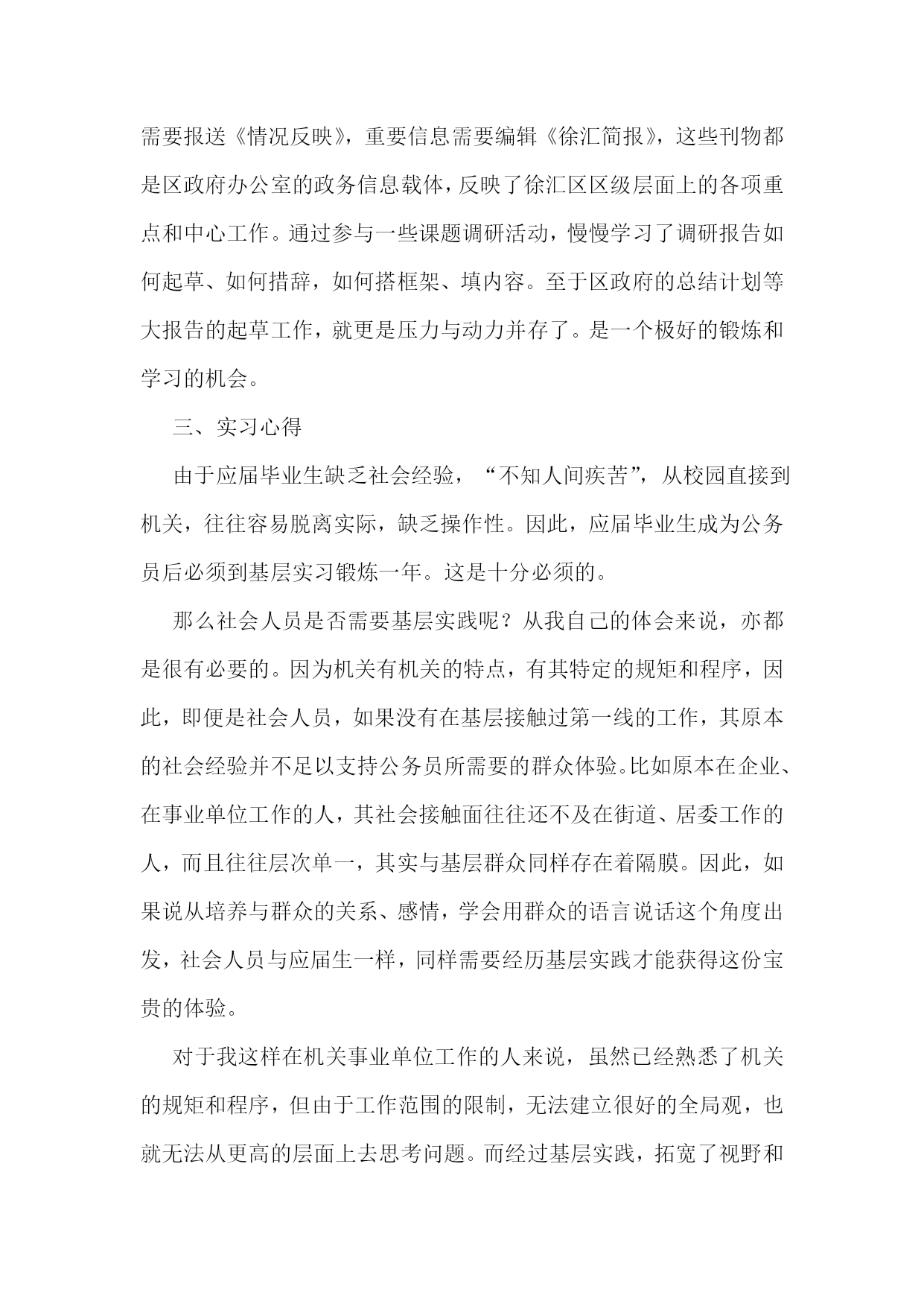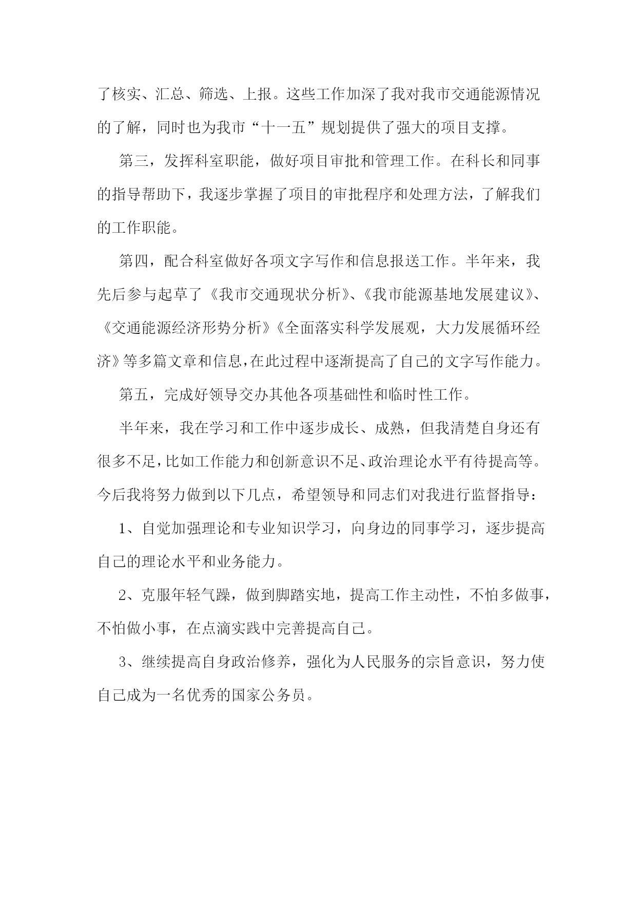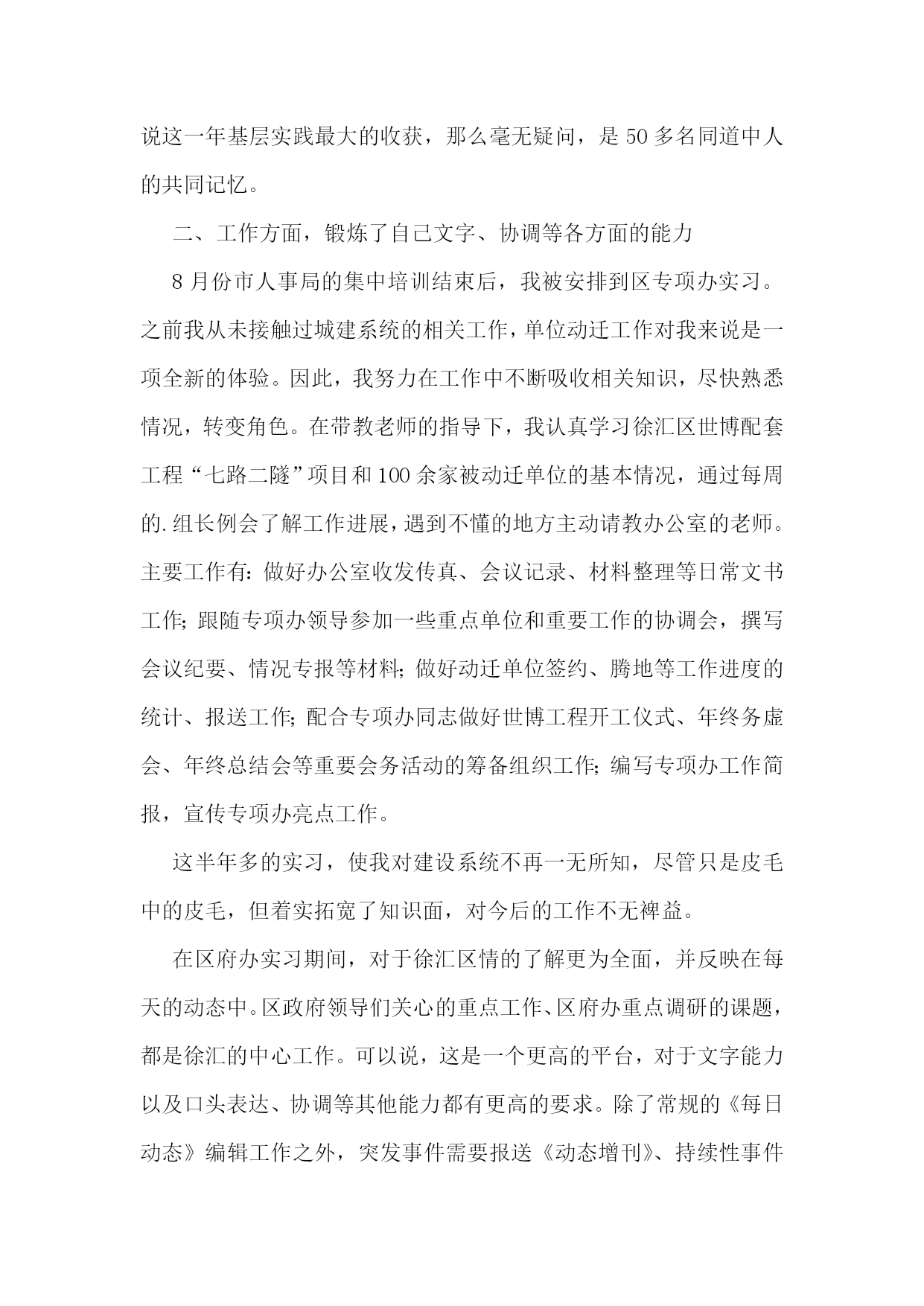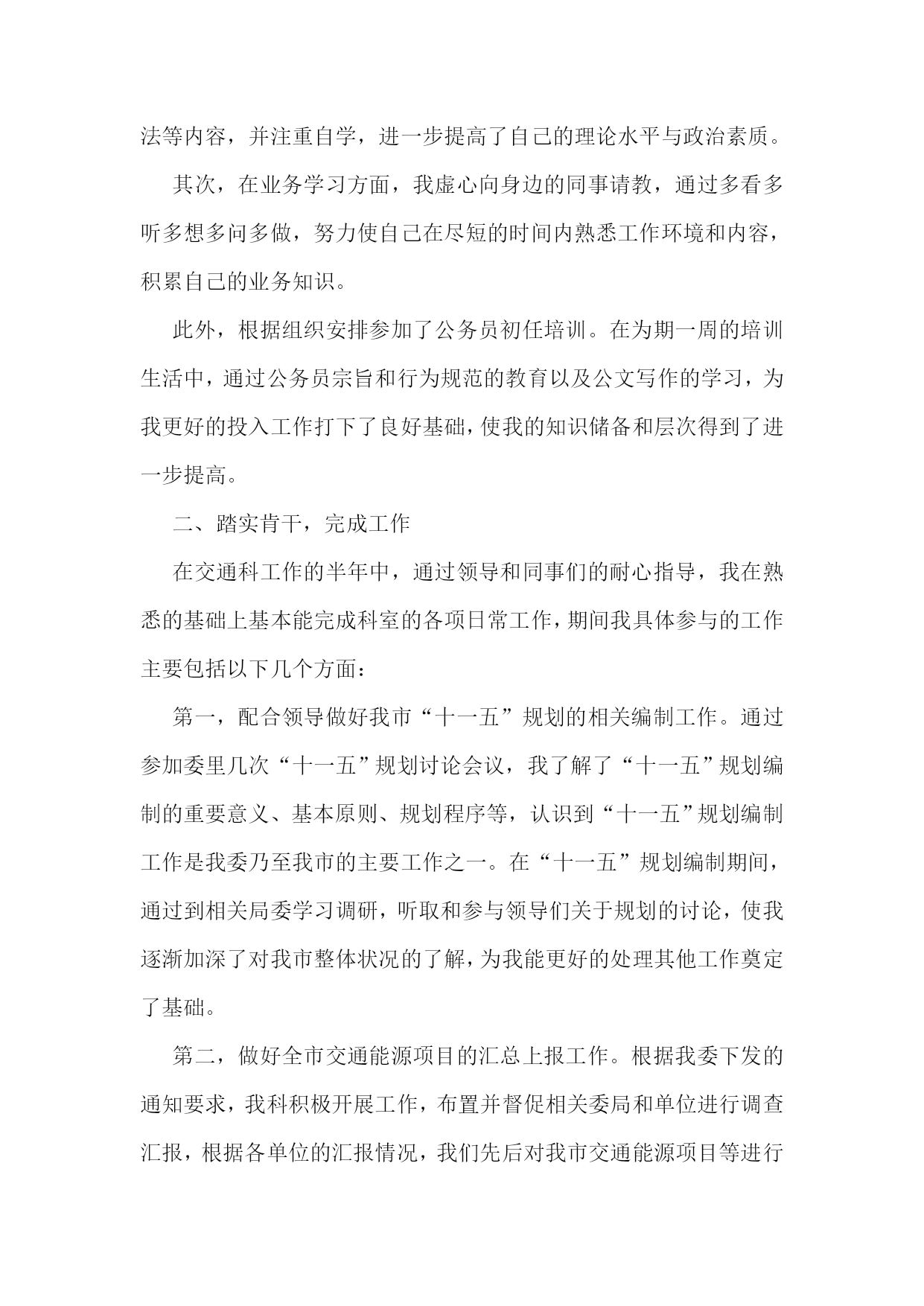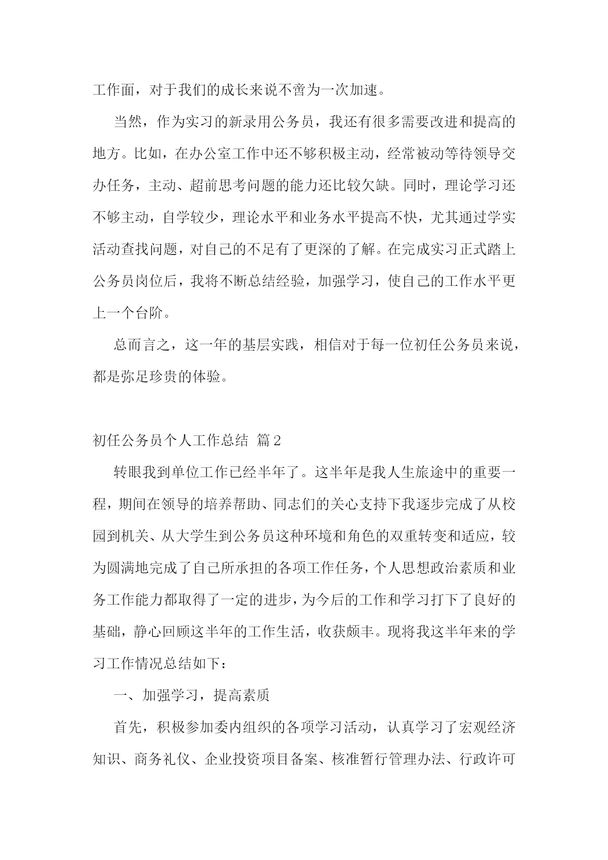 初任公务员个人工作总结初任公务员个人工作总结篇1转眼,跨入公务员行列即将满一年,实习阶段也接近尾声。虽说原本就在机关单位工作,对情况并不陌生,但是从档案局走出来,经过集中培训以及在不同单位的轮岗实习,从眼界到工作能力都有了切切实实的提高。一、思想方面,增强了作为公务员的责任感和使命感在档案局工作的两年里,刚刚完成从学生到社会人的转型,跟着科长、领导参与各项工作,依然抱着学习的心态,力求兢兢业业完成领导交办的任务,积累工作经验。成为初任公务员之后,经过去年7、8月份区里、市里的集中培训,从军训、讲座、课程、讨论等等中间,切实感受到了作为一名公务员的使命感和责任感。人民的公仆不是一句口头空话,而是我们毕生为之奋斗的准绳。在专项办实习的期间,对于徐汇的城市建设工作有了近距离的接触。马桶工程、旧区改造、动迁腾地等等不再是纸上的名词,而是一桩桩、一件件摆在我们面前需要去做的事情。民生、世博,当前最重要的两大任务,化为具体而琐碎的工作,需要我们跟着带教老师去实现。胸中激荡着责任与自豪。再说到我们这个实习公务员班级大家庭。在这一年中,建立起了堪比校园的同学情谊。在集体行动的军训、拓展中,我们的团队精神得到了充分的磨练和体现,在班级讨论和简报中,集体的智慧在闪耀着,在实习小组的活动交流中,对工作岗位的感情不断升温。如果要说这一年基层实践最大的收获,那么毫无疑问,是50多名同道中人的共同记忆。二、工作方面,锻炼了自己文字、协调等各方面的能力8月份市人事局的集中培训结束后,我被安排到区专项办实习。之前我从未接触过城建系统的相关工作,单位动迁工作对我来说是一项全新的体验。因此,我努力在工作中不断吸收相关知识,尽快熟悉情况,转变角色。在带教老师的指导下,我认真学习徐汇区世博配套工程“七路二隧”项目和100余家被动迁单位的基本情况,通过每周的.组长例会了解工作进展,遇到不懂的地方主动请教办公室的老师。主要工作有:做好办公室收发传真、会议记录、材料整理等日常文书工作;跟随专项办领导参加一些重点单位和重要工作的协调会,撰写会议纪要、情况专报等材料;做好动迁单位签约、腾地等工作进度的统计、报送工作;配合专项办同志做好世博工程开工仪式、年终务虚会、年终总结会等重要会务活动的筹备组织工作;编写专项办工作简报,宣传专项办亮点工作。这半年多的实习,使我对建设系统不再一无所知,尽管只是皮毛中的皮毛,但着实拓宽了知识面,对今后的工作不无裨益。在区府办实习期间,对于徐汇区情的了解更为全面,并反映在每天的动态中。区政府领导们关心的重点工作、区府办重点调研的课题,都是徐汇的中心工作。可以说,这是一个更高的平台,对于文字能力以及口头表达、协调等其他能力都有更高的要求。除了常规的《每日动态》编辑工作之外,突发事件需要报送《动态增刊》、持续性事件需要报送《情况反映》,重要信息需要编辑《徐汇简报》,这些刊物都是区政府办公室的政务信息载体,反映了徐汇区区级层面上的各项重点和中心工作。通过参与一些课题调研活动,慢慢学习了调研报告如何起草、如何措辞,如何搭框架、填内容。至于区政府的总结计划等大报告的起草工作,就更是压力与动力并存了。是一个极好的锻炼和学习的机会。三、实习心得由于应届毕业生缺乏社会经验,“不知人间疾苦”,从校园直接到机关,往往容易脱离实际,缺乏操作性。因此,应届毕业生成为公务员后必须到基层实习锻炼一年。这是十分必须的。那么社会人员是否需要基层实践呢?从我自己的体会来说,亦都是很有必要的。因为机关有机关的特点,有其特定的规矩和程序,因此,即便是社会人员,如果没有在基层接触过第一线的工作,其原本的社会经验并不足以支持公务员所需要的群众体验。比如原本在企业、在事业单位工作的人,其社会接触面往往还不及在街道、居委工作的人,而且往往层次单一,其实与基层群众同样存在着隔膜。因此,如果说从培养与群众的关系、感情,学会用群众的语言说话这个角度出发,社会人员与应届生一样,同样需要经历基层实践才能获得这份宝贵的体验。对于我这样在机关事业单位工作的人来说,虽然已经熟悉了机关的规矩和程序,但由于工作范围的限制,无法建立很好的全局观,也就无法从更高的层面上去思考问题。而经过基层实践,拓宽了视野和工作面,对于我们的成长来说不啻为一次加速。当然,作为实习的新录用公务员,我还有很多需要改进和提高的地方。比如,在办公室工作中还不够积极主动,经常被动等待领导交办任务,主动、超前思考问题的能力还比较欠缺。同时,理论学习还不够主动,自学较少,理论水平和业务水平提高不快,尤其通过学实活动查找问题,对自己的不足有了更深的了解。在完成实习正式踏上公务员岗位后,我将不断总结经验,加强学习,使自己的工作水平更上一个台阶。总而言之,这一年的基层实践,相信对于每一位初任公务员来说,都是弥足珍贵的体