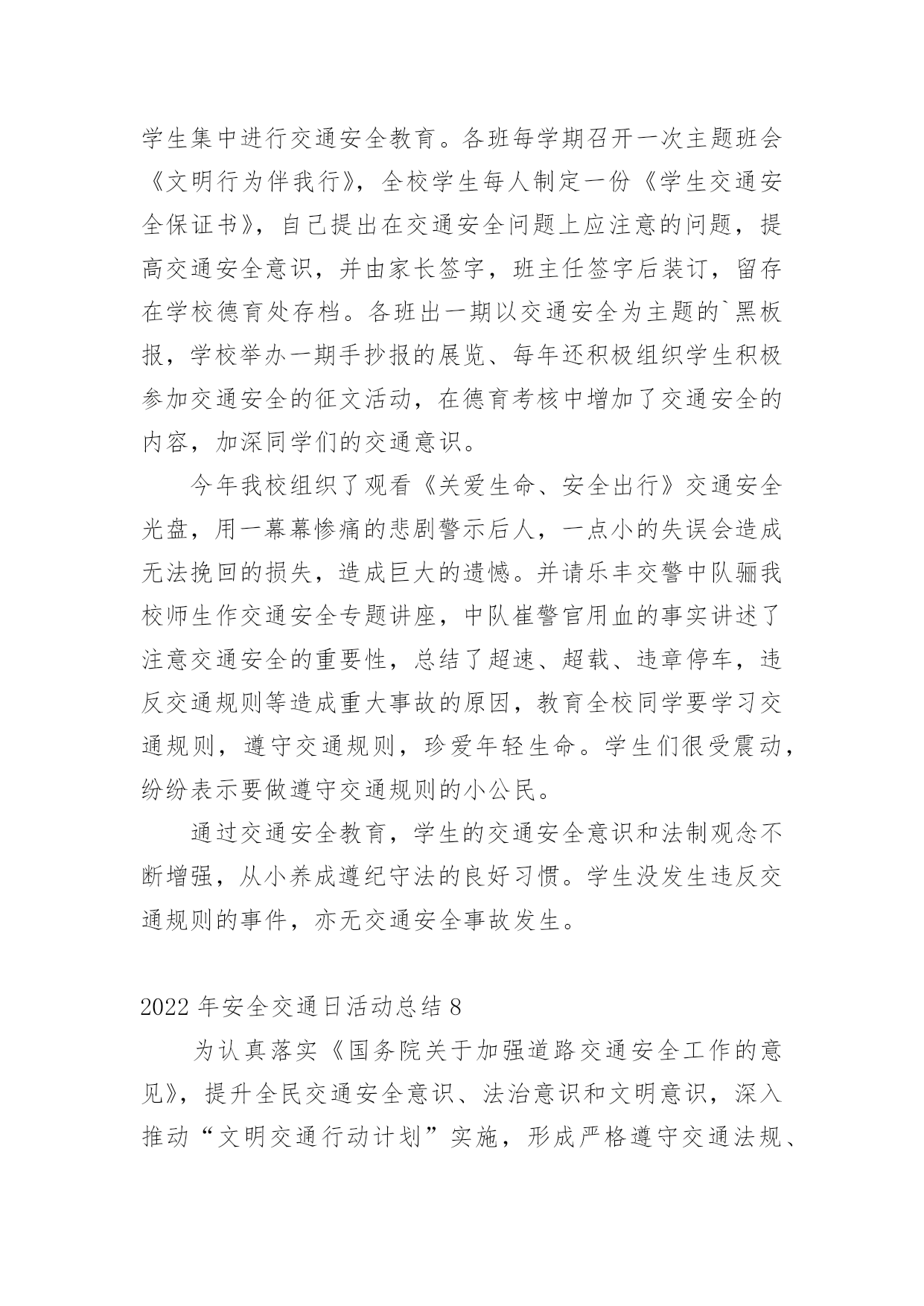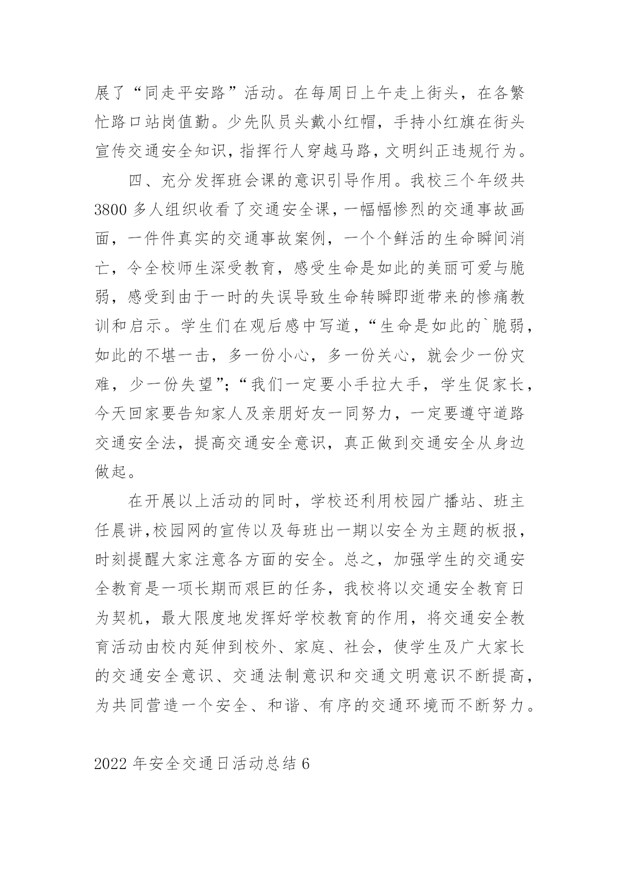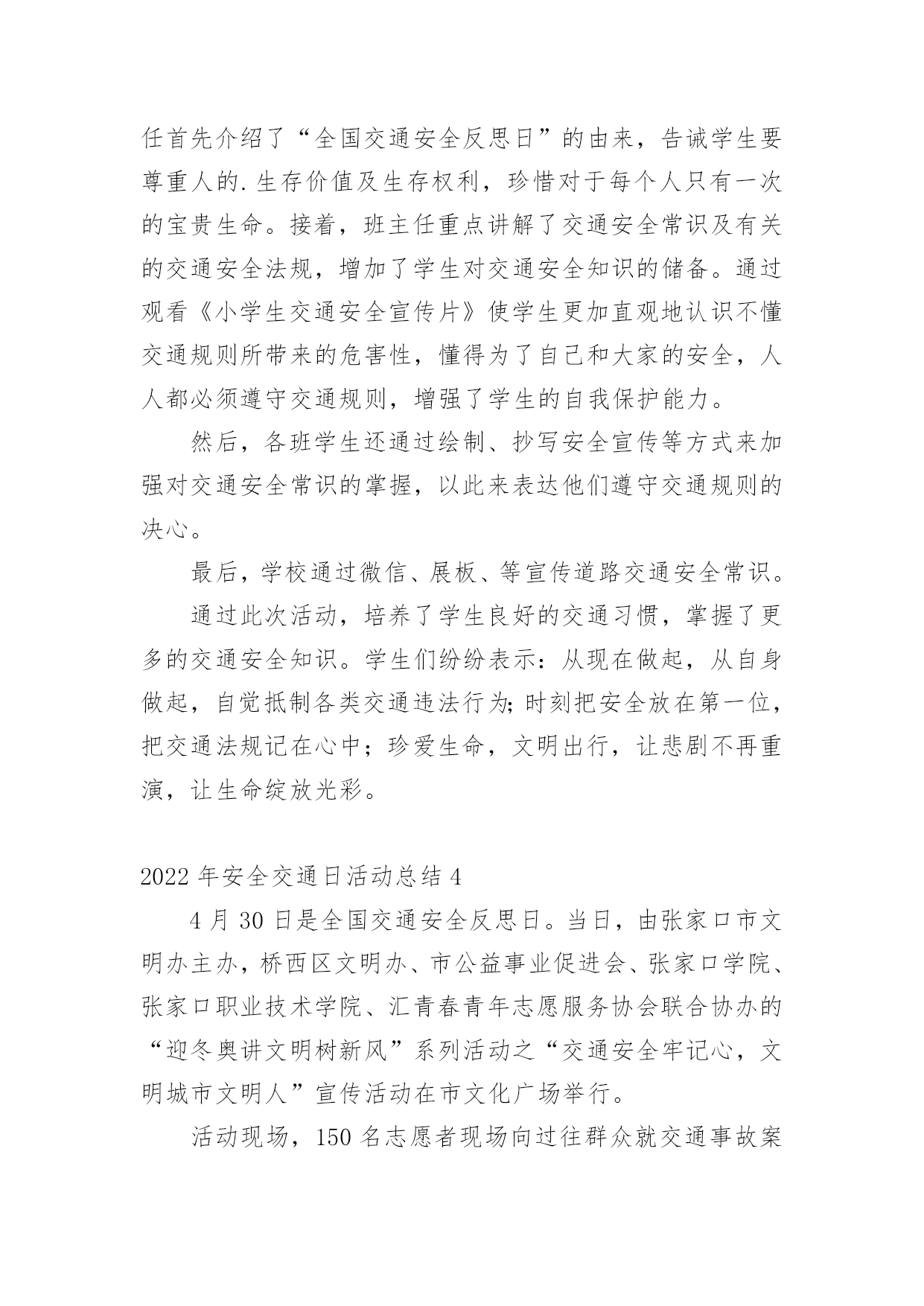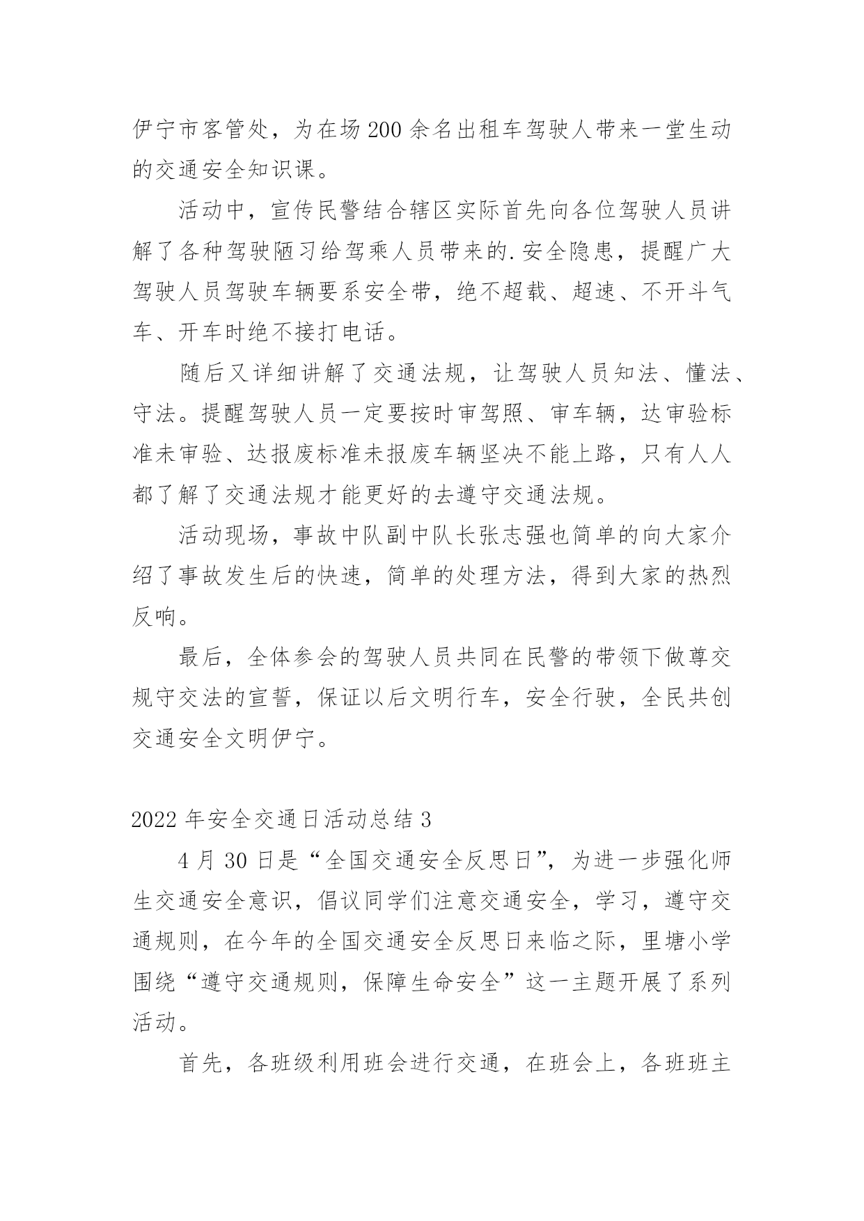 安全交通日活动总结2022年安全交通日活动总结总结是把一定阶段内的有关情况分析研究,做出有指导性的经验方法以及结论的书面材料,它能使我们及时找出错误并改正,因此我们需要回头归纳,写一份总结了。如何把总结做到重点突出呢?下面是小编为大家整理的2022年安全交通日活动总结,希望对大家有所帮助。2022年安全交通日活动总结1健康、安全、成长是每一个家庭和社会对学生关注的三大重点问题,而安全又是幼儿健康成长的重要保证。我校在长期坚持不懈地抓好安全教育工作的基础上,将今年全国交通安全日主题“遵守交通信号安全文明出行”与《关于在全市中小学校深入开展“文明交通进校园”活动的通知》文件精神相结合,我校广泛开展“遵守交通信号安全文明出行”交通安全宣传活动。一、成立交通安全教育活动领导小组详细部署了活动的具体内容,将本次活动的主题、内容贯彻到各个班级中,由各班级进一步落实到各个幼儿当中。要求大家“事事讲安全,人人懂安全,健康快乐每一天”。二、开展丰富多彩的安全教育活动。1、结合一日教学活动、游戏活动进行开展。活动有观看安全教育动画片、互动提问、现场模仿等,活动中,老师们用通俗易懂的语言为小朋友讲解了道路交通安全知识,并通过安全小故事、交通事故案例、认识交通标志等进行了讲解和提问互动。小朋友也在愉悦的动画片中学习了各种交通安全知识,进一步增强了交通安全意识,提高了自我保护能力。2、我校根据这次的安全教育活动的主题,设计了以“交通安全”为主的宣传栏,布置有关“交通安全知识”以及“交通安全儿歌”的版块,各班级利用户外活动时间带领学生观看和学习。3、利用学校各种宣传途径,如电子屏幕、学园网站、安全宣传专栏等。发动联合家长广泛关注、积极配合学校共同进行有关交通安全知识的.教育,并利用家长会分发《致学生家长的一封信》,努力构建家、校一体的安全教育。4、本周各班举行交通安全主题班会,运用交通事故案例教育学生,安全文明出行,拒绝乘坐安全隐患车辆和“黑校车。经过开展这次丰富多彩的安全教育活动,师生们得到了深刻的教育,进一步提高了安全意识。让安全教育牢记在每一位教职工的心中,让健康快乐伴随孩子成长的每一天!2022年安全交通日活动总结220xx年11月23日上午,伊宁市交警大队携手伊宁市电视台《交通全接触》栏目组开展122交通安全宣传活动走进伊宁市客管处,为在场200余名出租车驾驶人带来一堂生动的交通安全知识课。活动中,宣传民警结合辖区实际首先向各位驾驶人员讲解了各种驾驶陋习给驾乘人员带来的.安全隐患,提醒广大驾驶人员驾驶车辆要系安全带,绝不超载、超速、不开斗气车、开车时绝不接打电话。随后又详细讲解了交通法规,让驾驶人员知法、懂法、守法。提醒驾驶人员一定要按时审驾照、审车辆,达审验标准未审验、达报废标准未报废车辆坚决不能上路,只有人人都了解了交通法规才能更好的去遵守交通法规。活动现场,事故中队副中队长张志强也简单的向大家介绍了事故发生后的快速,简单的处理方法,得到大家的热烈反响。最后,全体参会的驾驶人员共同在民警的带领下做尊交规守交法的宣誓,保证以后文明行车,安全行驶,全民共创交通安全文明伊宁。2022年安全交通日活动总结34月30日是“全国交通安全反思日”,为进一步强化师生交通安全意识,倡议同学们注意交通安全,学习,遵守交通规则,在今年的全国交通安全反思日来临之际,里塘小学围绕“遵守交通规则,保障生命安全”这一主题开展了系列活动。首先,各班级利用班会进行交通,在班会上,各班班主任首先介绍了“全国交通安全反思日”的由来,告诫学生要尊重人的.生存价值及生存权利,珍惜对于每个人只有一次的宝贵生命。接着,班主任重点讲解了交通安全常识及有关的交通安全法规,增加了学生对交通安全知识的储备。通过观看《小学生交通安全宣传片》使学生更加直观地认识不懂交通规则所带来的危害性,懂得为了自己和大家的安全,人人都必须遵守交通规则,增强了学生的自我保护能力。然后,各班学生还通过绘制、抄写安全宣传等方式来加强对交通安全常识的掌握,以此来表达他们遵守交通规则的决心。最后,学校通过微信、展板、等宣传道路交通安全常识。通过此次活动,培养了学生良好的交通习惯,掌握了更多的交通安全知识。学生们纷纷表示:从现在做起,从自身做起,自觉抵制各类交通违法行为;时刻把安全放在第一位,把交通法规记在心中;珍爱生命,文明出行,让悲剧不再重演,让生命绽放光彩。2022年安全交通日活动总结44月30日是全国交通安全反思日。当日,由张家口市文明办主办,桥西区文明办、市公益事业促进会、张家口学院、张家口职业技术学院、汇青春青年志愿服务协会联合协办的“迎冬奥讲文明树新风”系列活动之“交通安全牢记心,文明城市文明人”宣传活动在市文化广场举行。活动现场,150名志愿者现场向过往群众就交通事故案例进行展示和讲解,对交通事故造成的