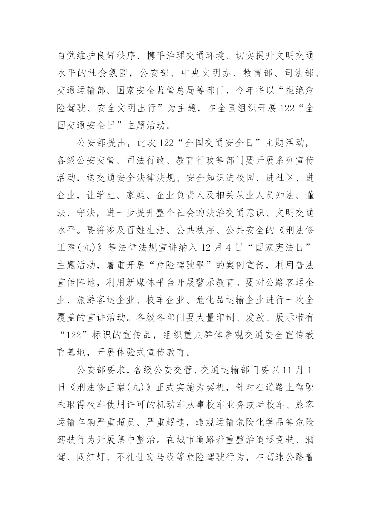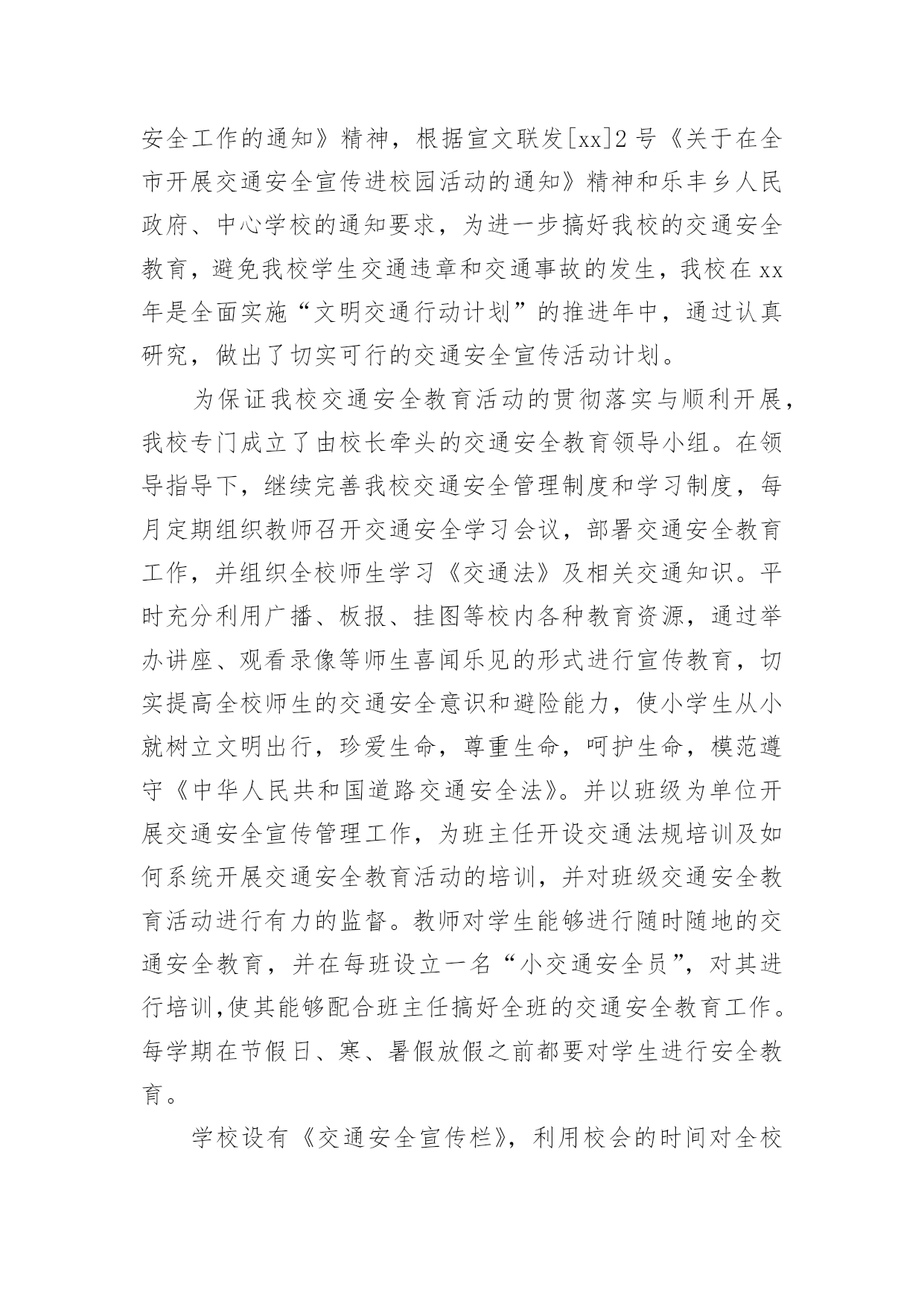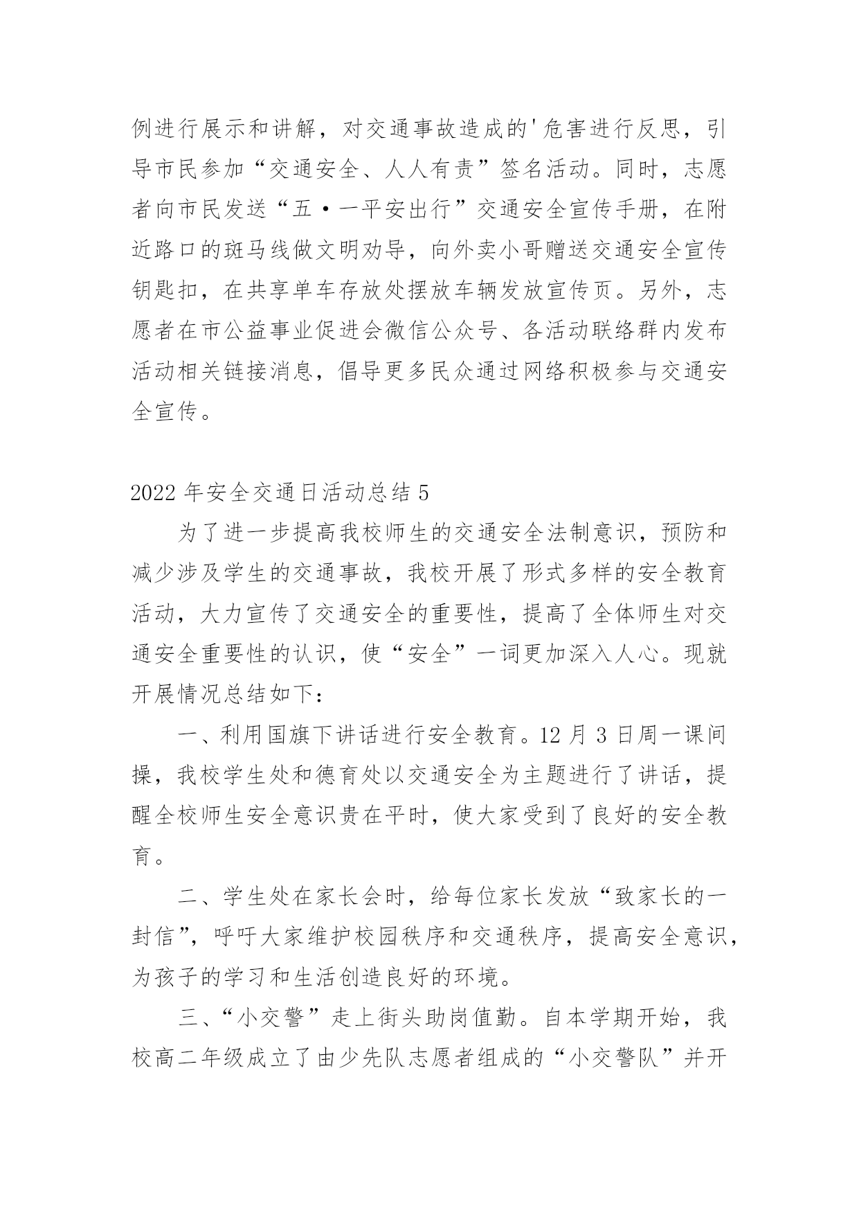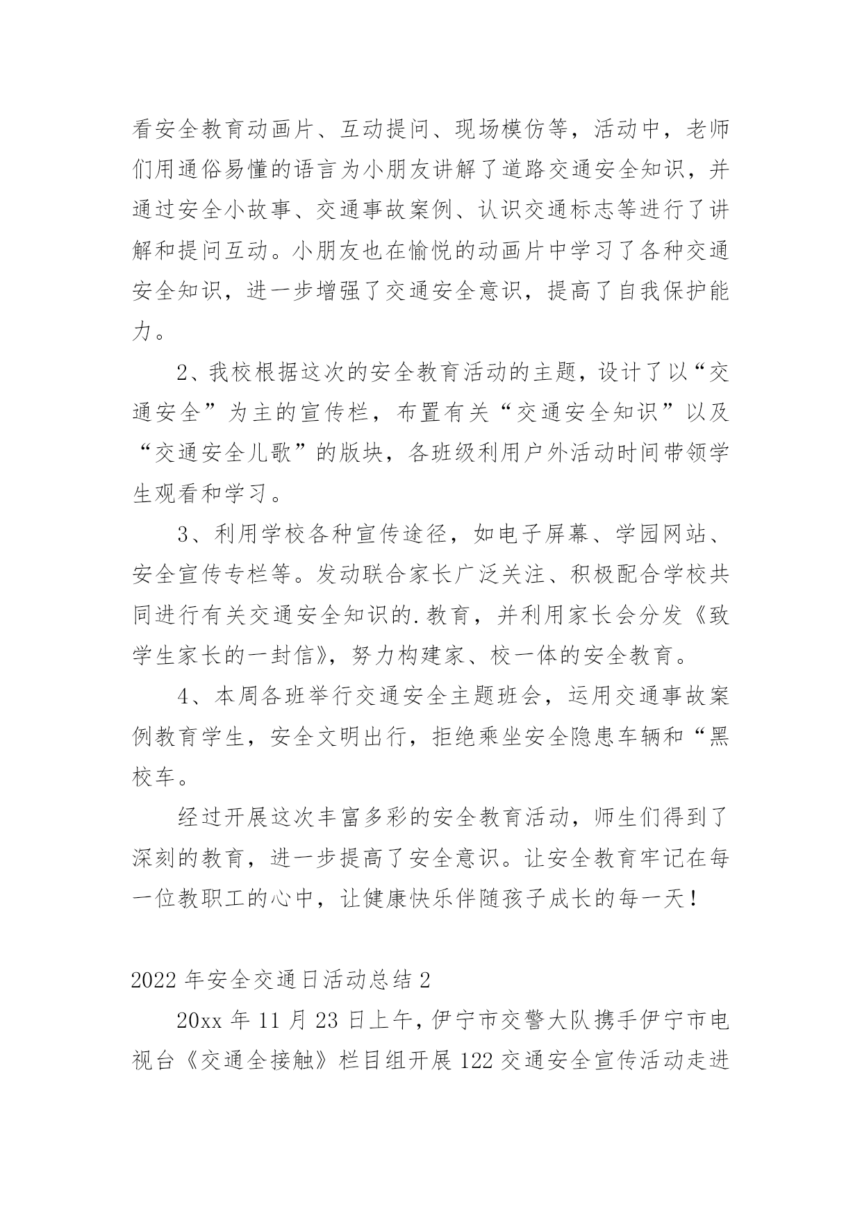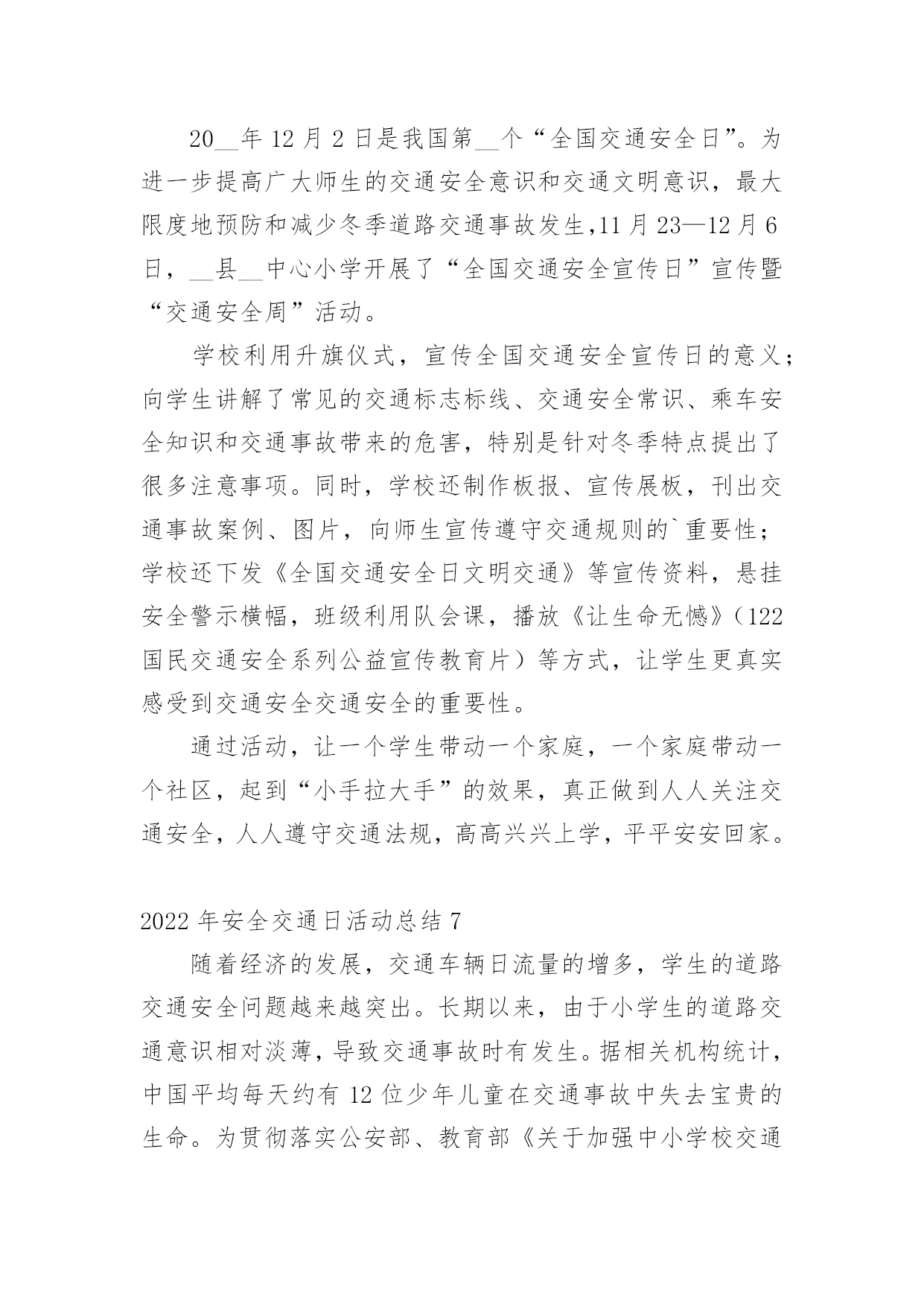 安全交通日活动总结2022年安全交通日活动总结总结是把一定阶段内的有关情况分析研究,做出有指导性的经验方法以及结论的书面材料,它能使我们及时找出错误并改正,因此我们需要回头归纳,写一份总结了。如何把总结做到重点突出呢?下面是小编为大家整理的2022年安全交通日活动总结,希望对大家有所帮助。2022年安全交通日活动总结1健康、安全、成长是每一个家庭和社会对学生关注的三大重点问题,而安全又是幼儿健康成长的重要保证。我校在长期坚持不懈地抓好安全教育工作的基础上,将今年全国交通安全日主题“遵守交通信号安全文明出行”与《关于在全市中小学校深入开展“文明交通进校园”活动的通知》文件精神相结合,我校广泛开展“遵守交通信号安全文明出行”交通安全宣传活动。一、成立交通安全教育活动领导小组详细部署了活动的具体内容,将本次活动的主题、内容贯彻到各个班级中,由各班级进一步落实到各个幼儿当中。要求大家“事事讲安全,人人懂安全,健康快乐每一天”。二、开展丰富多彩的安全教育活动。1、结合一日教学活动、游戏活动进行开展。活动有观看安全教育动画片、互动提问、现场模仿等,活动中,老师们用通俗易懂的语言为小朋友讲解了道路交通安全知识,并通过安全小故事、交通事故案例、认识交通标志等进行了讲解和提问互动。小朋友也在愉悦的动画片中学习了各种交通安全知识,进一步增强了交通安全意识,提高了自我保护能力。2、我校根据这次的安全教育活动的主题,设计了以“交通安全”为主的宣传栏,布置有关“交通安全知识”以及“交通安全儿歌”的版块,各班级利用户外活动时间带领学生观看和学习。3、利用学校各种宣传途径,如电子屏幕、学园网站、安全宣传专栏等。发动联合家长广泛关注、积极配合学校共同进行有关交通安全知识的.教育,并利用家长会分发《致学生家长的一封信》,努力构建家、校一体的安全教育。4、本周各班举行交通安全主题班会,运用交通事故案例教育学生,安全文明出行,拒绝乘坐安全隐患车辆和“黑校车。经过开展这次丰富多彩的安全教育活动,师生们得到了深刻的教育,进一步提高了安全意识。让安全教育牢记在每一位教职工的心中,让健康快乐伴随孩子成长的每一天!2022年安全交通日活动总结220xx年11月23日上午,伊宁市交警大队携手伊宁市电视台《交通全接触》栏目组开展122交通安全宣传活动走进伊宁市客管处,为在场200余名出租车驾驶人带来一堂生动的交通安全知识课。活动中,宣传民警结合辖区实际首先向各位驾驶人员讲解了各种驾驶陋习给驾乘人员带来的.安全隐患,提醒广大驾驶人员驾驶车辆要系安全带,绝不超载、超速、不开斗气车、开车时绝不接打电话。随后又详细讲解了交通法规,让驾驶人员知法、懂法、守法。提醒驾驶人员一定要按时审驾照、审车辆,达审验标准未审验、达报废标准未报废车辆坚决不能上路,只有人人都了解了交通法规才能更好的去遵守交通法规。活动现场,事故中队副中队长张志强也简单的向大家介绍了事故发生后的快速,简单的处理方法,得到大家的热烈反响。最后,全体参会的驾驶人员共同在民警的带领下做尊交规守交法的宣誓,保证以后文明行车,安全行驶,全民共创交通安全文明伊宁。2022年安全交通日活动总结34月30日是“全国交通安全反思日”,为进一步强化师生交通安全意识,倡议同学们注意交通安全,学习,遵守交通规则,在今年的全国交通安全反思日来临之际,里塘小学围绕“遵守交通规则,保障生命安全”这一主题开展了系列活动。首先,各班级利用班会进行交通,在班会上,各班班主任首先介绍了“全国交通安全反思日”的由来,告诫学生要尊重人的.生存价值及生存权利,珍惜对于每个人只有一次的宝贵生命。接着,班主任重点讲解了交通安全常识及有关的交通安全法规,增加了学生对交通安全知识的储备。通过观看《小学生交通安全宣传片》使学生更加直观地认识不懂交通规则所带来的危害性,懂得为了自己和大家的安全,人人都必须遵守交通规则,增强了学生的自我保护能力。然后,各班学生还通过绘制、抄写安全宣传等方式来加强对交通安全常识的掌握,以此来表达他们遵守交通规则的决心。最后,学校通过微信、展板、等宣传道路交通安全常识。通过此次活动,培养了学生良好的交通习惯,掌握了更多的交通安全知识。学生们纷纷表示:从现在做起,从自身做起,自觉抵制各类交通违法行为;时刻把安全放在第一位,把交通法规记在心中;珍爱生命,文明出行,让悲剧不再重演,让生命绽放光彩。2022年安全交通日活动总结44月30日是全国交通安全反思日。当日,由张家口市文明办主办,桥西区文明办、市公益事业促进会、张家口学院、张家口职业技术学院、汇青春青年志愿服务协会联合协办的“迎冬奥讲文明树新风”系列活动之“交通安全牢记心,文明城市文明人”宣传活动在市文化广场举行。活动现场,150名志愿者现场向过往群众就交通事故案例进行展示和讲解,对交通事故造成的