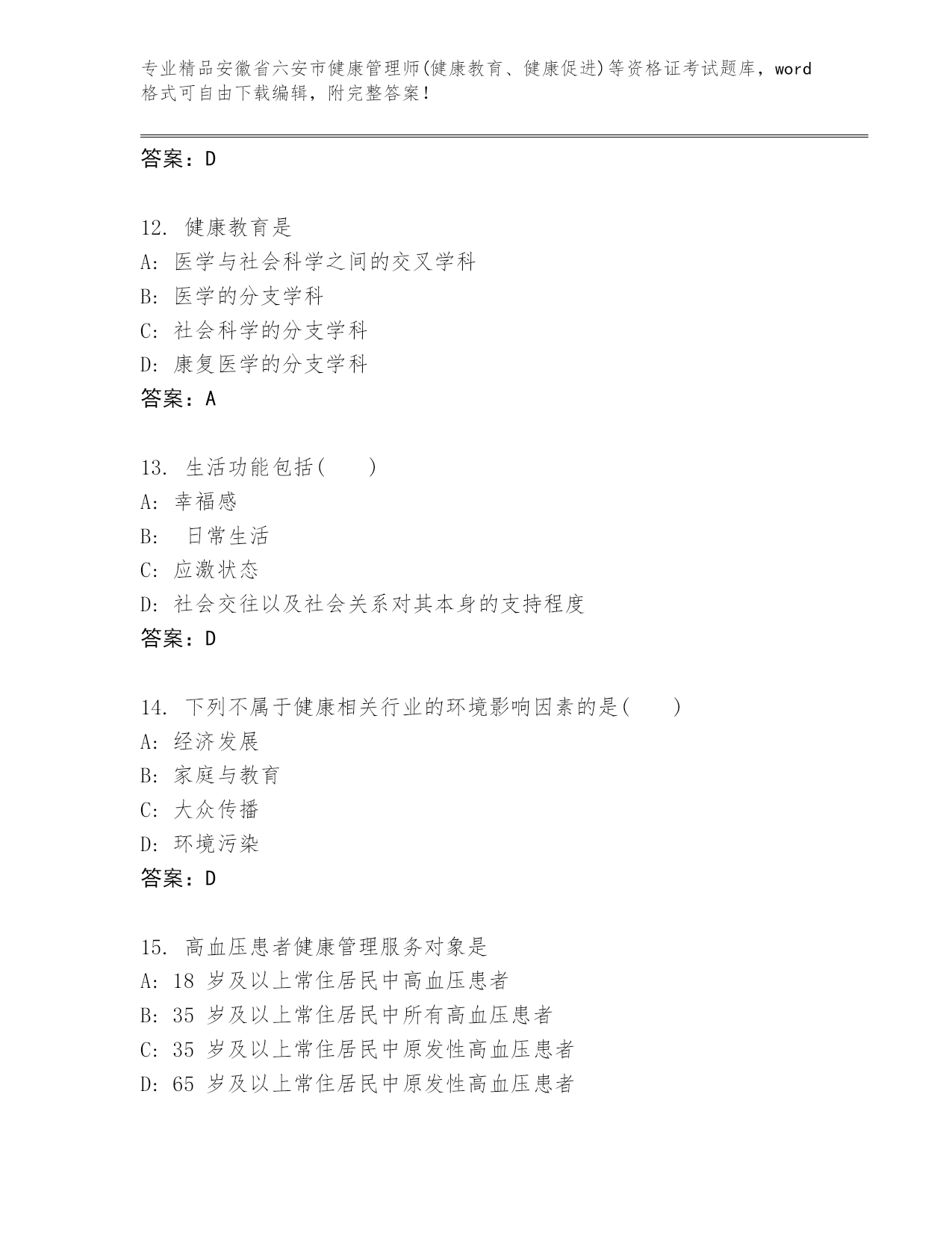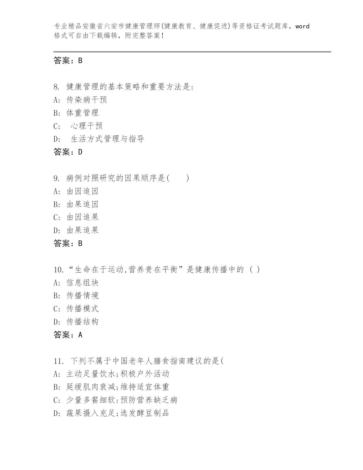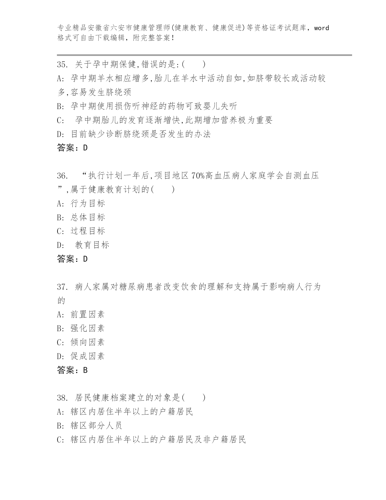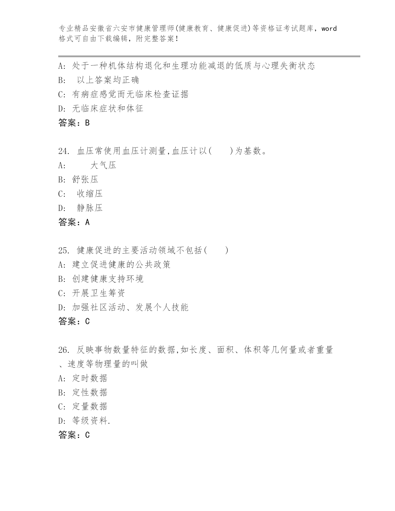 安徽省六安市健康管理师(健康教育、健康促进)等资格证考试通关秘籍题库精品附答案