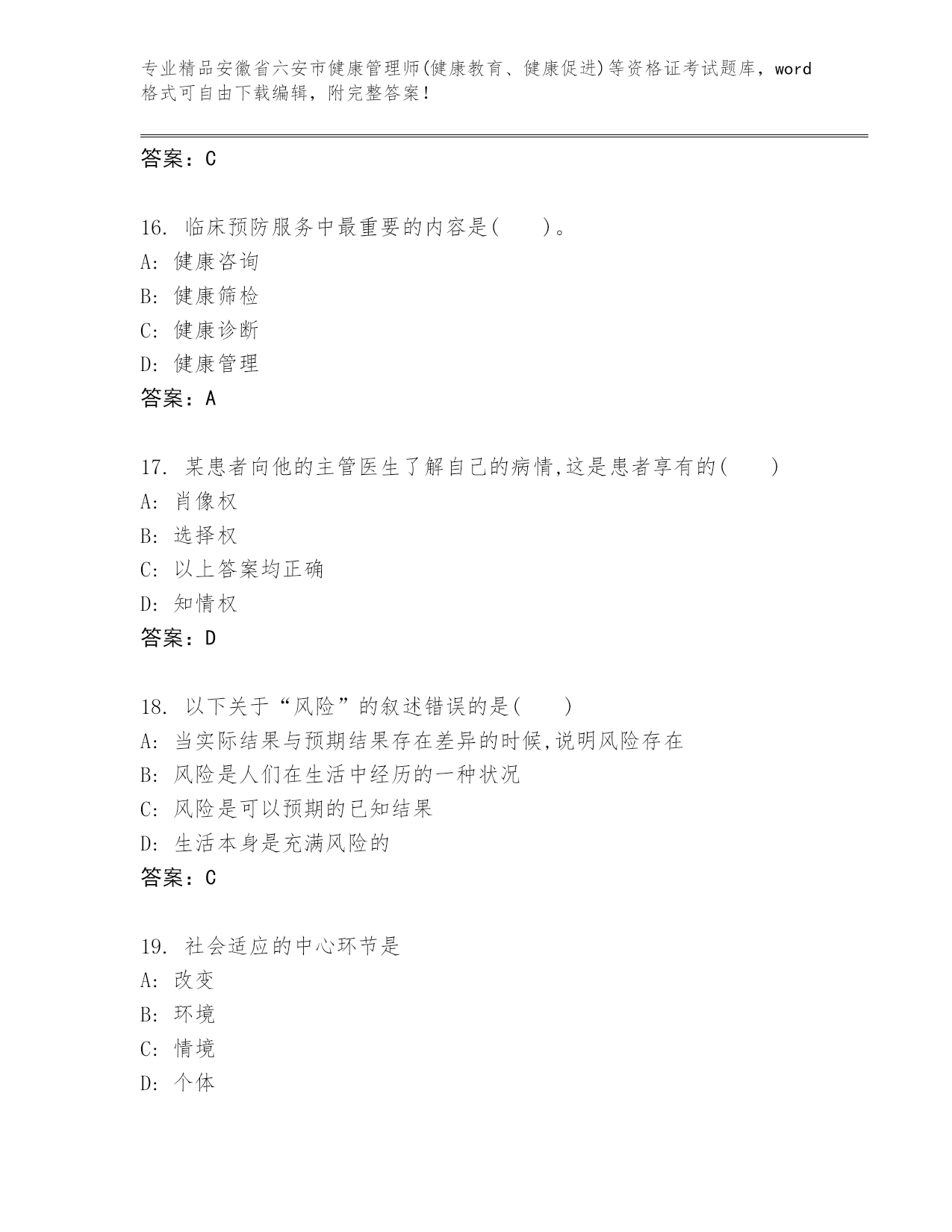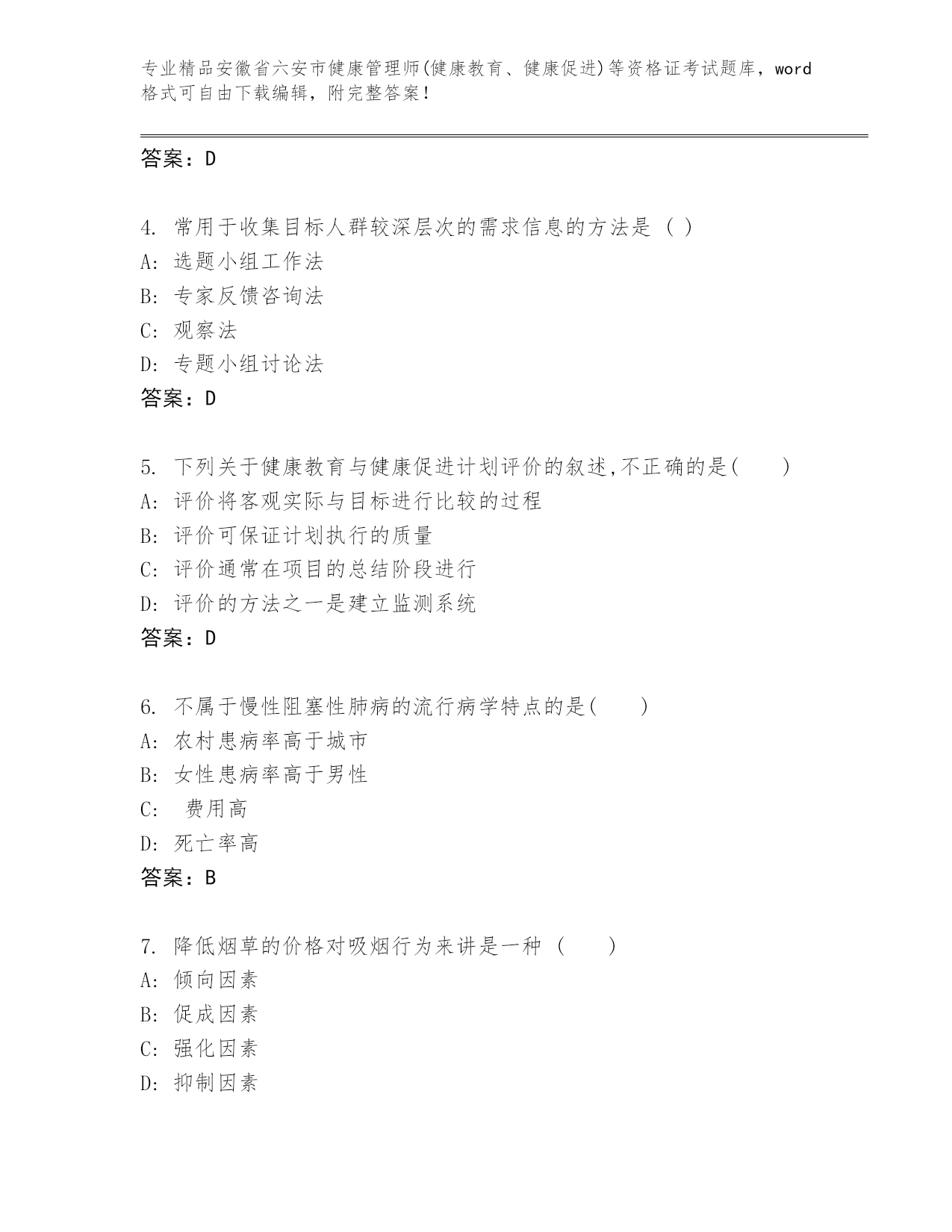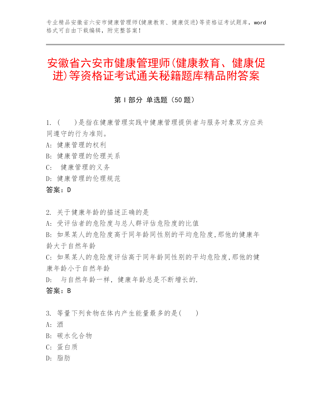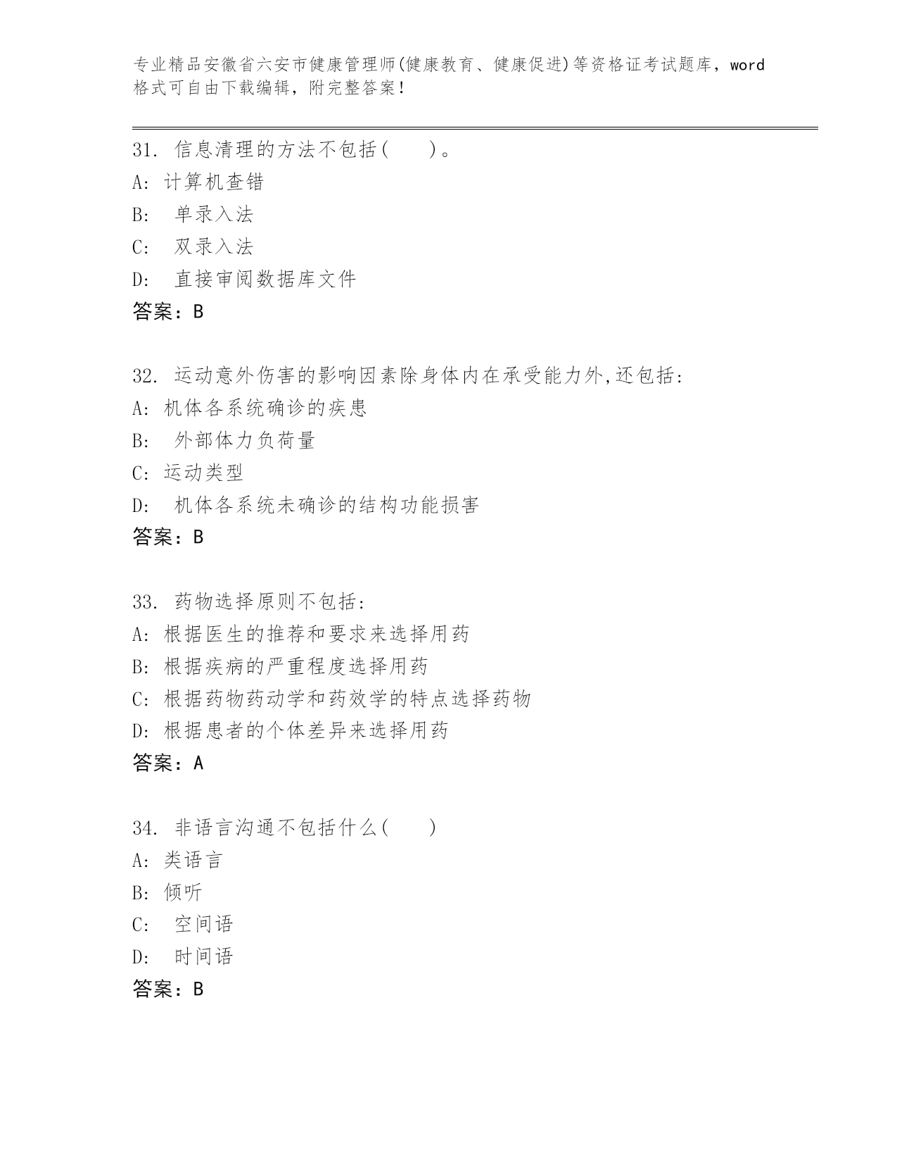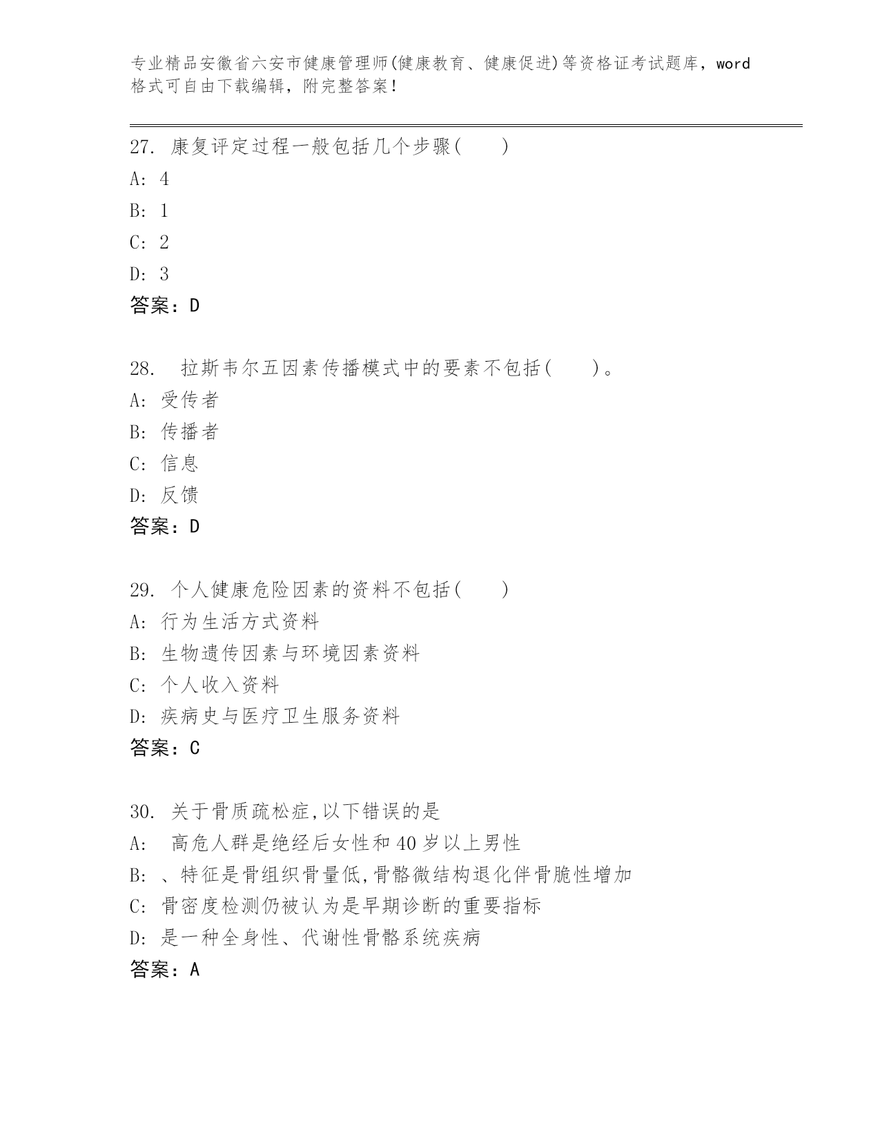 安徽省六安市健康管理师(健康教育、健康促进)等资格证考试通关秘籍题库精品附答案