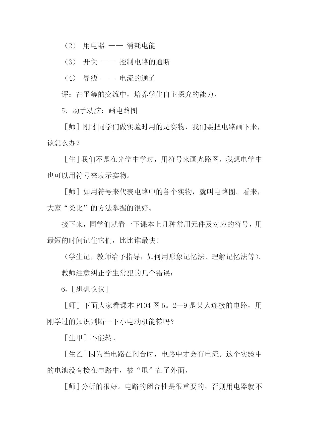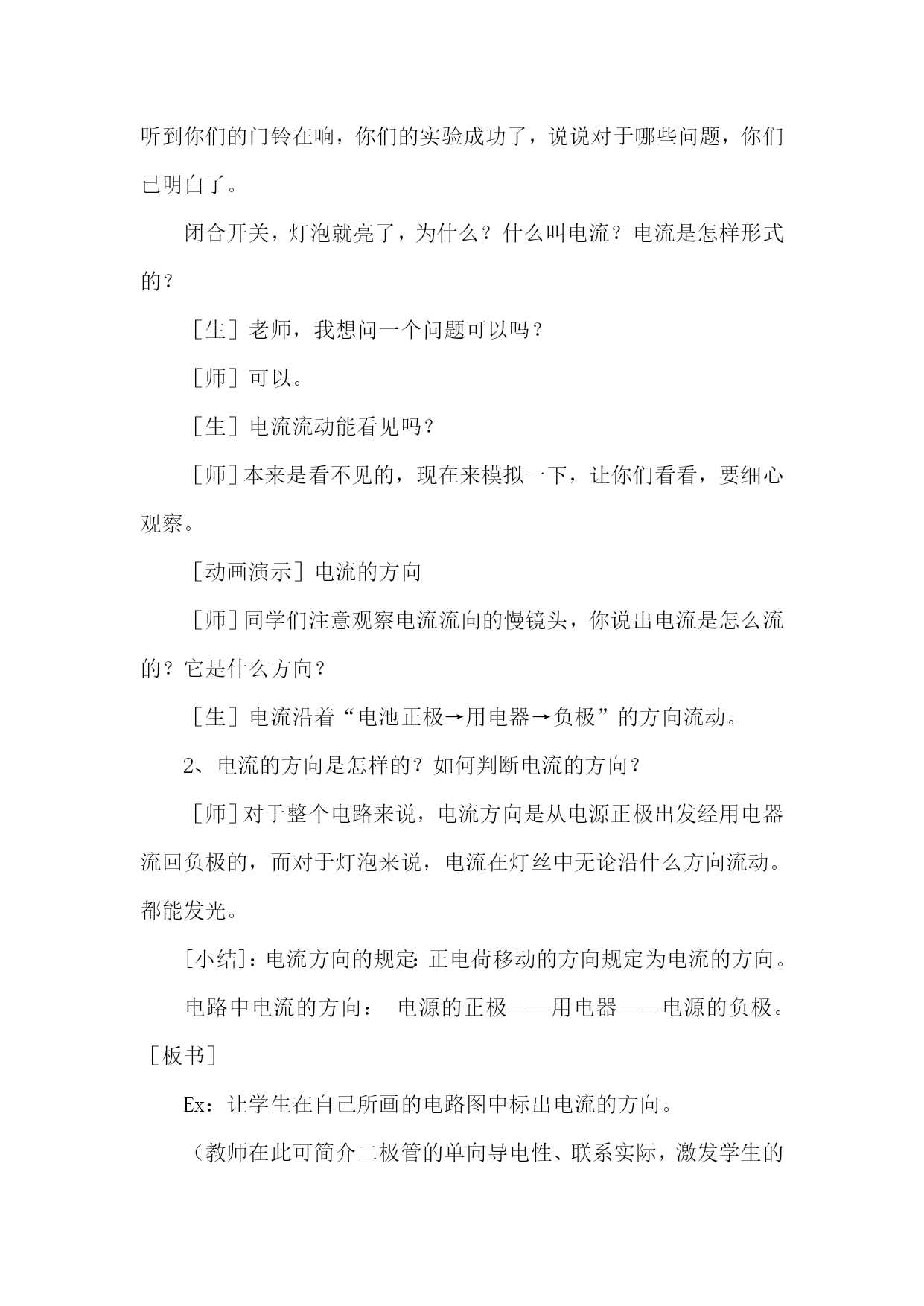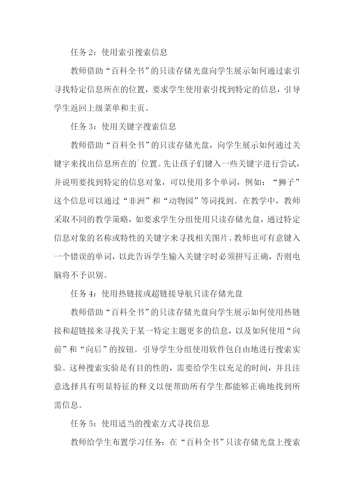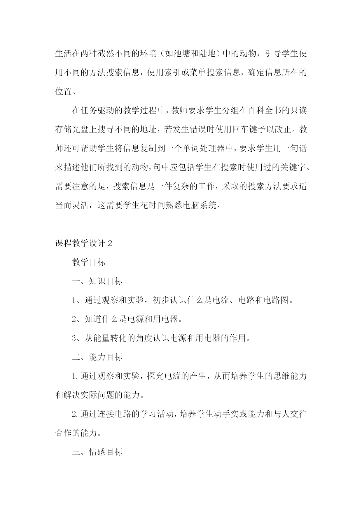 课程教学设计课程教学设计1单元简介在《寻找信息》教学单元中,学生将初步了解用于存储大量信息的只读光盘,学习怎样搜索保存在只读光盘上的信息,掌握如何使用菜单、索引和关键字来搜索信息、采集数据。当学生为了某一特定目的使用只读光盘或利用网络搜索采集信息资源时,他们将会自觉地运用本单元的学习内容。教学资源教学过程需要借助一个可以通过菜单、索引和关键字进行百科知识搜索的只读存储光盘。学习目标对大多数学生而言,能够学会在只读存储光盘上搜索到所需的信息;对一些接受新知识较为迟缓的学生而言,能够大致了解只读存储光盘的搜索是“如何导航”的理论原理;对一些能迅速接受新事物的学生而言,能够选择最为恰当的方法进行有目的的搜索。教学过程任务1:使用菜单搜索信息教师借助“百科全书”的只读存储光盘向学生展示如何通过菜单来寻找特定信息所在的位置,引导学生理解菜单中的项目提示可以被选择来搜索一些特定的信息,例如:选择“岸边”项目可以搜索到有关“螃蟹”的信息。任务2:使用索引搜索信息教师借助“百科全书”的只读存储光盘向学生展示如何通过索引寻找特定信息所在的位置,要求学生使用索引找到特定的信息,引导学生返回上级菜单和主页。任务3:使用关键字搜索信息教师借助“百科全书”的只读存储光盘,向学生展示如何通过关键字来找出信息所在的`位置。先让孩子们键入一些关键字进行尝试,并说明要找到特定的信息对象,可以使用多个单词,例如:“狮子”这个信息可以通过“非洲”和“动物园”等词找到。在教学中,教师采取不同的教学策略,如要求学生分组使用只读存储光盘,通过特定信息对象的名称或特性的关键字来寻找相关图片。教师也可有意键入一个错误的单词,以此告诉学生输入关键字时必须拼写正确,否则电脑将不予识别。任务4:使用热链接或超链接导航只读存储光盘教师借助“百科全书”的只读存储光盘向学生展示如何使用热链接和超链接来寻找关于某一特定主题更多的信息,以及如何使用“向前”和“向后”的按钮。引导学生分组使用软件包自由地进行搜索实验。这种搜索实验是有目的性的,需要给学生以充足的时间,并且注意选择具有明显特征的释义以便帮助所有学生都能够正确地找到所需信息。任务5:使用适当的搜索方式寻找信息教师给学生布置学习任务:在“百科全书”只读存储光盘上搜索生活在两种截然不同的环境(如池塘和陆地)中的动物,引导学生使用不同的方法搜索信息,使用索引或菜单搜索信息,确定信息所在的位置。在任务驱动的教学过程中,教师要求学生分组在百科全书的只读存储光盘上搜寻不同的地址,若发生错误时使用回车键予以改正。教师还可帮助学生将信息复制到一个单词处理器中,要求学生用一句话来描述他们所找到的动物,句中应包括学生在搜索时使用过的关键字。需要注意的是,搜索信息是一件复杂的工作,采取的搜索方法要求适当而灵活,这需要学生花时间熟悉电脑系统。课程教学设计2教学目标一、知识目标1、通过观察和实验,初步认识什么是电流、电路和电路图。2、知道什么是电源和用电器。3、从能量转化的角度认识电源和用电器的作用。二、能力目标1.通过观察和实验,探究电流的产生,从而培养学生的思维能力和解决实际问题的能力。2.通过连接电路的学习活动,培养学生动手实践能力和与人交往合作的能力。三、情感目标1、通过连接电路的实验,激发学生的学习兴趣,培养他们善于思考、勤于动手的学习习惯。2、通过“根据电路画电路图”的训练,使学生不怕重复,不厌其烦,从而形成坚韧不拔的意志。●教学重点通过观察和实验,探究电路中形成电流的条件,从而得出电路的基本组成。●教学难点组织、指导学生在连接电路过程中,认真观察和分析,并能得出正确结论。●教学方法探究法、实验法、讨论法。●教学用具干电池、小灯泡、导线、开关、小电动机、门铃、发光二极管、实物投影仪。●课时安排:1课时●教学过程一、创设情境,引入新课[师]我们生活在电的世界里,也许你会感到它很神秘。为什么收音机通上电就能放出音乐?为什么电视机通上电就能看到影像?为什么电饭锅通上电就能做熟米饭?为什么电风扇通上电就能转动?电就在我们身边,对于电,同学们想知道些什么呢?[生甲]我觉得电挺神秘的,电是从哪儿来的呢?[生乙]为什么一按开关,电灯就会亮了呢?[生丙]要小灯泡发光,应由哪几部分组成的?[生丁]哪些物体可以导电呢?[生戊]水的流动能看见,那么,电流的流动能看得见吗?[师]同学们提的问题很好。实际上,这些看似复杂的东西都是由最简单的电路组合而成的,让我们走进这个“电的世界”看一看,试一试,现在就来分组,每两个人一组,自己动手,不要错过机会。不过在动手实验之前,要带着问题去做。知道吗?二、新课教学1、想想做做:怎样连接电路?[师]请大家看一看,你们的台面有什么