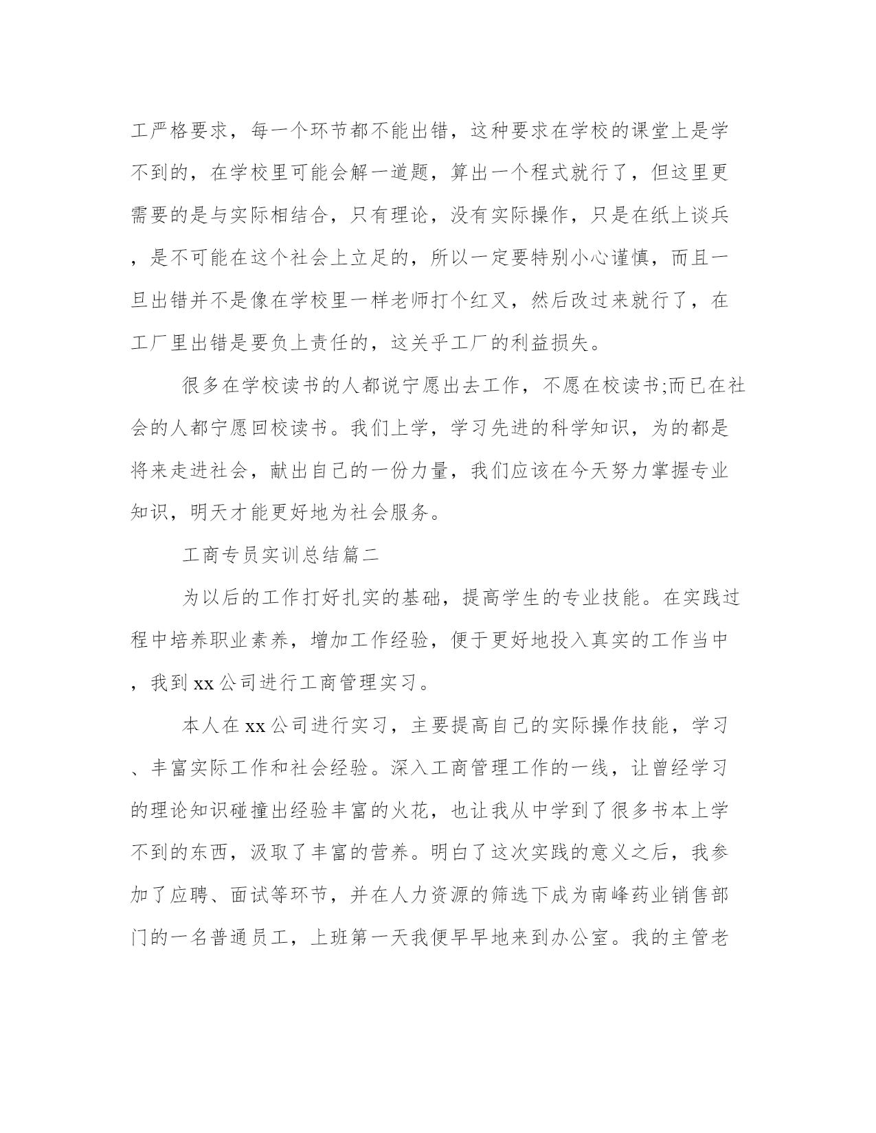 工商专员实训总结(5篇)总结是在一段时间内对学习和工作生活等表现加以总结和概括的一种书面材料,它可以促使我们思考,我想我们需要写一份总结了吧。那么我们该如何写一篇较为完美的总结呢?那么下面我就给大家讲一讲总结怎么写才比较好,我们一起来看一看吧。工商专员实训总结篇一我所实习的ab公司,隶属于某工程公司。该工程公司是以水工、市政、工民建、路桥、安装工程等为主要经营项目的国有大型骨干建筑施工企业,具有航务工程总承包一级、房建二级、市政、水利水电三级、地基与基础一级、钢结构一级、机电设备安装一级、商砼与预制构件二级、勘察设计甲级、计量二级、建筑材料试验甲级等资质。公司现有正式职工3000余名,先进的工程技术装备千余台;拥有2.6万平方米的高层办公楼和30多万平方米的生产基地;近700米的工作船码头和4万余平方米的海域,固定资产达3亿多元。公司于19xx年通过了iso9002质量体系认证;19xx年通过了iso10012国际标准认证,取得了"计量保证确认合格证书";20xx年通过了iso9001国际质量管理体系认证。回顾我的实习生活,感触是很深的,收获是丰硕的。实习中,我采用了看、问等方式,对ab公司的日常管理工作的开展有了进一步的了解,分析了公司业务开展的特点、方式、运作规律。同时,对公司的服务品牌、企业使命以及企业精神都有了初步了解。自从走进了大学,就业问题就似乎总是围绕在我们的身边,成了说不完的话题。在现今社会,招聘会上的大字报都总写着"有经验者优先",可还在校园里面的我们这班学子社会经验又会拥有多少呢?为了拓展自身的知识面,扩大与社会的接触面,增加个人在社会竞争中的经验,锻炼和提高自己的能力,以便在以后毕业后能真正真正走入社会,能够适应国内外的经济形势的变化,并且能够在生活和工作中很好地处理各方面的问题,我走进了一家民营企业,开始了我这个假期的社会实践。实践,就是把我们在学校所学的理论知识,运用到客观实际中去,使自己所学的理论知识有用武之地。只学不实践,那么所学的就等于零。理论应该与实践相结合。另一方面,实践可为以后找工作打基础。通过这段时间的实习,学到一些在学校里学不到的东西。因为环境的不同,接触的人与事不同,从中所学的东西自然就不一样了。要学会从实践中学习,从学习中实践。而且在中国的经济飞速发展,又加入了世贸,国内外经济日趋变化,每天都不断有新的东西涌现,在拥有了越来越多的机会的同时,也有了更多的挑战,前天才刚学到的知识可能在今天就已经被淘汰掉了,中国的经济越和外面接轨,对于人才的要求就会越来越高,我们不只要学好学校里所学到的知识,还要不断从生活中,实践中学其他知识,不断地从各方面武装自已,才能在竞争中突出自已,表现自已。在实践的这段时间内,我帮忙接电话,复印资料,整理文件,开发票等,感受着工作的氛围,这些都是在学校里无法感受到的,而且很多时候,我不时要做一些工作以外的事情,有时要做一些清洁的工作,在学校里也许有老师分配说今天做些什么,明天做些什么,但在这里,不一定有人会告诉你这些,你必须自觉地去做,而且要尽自已的努力做到最好,一件工作的效率就会得到别人不同的评价。在学校,只有学习的氛围,毕竟学校是学习的场所,每一个学生都在为取得更高的成绩而努力。而这里是工作的场所,每个人都会为了获得更多的报酬而努力,无论是学习还是工作,都存在着竞争,在竞争中就要不断学习别人先进的地方,也要不断学习别人怎样做人,以提高自已的能力!记得老师曾经说过大学是一个小社会,但我总觉得校园里总少不了那份纯真,那份真诚,尽管是大学高校,学生还终归保持着学生的身份。而走进企业,接触各种各样的客户、同事、上司等等,关系复杂,但我得去面对我从未面对过的一切。记得在我校举行的招聘会上所反映出来的其中一个问题是,学生的实际操作能力与在校理论学习有一定的差距。在这次实践中,这一点我感受很深。在学校,理论的学习很多,而且是多方面的,几乎是面面俱到;而在实际工作中,可能会遇到书本上没学到的,又可能是书本上的知识一点都用不上的情况。或许工作中运用到的只是很简单的问题,只要套公式似的就能完成一项任务。有时候我会埋怨,实际操作这么简单,但为什么书本上的知识让人学得这么吃力呢?这是社会与学校脱轨了吗?也许老师是正确的,虽然大学生生活不像踏入社会,但是总算是社会的一个部分,这是不可否认的事实。但是有时也要感谢老师孜孜不倦地教导,有些问题有了有课堂上地认真消化,有平时作业作补充,我比一部人具有更高的起点,有了更多的知识层面去应付各种工作上的问题,作为一名新世纪的大学生,应该懂得与社会上各方面的人交往,处理社会上所发生的各方面的事情,这就意味着大学生要注意到社会实践,社会实践必不可少。毕竟,2年之后,我已经不再是一名大学生,是社会中的一分子,要与社会交流,为社会做贡献
