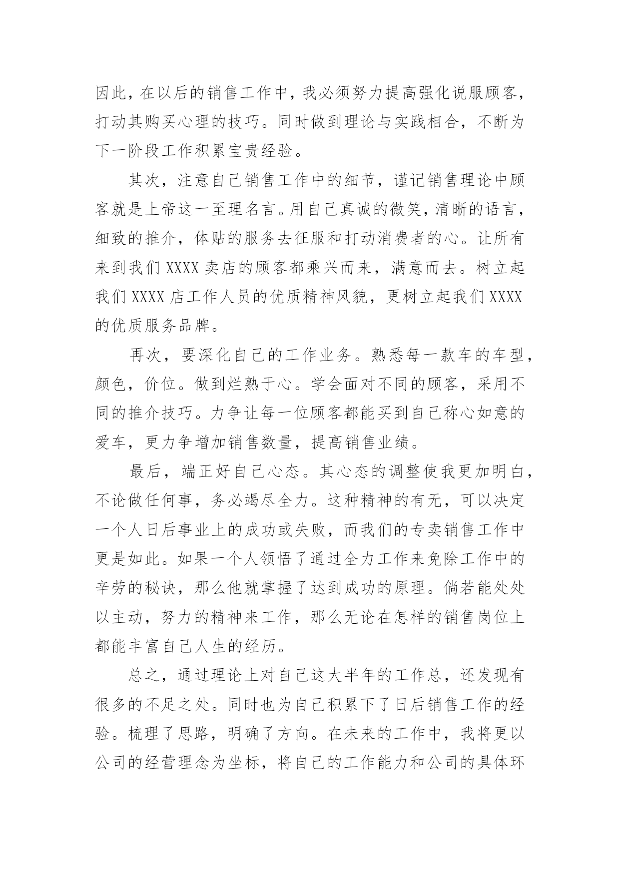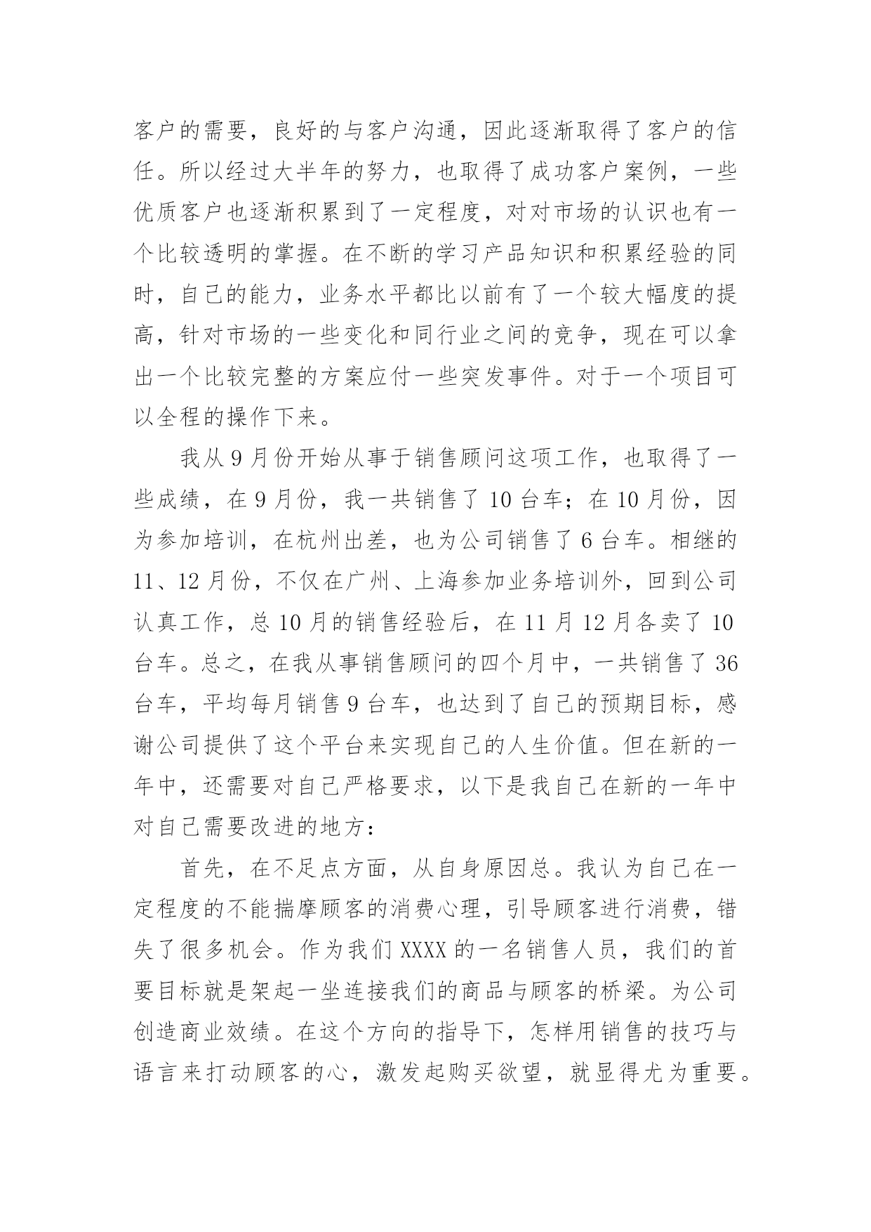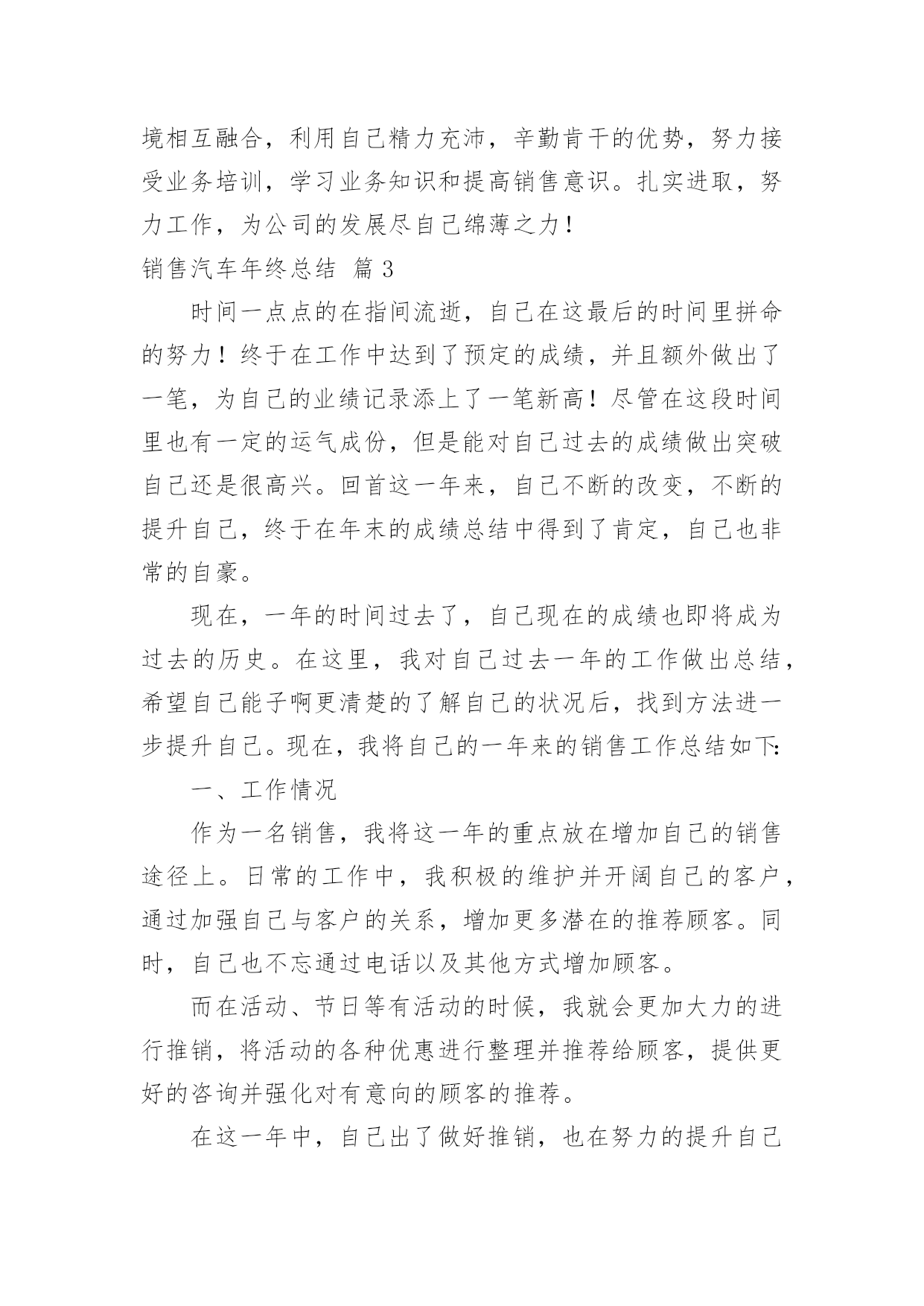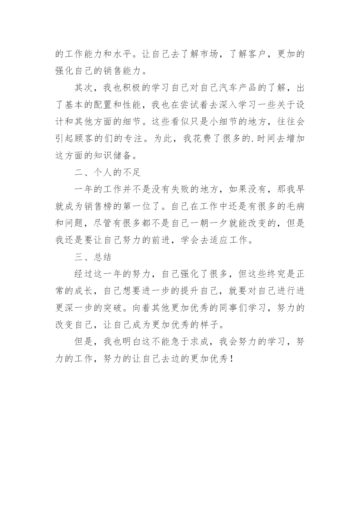 销售汽车年终总结实用的销售汽车年终总结3篇总结是在某一特定时间段对学习和工作生活或其完成情况,包括取得的成绩、存在的问题及得到的经验和教训加以回顾和分析的书面材料,它是增长才干的一种好办法,不妨让我们认真地完成总结吧。总结怎么写才是正确的呢?下面是小编为大家收集的销售汽车年终总结3篇,供大家参考借鉴,希望可以帮助到有需要的朋友。销售汽车年终总结篇1时间不知不觉就过去了一年,一晃我来公司已经一年多了。回忆这一年多的时间里,我经历许多大大小小的变化,在这个变化的过程中,公司给了我很大的帮助与支持,让我有机会成长。在20××里,我认真的完成公司领导交付的工作和任务,努力提升个人的工作效率,不断地学习新知识,把公司的利益放在个人的利益之上,事事以公司利益为首,然而我资历尚浅,能力还有待加强与学习。下面是我对于自己在20××年的工作总结。一、自我反思20××年,我通过一年的学习与工作,发现自身有很多的不足:1.首先,我的.销售技能不强,作为一个销售人员,这是一个致命的缺点,因为销售人员的本职工作就是销售。所以,在20××年最主要的任务就是要提高自己的销售技能,实现销售业绩一个质的飞跃,为公司创造更大的利润。2.20××年还有一件比较重要的任务就是提高自己的自制能力。销售工作是一个有大量业余时间的职业,我要充分利用这些业余时间来提高自己的专业知识技能。从而来提高自己的销售技能。利用这些业余时间可以学习和充实自己。响应公司的号召,学习业务知识的同时学习财务知识,把自己变成一个多功能型人才。这样的人才才是公司需要的人才,才能为公司创造更大的利润,为自己创造更大的发展空间。二、工作计划今年,我将一如既往的按照公司的要求,在去年的工作基础上更加努力全面开展20××年度的工作,先制定工作计划如下:1.加强老客户的销售跟踪情况,持续跟进新客户与潜在客户。2.开拓视野,丰富知识。采取多样化形式的销售方式,不断加强业务方面的学习、多看书、上网查阅相关资料,与同行们交流,向他们学习更好的方式、方法。3.每月应该尽最大努力完成销售目标,从而在努力中学习与进步。4.一周一小结,每月一大结。总结工作上的失误并及时改正。5.多了解客户的需求,有针对性的做好准备工作,做到不流失每一个潜在客户。6.在公司销售目标的前提下,自己给自己一个新的销售目标,这样给自己更大的动力去学习与进步,更好地完成公司的目标。最后,感谢公司领导和全体同事在这一年中对我的工作上给予大力的支持与帮助,在此表示深深的谢意!谢谢!我相信通过我自己的努力,成为一个名销售精英不是梦想!销售汽车年终总结篇220xx年已经过去,在这将近一年的时间中我通过努力的工作,收获了许多宝贵的经验。在辞旧迎新之际,我有必要对自己的工作做一下系统的深刻的总。目的在于吸取教训,提高自己,以至于在新的一年中把工作做的更好,自己有信心、有决心在新的一年的工作中做的更好。下面我对一年的工作进行简要的总结。我是今年三月份到XXXX公司工作的,在销售部从事过销售计划工作半年后,转而开始从事汽车销售工作。之前我是没有销售经验的,缺乏汽车行业销售经验和销售知识。为了迅速融入到这个行业中来,到公司之后,一切从零开始,仅凭着对销售工作的热情,一边学习产品知识,一边摸索市场,遇到销售和产品方面的难点和问题,我经常请教公司领导和其他有经验的同事,一起寻求解决问题的方案和对一些比较难缠的客户研究针对性策略,取得了良好的效果。通过不断的学习产品知识,收取同行业之间的信息和积累市场经验,现在对市场有了一个大概的`认识和了解。现在我逐渐可以清晰、流利的应对客户所提到的各种问题,准确的把握客户的需要,良好的与客户沟通,因此逐渐取得了客户的信任。所以经过大半年的努力,也取得了成功客户案例,一些优质客户也逐渐积累到了一定程度,对对市场的认识也有一个比较透明的掌握。在不断的学习产品知识和积累经验的同时,自己的能力,业务水平都比以前有了一个较大幅度的提高,针对市场的一些变化和同行业之间的竞争,现在可以拿出一个比较完整的方案应付一些突发事件。对于一个项目可以全程的操作下来。我从9月份开始从事于销售顾问这项工作,也取得了一些成绩,在9月份,我一共销售了10台车;在10月份,因为参加培训,在杭州出差,也为公司销售了6台车。相继的11、12月份,不仅在广州、上海参加业务培训外,回到公司认真工作,总10月的销售经验后,在11月12月各卖了10台车。总之,在我从事销售顾问的四个月中,一共销售了36台车,平均每月销售9台车,也达到了自己的预期目标,感谢公司提供了这个平台来实现自己的人生价值。但在新的一年中,还需要对自己严格要求,以下是我自己在新的一年中对自己需要改进的地方:首先,在不足点方面,从自身原因总。我认为自己在一定程度的不能揣摩顾客的消费心理,引导顾客进行消费,