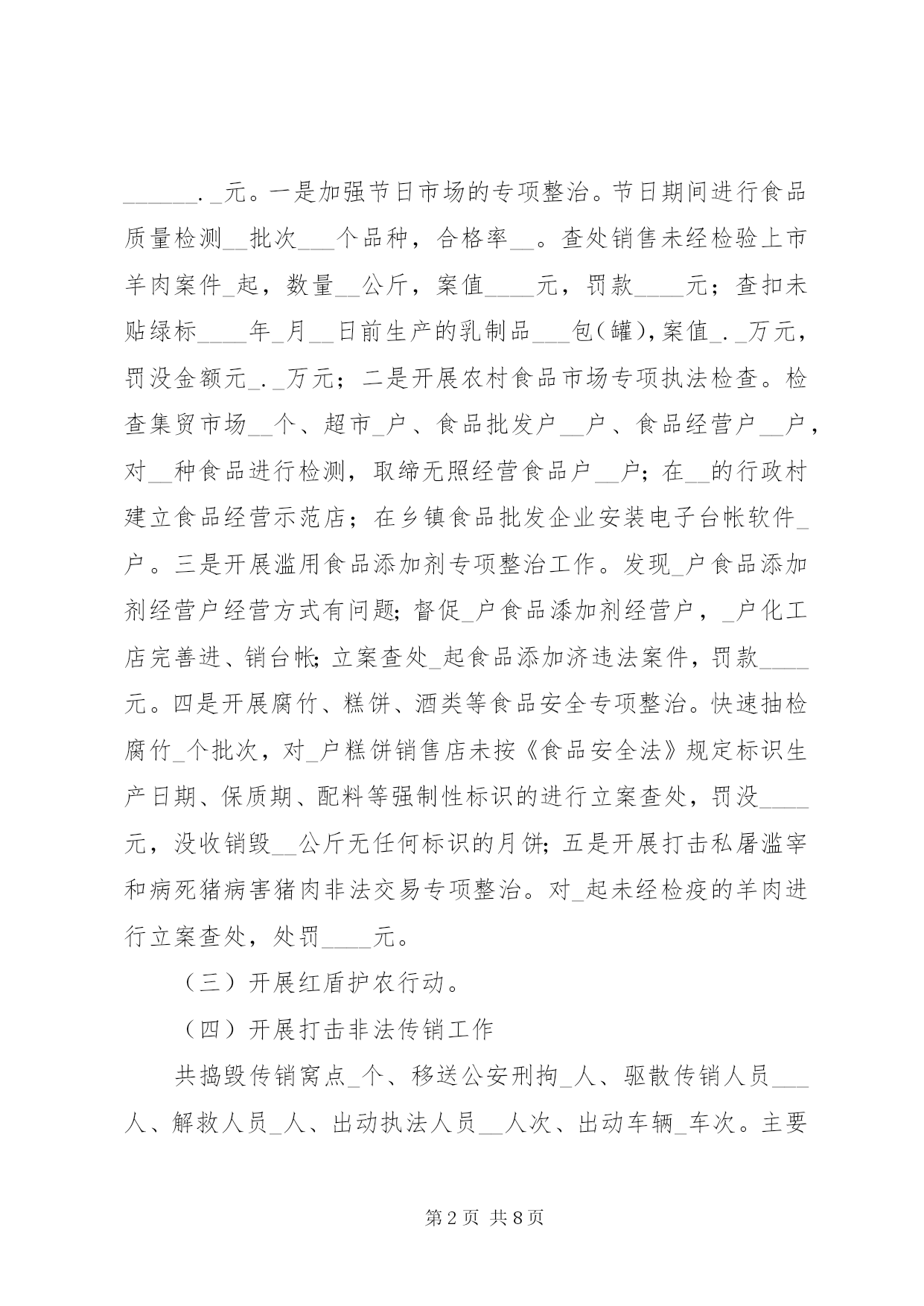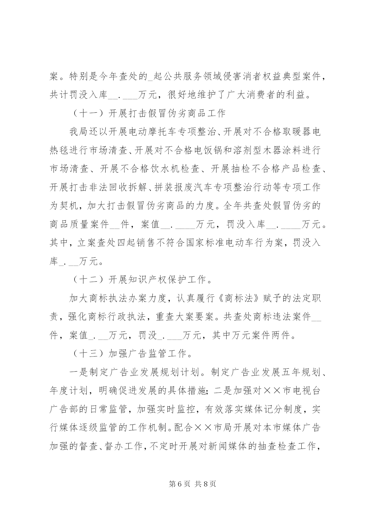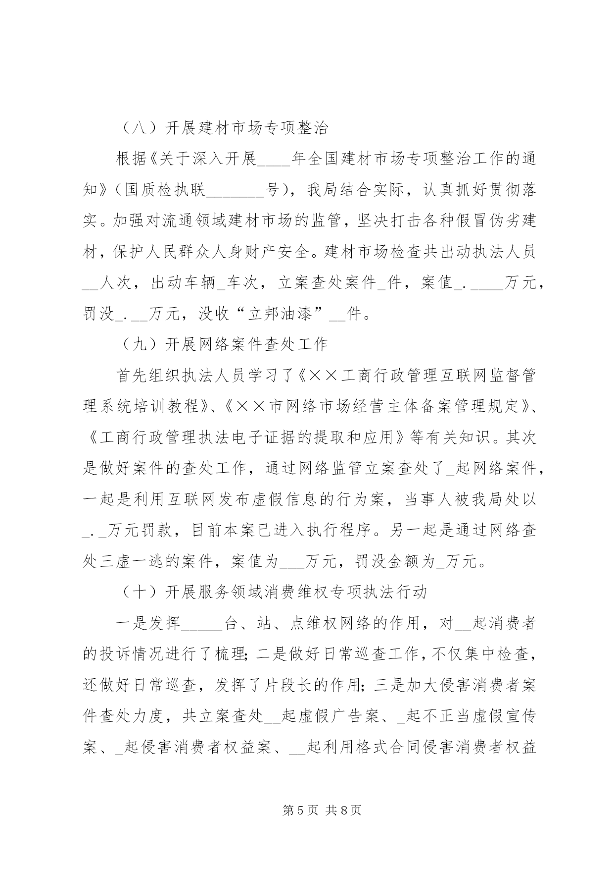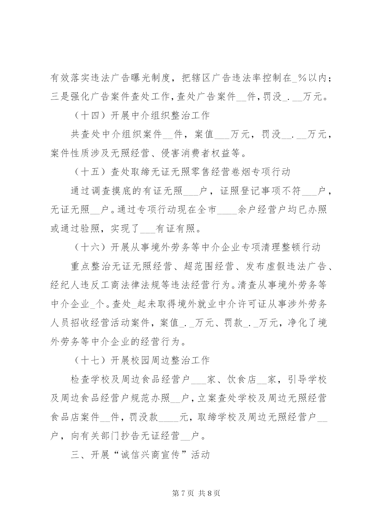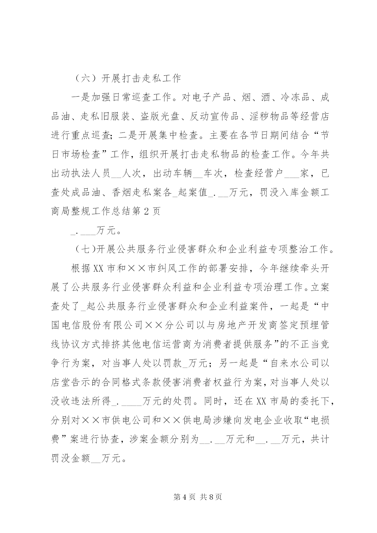 第PAGE\*Arabic\*MERGEFORMAT8页共NUMPAGES\*MERGEFORMAT8页工商局整规工作总结一、基本成效截止至____年__月__日,共查处案件___件(一般程序案件___件),罚没入库金额__._____万元。其中,查处产品质量案件__件,查处不正当竞争案件__件,侵害消费者权益案件_件,查处走私案件_件。没收违法物资有:服装_件,××奶粉__罐、“××”饮料_件(___瓶)、“××”油漆__件、××酒___箱(____瓶)、浴霸_台、假冒侵权卷烟_条、冻鸡肉__代、奶油_合、月饼(盒及散装)_合。货值金额_.____万元。二、专项整治工作(一)开展农村家电市场整治根据上级的安排部署,我局组织开展了农村家电市场检查工作。查处家电案件_件,查获虚假宣传的洗衣机__台、虚假宣传的热水器__台,案值_.__万元,罚没_._万元;责令下架旧电视机_台。同时,成立了农村家电市场监管督查工作小组。督查组深入到各乡镇进行督查。督查中还发现的案情,及时移交辖区工商所查处。另外我局与市经贸局等相关单位在中山广场开展了“家电下乡宣传活动”发放宣传材料___多份,并接受了群众的咨询。(二)开展流通环节食品安全整治行动。今年共查处食品安全案件__件,案值_____元,罚没金额______._元。一是加强节日市场的专项整治。节日期间进行食品质量检测__批次___个品种,合格率__。查处销售未经检验上市羊肉案件_起,数量__公斤,案值____元,罚款____元;查扣未贴绿标____年_月__日前生产的乳制品___包(罐),案值_._万元,罚没金额元_._万元;二是开展农村食品市场专项执法检查。检查集贸市场__个、超市_户、食品批发户__户、食品经营户__户,对__种食品进行检测,取缔无照经营食品户__户;在__的行政村建立食品经营示范店;在乡镇食品批发企业安装电子台帐软件_户。三是开展滥用食品添加剂专项整治工作。发现_户食品添加剂经营户经营方式有问题;督促_户食品潻加剂经营户,_户化工店完善进、销台帐;立案查处_起食品添加济违法案件,罚款____元。四是开展腐竹、糕饼、酒类等食品安全专项整治。快速抽检腐竹_个批次,对_户糕饼销售店未按《食品安全法》规定标识生产日期、保质期、配料等强制性标识的进行立案查处,罚没____元,没收销毁__公斤无任何标识的月饼;五是开展打击私屠滥宰和病死猪病害猪肉非法交易专项整治。对_起未经检疫的羊肉进行立案查处,处罚____元。(三)开展红盾护农行动。(四)开展打击非法传销工作共捣毁传销窝点_个、移送公安刑拘_人、驱散传销人员___人、解救人员_人、出动执法人员__人次、出动车辆_车次。主要做法:一是出台《工作方案》;二是做好宣传教育。张贴和散发《××市公安局、××市工商局关于严厉打击传销违法行为的通告》,向群众散发《禁止传销条例》、《直销管理条例》知识问答___份;三是建立打击传销工作联席会议制度。促成我市政府出台了《××市人民政府办公室关于建立打击传销工作联席会议制度的通知》,形成打击传销工作的联合机制;四是做好群众来信、来访工作。共接待了_位来寻亲的外地群众,帮助_位寻亲人员找到子女;五是成立打传行动小组。我局与公安机关抽调执法人员组成打击传销百日联合执法行动小组,行动小组的成立是工商、公安机关加强联合执法,注重沟通、协调,形成工作合力的重要体现。(五)开展打黄扫非工作一是把打黄扫非工作作为公平交易工作的重要组成部分,作为____年公平交易工作要点时,在绩效考评项目上明确了打黄扫非工作的内容;二是以查处政治性非法出版物、开展清查整治低俗音像制品专项行动、整治印刷复制企业、取缔黑网吧、净化校园周边环境为工作重点,加强市场日常监管,加强与当地“扫黄办”的沟通和配合。今年我局打黄扫非工作共出动执法人员___人次,检查经营主体___家,地摊__家,立案查处黑网吧案件_件,罚没款_.__元,取缔黑网吧_户。(六)开展打击走私工作一是加强日常巡查工作。对电子产品、烟、酒、冷冻品、成品油、走私旧服装、盗版光盘、反动宣传品、淫秽物品等经营店进行重点巡查;二是开展集中检查。主要在各节日期间结合“节日市场检查”工作,组织开展打击走私物品的检查工作。今年共出动执法人员__人次,出动车辆__车次,检查经营户___家,已查处成品油、香烟走私案各_起案值_.__万元,罚没入库金额工商局整规工作总结_.___万元。(七)开展公共服务行业侵害群众和企业利益专项整治工作。根据XX市和××市纠风工作的部署安排,今年继续牵头开展了公共服务行业侵害群众利益和企业利益专项治理工作。立案查处了_起公共服务行业侵害群众和企业利益案件,一起是“中国电信股份有限公司××分公司以与房地产开发商签定预埋管线协议方式排
