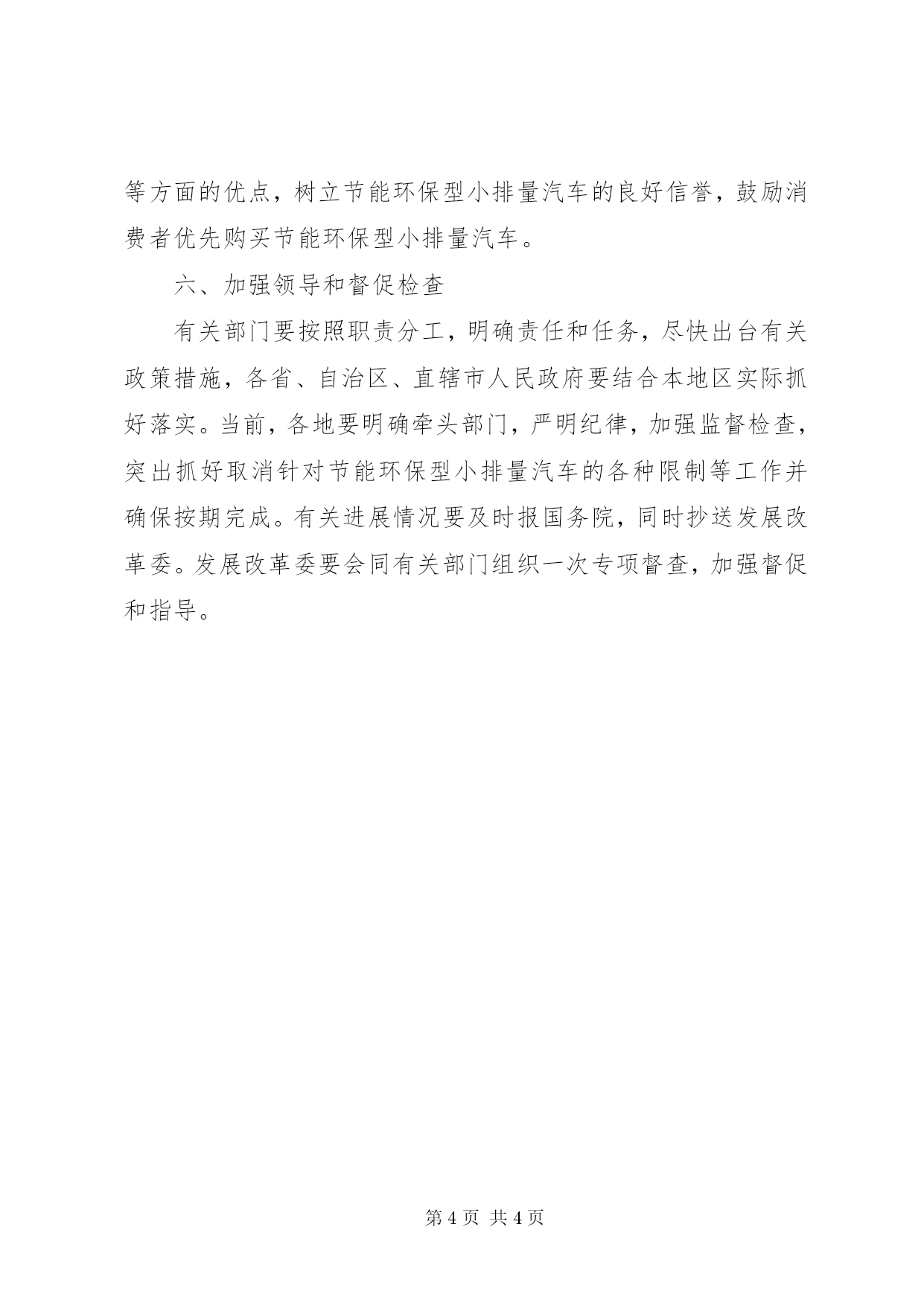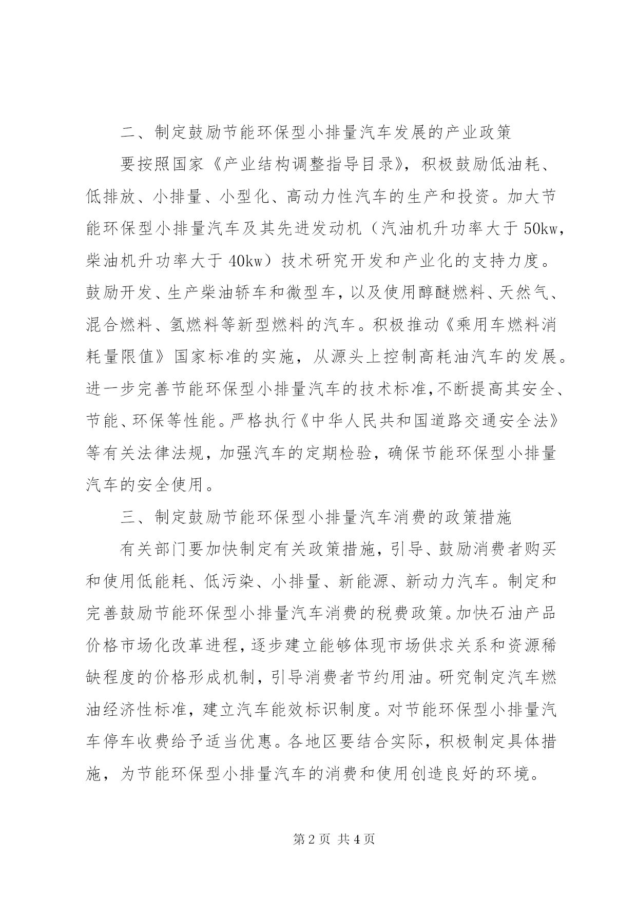 第PAGE\*Arabic\*MERGEFORMAT4页共NUMPAGES\*MERGEFORMAT4页企业环保节能工作意见近年来,随着汽车工业科技水平的不断提高,节能环保型小排量汽车在安全性、动力性和外观等方面都有了很大改善,同时其燃油消耗少、尾气排放低、外形尺寸小、道路和车位占用面积少等优点也日益突出。但在发展节能环保型小排量汽车方面,我国目前缺乏应有的鼓励支持政策,一部分地区还制定出台了一些限制性规定。为贯彻落实《国务院关于做好建设节约型社会近期重点工作的通知》*精神,现就鼓励发展节能环保型小排量汽车提出以下意见:一、充分认识发展节能环保型小排量汽车的重要性目前,节能环保型小排量汽车已成为汽车发展的主流和消费者关注的热点。美国、日本、欧洲等发达国家和地区节能环保型小排量汽车比例已占70%以上。我国节能环保型小排量汽车正日益受到消费者的喜爱,增长迅速,但比例仍然偏低。积极发展节能环保型小排量汽车,符合我国能源供给实际和大众消费水平,是建设节约型社会的重要措施,不仅有利于缓解能源紧张状况,保护环境,而且有利于培育我国汽车工业自主品牌,提高国际竞争力,对于促进汽车产业可持续发展,落实国家能源发展战略,加快建设资源节约型、环境友好型社会,具有重要意义。各地区、各部门要把鼓励节能环保型小排量汽车发展作为一项重要工作,积极采取有效措施,切实抓紧抓好。二、制定鼓励节能环保型小排量汽车发展的产业政策要按照国家《产业结构调整指导目录》,积极鼓励低油耗、低排放、小排量、小型化、高动力性汽车的生产和投资。加大节能环保型小排量汽车及其先进发动机(汽油机升功率大于50kw,柴油机升功率大于40kw)技术研究开发和产业化的支持力度。鼓励开发、生产柴油轿车和微型车,以及使用醇醚燃料、天然气、混合燃料、氢燃料等新型燃料的汽车。积极推动《乘用车燃料消耗量限值》国家标准的实施,从源头上控制高耗油汽车的发展。进一步完善节能环保型小排量汽车的技术标准,不断提高其安全、节能、环保等性能。严格执行《中华人民共和国道路交通安全法》等有关法律法规,加强汽车的定期检验,确保节能环保型小排量汽车的安全使用。三、制定鼓励节能环保型小排量汽车消费的政策措施有关部门要加快制定有关政策措施,引导、鼓励消费者购买和使用低能耗、低污染、小排量、新能源、新动力汽车。制定和完善鼓励节能环保型小排量汽车消费的税费政策。加快石油产品价格市场化改革进程,逐步建立能够体现市场供求关系和资源稀缺程度的价格形成机制,引导消费者节约用油。研究制定汽车燃油经济性标准,建立汽车能效标识制度。对节能环保型小排量汽车停车收费给予适当优惠。各地区要结合实际,积极制定具体措施,为节能环保型小排量汽车的消费和使用创造良好的环境。四、取消针对节能环保型小排量汽车的各种限制前些年,一些地方针对小排量经济型汽车、柴油汽车等废气和噪声污染大、安全性不高、外形不够美观等问题,在道路交通管理以及出租汽车车辆更新中,制定出台了一些限制性规定。目前这些规定已不适应我国国情和建设节约型社会的要求。各地区、各有关部门要按照《中华人民共和国节约能源法》、《汽车产业发展政策》和《节能中长期专项规划》等有关法规和政策的要求,对现有规定进行一次全面清理,取消一切针对节能环保型小排量汽车在行驶线路和出租汽车运营等方面的限制。不得以缓解交通拥堵等为由,专门对节能环保型小排量汽车采取交通管理限制措施;更新出租汽车车辆时,要在满足乘用功能的基础上,积极鼓励选用节能环保型小排量汽车,不得出台专门限制小排量汽车的规定,不得采取任何形式的地方保护措施。清理有关限制性规定的工作必须在20*年3月底前完成。五、引导公众树立节约型汽车消费理念鼓励节能环保型小排量汽车发展,取消对小排量汽车的各种限制,需要全社会广泛支持。要教育公众正确认识我国基本国情,树立节约型的消费理念,努力营造建设节约型社会的良好氛围。各级政府和部门要从自身做起,带头使用节能环保型小排量汽车,充分发挥表率作用。新闻媒体要坚持正确的舆论导向,大力宣传节能环保型小排量汽车在能耗、性能、安全、操作、停车、价格等方面的优点,树立节能环保型小排量汽车的良好信誉,鼓励消费者优先购买节能环保型小排量汽车。六、加强领导和督促检查有关部门要按照职责分工,明确责任和任务,尽快出台有关政策措施,各省、自治区、直辖市人民政府要结合本地区实际抓好落实。当前,各地要明确牵头部门,严明纪律,加强监督检查,突出抓好取消针对节能环保型小排量汽车的各种限制等工作并确保按期完成。有关进展情况要及时报国务院,同时抄送发展改革委。发展改革委要会同有关部门组织一次专项督查,加强督促和指导。