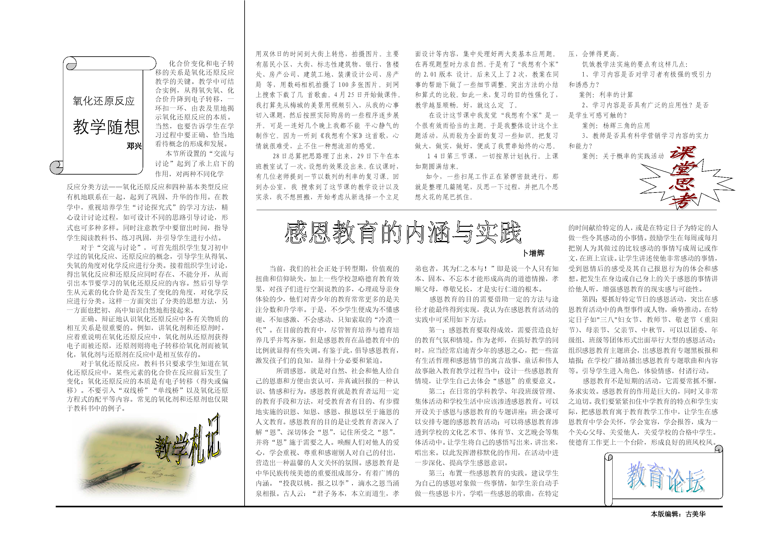 B理论与实践浅谈文言文的阅读教学何秀珍由于文言文的创作时间离我们遥远,学生学起来就倍感吃力。而我们的教学方法往往是字字落实,将文中学生不理解的字词全部搞定,然后句句疏通,将字词连起来,翻译成准确通顺的现代文句,最后按“信、达、雅”的标准,连成一篇准确通畅的现代文。这之后带领学生分析理解课文。此时在学生头脑中映现的,已不再是文言文,而是完完全全的一篇现代文了,也许这就是学生之所以觉得文言文难学的原因吧。在语文的教学中,文言文的教学是重点,也是难点。如何有效提高学生的文言文语感呢,我作了如下尝试,觉得效果不错。一、读。古人云:读书百遍,其义自现。我认为文言文语感是反复读出来的。教学生练字要抓要点——书法教学随笔现在的学生大都喜欢练硬笔字,但许多人由于练习方法不当,最终是事倍功半,没有收到很好的效果。在高中的美术课里,我抽了一些时间给学生上书法,由于课时关系,在有限的时间里,不可能面面俱到。那么,如何让学生在有限的时间里掌握硬笔书法的要点,达到事半功倍的效果呢?我感到自己在教学上的一些方法还是不错的。字写得好不好,关键地方一是用笔,二是结构。因此,首先要让学生知道如何用笔。讲用笔时,结合在基本笔画练习里面,让学生懂得用笔要有提按、快慢。有的是先运动后着纸,有的是先着纸后运动。练习了基本笔画和用笔后,可练习偏旁。汉字的偏旁很多,不必一一细述,可挑一些常见差错的来讲,这样可以有的放矢。结构上主要是让学生注意“方正、平稳、匀称、舒展”。此外,让学生练字先把某一句话练好,练好一句后再换一句,这样能收到事半功倍的效果。学生在我的这种教学下,写字也就进步多了。不与世俗同流合污的出世态度是值得称道的,但是在如今这个相对自由平等同时又充满激烈竞争的社会里,这样的思想是不可取的。三、译。译,译到十分熟。在读与品后再进行译,集中进行字词、句、篇的翻译,这样难度也就不大了。教学中我尽量联系学过的文言文及词句所出现的具体语境,使学生举一反三。翻译时在原则上要做到字字落实,句句通畅,按“信、达、雅”的标准将原文改成一篇准确通畅又不失优美的现代文。课后必做的一份作业是整理笔记,将文言文与现代文翻译一一对应起来,使其清晰无误,一目了然。当然,在进行翻译的过程中,运用适当的组织策略、精加工策略、复述策略等,可促进知识的巩固。有必要将所学的每一篇文言文译到十分熟,这样,在进入下一篇文言文的学习时,就会产生令人惊喜的知识和能力的迁移。通过这样的“读、品、译”的训练,学生对文言文已不再畏惧,在熟记、理解了大量字词的含义和活用现象后,阅读课内外文言文、做课内外阅读理解题就游刃有余了。并且逐渐形成了良好的文言文语感,大大增强学生阅读文言文的能力。我在教学中并不急着翻译,急着品析,而是让学生在晨读课、课前及课内反复读课文,直读到口齿伶俐、抑扬顿挫,甚至熟读成诵了不可。读,读到六分懂。当然出于效率的考虑,诵读课文也要讲究方法,一般我先范读,较难的文章有时领着学生一句一句来读,有时还给课文配上图画或音乐来读,以减弱学生反复诵读古文的枯燥感,从而在反复诵读的过程中不断体会古代语言的美感。比如教《后赤壁赋》,我以图文和背景音乐相结合的方法,美景、美文、美图、美乐,使学生诵读时不禁沉醉其中。通过读,学生能达到六七分懂,在学生反复诵读的基础上,我再引领学生进入文言文学习的第二步。二、品。品,品到八分透。对文言文的品析我一般放在授课的第一课时,因为我觉得学生对新授课的兴趣和热情最为高涨。如教学《送东阳马生序》则由文末最后一段切入贯穿。总的来说,在这个环节中,尽量让学生体会原汁原味的古代语言,当然要做到十分透彻是不可能的,品到八分就足够了。而且尽量将古文教学与现今我们所处的时代结合起来,赋予其时代新义。如《归去来兮辞》中所表达的安贫乐道、淡泊名利的思想,在当时特定的专制黑暗的封建社会里,这种侯金发在日常生活中,如果一个人天天吃大鱼大肉,那么他肯定对山珍海味食欲不振。若让他喝稀粥就咸菜,必觉清爽可口。如此数日之后,便会逐渐怀念往日的大餐,此时稍见一些好吃的,也会感到胃口大开。在医学上,这被称为“饥饿疗法”。现在,“饥饿疗法”在市场营销和医学临床上都有广泛的应用,并且屡试不爽。“饥饿疗法”的立足点是科学的控制供应源,促使对方产生深层的渴求!我们的数学课堂是否也需要这种“饥饿疗法”?回答是肯定的。在时下的数学课堂中,学习者和学习内容之间不存在“饥饿感”,供大于求是主要矛盾。教师通过实施“饥饿行销”的策略,让学生对学习内容产生适当的饥饿。用饥饿的方法来激发学生的求知欲并且