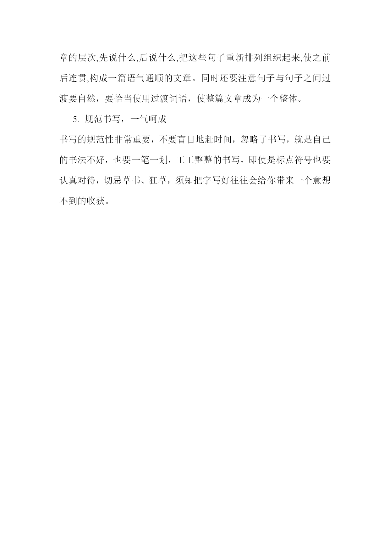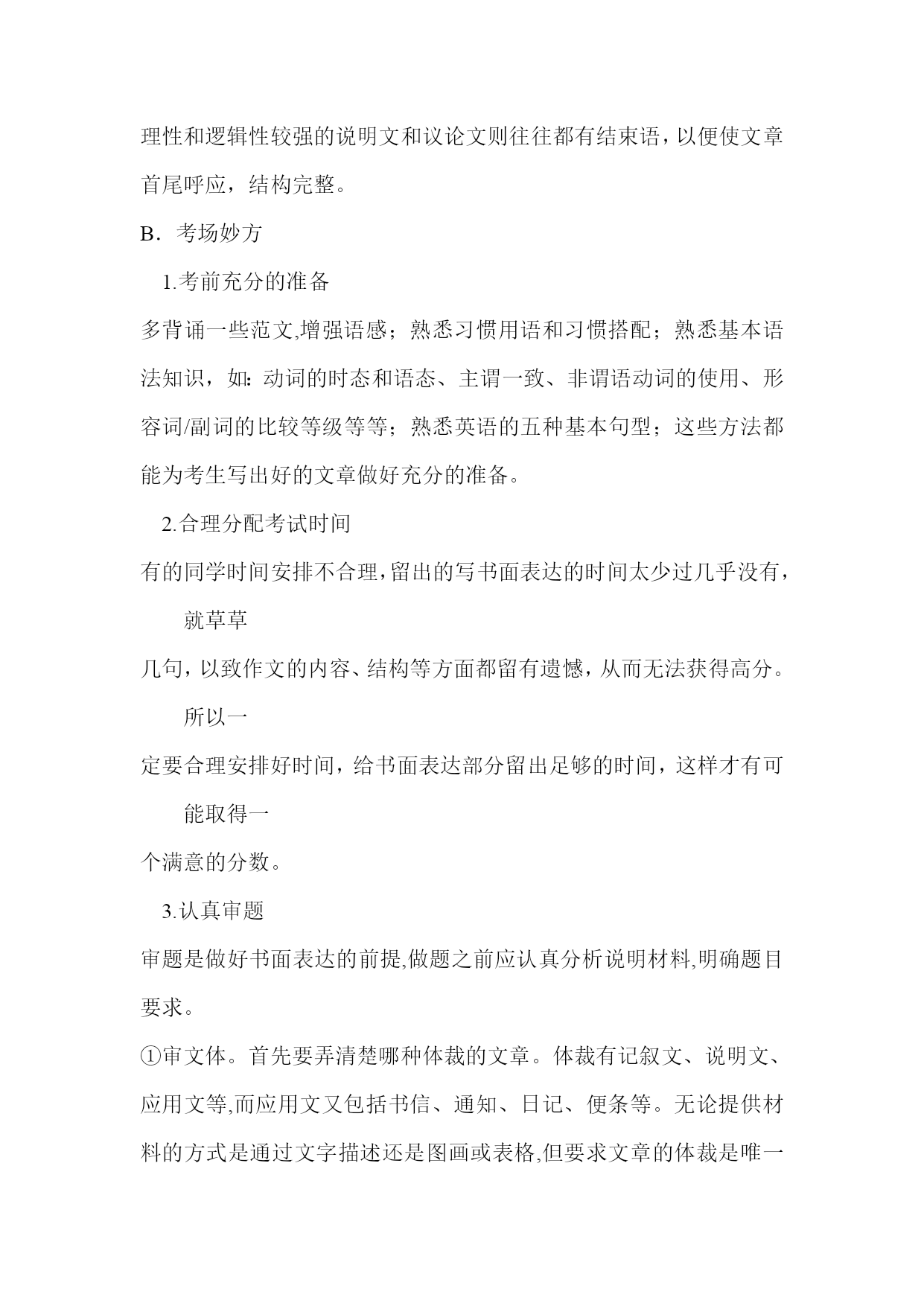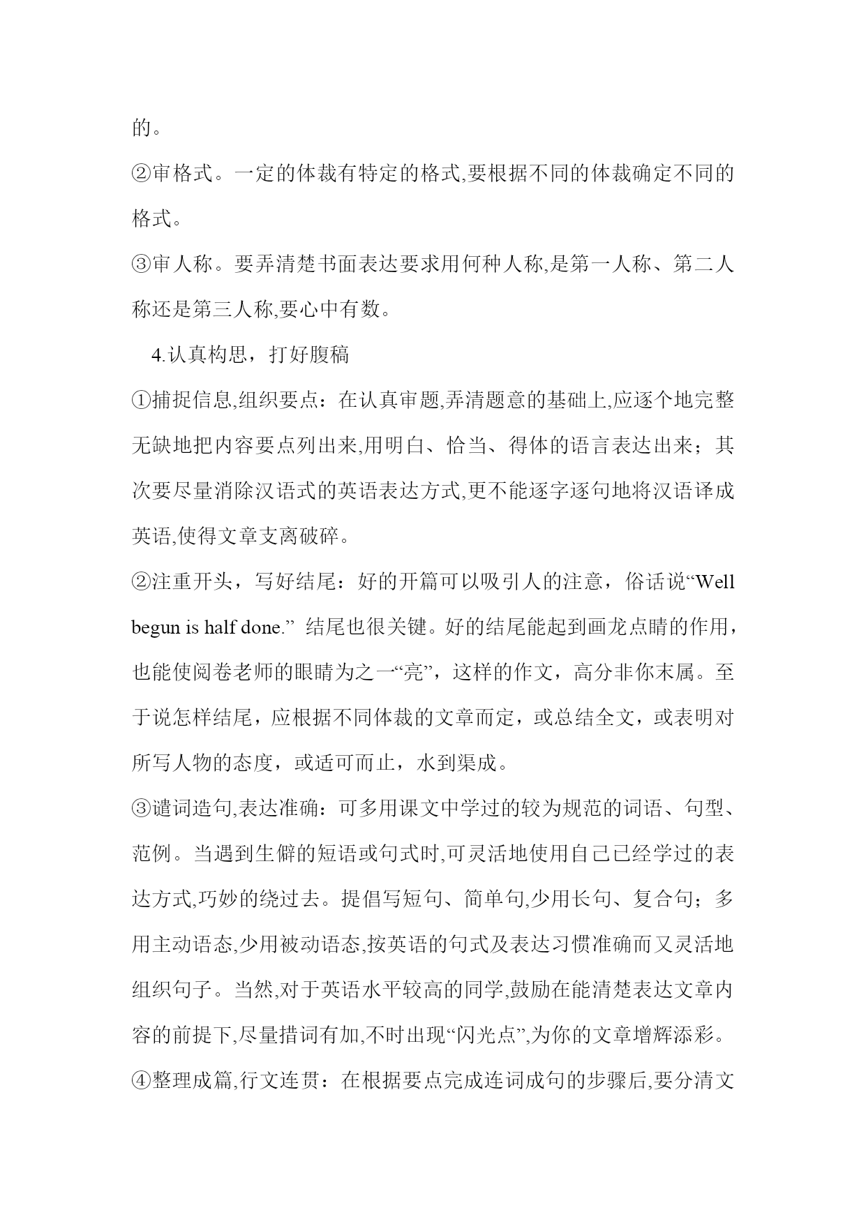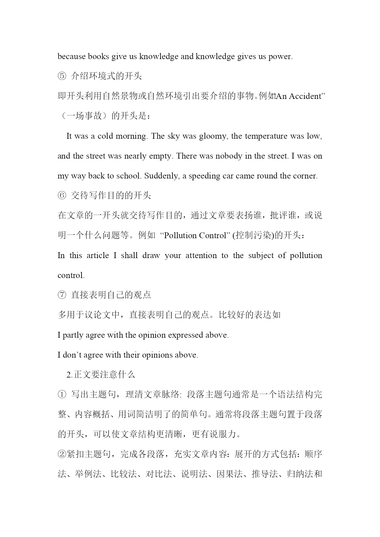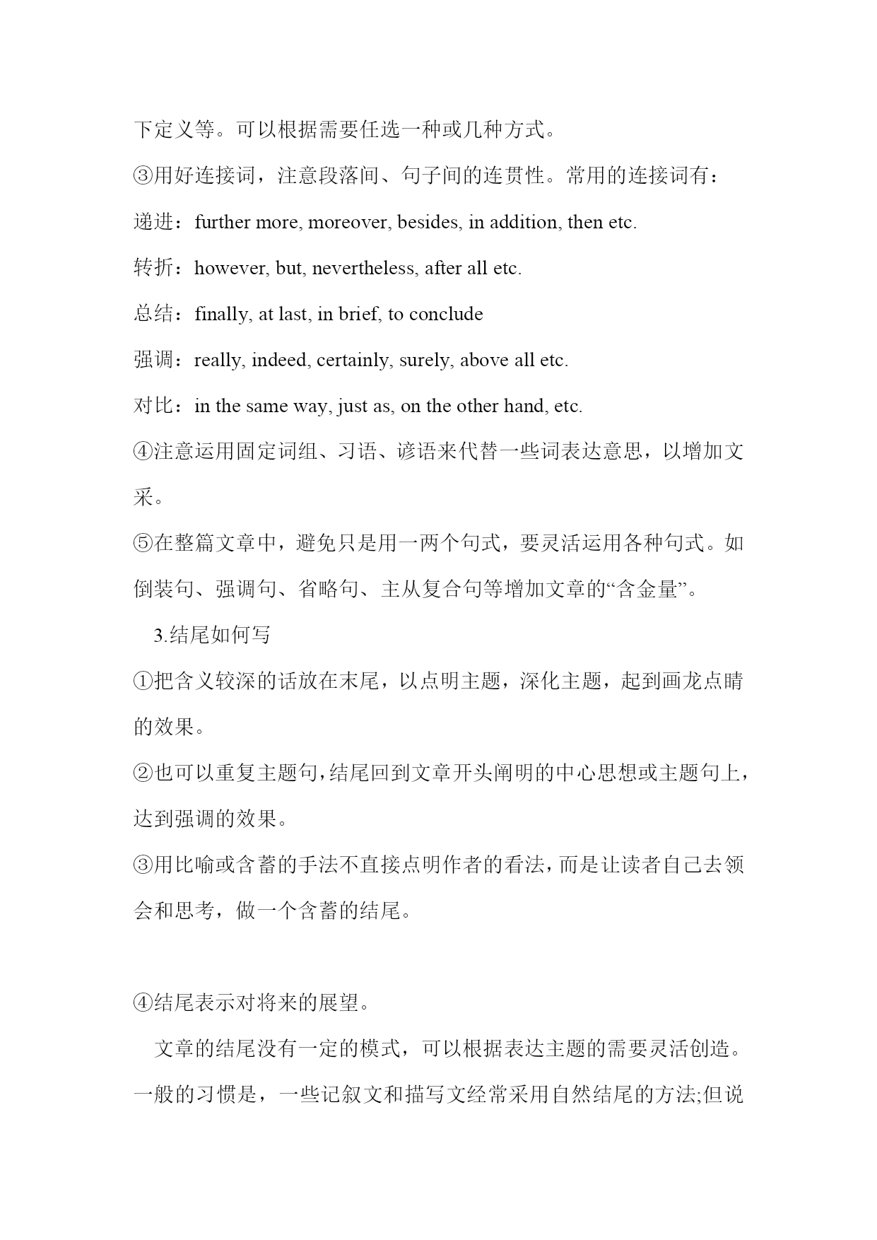 中考英语作文高分妙招A.布局妙方1.如何写好开头=1\*GB3①开门见山,直奔主题文章一开头,就交待清楚文章的主题是什么。如写一篇关于度假的文章,可以在文章的开头直接揭示主题:IspentmywinterholidayhappilyinHainan.=2\*GB3②直接交代清楚人物、事情、时间或环境在文章的开头,先把人物、事件和时间、环境等交待清楚。如前天我们班组织了一次旅行。可以这样开头:Thedaybeforeyesterdaymyclasswentonatrip.Ittookthreehourstoridethere.Thelongtripmadeusverytired,butthesightofthebeautifulsearefreshedus.=3\*GB3③用回忆的方法开头用回忆的方法来开头。例如“ATriptotheYuntaiMountain”(去云台山旅游)的开头是:IremembermyfirsttriptotheYuntaiMountainasifitwereyesterday.=4\*GB3④概括性的开头。即对要在文章中叙述的人或事先作一个概括性的介绍。例如“TheHappinessofReadingBooks”(读书的快乐)的开头:Peopleoftensaythatgoldandsilverarethemostvaluablethingsintheworld.ButIsaythattoreadbooksismorevaluablethananythingelse,becausebooksgiveusknowledgeandknowledgegivesuspower.=5\*GB3⑤介绍环境式的开头即开头利用自然景物或自然环境引出要介绍的事物。例如“AnAccident”(一场事故)的开头是:Itwasacoldmorning.Theskywasgloomy,thetemperaturewaslow,andthestreetwasnearlyempty.Therewasnobodyinthestreet.Iwasonmywaybacktoschool.Suddenly,aspeedingcarcameroundthecorner.=6\*GB3⑥交待写作目的的开头在文章的一开头就交待写作目的,通过文章要表扬谁,批评谁,或说明一个什么问题等。例如“PollutionControl”(控制污染)的开头:InthisarticleIshalldrawyourattentiontothesubjectofpollutioncontrol.=7\*GB3⑦直接表明自己的观点多用于议论文中,直接表明自己的观点。比较好的表达如Ipartlyagreewiththeopinionexpressedabove.Idon’tagreewiththeiropinionsabove.2.正文要注意什么=1\*GB3①写出主题句,理清文章脉络:段落主题句通常是一个语法结构完整、内容概括、用词简洁明了的简单句。通常将段落主题句置于段落的开头,可以使文章结构更清晰,更有说服力。=2\*GB3②紧扣主题句,完成各段落,充实文章内容:展开的方式包括:顺序法、举例法、比较法、对比法、说明法、因果法、推导法、归纳法和下定义等。可以根据需要任选一种或几种方式。=3\*GB3③用好连接词,注意段落间、句子间的连贯性。常用的连接词有:递进:furthermore,moreover,besides,inaddition,thenetc.转折:however,but,nevertheless,afteralletc.总结:finally,atlast,inbrief,toconclude强调:really,indeed,certainly,surely,abovealletc.对比:inthesameway,justas,ontheotherhand,etc.=4\*GB3④注意运用固定词组、习语、谚语来代替一些词表达意思,以增加文采。=5\*GB3⑤在整篇文章中,避免只是用一两个句式,要灵活运用各种句式。如倒装句、强调句、省略句、主从复合句等增加文章的“含金量”。3.结尾如何写=1\*GB3①把含义较深的话放在末尾,以点明主题,深化主题,起到画龙点睛的效果。=2\*GB3②也可以重复主题句,结尾回到文章开头阐明的中心思想或主题句上,达到强调的效果。=3\*GB3③用比喻或含蓄的手法不直接点明作者的看法,而是让读者自己去领会和思考,做一个含蓄的结尾。=4\*GB3④结尾表示