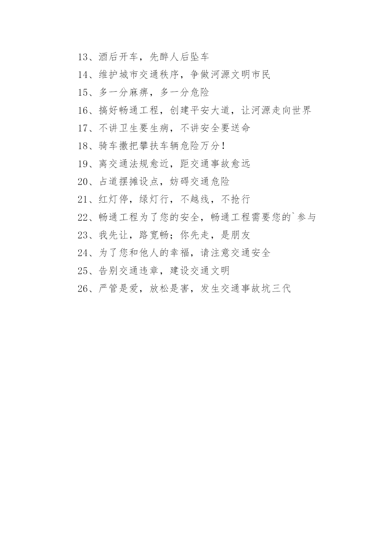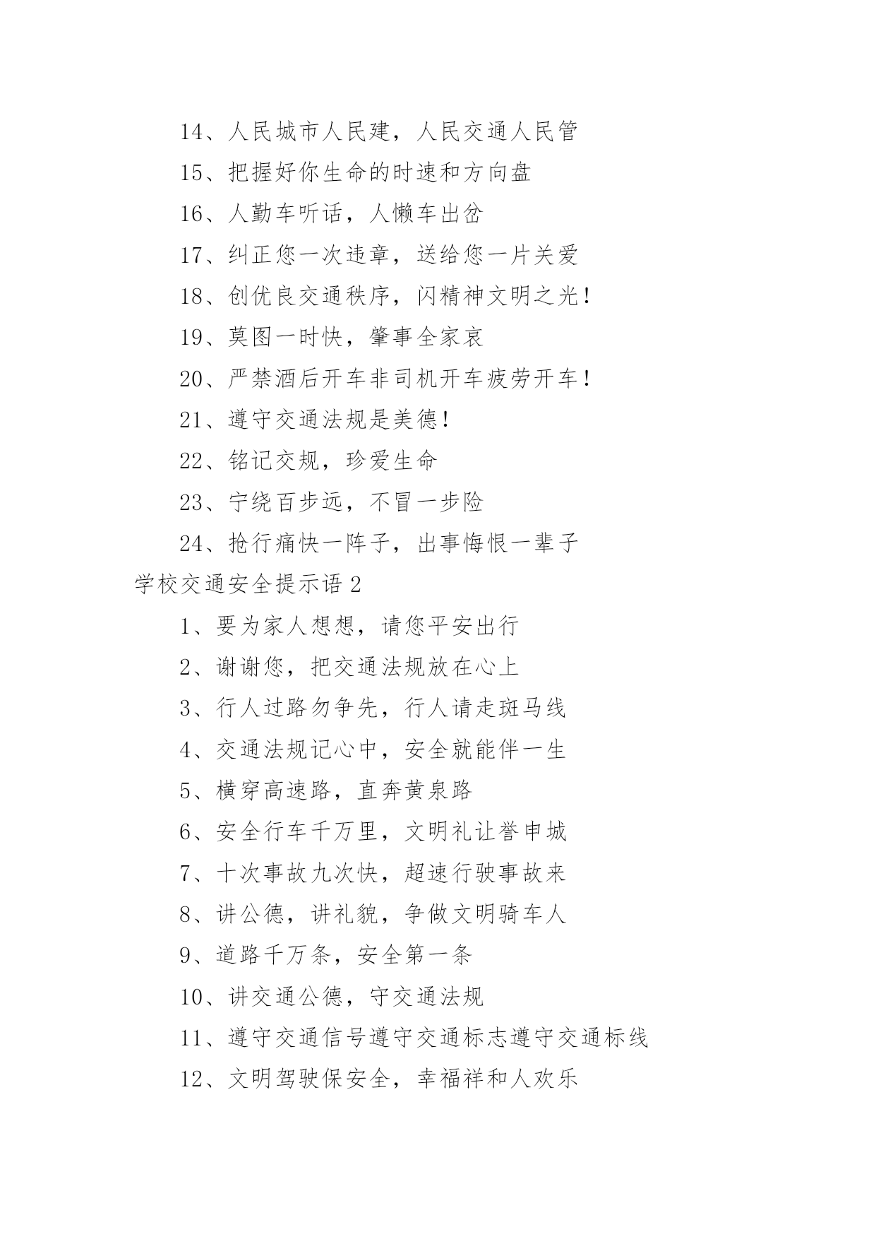 学校交通安全提示语学校交通安全提示语在不断进步的时代,大家或多或少都接触过一些提示语吧,提示语就是对人物说话时的表现进行记叙描写,提示一下当前的情况。那些被广泛运用的提示语都是什么样子的呢?下面是小编为大家整理的学校交通安全提示语,欢迎阅读与收藏。学校交通安全提示语11、人行横道是生命的绿色通道2、警惕保安全,麻痹起祸端3、人人守法规,方便你我他4、交通法规要遵守,安全警钟需常鸣5、为了您和他人的`幸福,请自觉遵守交通法规6、一身安危系全家,全家幸福系一人7、安全与遵章同在,事故与违规相随8、开车打手机,事故盯上你9、无照开车是玩命,十次玩命九丧生10、礼让――让出海阔天空,争抢――抢出飞来横祸11、增强交通法制观念,遵守交通行为规范12、违章行(骑)车,危及他人,祸及自身13、您是河源的主人,您是文明礼让的楷模14、人民城市人民建,人民交通人民管15、把握好你生命的时速和方向盘16、人勤车听话,人懒车出岔17、纠正您一次违章,送给您一片关爱18、创优良交通秩序,闪精神文明之光!19、莫图一时快,肇事全家哀20、严禁酒后开车非司机开车疲劳开车!21、遵守交通法规是美德!22、铭记交规,珍爱生命23、宁绕百步远,不冒一步险24、抢行痛快一阵子,出事悔恨一辈子学校交通安全提示语21、要为家人想想,请您平安出行2、谢谢您,把交通法规放在心上3、行人过路勿争先,行人请走斑马线4、交通法规记心中,安全就能伴一生5、横穿高速路,直奔黄泉路6、安全行车千万里,文明礼让誉申城7、十次事故九次快,超速行驶事故来8、讲公德,讲礼貌,争做文明骑车人9、道路千万条,安全第一条10、讲交通公德,守交通法规11、遵守交通信号遵守交通标志遵守交通标线12、文明驾驶保安全,幸福祥和人欢乐13、酒后开车,先醉人后坠车14、维护城市交通秩序,争做河源文明市民15、多一分麻痹,多一分危险16、搞好畅通工程,创建平安大道,让河源走向世界17、不讲卫生要生病,不讲安全要送命18、骑车撒把攀扶车辆危险万分!19、离交通法规愈近,距交通事故愈远20、占道摆摊设点,妨碍交通危险21、红灯停,绿灯行,不越线,不抢行22、畅通工程为了您的安全,畅通工程需要您的`参与23、我先让,路宽畅;你先走,是朋友24、为了您和他人的幸福,请注意交通安全25、告别交通违章,建设交通文明26、严管是爱,放松是害,发生交通事故坑三代