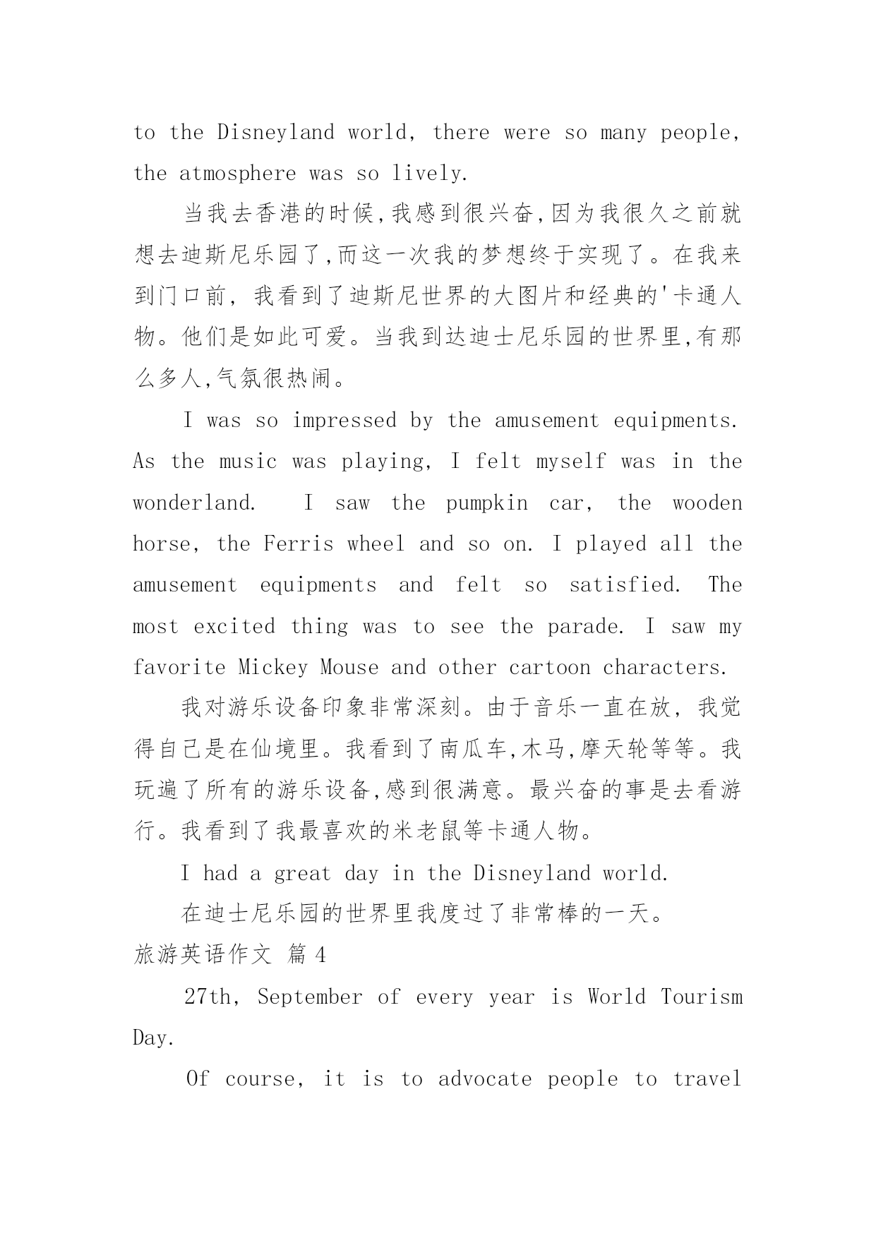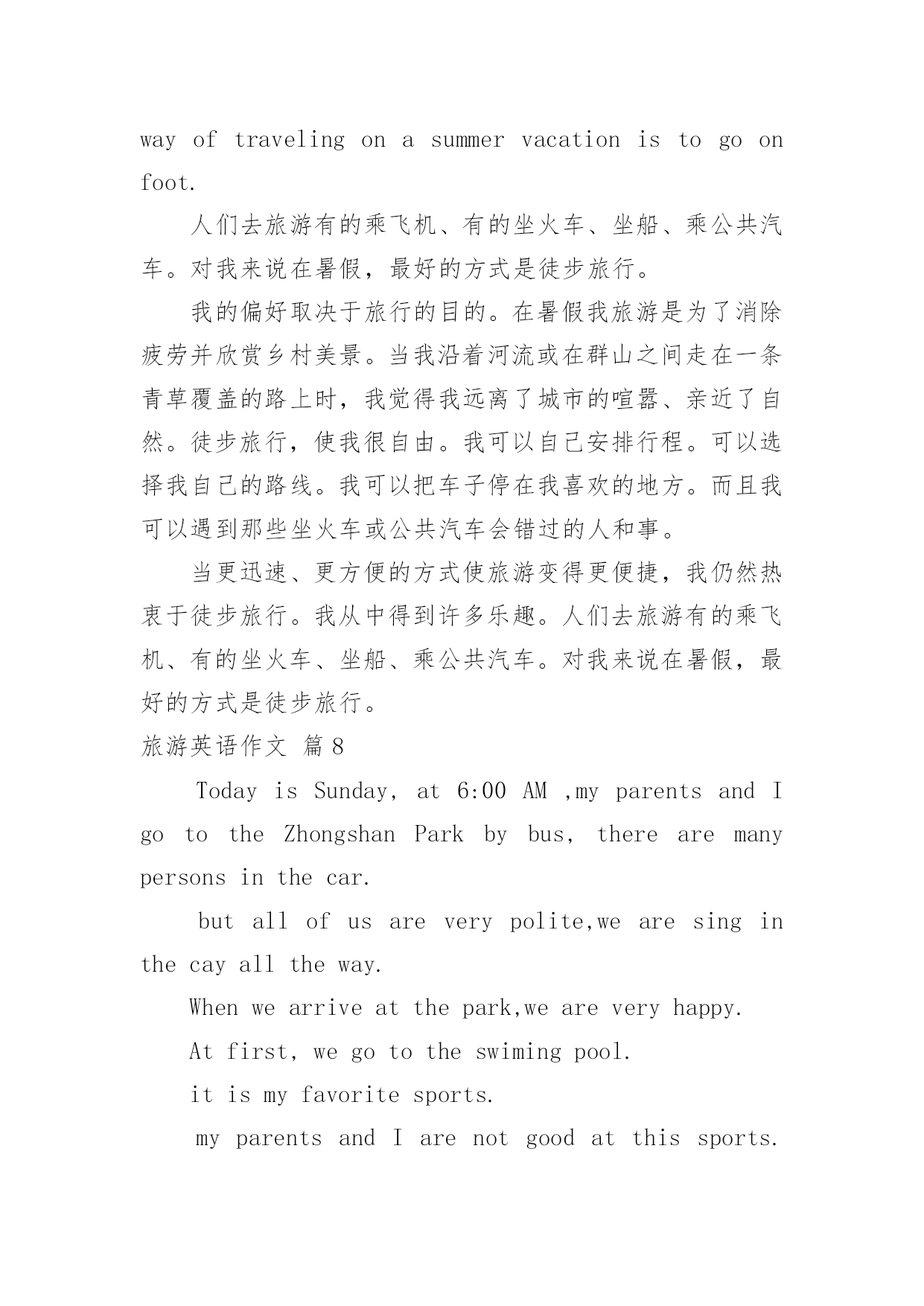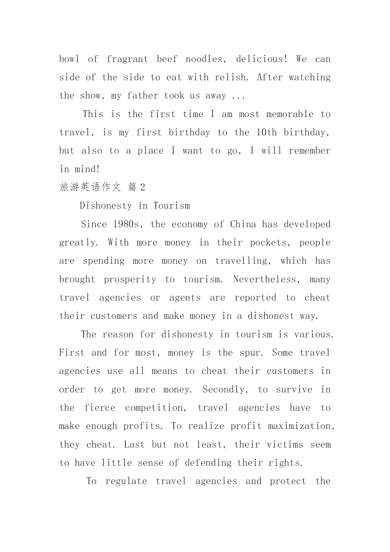 旅游英语作文精选旅游英语作文汇总8篇在平平淡淡的日常中,大家都经常接触到作文吧,写作文可以锻炼我们的独处习惯,让自己的心静下来,思考自己未来的方向。怎么写作文才能避免踩雷呢?下面是小编整理的旅游英语作文8篇,仅供参考,欢迎大家阅读。旅游英语作文篇1TodayisSunday,sunny,blueskies.MomandDadtookmetotravel,butthisisthefirsttimeItravelah!Iamhappytojumpandjump,hearthappy.Iamcurioustoaskmyfather,said:"Dad,wheredoweplay?""Gotoyouwillknowit!"Dadreplied.MomandDadhappilytookmetoaplace,gotintothecar,tookalong,longtime,andgetoffagain.Dadsaidtome:"daughter,youlookcarefully,whereistheplace,thinkaboutit."Ilookedaroundforalongtime,verycrowded!Thinkofit,Iamsurprisedtosay:"Dad,thisisnotmydreamwanttogotothedeerfarmit?""Yes,youknowtodayiswhatday?Todayisyour10thbirthday!"DadsaidEnd,Iimmediatelystunned,didnotexpect,Idonotremembertheirownbirthday,MomandDadbutremember,gavemesuchasurprise.Atthistime,mytearsofexcitement,staringatthem.Mymothersaidtome:"sillyboy,donotcry.Enterit!"Weboughtaticket,warmticketsistergaveusagamemap,themapiswrittenindetail,whenwhatgameplayareclearClearlywrittenout,reallyconvenient!Cool!AssoonasIentered,Isawthatmanyofmychildrenwereplaying,andtheyweresweatingprofuselyandsmilingwiththeirfaces.Itookthemapandsawalotofitemstoplay,suchas:Ferriswheel,rollercoaster,carousel,waterbike......allkindsofgameshave,everything,everything.Ifirstwenttothecarouselwheretoplay,tositontop,theTrojanturnedleftturn,turnedmydizzy,andfinallystopped.IwenttotheFerriswheeltoplay,Isatup,theheartpounding,Ferriswheelslowlyturned,andIimmediatelyclosedmyeyes,afterawhile,Iquietlyopenedhiseyes.FoundthataslongasIlookeddown,youwillseethewholesceneofthedeerfarm,veryspectacular,thisfeelingtoocomfortable,asiffloatinginthesky.Atnoon,weenteredtheanimaltheater,watchinganimalperformances,mymotherboughtusabowloffragrantbeefnoodles,delicious!Wecansideofthesidetoeatwithrelish.Afterwatchingtheshow,myfathertookusaway...ThisisthefirsttimeIammostmemorabletotravel,ismyfirstbirthdaytothe10thbirthday,butalsotoaplaceIwanttogo,Iwillrememberinmind!旅游英语作文篇2DishonestyinTourismSince1980s,theeconomyofChinahasdevelopedgreatly.Withmoremoneyintheirpockets
