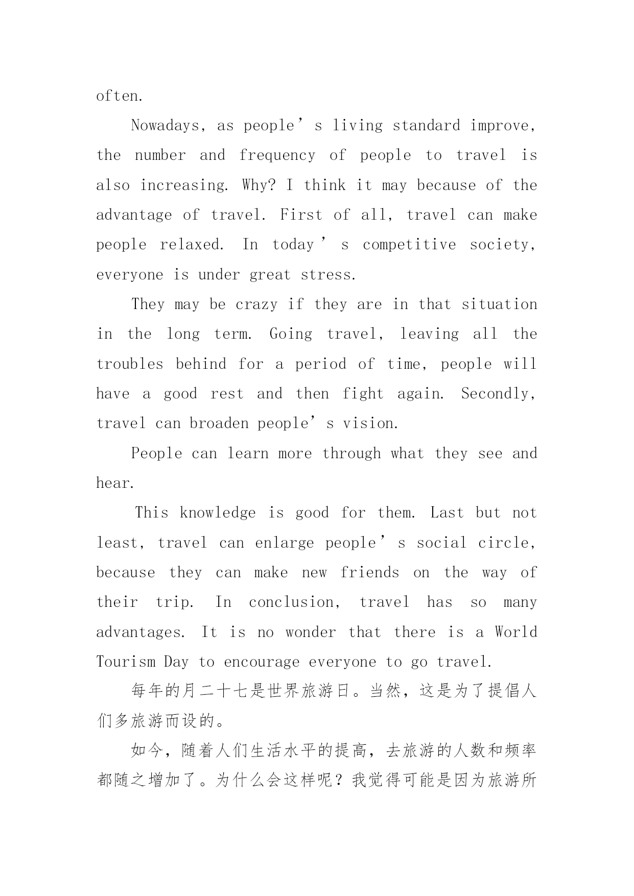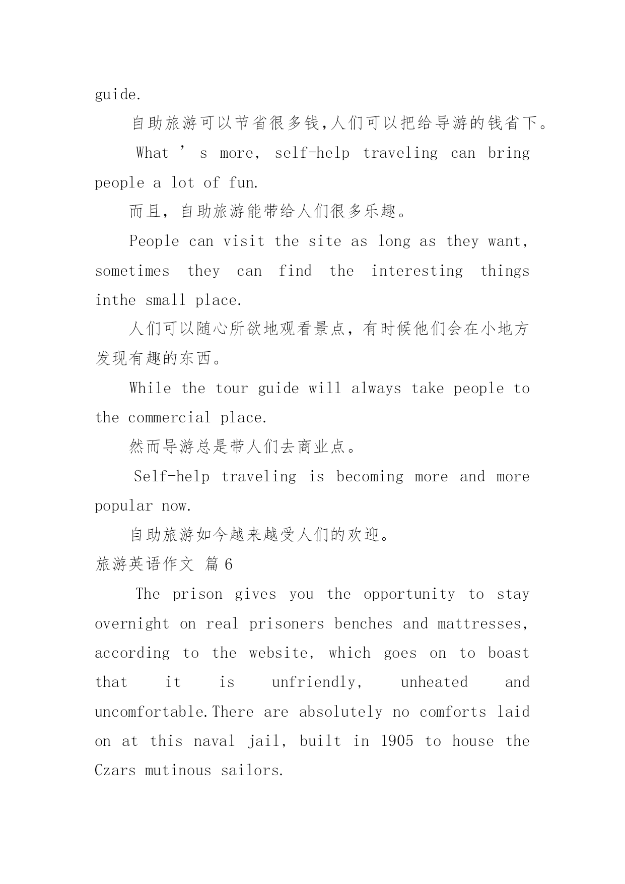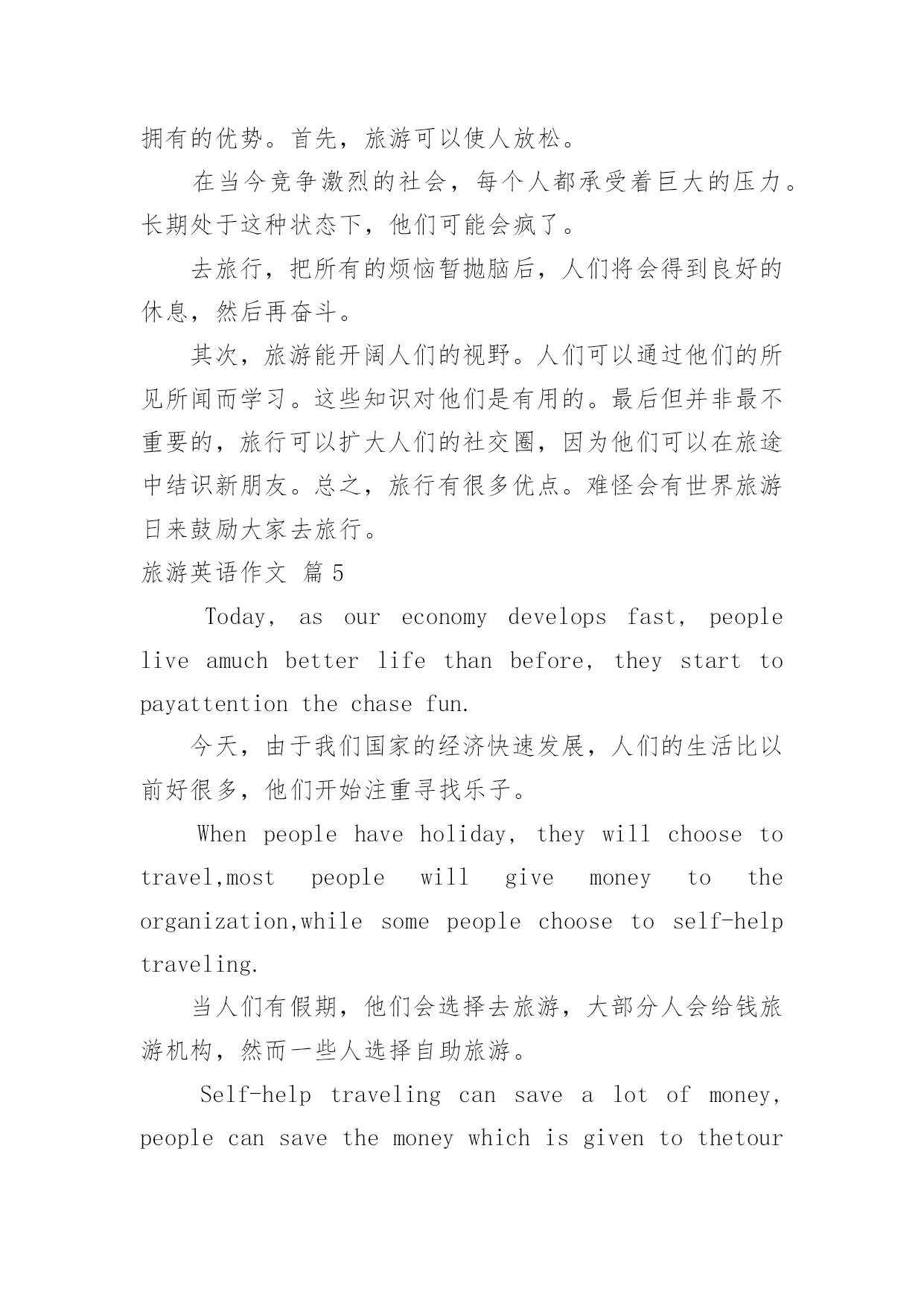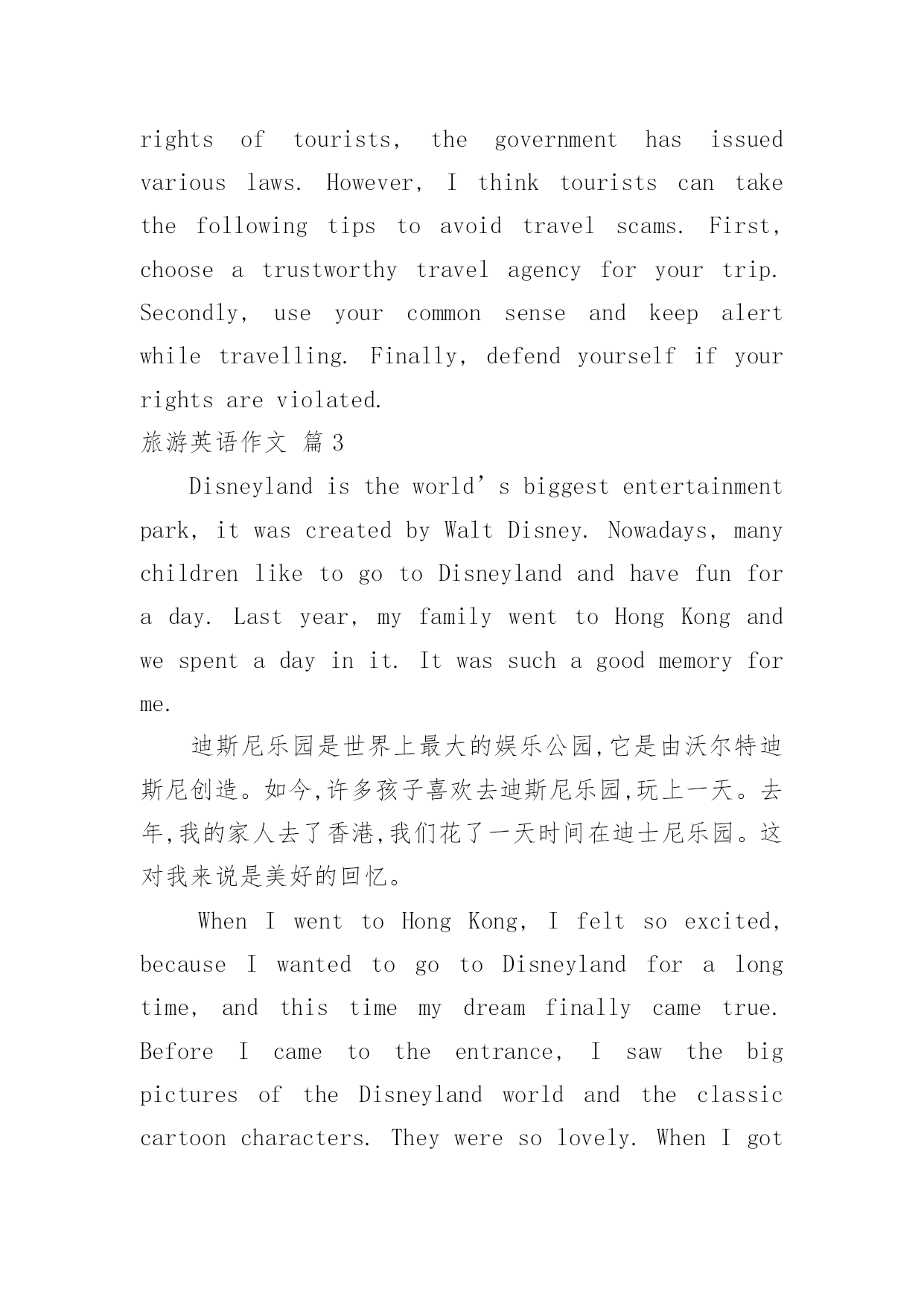 旅游英语作文精选旅游英语作文汇总8篇在平平淡淡的日常中,大家都经常接触到作文吧,写作文可以锻炼我们的独处习惯,让自己的心静下来,思考自己未来的方向。怎么写作文才能避免踩雷呢?下面是小编整理的旅游英语作文8篇,仅供参考,欢迎大家阅读。旅游英语作文篇1TodayisSunday,sunny,blueskies.MomandDadtookmetotravel,butthisisthefirsttimeItravelah!Iamhappytojumpandjump,hearthappy.Iamcurioustoaskmyfather,said:"Dad,wheredoweplay?""Gotoyouwillknowit!"Dadreplied.MomandDadhappilytookmetoaplace,gotintothecar,tookalong,longtime,andgetoffagain.Dadsaidtome:"daughter,youlookcarefully,whereistheplace,thinkaboutit."Ilookedaroundforalongtime,verycrowded!Thinkofit,Iamsurprisedtosay:"Dad,thisisnotmydreamwanttogotothedeerfarmit?""Yes,youknowtodayiswhatday?Todayisyour10thbirthday!"DadsaidEnd,Iimmediatelystunned,didnotexpect,Idonotremembertheirownbirthday,MomandDadbutremember,gavemesuchasurprise.Atthistime,mytearsofexcitement,staringatthem.Mymothersaidtome:"sillyboy,donotcry.Enterit!"Weboughtaticket,warmticketsistergaveusagamemap,themapiswrittenindetail,whenwhatgameplayareclearClearlywrittenout,reallyconvenient!Cool!AssoonasIentered,Isawthatmanyofmychildrenwereplaying,andtheyweresweatingprofuselyandsmilingwiththeirfaces.Itookthemapandsawalotofitemstoplay,suchas:Ferriswheel,rollercoaster,carousel,waterbike......allkindsofgameshave,everything,everything.Ifirstwenttothecarouselwheretoplay,tositontop,theTrojanturnedleftturn,turnedmydizzy,andfinallystopped.IwenttotheFerriswheeltoplay,Isatup,theheartpounding,Ferriswheelslowlyturned,andIimmediatelyclosedmyeyes,afterawhile,Iquietlyopenedhiseyes.FoundthataslongasIlookeddown,youwillseethewholesceneofthedeerfarm,veryspectacular,thisfeelingtoocomfortable,asiffloatinginthesky.Atnoon,weenteredtheanimaltheater,watchinganimalperformances,mymotherboughtusabowloffragrantbeefnoodles,delicious!Wecansideofthesidetoeatwithrelish.Afterwatchingtheshow,myfathertookusaway...ThisisthefirsttimeIammostmemorabletotravel,ismyfirstbirthdaytothe10thbirthday,butalsotoaplaceIwanttogo,Iwillrememberinmind!旅游英语作文篇2DishonestyinTourismSince1980s,theeconomyofChinahasdevelopedgreatly.Withmoremoneyintheirpockets