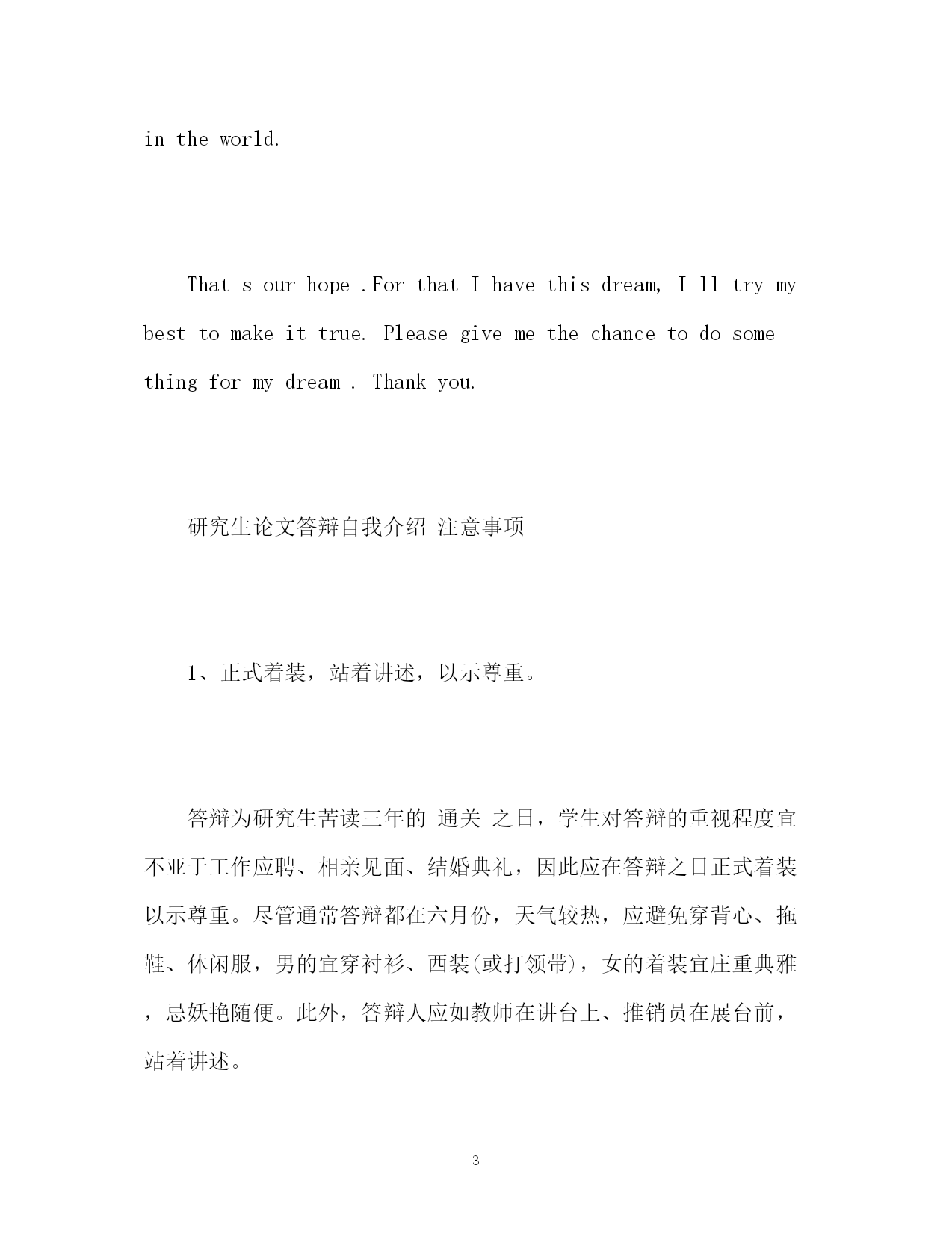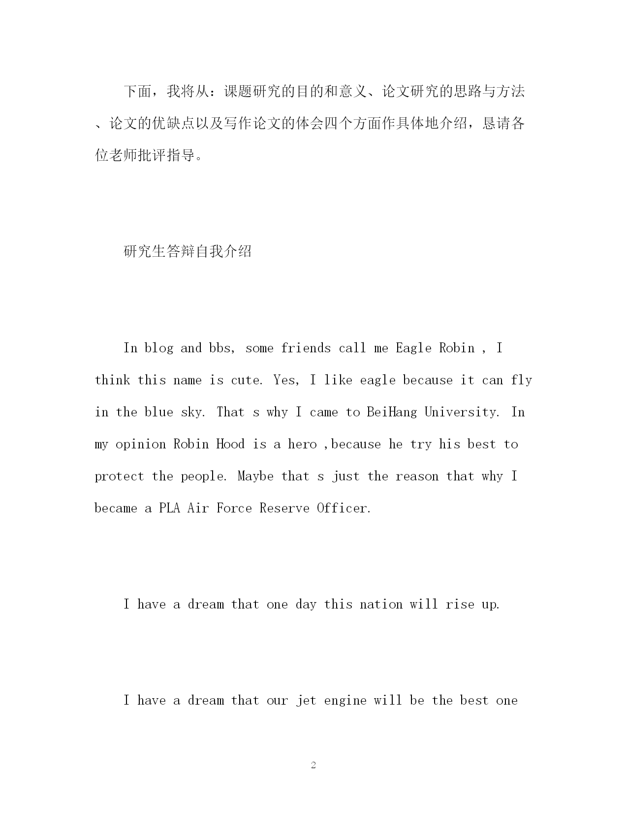 此资料由网络收集而来,如有侵权请告知上传者立即删除。资料共分享,我们负责传递知识。PAGEPAGE6研究生答辩自我介绍研究生答辩自我介绍范文答辩时该怎么做自我介绍呢?来看看优秀的范文吧。下面是小编收集整理的研究生答辩自我介绍,欢迎阅读借鉴,更多资讯请继续关注自我介绍栏目。研究生答辩自我介绍答辩委员会主席、各位评委老师:我是来自XXXX级财经学院会计系X班的学生XX,,主修会计学专业。我的论文指导老师是XXX老师。下面,我将从:课题研究的目的和意义、论文研究的思路与方法、论文的优缺点以及写作论文的体会四个方面作具体地介绍,恳请各位老师批评指导。研究生答辩自我介绍Inblogandbbs,somefriendscallmeEagleRobin,Ithinkthisnameiscute.Yes,Ilikeeaglebecauseitcanflyinthebluesky.ThatswhyIcametoBeiHangUniversity.InmyopinionRobinHoodisahero,becausehetryhisbesttoprotectthepeople.MaybethatsjustthereasonthatwhyIbecameaPLAAirForceReserveOfficer.Ihaveadreamthatonedaythisnationwillriseup.Ihaveadreamthatourjetenginewillbethebestoneintheworld.Thatsourhope.ForthatIhavethisdream,Illtrymybesttomakeittrue.Pleasegivemethechancetodosomethingformydream.Thankyou.研究生论文答辩自我介绍注意事项1、正式着装,站着讲述,以示尊重。答辩为研究生苦读三年的通关之日,学生对答辩的重视程度宜不亚于工作应聘、相亲见面、结婚典礼,因此应在答辩之日正式着装以示尊重。尽管通常答辩都在六月份,天气较热,应避免穿背心、拖鞋、休闲服,男的宜穿衬衫、西装(或打领带),女的着装宜庄重典雅,忌妖艳随便。此外,答辩人应如教师在讲台上、推销员在展台前,站着讲述。3、熟悉内容,讲而不读。论文讲述最忌读而不讲,使讲者枯燥,听者生厌,并让听众觉得答辩人还不熟悉已做了两三年的工作。因此,答辩人宜在讲述前熟悉内容,做到不看文字,娓娓道来,如数家珍,则效果倍增。4、语气自信而不狂妄,谦虚而不自卑。论文讲述时虽不必如传销人员演讲那样地鼓动人心,但言语之间也要透露出沉稳和自信,让人觉得声音宏亮有定力,内容充实有条理,思维清晰不纷乱,不要声音细弱无力,言语闪烁飘忽,也不要口若悬河,离题万里,或口气狂妄,目中无人,这样易引起听众反感。曾有一研究生,答辩时用英文PPT,答辩时有意暴晒其发表的.SCI论文,言语轻狂,口气颇大,说毕业论文制作如何容易,论文写作也毫不费力,一周即就,结果遭答辩委员会成员痛批,险些翻船。5、时间安排适当,内容重点突出。答辩时会给每个研究生的讲述规定一定时间,答辩人宜在规定时间内完整讲述其论文内容,做到时间安排适当,内容重点突出(结果分析为重点,创新点要突出)。为了做到这一点,最好预演一次或几次,充分听取同实验室的成员意见,调整论文报告时间进程,达到轻重适当,要而不繁。有些答辩人为了避免论文讲述后的刁难(提问),所以有意拖长论文报告时间,要挤兑提问时间,在答辩委员会的一再阻止下,仍不管不顾,这种状况让人觉得有些做贼心虚,无理取闹,答辩结果并不会好。6、回答问题有技巧,听取批评要谦虚。答辩委员会成员在提问和指正时,答辩人宜边听边记下要点,待问题结束后,先后逐条回答,问题回答要到位,不要拖泥带水,忌答非所问,忌顶嘴反问;听取批评意见要面露微笑,谦虚诚恳,忌轻慢无礼,闻过则恼。7、开始与结束时要致谢。论文答辩开始与结束时要向答辩委员会成员致谢,是最起码的礼节。