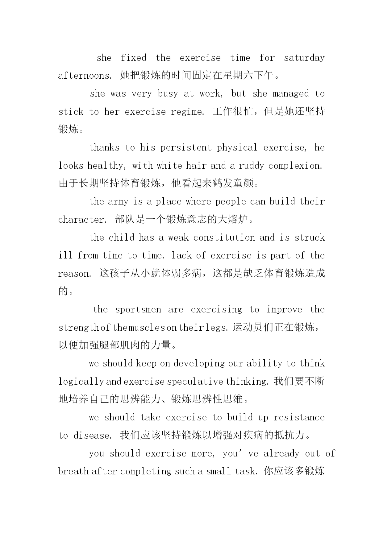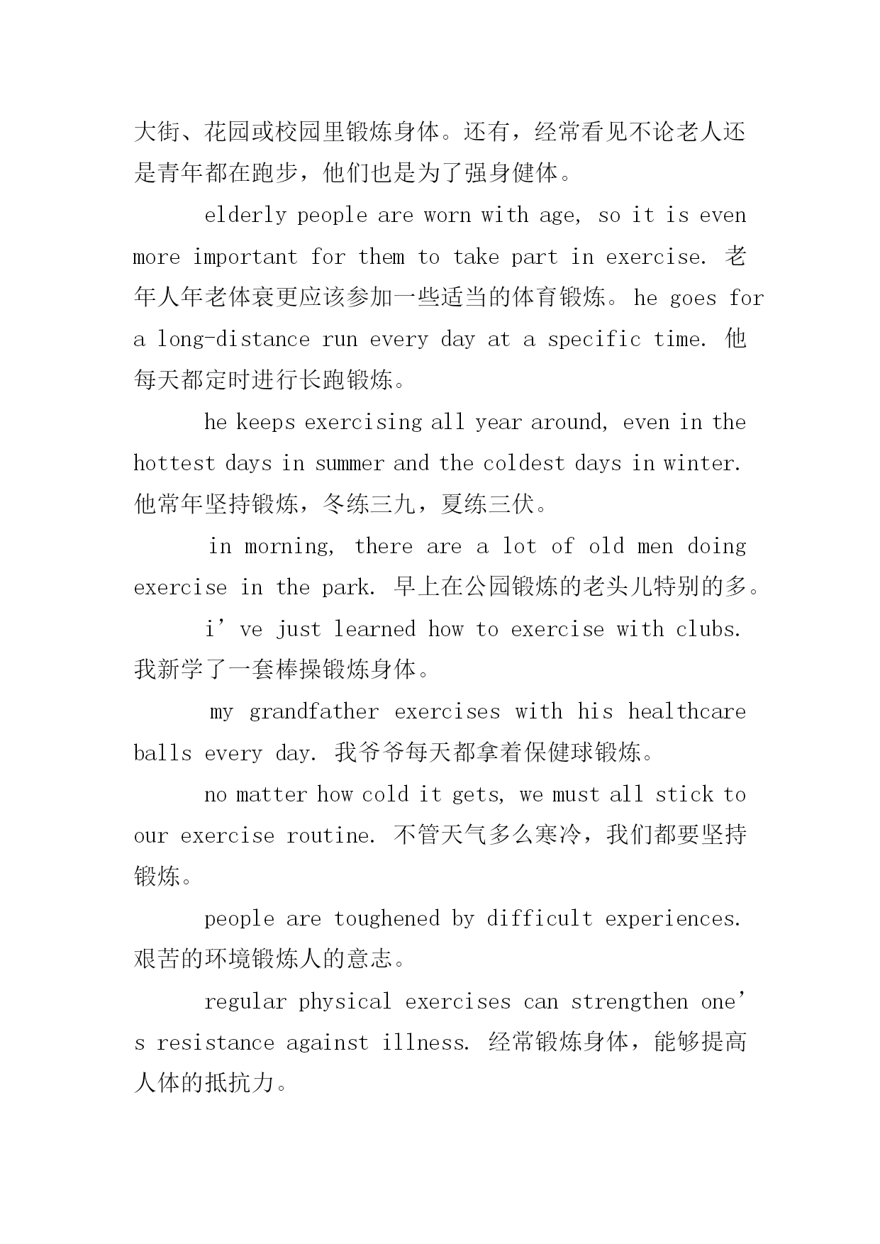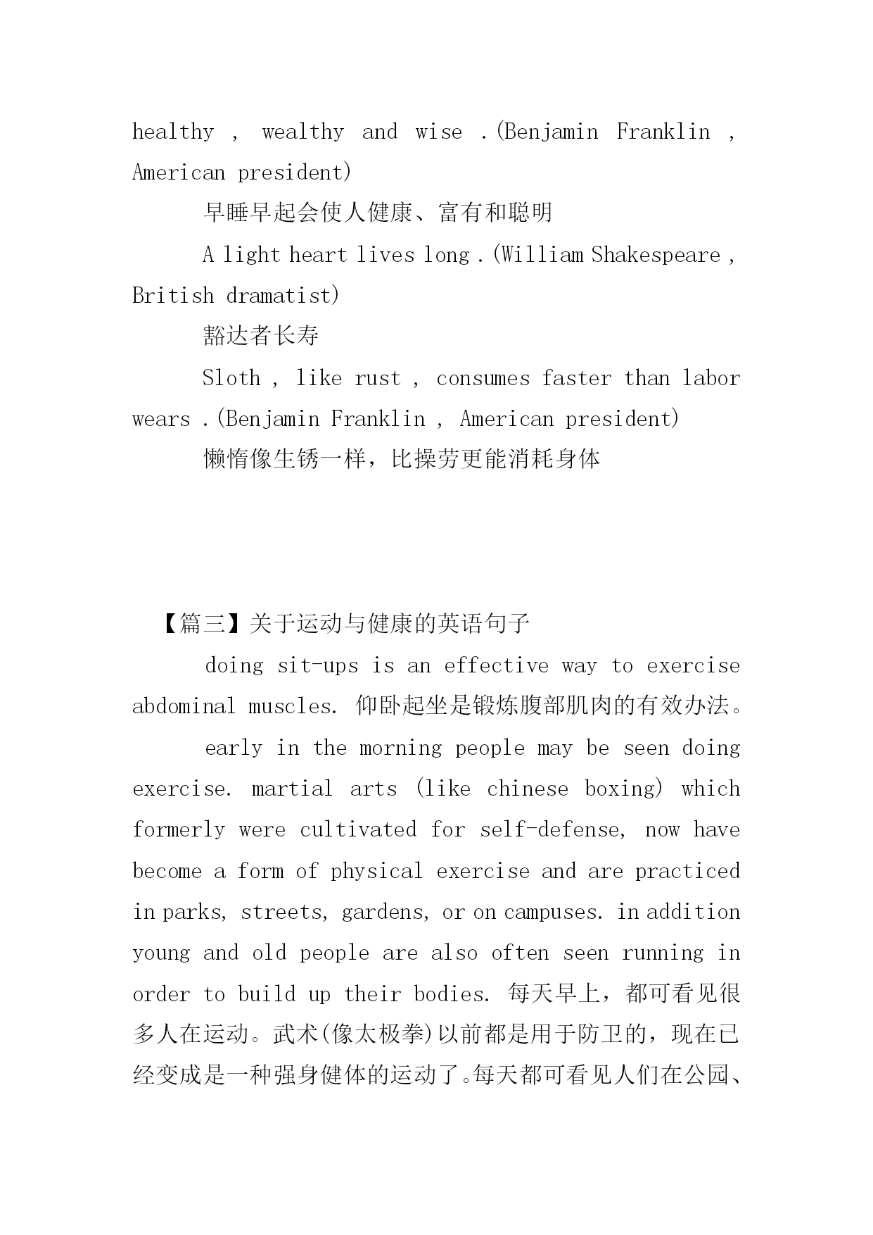 关于运动与健康的英语句子【篇一】关于运动与健康的英语句子I’vejustlearnedhowtoexercisewithclubs.我新学了一套棒操锻炼身体。Mygrandfatherexerciseswithhishealthcareballseveryday.我爷爷每天都拿着保健球锻炼。Nomatterhowcolditgets,wemustallsticktoourexerciseroutine.不管天气多么寒冷,我们都要坚持锻炼。Peoplearetoughenedbydifficultexperiences.艰苦的环境锻炼人的意志。Regularphysicalexercisescanstrengthenone’sresistanceagainstillness.经常锻炼身体,能够提高人体的抵抗力。ShefixedtheexercisetimeforSaturdayafternoons.她把锻炼的时间固定在星期六下午。Shewasverybusyatwork,butshemanagedtosticktoherexerciseregime.工作很忙,但是她还坚持锻炼。Thankstohispersistentphysicalexercise,helookshealthy,withwhitehairandaruddycomplexion.由于长期坚持体育锻炼,他看起来鹤发童颜。【篇二】关于运动与健康的英语句子Aclosemouthcatchesnoflies.病从口入。Anappleadaykeepsthedoctoraway.一天一苹果,不用请医生。Anounceofpreventionisworthapoundofcure.预防为主,治疗为辅。Asoundmindinasoundbody.健全的精神寓于健康的身体。Earlytobedandearlytorisemakesamanhealthy,wealthyandwise.早睡早起身体好。Preventionisbetterthancure.预防胜于治疗。Readingistothemindwhileexercisetothebody.读书健脑,运动强身。Timecuresallthings.时间是医治一切创伤的良药。Thefirstwealthishealth.(RalphWaldoEmerson,Americanthinker)健康是人生第一财富Earlytobedandearlytorise,makesamanhealthy,wealthyandwise.(BenjaminFranklin,Americanpresident)早睡早起会使人健康、富有和聪明Alightheartliveslong.(WilliamShakespeare,Britishdramatist)豁达者长寿Sloth,likerust,consumesfasterthanlaborwears.(BenjaminFranklin,Americanpresident)懒惰像生锈一样,比操劳更能消耗身体【篇三】关于运动与健康的英语句子doingsit-upsisaneffectivewaytoexerciseabdominalmuscles.仰卧起坐是锻炼腹部肌肉的有效办法。earlyinthemorningpeoplemaybeseendoingexercise.martialarts(likechineseboxing)whichformerlywerecultivatedforself-defense,nowhavebecomeaformofphysicalexerciseandarepracticedinparks,streets,gardens,oroncampuses.inadditionyoungandoldpeoplearealsooftenseenrunninginordertobuilduptheirbodies.每天早上,都可看见很多人在运动。武术(像太极拳)以前都是用于防卫的,现在已经变成是一种强身健体的运动了。每天都可看见人们在公园、大街、花园或校园里锻炼身体。还有,经常看见不论老人还是青年都在跑步,他们也是为了强身健体。elderlypeoplearewornwithage,soitisevenmoreimportantforthemtotakepartinexercise.老年人年老体衰更应该参加一些适当的体育锻炼。hegoesforalong-distanceruneverydayata