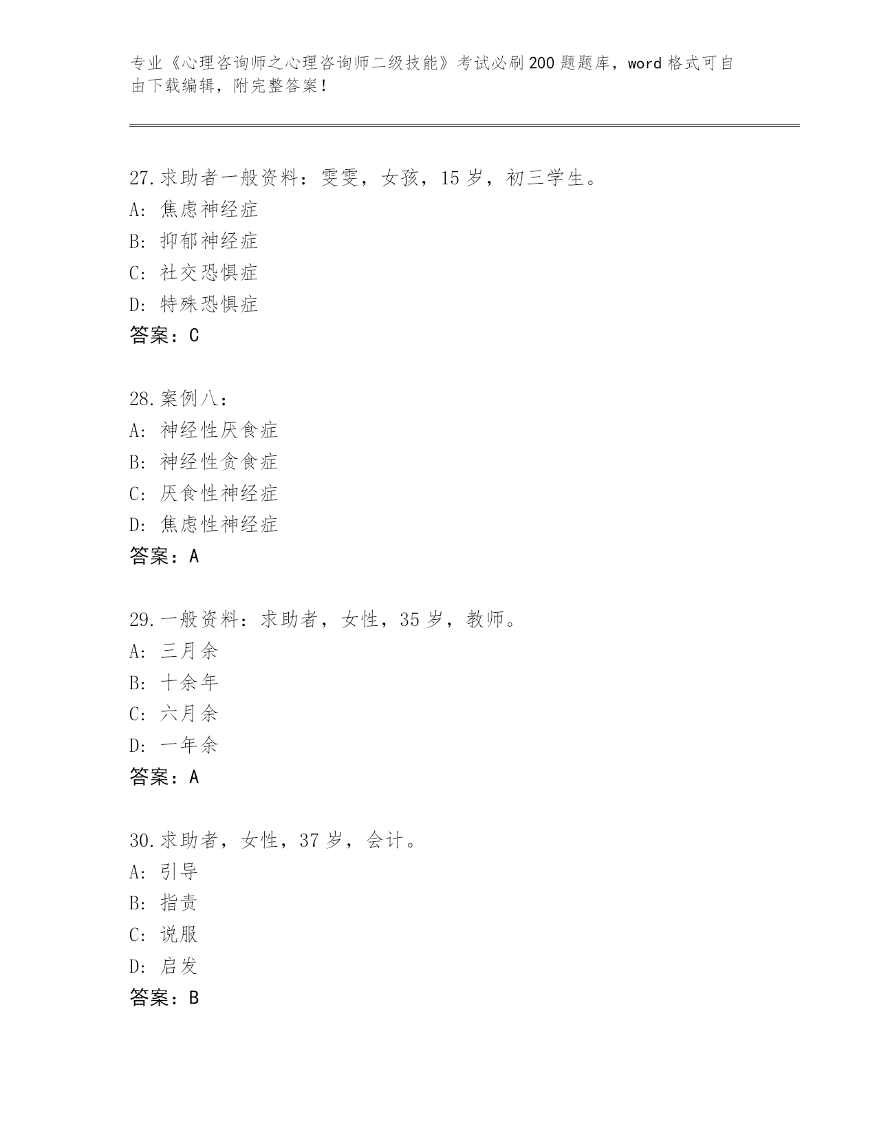 江西省历年《心理咨询师之心理咨询师二级技能》考试必刷200题题库汇编
