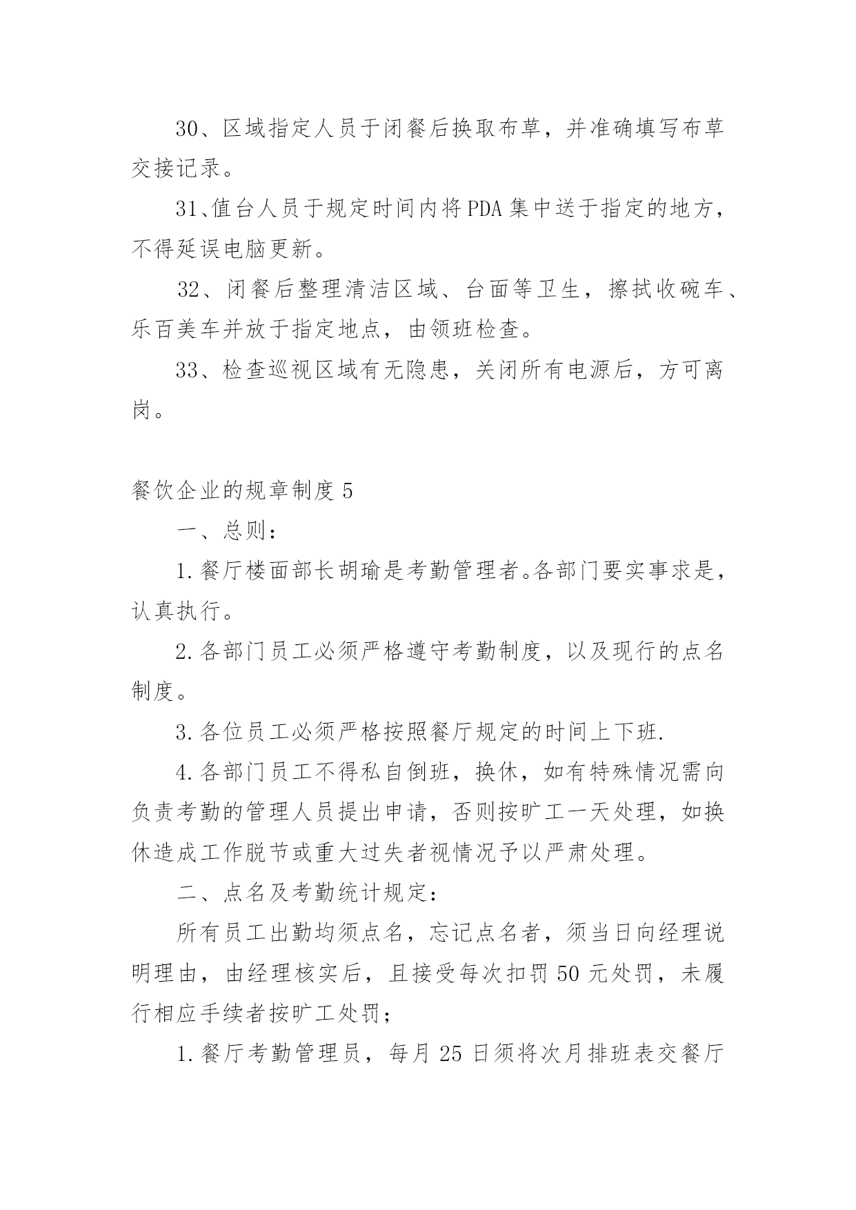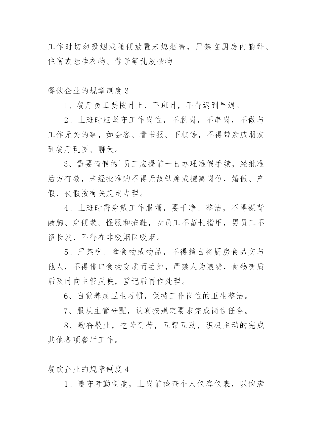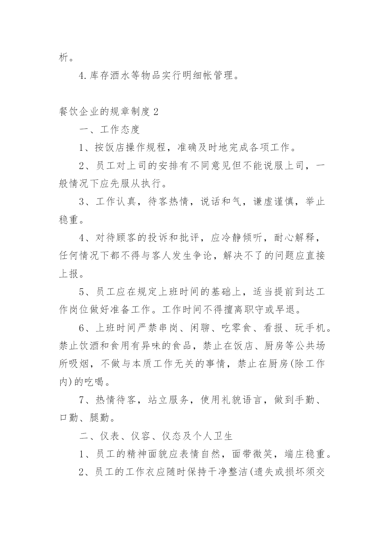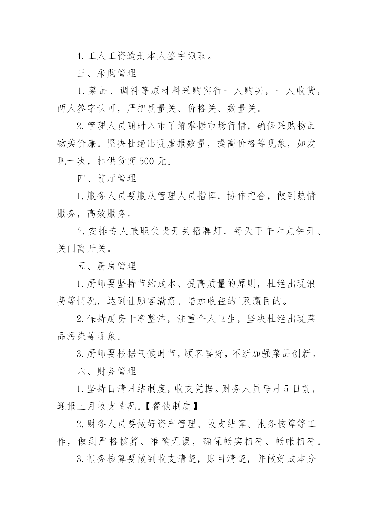 餐饮企业的规章制度餐饮企业的规章制度10篇在日新月异的现代社会中,制度对人们来说越来越重要,制度是指在特定社会范围内统一的、调节人与人之间社会关系的一系列习惯、道德、法律(包括宪法和各种具体法规)、戒律、规章(包括政府制定的条例)等的总和它由社会认可的非正式约束、国家规定的正式约束和实施机制三个部分构成。相信很多朋友都对拟定制度感到非常苦恼吧,以下是小编为大家收集的餐饮企业的规章制度,仅供参考,大家一起来看看吧。餐饮企业的规章制度1一、收入管理1.点菜单、加菜单、酒水单专门印制(印制通号),实行专人管理,连号结算。2.收银员每天做好收入明细帐,在当天的业务结束后将现金如数存入指定银行账户,并将银行存款单与收入单据一并交财务人员。二、支出管理1.严格实行收支两条线,杜绝坐收坐支。2.货款实行按15天/次结算,由两人到场,按据付款,签字认可。3.水、电、气、税收等按正式发票结算。4.工人工资造册本人签字领取。三、采购管理1.菜品、调料等原材料采购实行一人购买,一人收货,两人签字认可,严把质量关、价格关、数量关。2.管理人员随时入市了解掌握市场行情,确保采购物品物美价廉。坚决杜绝出现虚报数量,提高价格等现象,如发现一次,扣供货商500元。四、前厅管理1.服务人员要服从管理人员指挥,协作配合,做到热情服务,高效服务。2.安排专人兼职负责开关招牌灯,每天下午六点钟开、关门离开关。五、厨房管理1.厨师要坚持节约成本、提高质量的原则,杜绝出现浪费等情况,达到让顾客满意、增加收益的'双赢目的。2.保持厨房干净整洁,注重个人卫生,坚决杜绝出现菜品污染等现象。3.厨师要根据气候时节,顾客喜好,不断加强菜品创新。六、财务管理1.坚持日清月结制度,收支凭据。财务人员每月5日前,通报上月收支情况。【餐饮制度】2.财务人员要做好资产管理、收支结算、帐务核算等工作,做到严格核算、准确无误,确保帐实相符、帐帐相符。3.帐务核算要做到收支清楚,账目清楚,并做好成本分析。4.库存酒水等物品实行明细帐管理。餐饮企业的规章制度2一、工作态度1、按饭店操作规程,准确及时地完成各项工作。2、员工对上司的安排有不同意见但不能说服上司,一般情况下应先服从执行。3、工作认真,待客热情,说话和气,谦虚谨慎,举止稳重。4、对待顾客的投诉和批评,应冷静倾听,耐心解释,任何情况下都不得与客人发生争论,解决不了的问题应直接上报。5、员工应在规定上班时间的基础上,适当提前到达工作岗位做好准备工作。工作时间不得擅离职守或早退。6、上班时间严禁串岗、闲聊、吃零食、看报、玩手机。禁止饮酒和食用有异味的食品,禁止在饭店、厨房等公共场所吸烟,不做与本质工作无关的事情,禁止在厨房(除工作内)的吃喝。7、热情待客,站立服务,使用礼貌语言,做到手勤、口勤、腿勤。二、仪表、仪容、仪态及个人卫生1、员工的精神面貌应表情自然,面带微笑,端庄稳重。2、员工的工作衣应随时保持干净整洁(遗失或损坏须交付服装成本费)3、男员工应修面,头发不能过耳及衣领,女员工应梳理好头发、干净整洁,不能涂指甲,不能戴戒指4、工作时间内不剪指甲抠鼻、剔牙,打哈欠、喷嚏应用手遮掩,应保持安静,禁止大声喧哗,做到说话轻,走路轻,操作轻。三、出勤1、员工必须依照饭店管理者安排的班次上班,须调班调休须征得主管允许2、员工上班迟到、早退、将视当时情节,管理者的.决定扣除工资,如有急事不能上班,应征得管理者的认可方可离开,否则按旷工(旷工一天算三天)处理。3、员工在工作时间未经批准不得离店。4、员工辞职应提前(30天)向管理者提出申请,经批准后方可离开,如员工无任何过失,饭店将发还一切应有工资,如发生严重违反饭店规章制度旷工三天以上服务态度恶劣,责任心不强,上班态度、行动懒散拖拉,给饭店带来严重影响者和同事、客人打骂斗殴者。则扣除或不发工资。四、奖惩1、饭店对改进管理,提高服务质量和经济效益有突出表现的,在日常工作中,创出优异成绩者,给予嘉奖。2、对违反饭店规章制度的员工则会视当时情况扣发工资。五、安全问题1、遵守有关场所禁烟的规定。2、不准在灶台或高瓦数电灯附近放置易燃易爆物品。3、任何员工发现还在冒烟的烟头都应立即把它熄灭,如发现电线松动、磨损、折断,电源插座和电器的破损等情况,都应立即上报,以便及时处理维修。六、后厨管理1、厨师上班前必须检查燃油管道、燃烧器开关等设施的安全状况,如发现泄露应关闭阀门,报告上司。下班前必须检查所有厨房设备,关掉所有阀门开关。2、厨房必须清洁,工作人员工作前方便后应彻底洗手,保持双手的清洁。工作时,工作人员应穿戴整洁,不得留长发长指甲,工作时避免让手接触或沾染成品食物。3、工作人员应随时清理染有油污的抹布纸屑等杂物,随时清理炉灶油垢。操作间的卫生应随时打扫,抽油烟的设备及其他的各种设备餐用具等应定期清洁,保