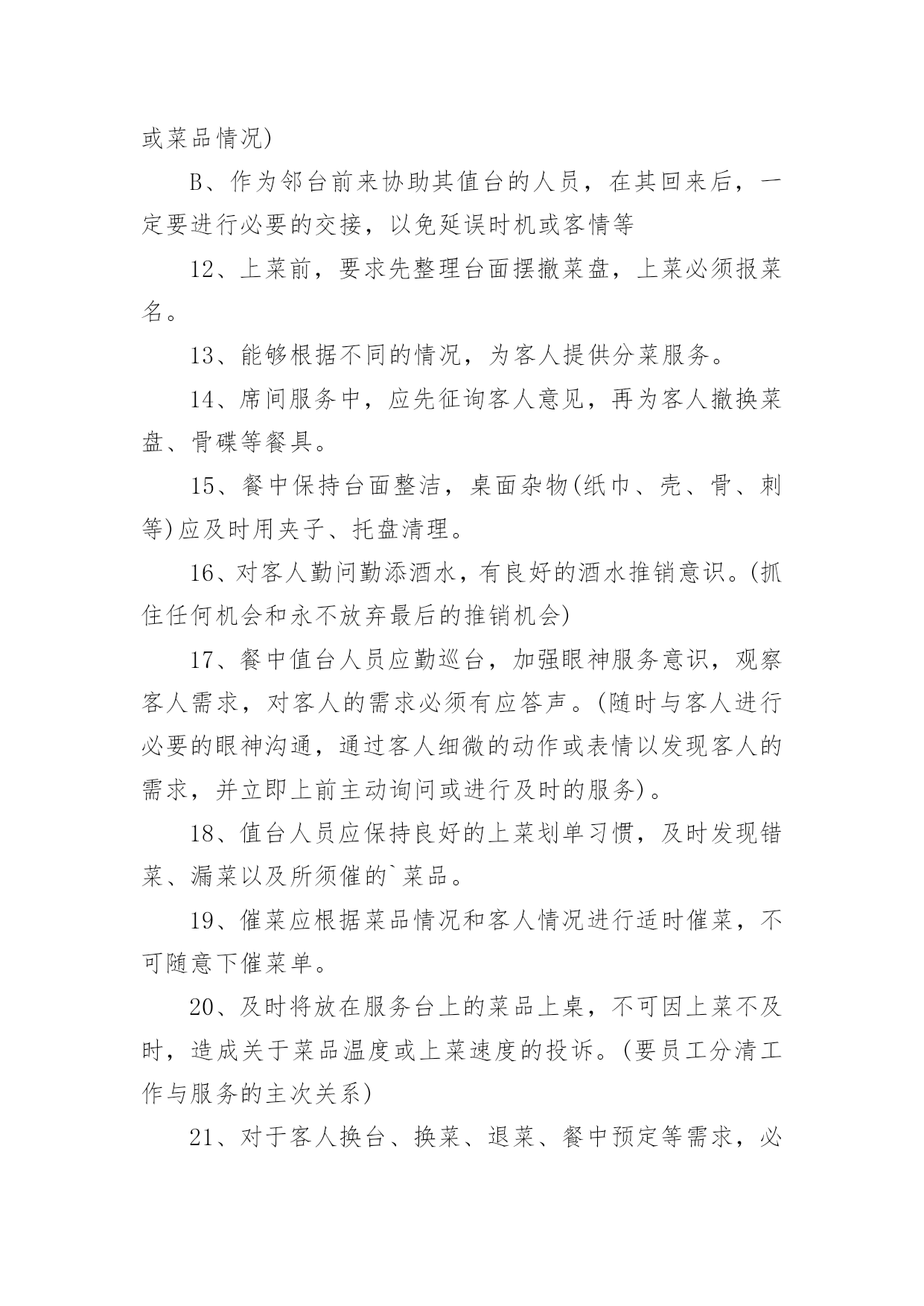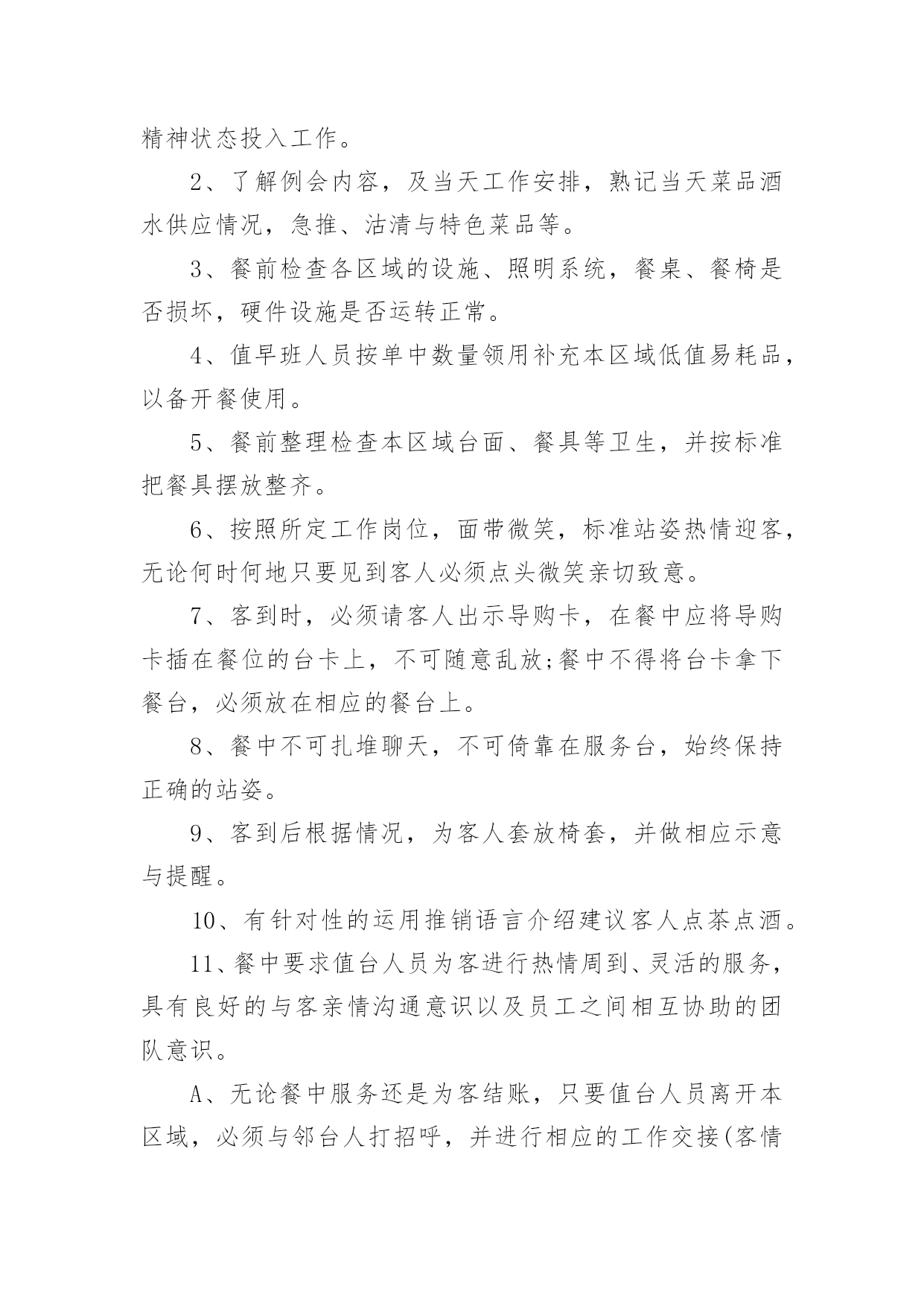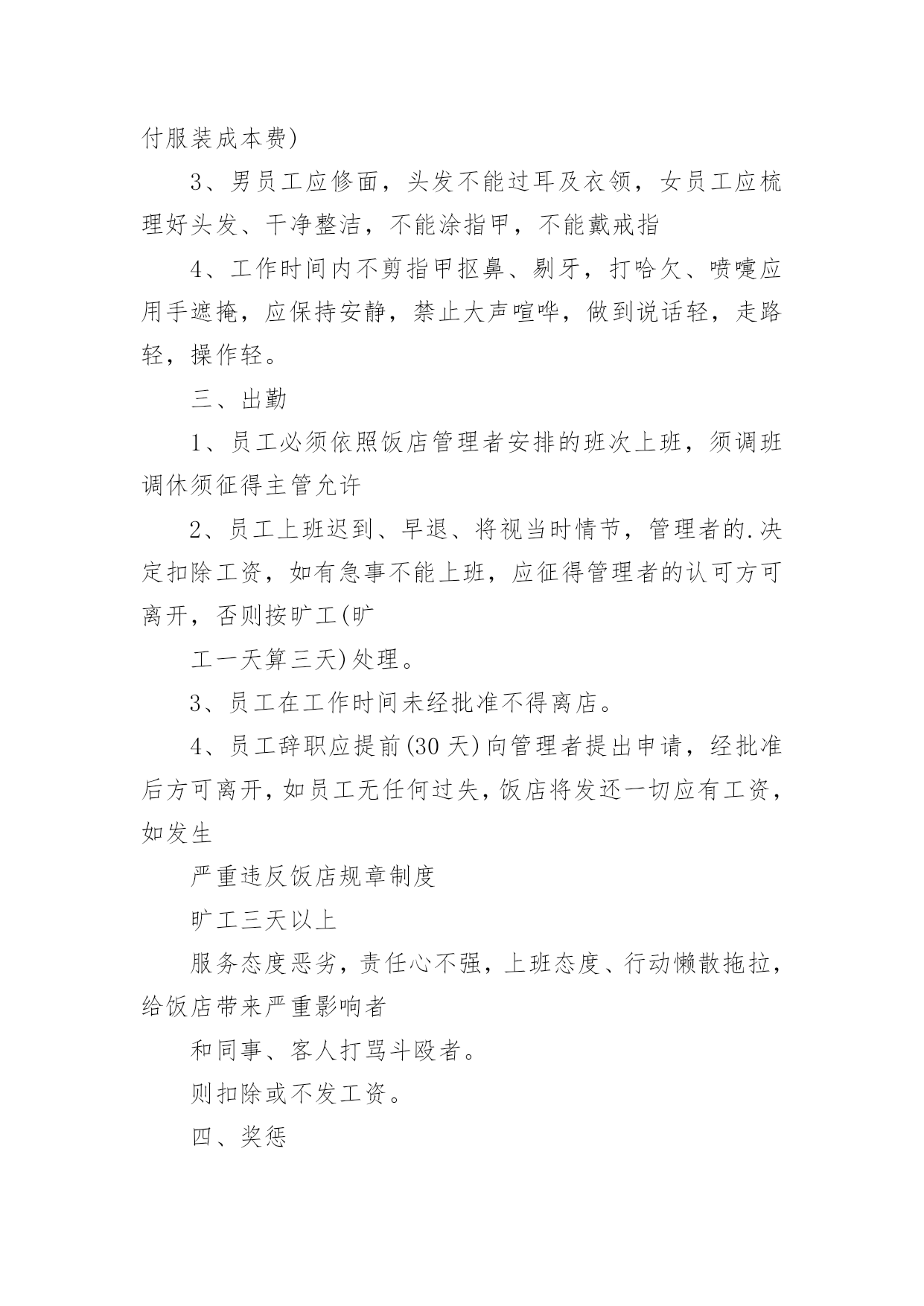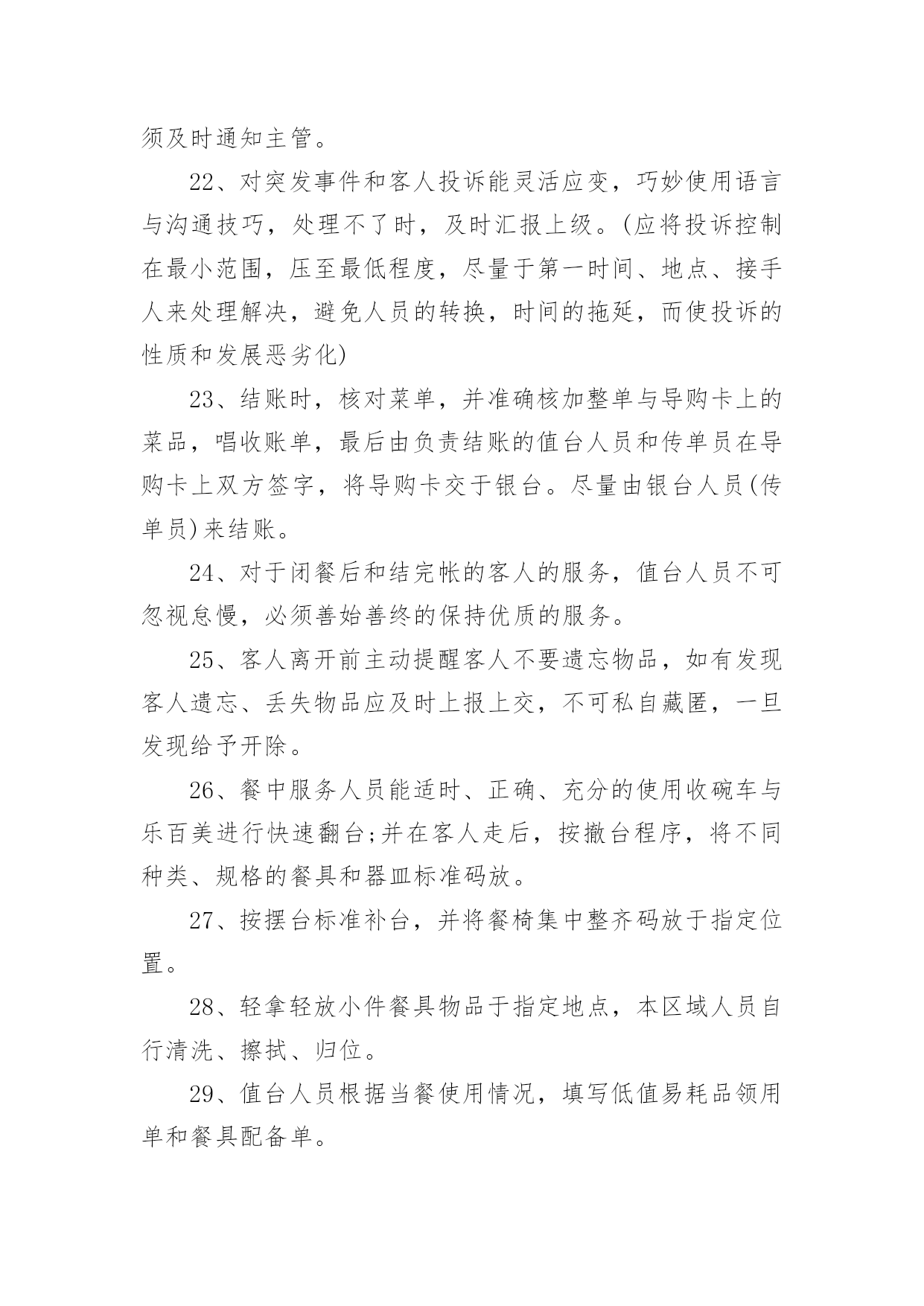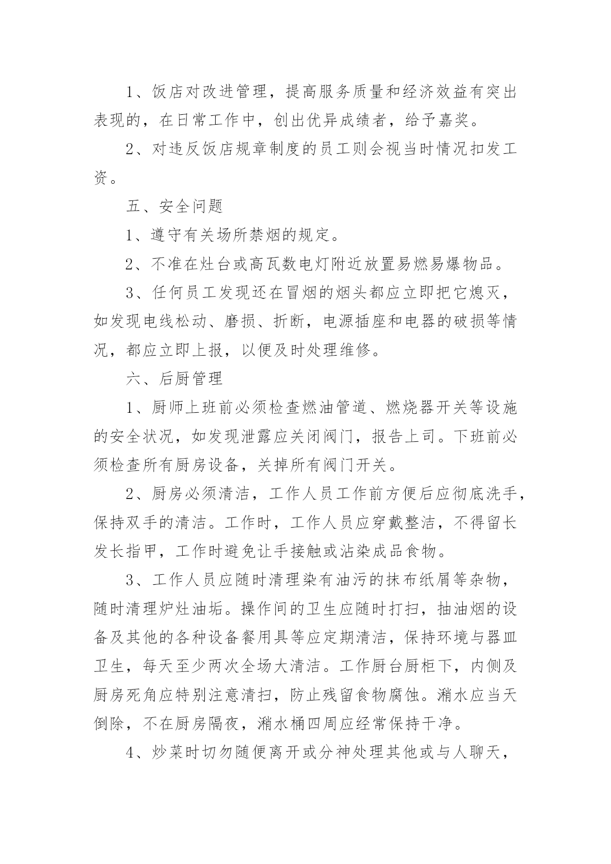 餐饮企业的规章制度餐饮企业的规章制度10篇在日新月异的现代社会中,制度对人们来说越来越重要,制度是指在特定社会范围内统一的、调节人与人之间社会关系的一系列习惯、道德、法律(包括宪法和各种具体法规)、戒律、规章(包括政府制定的条例)等的总和它由社会认可的非正式约束、国家规定的正式约束和实施机制三个部分构成。相信很多朋友都对拟定制度感到非常苦恼吧,以下是小编为大家收集的餐饮企业的规章制度,仅供参考,大家一起来看看吧。餐饮企业的规章制度1一、收入管理1.点菜单、加菜单、酒水单专门印制(印制通号),实行专人管理,连号结算。2.收银员每天做好收入明细帐,在当天的业务结束后将现金如数存入指定银行账户,并将银行存款单与收入单据一并交财务人员。二、支出管理1.严格实行收支两条线,杜绝坐收坐支。2.货款实行按15天/次结算,由两人到场,按据付款,签字认可。3.水、电、气、税收等按正式发票结算。4.工人工资造册本人签字领取。三、采购管理1.菜品、调料等原材料采购实行一人购买,一人收货,两人签字认可,严把质量关、价格关、数量关。2.管理人员随时入市了解掌握市场行情,确保采购物品物美价廉。坚决杜绝出现虚报数量,提高价格等现象,如发现一次,扣供货商500元。四、前厅管理1.服务人员要服从管理人员指挥,协作配合,做到热情服务,高效服务。2.安排专人兼职负责开关招牌灯,每天下午六点钟开、关门离开关。五、厨房管理1.厨师要坚持节约成本、提高质量的原则,杜绝出现浪费等情况,达到让顾客满意、增加收益的'双赢目的。2.保持厨房干净整洁,注重个人卫生,坚决杜绝出现菜品污染等现象。3.厨师要根据气候时节,顾客喜好,不断加强菜品创新。六、财务管理1.坚持日清月结制度,收支凭据。财务人员每月5日前,通报上月收支情况。【餐饮制度】2.财务人员要做好资产管理、收支结算、帐务核算等工作,做到严格核算、准确无误,确保帐实相符、帐帐相符。3.帐务核算要做到收支清楚,账目清楚,并做好成本分析。4.库存酒水等物品实行明细帐管理。餐饮企业的规章制度2一、工作态度1、按饭店操作规程,准确及时地完成各项工作。2、员工对上司的安排有不同意见但不能说服上司,一般情况下应先服从执行。3、工作认真,待客热情,说话和气,谦虚谨慎,举止稳重。4、对待顾客的投诉和批评,应冷静倾听,耐心解释,任何情况下都不得与客人发生争论,解决不了的问题应直接上报。5、员工应在规定上班时间的基础上,适当提前到达工作岗位做好准备工作。工作时间不得擅离职守或早退。6、上班时间严禁串岗、闲聊、吃零食、看报、玩手机。禁止饮酒和食用有异味的食品,禁止在饭店、厨房等公共场所吸烟,不做与本质工作无关的事情,禁止在厨房(除工作内)的吃喝。7、热情待客,站立服务,使用礼貌语言,做到手勤、口勤、腿勤。二、仪表、仪容、仪态及个人卫生1、员工的精神面貌应表情自然,面带微笑,端庄稳重。2、员工的工作衣应随时保持干净整洁(遗失或损坏须交付服装成本费)3、男员工应修面,头发不能过耳及衣领,女员工应梳理好头发、干净整洁,不能涂指甲,不能戴戒指4、工作时间内不剪指甲抠鼻、剔牙,打哈欠、喷嚏应用手遮掩,应保持安静,禁止大声喧哗,做到说话轻,走路轻,操作轻。三、出勤1、员工必须依照饭店管理者安排的班次上班,须调班调休须征得主管允许2、员工上班迟到、早退、将视当时情节,管理者的.决定扣除工资,如有急事不能上班,应征得管理者的认可方可离开,否则按旷工(旷工一天算三天)处理。3、员工在工作时间未经批准不得离店。4、员工辞职应提前(30天)向管理者提出申请,经批准后方可离开,如员工无任何过失,饭店将发还一切应有工资,如发生严重违反饭店规章制度旷工三天以上服务态度恶劣,责任心不强,上班态度、行动懒散拖拉,给饭店带来严重影响者和同事、客人打骂斗殴者。则扣除或不发工资。四、奖惩1、饭店对改进管理,提高服务质量和经济效益有突出表现的,在日常工作中,创出优异成绩者,给予嘉奖。2、对违反饭店规章制度的员工则会视当时情况扣发工资。五、安全问题1、遵守有关场所禁烟的规定。2、不准在灶台或高瓦数电灯附近放置易燃易爆物品。3、任何员工发现还在冒烟的烟头都应立即把它熄灭,如发现电线松动、磨损、折断,电源插座和电器的破损等情况,都应立即上报,以便及时处理维修。六、后厨管理1、厨师上班前必须检查燃油管道、燃烧器开关等设施的安全状况,如发现泄露应关闭阀门,报告上司。下班前必须检查所有厨房设备,关掉所有阀门开关。2、厨房必须清洁,工作人员工作前方便后应彻底洗手,保持双手的清洁。工作时,工作人员应穿戴整洁,不得留长发长指甲,工作时避免让手接触或沾染成品食物。3、工作人员应随时清理染有油污的抹布纸屑等杂物,随时清理炉灶油垢。操作间的卫生应随时打扫,抽油烟的设备及其他的各种设备餐用具等应定期清洁,保
