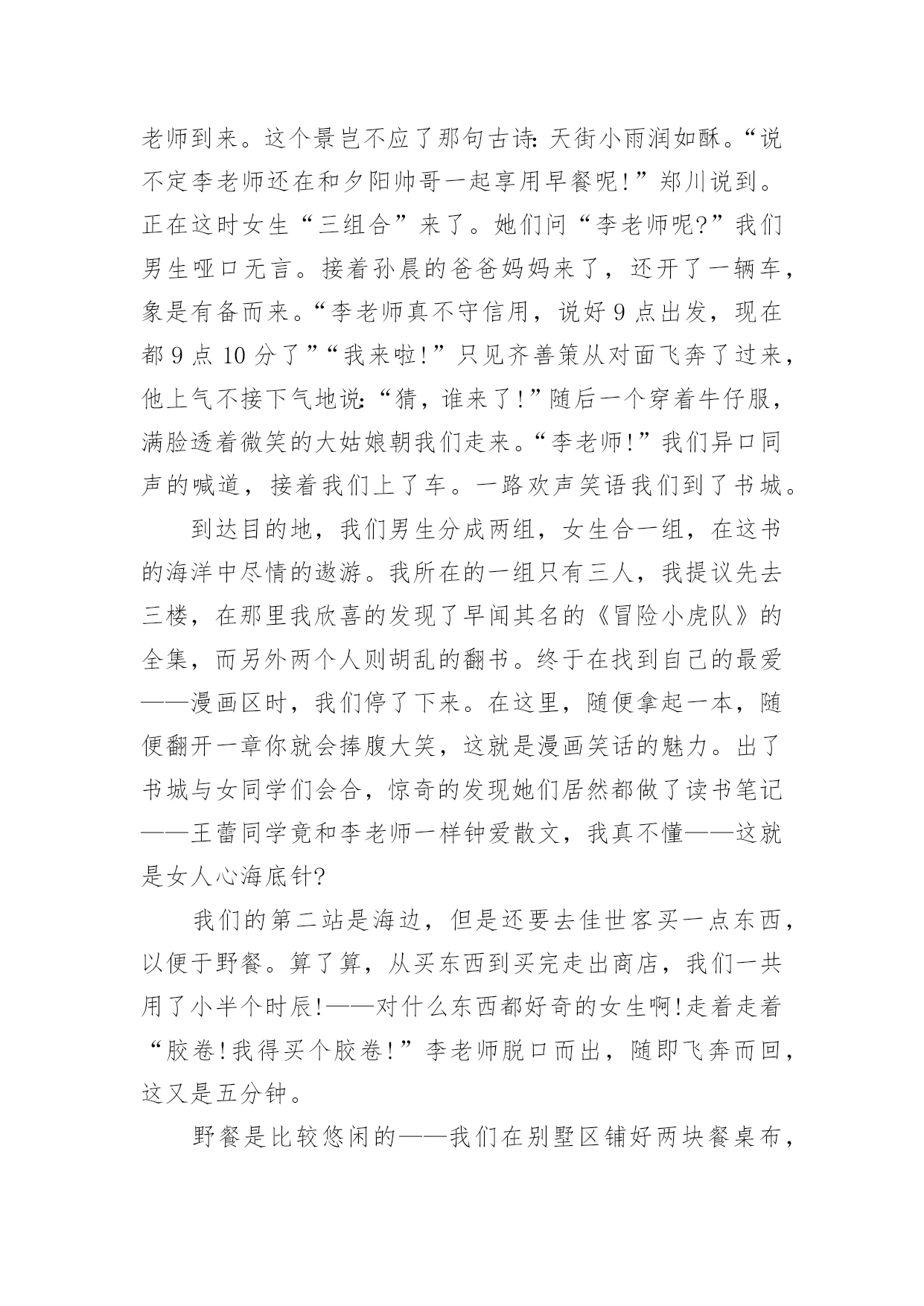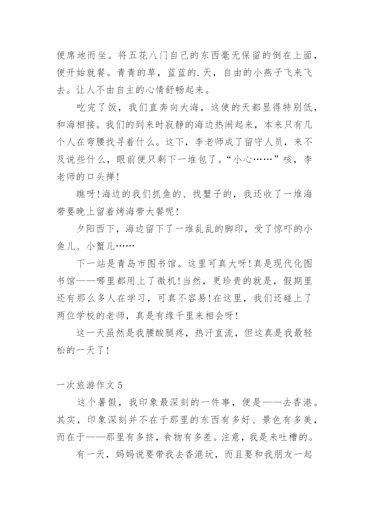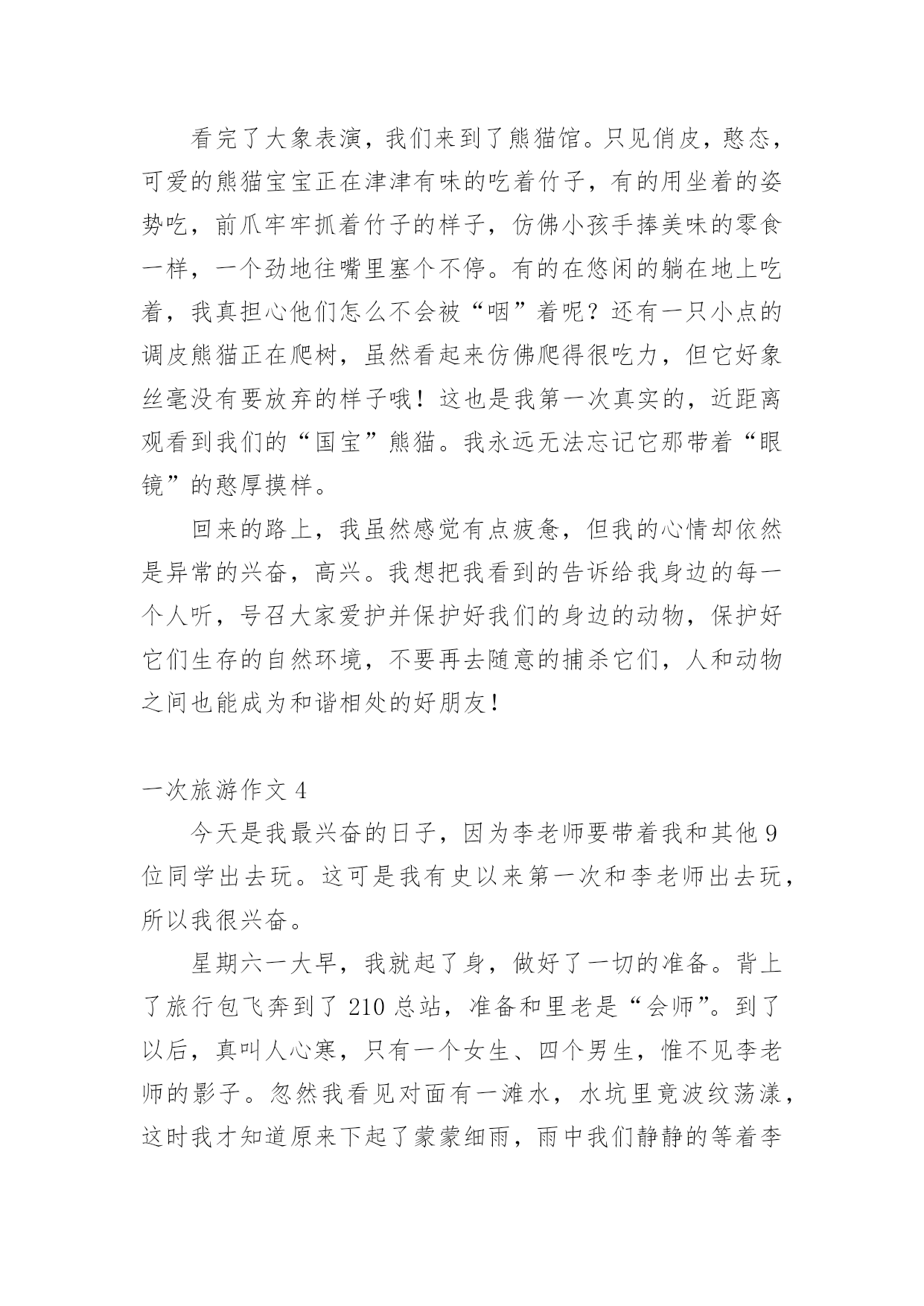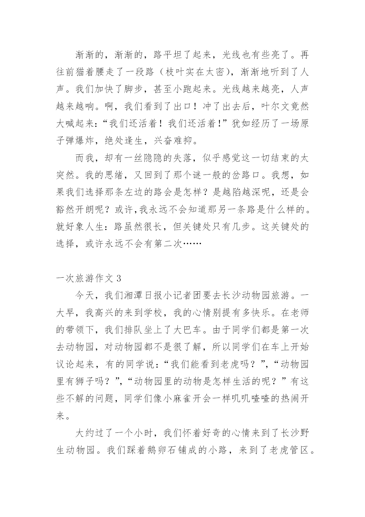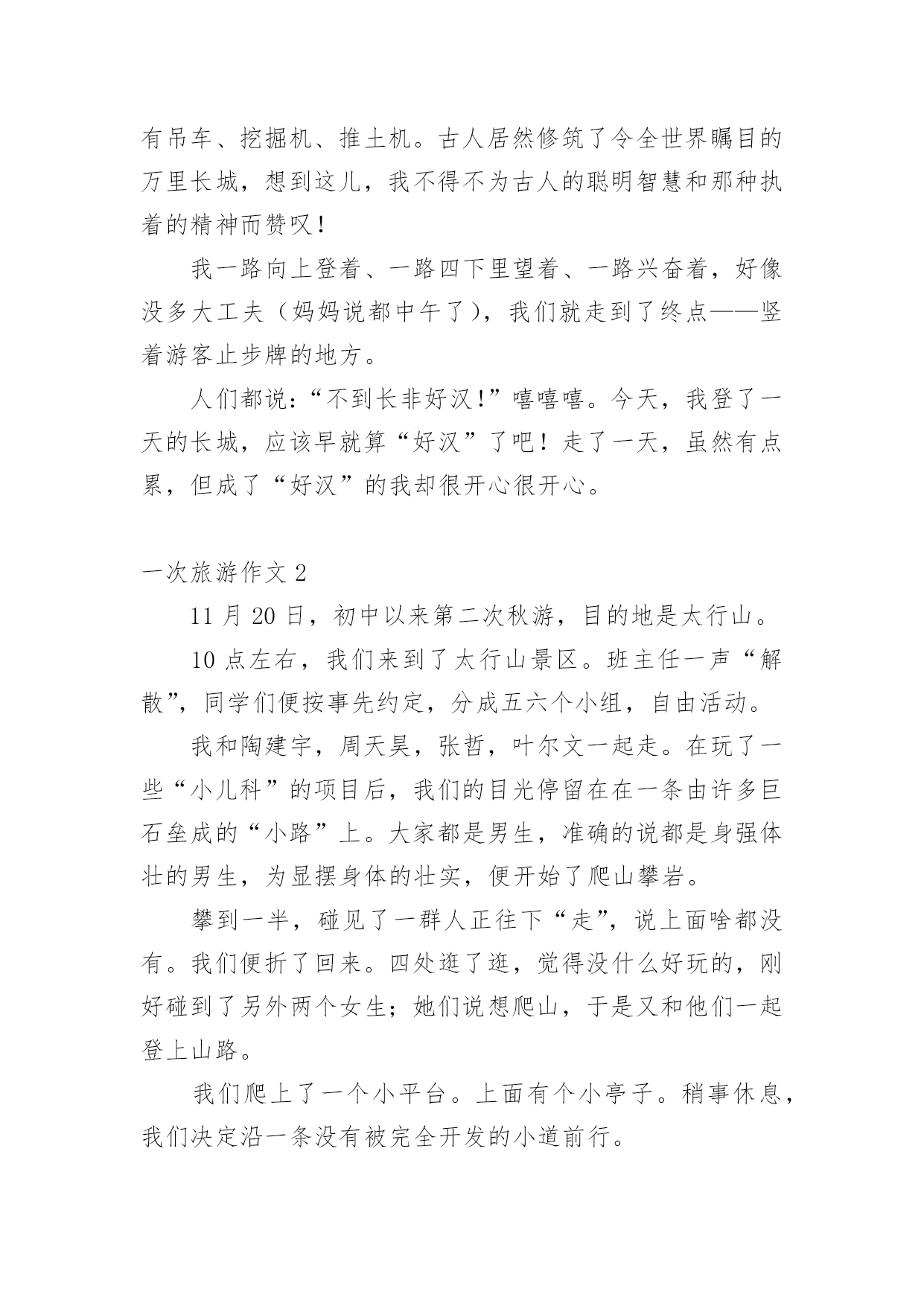 一次旅游作文一次旅游作文优秀(6篇)无论是在学校还是在社会中,大家总少不了接触作文吧,借助作文可以提高我们的语言组织能力。那么你知道一篇好的作文该怎么写吗?下面是小编精心整理的一次旅游作文,希望能够帮助到大家。一次旅游作文1哇噻!今天又是一个美丽的日子,一大早,妈妈就宣布——今天我们登长城!吃过早饭后,我们坐上公交车走啊走啊,走得在高速路上我都看到距呼和浩特还有400多公里的路标了居然还没到长城,又走了好一阵,车子终于“嘎吱”一声停了下来——八达岭长城到了。站在长城的脚下,我抬头望去,天呢!长城真比巨龙还巨龙呢!我使劲儿伸长脖子,用力眺望,也没能望到它的头和尾在哪儿,我想:就算我拿天文望远镜也不一定能望到它的尽头吧!我激动地看着想着走着,不知不觉已经登上了长城。沿着城墙,我一步步地往前上走,一步步的向上登,脑子里的疑问也在随着脚步往上升,“妈妈!”我终于忍不住问道:“这城墙上开着的往下斜的小洞是干嘛用的呀?还有这城墙为什么一凹一凸而不砌成齐刷刷的呢?是为了节省用料吗?”“呵呵。”妈妈笑道:“怎么会是为了节约用料呢?”长城是为了防御敌人入侵而修建的,长城上的所以设施都是为了更好地打击敌人,这城墙上凹进去的部分打仗时说不定可以做炮台呢!那些小洞。妈妈的话还没说完,我忽然灵机一动,激动地说道:“噢,那些小洞大概是躲在那儿射箭用的吧!”说着,我还做了个拉弓射箭的姿势,“妈妈,您看,这样既可以保证自己不受伤,又能狠狠地射击敌人,我说得没错吧?”我的意地说道。“嗯,大概是吧!也或许还有别的用途。”我和妈妈一边走一边聊,一会儿的工夫,我们就来到了第一个烽火台。哇!这里风好大呀!据说烽火台主要是用于白天点烟或夜间点火来传递军情的,有了这么大的风,我想当年点烟时这里一定是浓烟滚滚,点火时也一定是火光冲天,军情传递的'那是相当的及时吧!因为风大,虽然现在正值炎热的夏天,可来到这儿却好像进了冰窖一样,浑身凉飕飕的!站在烽火台的窗口,向远处望去,在延绵起伏的山上,“巨龙”仿佛走进了森林一般,到处都是生机勃勃的绿色。我和老妈坐在烽火台的石阶上歇了一会儿就继续往上登了。穿过一段斜坡,又登上一大截几乎陡成了90度的台阶,再爬上一段必须要抓着扶手才能走上的陡坡,我们终于来到了第二个烽火台。第三个烽火台。可越走我这心里越纳闷,我们空手登长城都这么费劲,这长城是咋修的呀?当时又没有吊车、挖掘机、推土机。古人居然修筑了令全世界瞩目的万里长城,想到这儿,我不得不为古人的聪明智慧和那种执着的精神而赞叹!我一路向上登着、一路四下里望着、一路兴奋着,好像没多大工夫(妈妈说都中午了),我们就走到了终点——竖着游客止步牌的地方。人们都说:“不到长非好汉!”嘻嘻嘻。今天,我登了一天的长城,应该早就算“好汉”了吧!走了一天,虽然有点累,但成了“好汉”的我却很开心很开心。一次旅游作文211月20日,初中以来第二次秋游,目的地是太行山。10点左右,我们来到了太行山景区。班主任一声“解散”,同学们便按事先约定,分成五六个小组,自由活动。我和陶建宇,周天昊,张哲,叶尔文一起走。在玩了一些“小儿科”的项目后,我们的目光停留在在一条由许多巨石垒成的“小路”上。大家都是男生,准确的说都是身强体壮的男生,为显摆身体的壮实,便开始了爬山攀岩。攀到一半,碰见了一群人正往下“走”,说上面啥都没有。我们便折了回来。四处逛了逛,觉得没什么好玩的,刚好碰到了另外两个女生;她们说想爬山,于是又和他们一起登上山路。我们爬上了一个小平台。上面有个小亭子。稍事休息,我们决定沿一条没有被完全开发的小道前行。小道很曲折。周围全都是深绿的`植被。高高低低,枝叶全都伸到了小道上。小道的路面若隐若现,如草蛇灰线,很是神秘。起先,大家有说有笑。因为路很平坦,是人都会走。张哲和叶尔文还装神弄鬼,有时还恶作剧,突然尖叫:“啊!救命啊!”可渐渐地,大家都认真起来了。因为路越来越陡,越来越难走。稍稍不注意,就会滑跤或被树枝刮破手脚。小路时高时低,时坦时陡,不知通向何方。渐渐的,我们感到有些迷茫,不知是不是越走越深了。周围静悄悄的,偶尔才能听到几声虫鸣,还有就是我们脚下枯叶发出的沙沙声。突然,只听罗欣雨一声惨叫。我回头看去,只见她跌坐在一块地上。好在并没有摔伤,更庆幸的是作为女生,她也没哭;但确实为我们敲响了警钟。渐渐的,光线越来越幽暗。我们好像已经走到了山的最深处。不过最让我担心的不是山路陡峭,而是草木茂密,万一碰到蛇、蜈蚣、蜘蛛之类的不速之客,没有人知道该怎么对付。一阵风刮过,微微出汗的身子不禁打了一个寒战。伴随着沙沙的树叶声,我的眼前浮现出了一幕幕惊悚电影中场景。艰难地行进了一段时间后,我们来到了一个岔路口。张哲和叶尔文要走左边的路,而周天昊和陶建宇则执意要走右边。他们的目光都落在了我的身上。我思考了一下,觉得左边的路可能越走