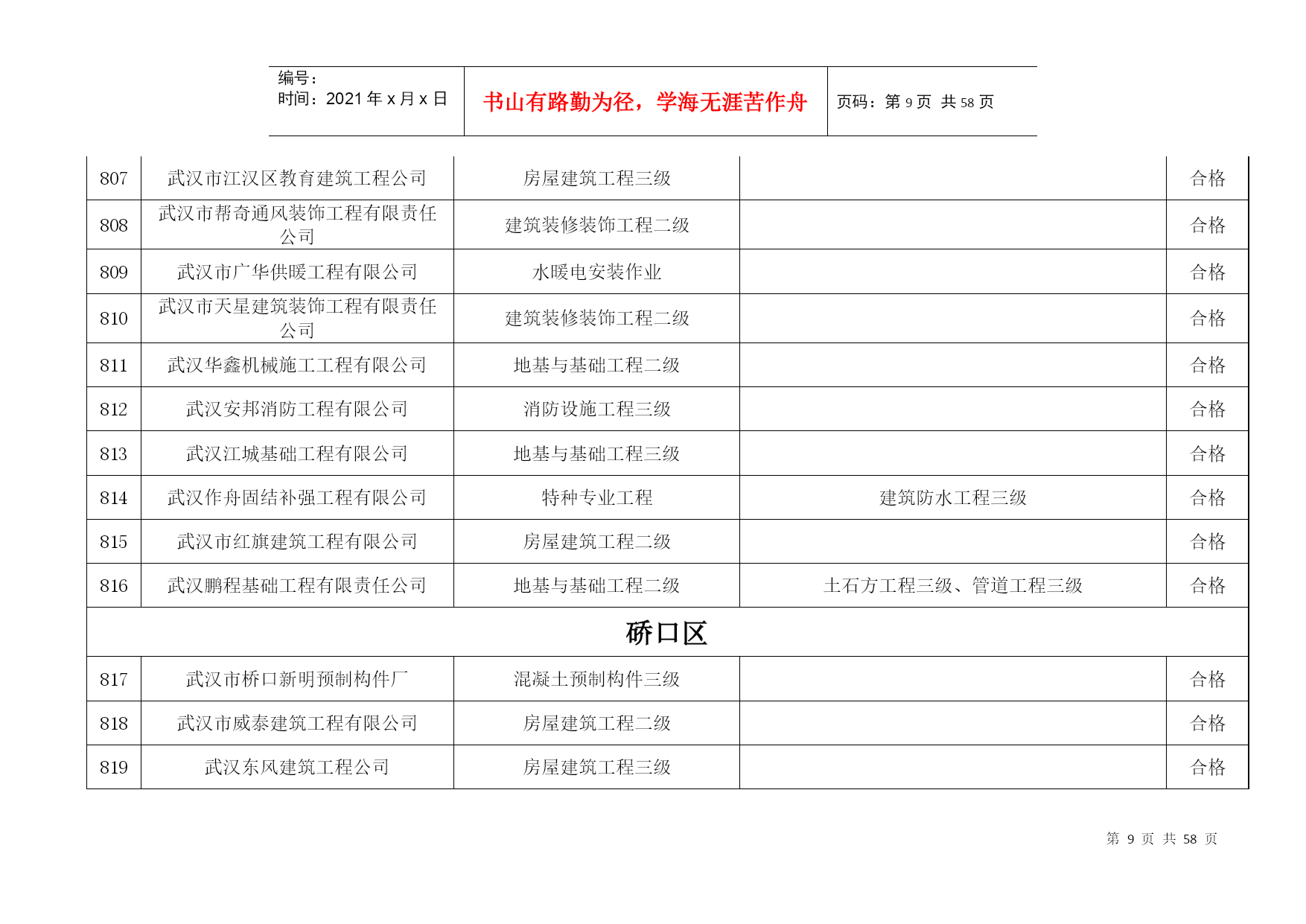 编号:时间:2021年x月x日书山有路勤为径,学海无涯苦作舟页码:第PAGE58页共NUMPAGES58页第PAGE\*MERGEFORMAT58页共NUMPAGES\*MERGEFORMAT58页附件:江岸区699HYPERLINK"javascript:__doPostBack('dgrdResult$_ctl11$_ctl0','')"武汉路桥交通工程有限公司公路路基工程三级地基与基础工程三级合格700HYPERLINK"javascript:__doPostBack('dgrdResult$_ctl12$_ctl0','')"武汉西域建筑工程有限公司房屋建筑工程三级建筑装修装饰工程三级合格701HYPERLINK"javascript:__doPostBack('dgrdResult$_ctl14$_ctl0','')"武汉市振兴装饰装璜工艺工程公司建筑装修装饰工程三级合格702HYPERLINK"javascript:__doPostBack('dgrdResult$_ctl15$_ctl0','')"武汉云龙钢结构有限公司钢结构工程三级合格703HYPERLINK"javascript:__doPostBack('dgrdResult$_ctl16$_ctl0','')"武汉岸房建筑工程有限公司房屋建筑工程二级建筑装修装饰工程三级合格704HYPERLINK"javascript:__doPostBack('dgrdResult$_ctl17$_ctl0','')"武汉市冰峰冷气装饰工程公司机电设备安装工程三级合格705HYPERLINK"javascript:__doPostBack('dgrdResult$_ctl18$_ctl0','')"武汉卓尔建筑科技工程有限公司消防设施工程二级合格706HYPERLINK"javascript:__doPostBack('dgrdResult$_ctl19$_ctl0','')"武汉百佳智能环境设备有限公司机电设备安装工程三级合格707HYPERLINK"javascript:__doPostBack('dgrdResult$_ctl20$_ctl0','')"武汉三迪通信技术有限公司电子工程三级合格708HYPERLINK"javascript:__doPostBack('dgrdResult$_ctl21$_ctl0','')"武汉兴力建筑科技有限公司特种专业工程合格709HYPERLINK"javascript:__doPostBack('dgrdResult$_ctl2$_ctl0','')"武汉市台港装饰工程有限责任公司建筑装修装饰工程三级合格710HYPERLINK"javascript:__doPostBack('dgrdResult$_ctl3$_ctl0','')"武汉市三金装饰工程有限公司建筑装修装饰工程三级合格711HYPERLINK"javascript:__doPostBack('dgrdResult$_ctl5$_ctl0','')"武汉市玉壁建筑工程有限公司房屋建筑工程三级合格712HYPERLINK"javascript:__doPostBack('dgrdResult$_ctl6$_ctl0','')"武汉利源工程技术实业有限公司机电设备安装工程三级合格713HYPERLINK"javascript:__doPostBack('dgrdResult$_ctl7$_ctl0','')"武汉华豪建筑装饰设计工程有限公司建筑装修装饰工程三级合格714HYPERLINK"javascript:__doPostBack('dgrdResult$_ctl8$_ctl0','')"武汉大地机电系统工程有限公司消防设施工程二级合格715HYPERLINK"javascript:__doPostBack('dgrdResult$_ctl9$_ctl0','')"武汉市胜安消防器材有限责任公司消防设施工程三级合格716HYPERLINK"javascript:__doPostBack('dgrdResult$_ctl10$_ctl0','')"武汉市竹叶山建筑工程有限公司房屋建筑工程三级合格717HYPERLINK"javascript:__doPostBack('dgrdResult$_ctl11$_ctl0','')"武汉市浩然基础工程有限责任公司地基与基础工程二级土石方工程三级合格718HYPERLINK"javascript:__doPostBack('dgrdResult$_ctl12$_ctl0