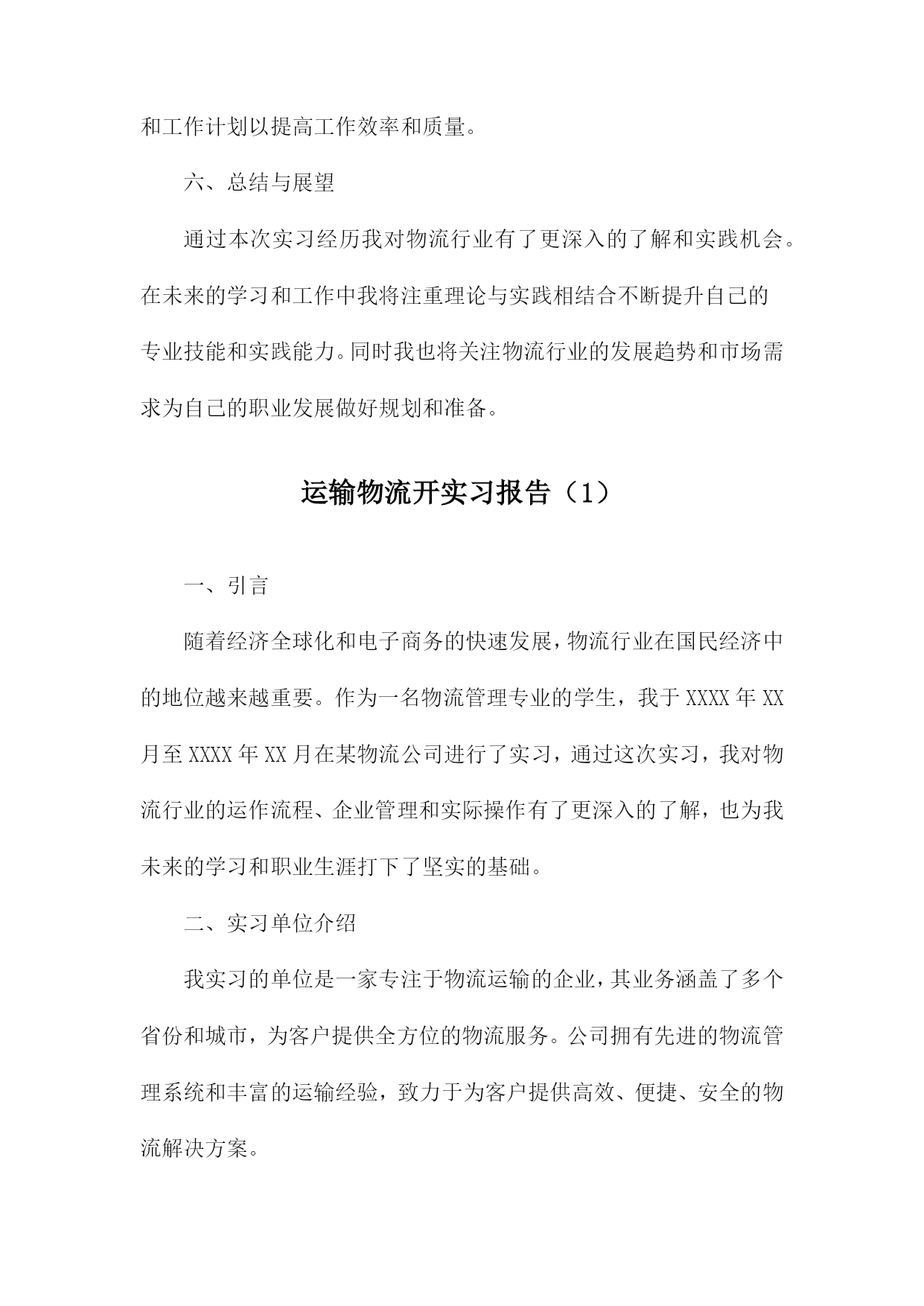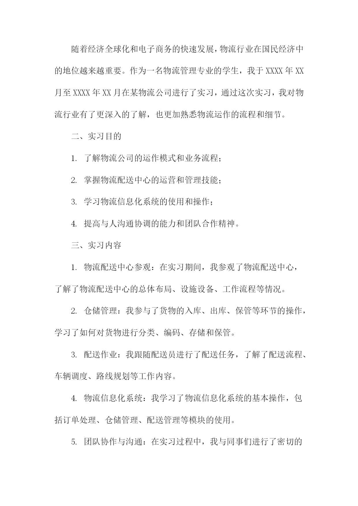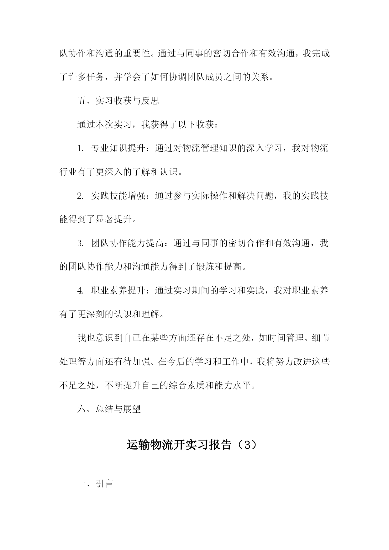 运输物流开实习报告一、引言随着经济全球化和电子商务的快速发展,物流行业在国民经济中的地位越来越重要。作为一名物流管理专业的学生,我于XXXX年XX月至XXXX年XX月在某运输公司进行了为期三个月的实习,旨在了解物流行业的运作模式和实际操作流程,提升自己的专业技能和实践能力。二、实习单位介绍某运输公司是一家专注于货物运输的企业,业务涵盖整车、零担、专线运输等多个领域。公司拥有完善的物流网络和先进的物流管理系统,能够为客户提供高效、便捷、安全的物流服务。三、实习岗位及职责在实习期间,我主要从事物流配送工作。具体职责包括:1.根据订单信息,制定详细的配送计划;2.负责货物的装卸、搬运、包装等工作;3.配合仓库管理人员进行库存管理和调配工作;4.及时处理配送过程中的异常情况,确保货物安全、准时送达客户手中;5.协助上级完成其他相关工作任务。四、实习过程与体验1.学习物流管理基础知识:在实习前,我学习了物流管理的基本概念、原理和方法。实际操作中仍有很多细节和流程需要掌握,我深入了解了物流管理的实际运作流程,对物流管理的理解更加深刻。2.掌握物流配送实操技能:在实习过程中,我学习了如何进行货物装卸、搬运、包装等实操技能。这些技能对于提高物流配送效率和质量至关重要,通过不断的实践和学习,我逐渐掌握了这些技能的要领和技巧。3.了解物流行业发展趋势:在实习期间,我有机会接触到了物流行业的先进技术和理念。通过与同行业的交流和探讨,我对物流行业的发展趋势有了更深入的了解,也对自己的职业规划有了更明确的方向。4.增强团队协作能力:在实习过程中,我与同事们建立了良好的合作关系。我们共同完成任务、解决问题、分享经验,这让我深刻体会到了团队协作的重要性。我也学会了如何与不同性格和背景的同事有效沟通和协作。5.塑造职业素养和责任心:通过实习,我逐渐认识到职业素养和责任心的重要性。我时刻保持积极的工作态度和专业素养,尽心尽力地完成每一项工作任务。我也意识到自己在某些方面还有待提高和完善,需要不断学习和进步。五、实习收获与反思通过本次实习,我获得了宝贵的实践经验和职业素养提升的机会。我收获了以下几点:1.掌握了物流配送的核心环节和实操技能;2.了解了物流行业的市场现状和发展趋势;3.增强了团队协作能力和沟通能力;4.塑造了职业素养和责任心;5.对自己的职业定位和发展有了更清晰的认识。我也深刻认识到自己在某些方面还存在不足之处:1.理论知识与实际操作脱节:在实习过程中,我发现自己在理论知识方面存在一定的欠缺和不足。未来需要加强对理论知识的学习和掌握,提高自己的理论素养和实践能力。2.应变能力和解决问题的能力有待提高:在实习过程中遇到了一些挑战和问题时,我发现自己的应变能力和解决问题的能力还有待提高。未来需要加强自我锻炼和学习,提高自己的综合素质和能力水平。3.时间管理和工作计划性需要加强:在实习过程中发现自己在时间管理和工作计划性方面存在一定的问题。未来需要合理安排时间和工作计划以提高工作效率和质量。六、总结与展望通过本次实习经历我对物流行业有了更深入的了解和实践机会。在未来的学习和工作中我将注重理论与实践相结合不断提升自己的专业技能和实践能力。同时我也将关注物流行业的发展趋势和市场需求为自己的职业发展做好规划和准备。运输物流开实习报告(1)一、引言随着经济全球化和电子商务的快速发展,物流行业在国民经济中的地位越来越重要。作为一名物流管理专业的学生,我于XXXX年XX月至XXXX年XX月在某物流公司进行了实习,通过这次实习,我对物流行业的运作流程、企业管理和实际操作有了更深入的了解,也为我未来的学习和职业生涯打下了坚实的基础。二、实习单位介绍我实习的单位是一家专注于物流运输的企业,其业务涵盖了多个省份和城市,为客户提供全方位的物流服务。公司拥有先进的物流管理系统和丰富的运输经验,致力于为客户提供高效、便捷、安全的物流解决方案。三、实习岗位及职责在实习期间,我担任了物流配送员的角色。我的主要职责是负责将客户的货物从仓库按照指定的时间、地点和数量进行配送。我还需要与客户保持沟通,及时处理配送过程中出现的问题,确保货物的安全送达。四、实习过程与体验1.学习物流基础知识:在实习前,我对物流行业的基础知识进行了学习,包括物流运作流程、供应链管理、仓储管理等。实际操作与理论知识还是存在一定的差距,我更加深入地理解了这些知识,并将其应用到实际工作中。2.了解物流运作流程:在实习期间,我跟随公司的配送员学习了从接单、备货、包装、称重到配送等一系列流程。通过亲身参与,我了解了物流运作的各个环节,并掌握了其中的技巧和注意事项。3.学习企业内部管理:在公司内部,我参与了例会、报表填写、文件归档等工作。通过这些工作