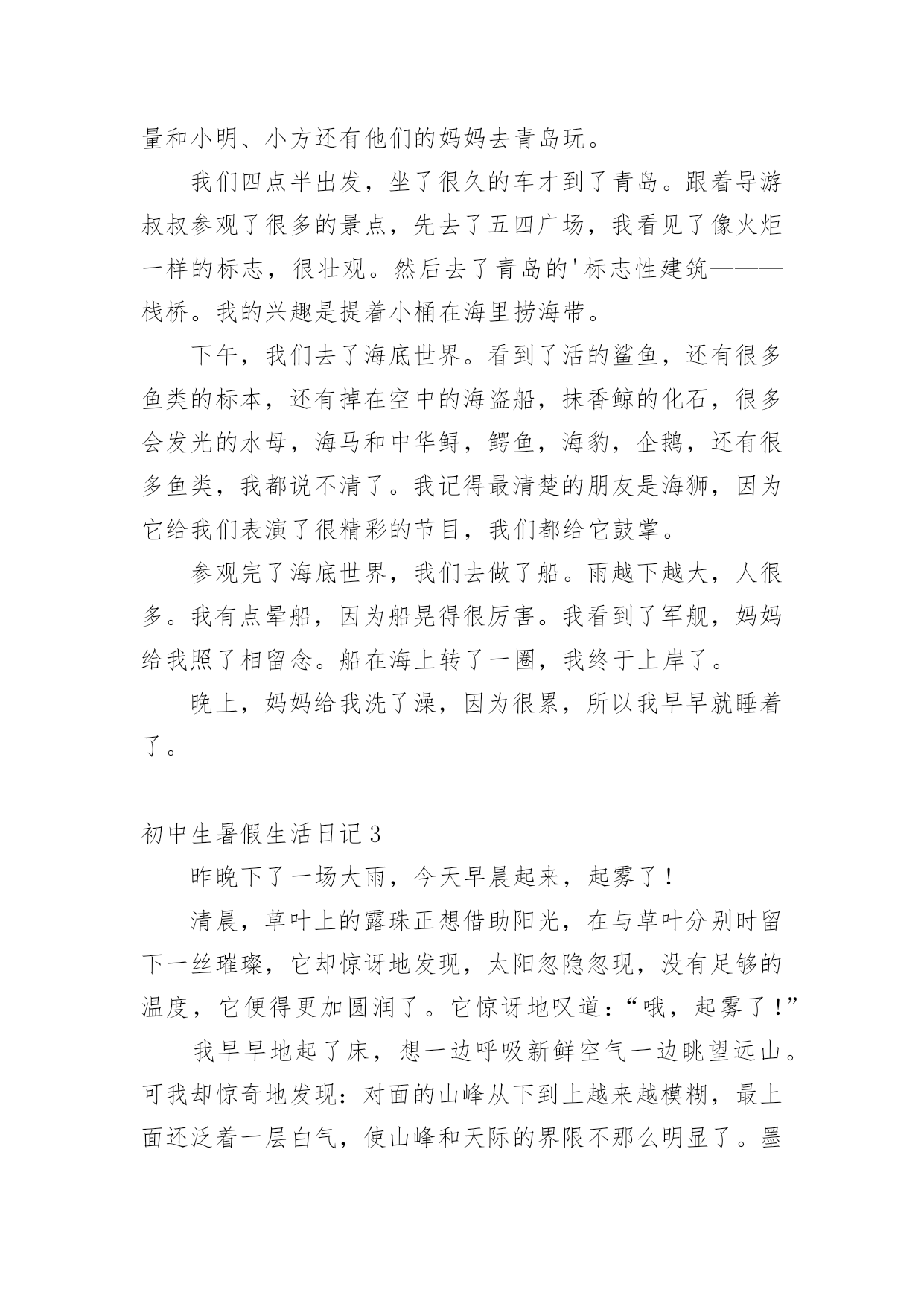 初中生暑假生活日记时间如快马般匆匆,一天又过去了,心中一定有不少感想,是时候抽出时间写写日记了。你所见过的日记应该是什么样的?下面是小编为大家整理的初中生暑假生活日记,希望能够帮助到大家。初中生暑假生活日记1晚上,爸爸带我们去金鹰玩,在快回家的时候,爸爸看见在前面有卖2008北京奥运会的吉祥物,爸爸就去买了。爸爸先看中了一个上面写着“北京欢迎你”的一个盒子,共有纪念章六枚,铜质镀金,直径35毫米。其中一枚图案正面为29届奥林匹克运动会会徽,背面为天坛,另5个是吉祥物5个福娃和繁荣、欢乐、健康、好运的中英文文字。爸爸还买了上面有16款运动项目是上一届中国队所获得金牌、银牌的运动项目,用福娃来代替的`。爸爸还给我们买了福娃的日记本姐姐是贝贝,我是晶晶。这本日记本非常好看,正面是晶晶,上面还有个晶晶的挂件。里面还有一张精美的福娃贴花纸。爸爸说:“买些东西鼓励我和姐姐学习进步。”晚上我还梦见爸爸还在买东西呢!初中生暑假生活日记2暑假开始了,妈妈说让我的第一个暑假过得有意义。商量和小明、小方还有他们的妈妈去青岛玩。我们四点半出发,坐了很久的车才到了青岛。跟着导游叔叔参观了很多的景点,先去了五四广场,我看见了像火炬一样的标志,很壮观。然后去了青岛的'标志性建筑———栈桥。我的兴趣是提着小桶在海里捞海带。下午,我们去了海底世界。看到了活的鲨鱼,还有很多鱼类的标本,还有掉在空中的海盗船,抹香鲸的化石,很多会发光的水母,海马和中华鲟,鳄鱼,海豹,企鹅,还有很多鱼类,我都说不清了。我记得最清楚的朋友是海狮,因为它给我们表演了很精彩的节目,我们都给它鼓掌。参观完了海底世界,我们去做了船。雨越下越大,人很多。我有点晕船,因为船晃得很厉害。我看到了军舰,妈妈给我照了相留念。船在海上转了一圈,我终于上岸了。晚上,妈妈给我洗了澡,因为很累,所以我早早就睡着了。初中生暑假生活日记3昨晚下了一场大雨,今天早晨起来,起雾了!清晨,草叶上的露珠正想借助阳光,在与草叶分别时留下一丝璀璨,它却惊讶地发现,太阳忽隐忽现,没有足够的温度,它便得更加圆润了。它惊讶地叹道:“哦,起雾了!”我早早地起了床,想一边呼吸新鲜空气一边眺望远山。可我却惊奇地发现:对面的山峰从下到上越来越模糊,最上面还泛着一层白气,使山峰和天际的界限不那么明显了。墨绿色的'森林一会儿呈青色,一会儿又变得模糊了。这倒未曾影响我看景的兴致,我惊叹道:“哦,起雾了!”可好景不长。不一会儿,太阳就穿透了云层,把朦胧雾气全都驱散了。露珠也终于以更加饱满,更加灿烂的形象告别了草叶。清晨的美景顿时荡然无存。一瞬的美丽,多么震撼人心!