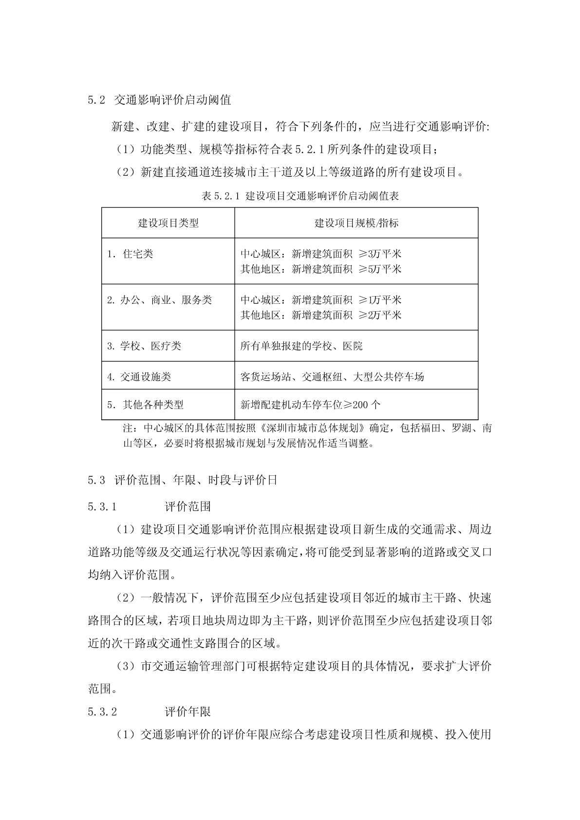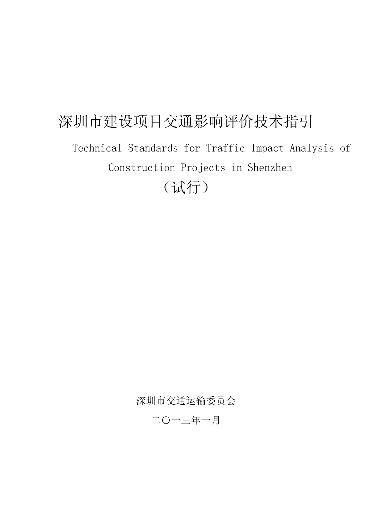 深圳市建设项目交通影响评价技术指引TechnicalStandardsforTrafficImpactAnalysisofConstructionProjectsinShenzhen(试行)深圳市交通运输委员会二○一三年一月目录1范围..................................................................................................................................................12规范性引用文件..............................................................................................................................13术语和定义......................................................................................................................................14一般规定..........................................................................................................................................34.1交通影响评价的目的与任务.................................................................................................34.2交通影响评价的基本原则.....................................................................................................34.3交通影响评价的基本内容.....................................................................................................44.4交通影响评价的基本要求.....................................................................................................45交通影响评价技术标准..................................................................................................................45.1建设项目分类及出行率.........................................................................................................45.2交通影响评价启动阈值.........................................................................................................65.3评价范围、年限、时段与评价日.........................................................................................65.4交通需求分析.........................................................................................................................75.5路网交通影响评价.................................................................................................................85.6公共交通影响评价...........................................................