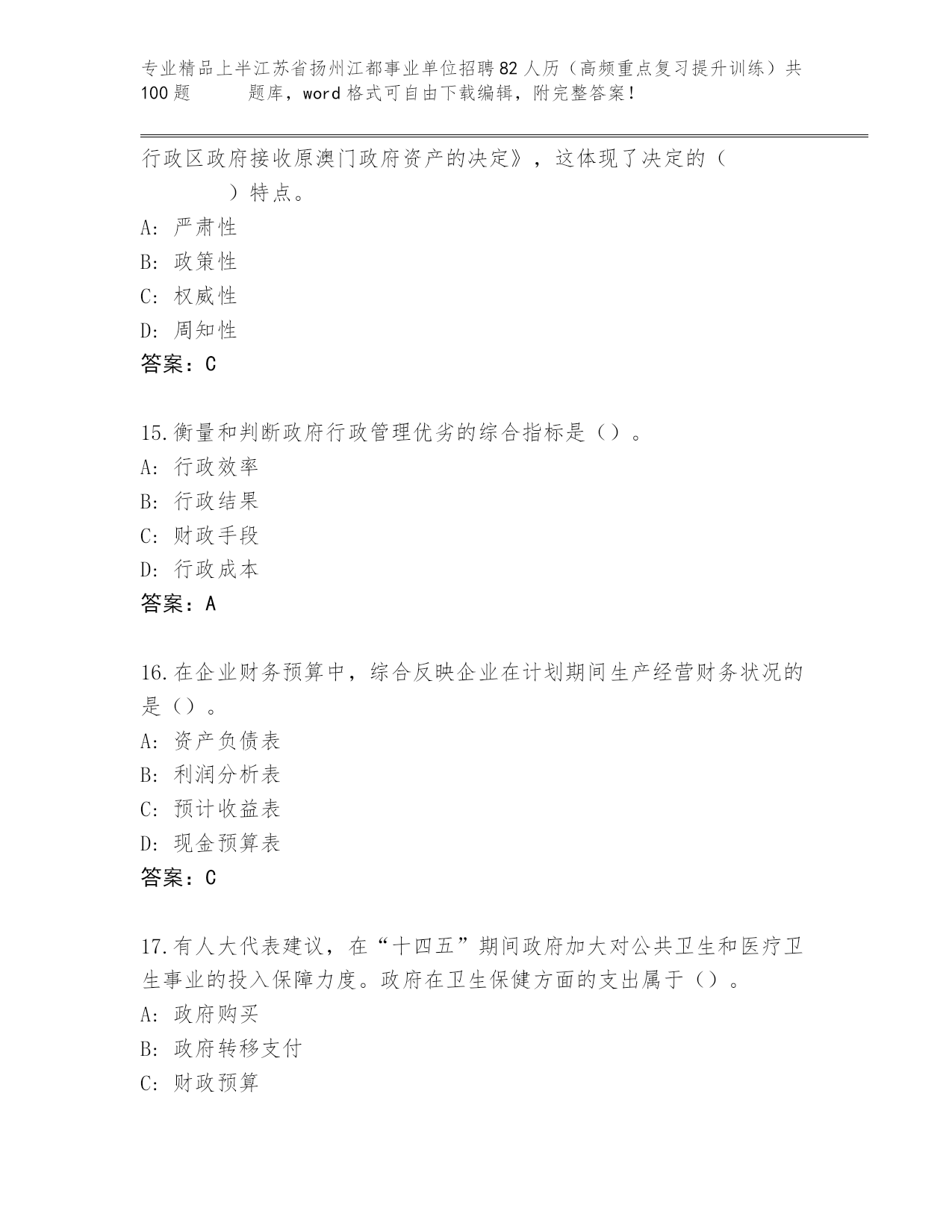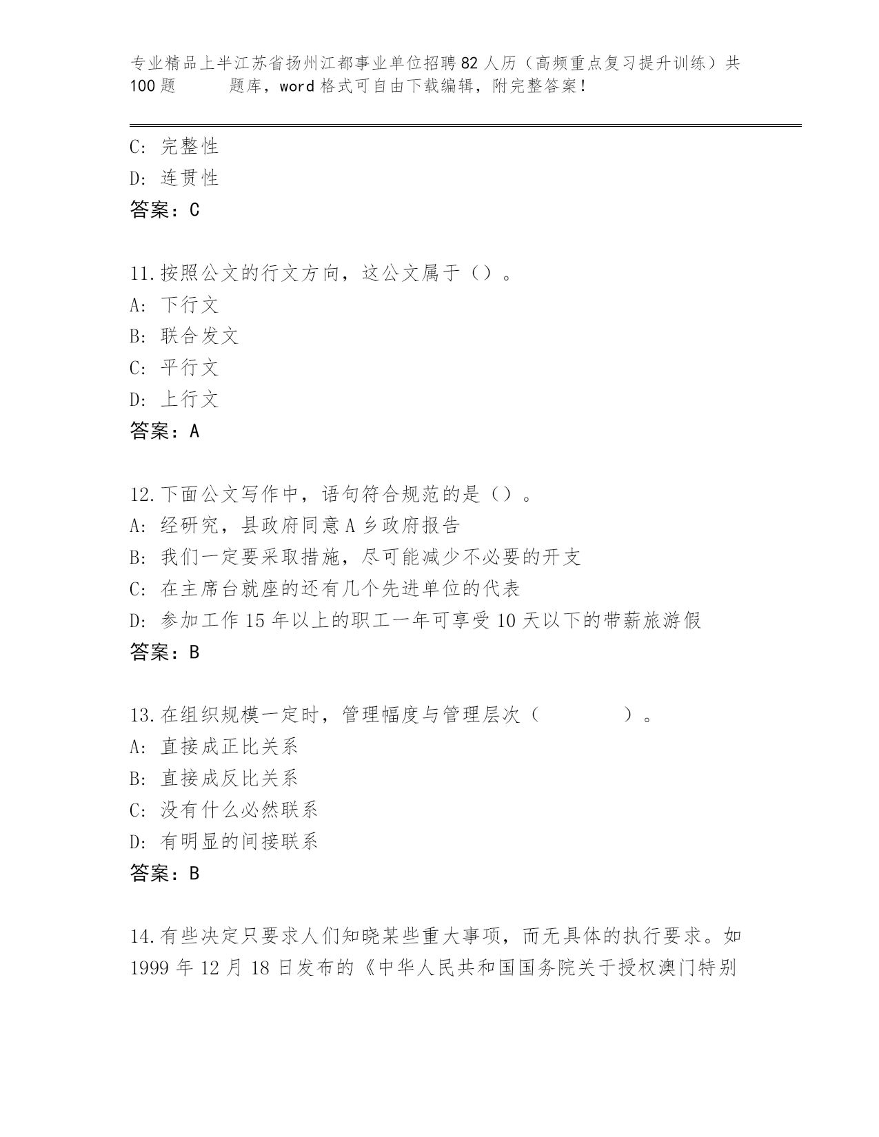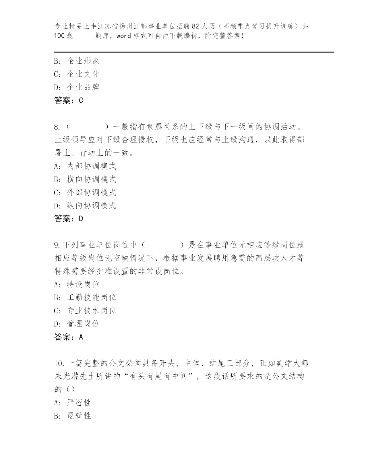 历年上半江苏省扬州江都事业单位招聘82人历(高频重点复习提升训练)共100题 王牌题库及答案参考