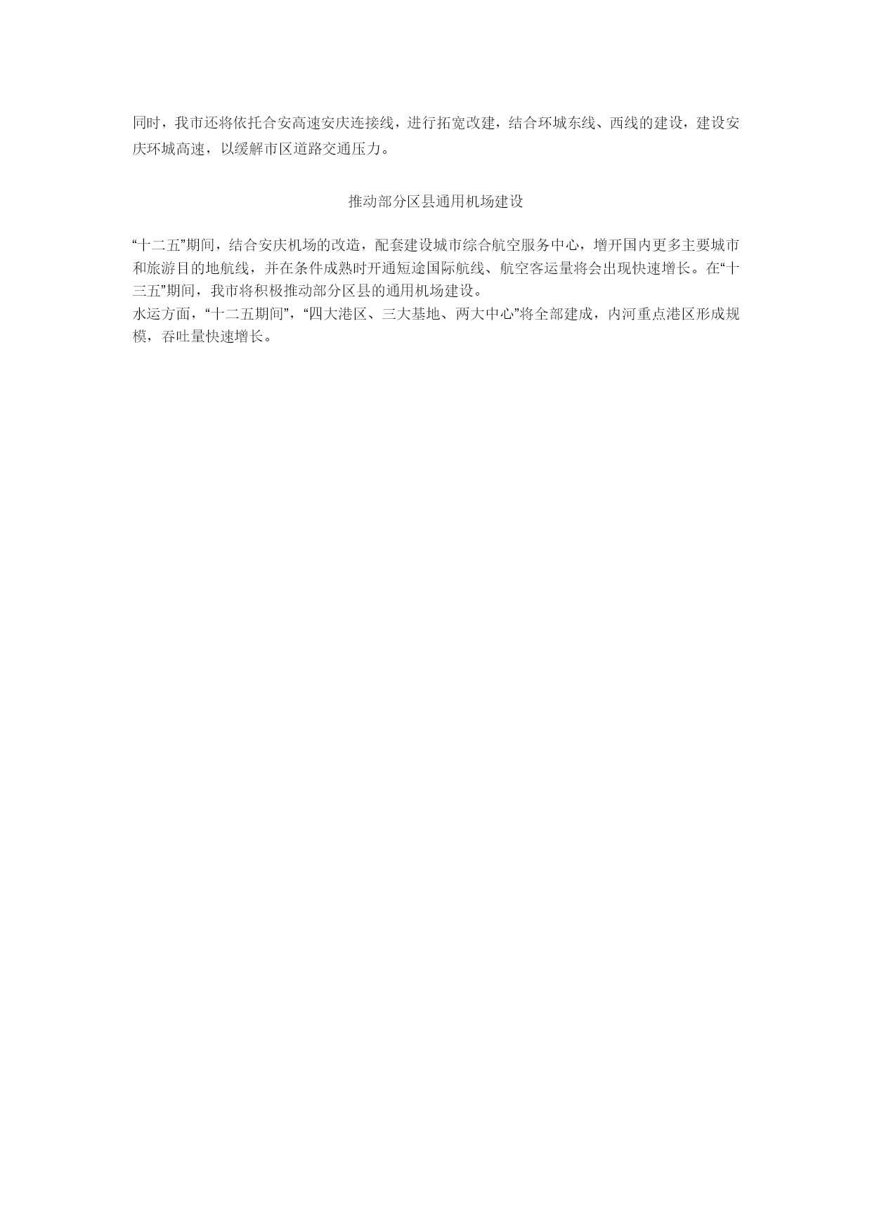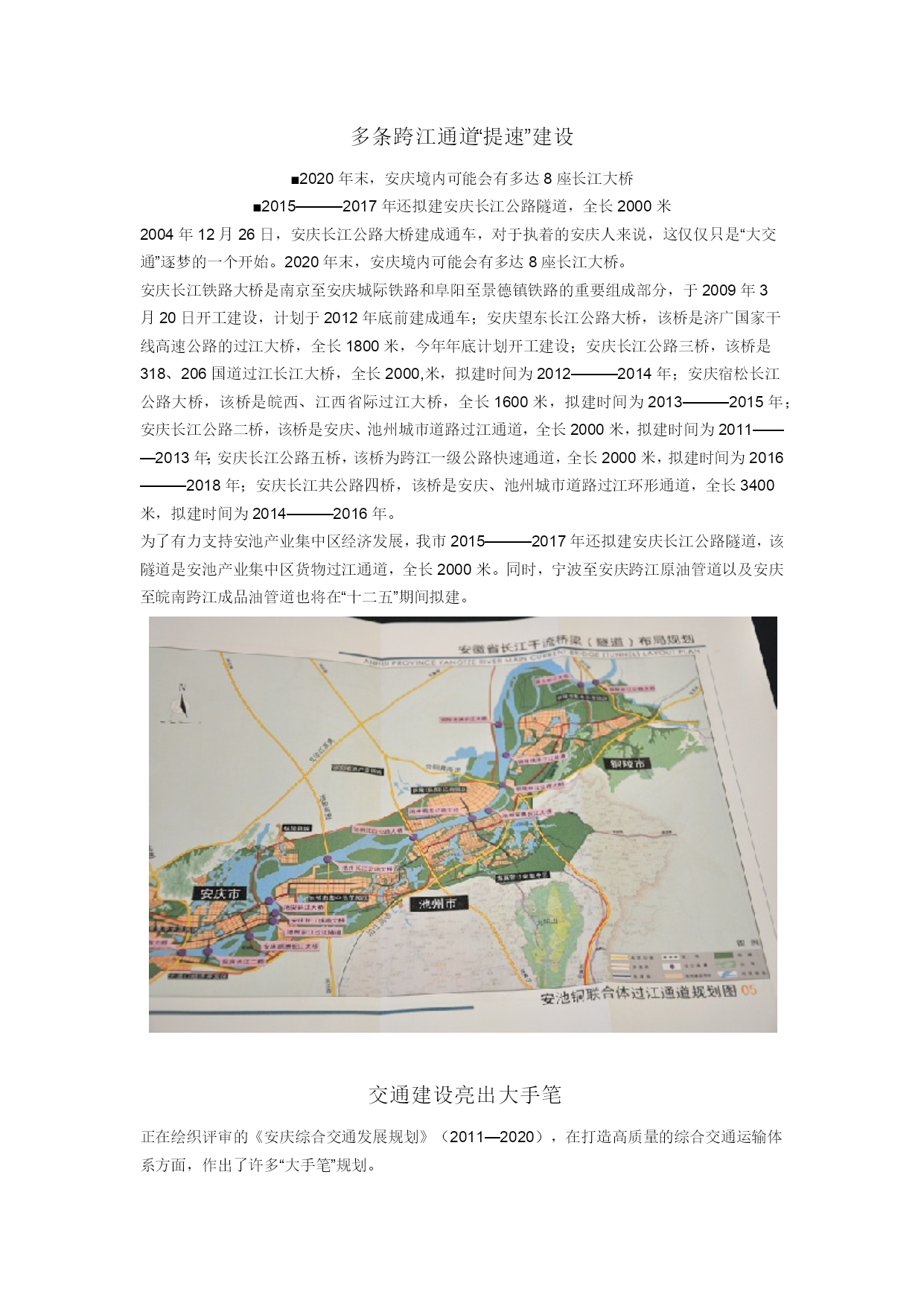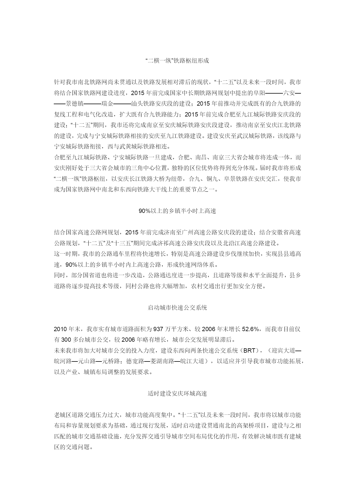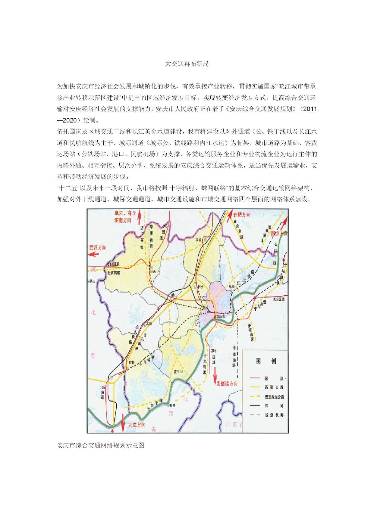 立体大交通安庆再布新局[vb>5EhL!《安庆综合交通发展规划》通过初审7q?u`3l以“十字辐射、蛛网联络”为网络架构r1&b#r>立体大交通安庆再布新局“十二五”以及未来一段时间,我市将加强对外干线通道、城际交通通道、城市交通设施和市域交通网络四个层面的网络体系建设g{wIdV交通兴则事业兴,交通畅则民心畅。11月29日,安庆市人民政府在安庆组织召开《安庆综合交通发展规划》(2011—2020)评审会,合九城际铁路安庆段、济广高速公路安庆段、济祁高速公路安庆段、北沿江高速公路等一批交通主干线的实施建设,到2020年,安庆区域性综合运输枢纽城市的区位优势将得到充分体现。z!27#gbLQ>f^*FyOw<交通建设需要加速度L'=2Uk#.D安庆市位于安徽省西南,地处皖鄂赣三省交界处,雄踞长江中下游北岸,是长江重要港口城市。安庆东临沿海、江、浙、沪等发达地区,西衔汉、渝等中西部地区,自古就是沟通南北、贯穿东西的交通要道和商贾云集无街不市的商埠要津。.QOQqU*2I许多人会认为,我市处在国家规划的“五纵五横”综合交通网沿江运输大通道上的重要节点位置,且公、铁、水、航、管道五种运输方式齐全,在经济发展中,交通应该是安庆的一大优势。<cG.V|B其实不然,我市的高速公路未全面实现网络化,境内国省干线公路等级不高,南北铁路网尚未贯通,港口航道建设有待加强,机场承载能力亟待提高等等问题却导致运输与经济社会发展、产业布局之间的配合、衔接不够紧密,无法发挥交通运输对经济社会发展的引导性作用,对未来城市提升发展和城镇化水平的不断提高造成障碍,对我市吸引外来资本、产业和资源,以及形成对外辐射均不利。q+2yp&zFOQ"%(w>Hb承接产业转移交通要先行/=Bz[O专家们认为,国务院《皖江城市带承接产业转移示范区域规划》的颁布实施,为皖江城市带将充分发挥区位、资源和劳动力等优势,积极参与泛长三角发展分工,在主动承接沿海地区产业转移,完善产业体系,加快城市化进程,带来了难得的机遇,也对具有支撑和带动作用的城市带综合交通运输体系的建设和发展提出了全新的要求。;;'b;,/经济社会发展,交通扮演着“先行军”的角色。安庆市必须加快构建与城市带具有一体化的发展能力和紧密联系的现代综合交通运输体系,改善连接相关城市、辐射区域的运输大通道和运输枢纽设施,为大发展创造交通基础设施和运输服务条件。o~!4&面向“十二五”以及未来,随着国家“皖江城市带区域经济发展战略”的逐步实施,为提高我市参与省域、区域经济发展的竞争力,抓住良好的发展机遇,加速融入泛长江三角洲区域经济的一体化发展进程,我市必须建设更高质量的综合交通运输体系。O@fX+W?U{Hs""/sb大交通再布新局F^bC!;~x为加快安庆市经济社会发展和城镇化的步伐,有效承接产业转移,贯彻实施国家“皖江城市带承接产业转移示范区建设”中提出的区域经济发展目标,实现转变经济发展方式,提高综合交通运输对安庆经济社会发展的支撑能力,安庆市人民政府正在着手《安庆综合交通发展规划》(2011—2020)绘制。en>dT依托国家及区域交通干线和长江黄金水道建设,我市将建设以对外通道(公、铁干线以及长江水道和民航航线为主干、城际通道(城际公、铁线路和内江水运)为骨架、城市道路为基础、客货运场站(公铁场站、港口、民航机场)为支撑、各类运输服务企业和专业物流企业为运行主体的内联外通、相互衔接、层次分明、系统发展的安庆综合交通运输体系,适当优先发展运输业,支持和带动经济发展的步伐。<\Nf6>_qEM“十二五”以及未来一段时间,我市将按照“十字辐射、蛛网联络”的基本综合交通运输网络架构,加强对外干线通道、城际交通通道、城市交通设施和市域交通网络四个层面的网络体系建设。T.="a2iS2安庆市综合交通网络规划示意图~(Gv/x多条跨江通道“提速”建设w~M5)b■2020年末,安庆境内可能会有多达8座长江大桥quk~z};R>\■2015———2017年还拟建安庆长江公路隧道,全长2000米2004年12月26日,安庆长江公路大桥建成通车,对于执着的安庆人来说,这仅仅只是“大交通”逐梦的一个开始。2020年末,安庆境内可能会有多达8座长江大桥。pWO-YZ#+安庆长江铁路大桥是南京至安庆城际铁路和阜阳至景德镇铁路的重要组成部分,于2009年3月20日开工建设,计划于2012年底前建成通车;安庆望东长江公路大桥,该桥是济广国家干线高速公路的过江大桥,全长1800米,今年年底计划开工建设;安庆长江公路三桥,该桥是318、206国道过江长江大桥,全长2000,米,拟建时间为2012———2014年;安庆宿松长江公路大桥,该桥是皖西、江西省际过江大桥,全长1600米,拟建时间为2013———2015年
