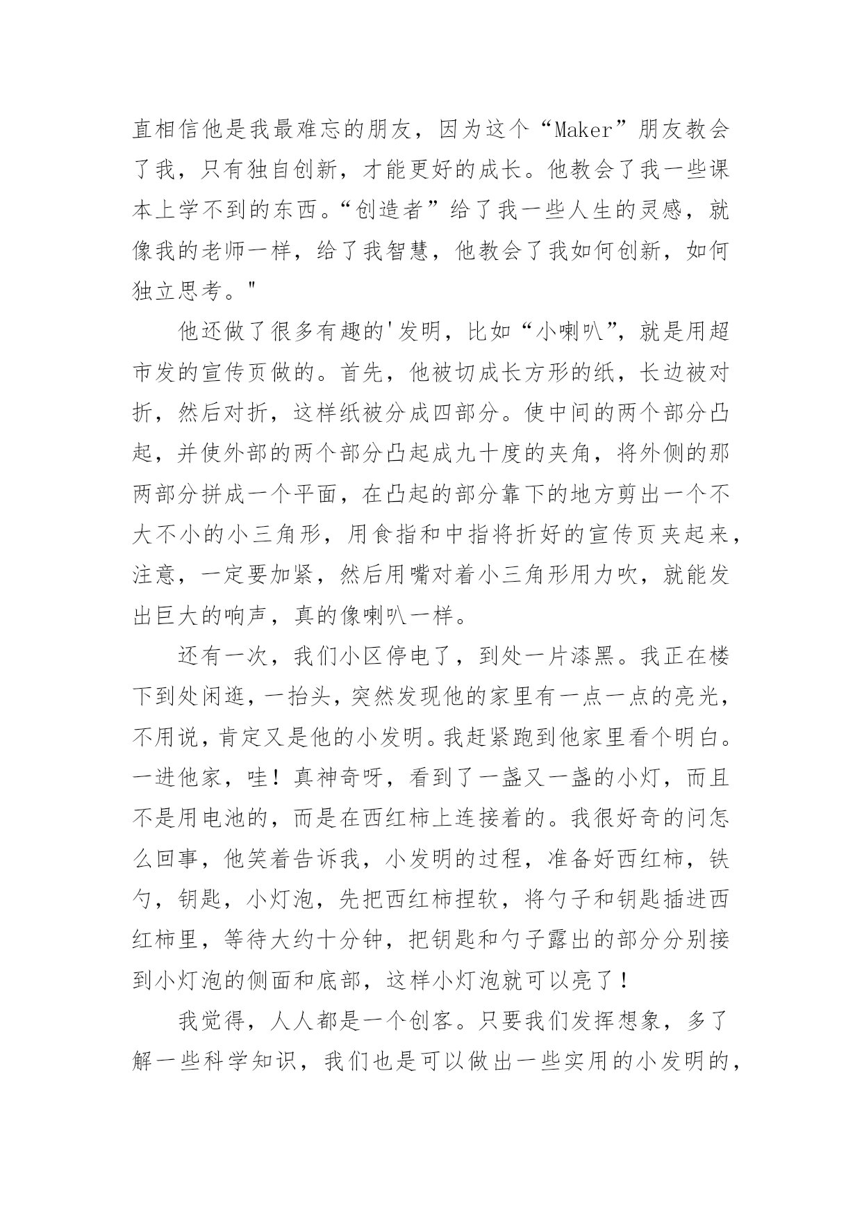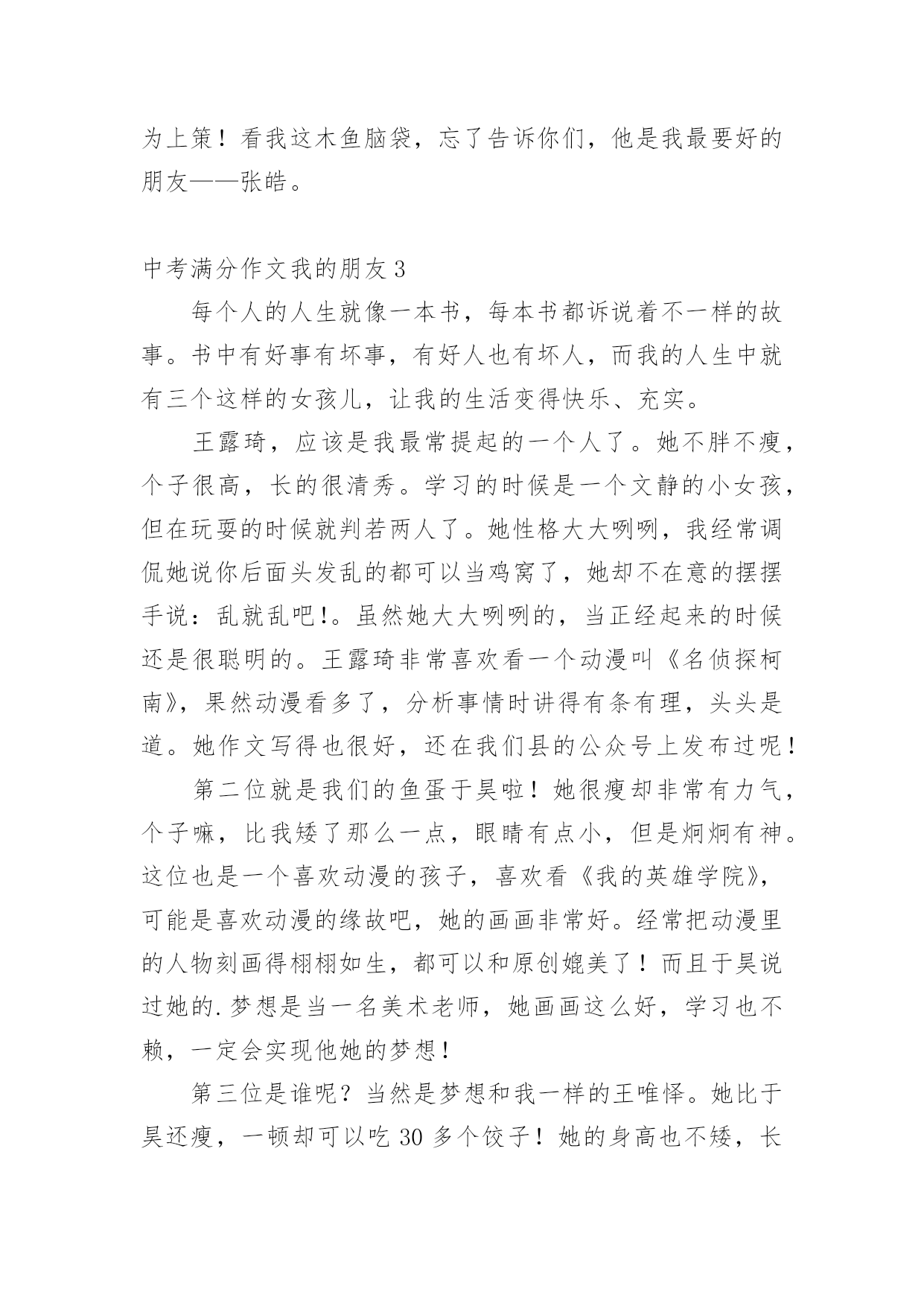 中考满分作文我的朋友在日复一日的学习、工作或生活中,许多人都写过作文吧,作文是人们把记忆中所存储的有关知识、经验和思想用书面形式表达出来的记叙方式。还是对作文一筹莫展吗?以下是小编整理的中考满分作文我的朋友,欢迎大家分享。中考满分作文我的朋友1我又一次坐在小溪边的石凳上,看着长长的蓝天和清澈的小溪。在无限的寂静中,我忘记了世界,忘记了自己。一只瓢虫在我脚边跑来跑去。我想知道它在做什么,于是我跟着虫子做了一次奇怪的旅行。随着虫子的步伐,渐渐的,我看到了一个被许多小草和向日葵围绕的“天然家园”。我用手扭过头去,真的被这一幕惊呆了:五颜六色的虫子在自由自在的生活:有的在唱着优美的歌,有的在建自己的家,有的在和家人一起旅行,有的在赶着储存食物。这些虫子正在编织它们美丽的家园。他们爬上岩石,沿着砾石小路走了一会儿,经过的地方变成了美丽的风景。这些茂密的`草茎和花朵是它们隐藏的地方。这时,一只穿着粉色和白色斑点的蝴蝶落在了一朵花上,使它更加美丽和安静。在这些小甲虫中,我最佩服的是虫搬运工。看着他们从不匆忙,他们不紧不慢的脚步伴随着美妙的歌声,真的很有节奏!他们扛的时候不扛自己的,但是找到食物,一大群甲虫过来帮忙扛,好像各有千秋,直到扛回家才开始分发。当然,当他们累了的时候,音乐人会一首又一首优雅的小曲,真的很温暖!然而,他们通常一次就搬回家,所以他们整个早上都很忙。他们不够勤奋吗?阳光如此美丽,花朵如此鲜艳。这时,小蜜蜂快乐地飞着,嗡嗡地叫着。他们突然飞到了太阳花上,突然飞到了丁香花上。每一朵花都微笑着迎接它们,用花瓣轻轻抚摸它们。蜜蜂飞快地拍打着翅膀,唱着动人的歌谣。久而久之,蜻蜓成群结队地飞来飞去,红的,粉的,黄的,蓝的……它们低空飞行,像小飞机一样飘飘欲仙。我想,在下雨之前,我应该和这些虫子朋友说再见了。于是我慢慢向他们挥手告别,他们和我一起唱歌。再见!虫子朋友。再见!再见,搬运工们!可爱的小蜜蜂。我的心在一次又一次呼唤我。中考满分作文我的朋友2提起我的好朋友,那可是全年级无人不知,无人不晓。学习成绩顶呱呱,第一、第二是他的“专利”。他中等个头,皮肤白里透红。他的“三绝”在我们班可谓“家喻户晓”。有泪轻弹他生性好哭。无论遇到大事小事,只要不顺心,他就眼圈发红,鼻子发酸,一会儿就“倾盆大雨”,好似一个泪人儿。就拿今天早读课文来说吧,他兴高彩烈地把作业交给数学老师。数学老师才看了一眼他做的`作业,脸就像六月的天——说变就变。老师刚批评他两句,我这位老弟在0.01秒内,就“热泪盈眶”了,鼻子还不停地抽搭。那样子,让人好不心疼。可老师大人秉公执法,冷冷地说:“男儿有泪不轻弹!”听到这话,他也只好强忍悲痛,点头称是。本性难移他是个猴性子。要说我们班发言谁最积极,非他莫属!举手动作堪称一绝,四年级时,有一次老师刚提个问题,我还丈二和尚——摸不着头脑,他已经以迅雷不及掩耳之势站起身,手举得简直比直尺还要直,嘴里大声“怒吼”:“老师!老师!”对此“猴急症”,数学老师有一剂“良药”,就是应一声:“今天上你家吃饭。”他一听,心领神会,立即规矩了许多,可是不到两分钟,又故伎重演。我知道,这叫江山易改,本性难移呀!高音喇叭他爱说话,嗓门儿又大,像高音喇叭似的,你在班级的任何角落听他发言,都能字字入耳,句句入脑。这不,最近学校要举行广播操比赛,他的嗓门有了用武之地,尽管嗓子喊破了,他仍坚守岗位,这精神着实让人感动。上次,一位外校老师来我班上课,课上得非常成功。我们班主任问学生配合怎么样?那位老师不假思索地说:“学生发言积极,声音洪亮,尤其是那个声音最响的,他表现最突出!”看来,他已“深入师心”。我的好朋友就是这么一个勤学好问、活泼可爱的人。不好,他“两眼喷火”,正朝我走来了!我得三十六计——走为上策!看我这木鱼脑袋,忘了告诉你们,他是我最要好的朋友——张皓。中考满分作文我的朋友3每个人的人生就像一本书,每本书都诉说着不一样的故事。书中有好事有坏事,有好人也有坏人,而我的人生中就有三个这样的女孩儿,让我的生活变得快乐、充实。王露琦,应该是我最常提起的一个人了。她不胖不瘦,个子很高,长的很清秀。学习的时候是一个文静的小女孩,但在玩耍的时候就判若两人了。她性格大大咧咧,我经常调侃她说你后面头发乱的都可以当鸡窝了,她却不在意的摆摆手说:乱就乱吧!。虽然她大大咧咧的,当正经起来的时候还是很聪明的。王露琦非常喜欢看一个动漫叫《名侦探柯南》,果然动漫看多了,分析事情时讲得有条有理,头头是道。她作文写得也很好,还在我们县的公众号上发布过呢!第二位就是我们的鱼蛋于昊啦!她很瘦却非常有力气,个子嘛,比我矮了那么一点,眼睛有点小,但是炯炯有神。这位也是一个喜欢动漫的孩子,喜欢看《我的英雄学院》,可能是喜欢动漫的缘故吧,她的画画非常好。经常把动漫里的人物刻画得栩栩如生,都可以和